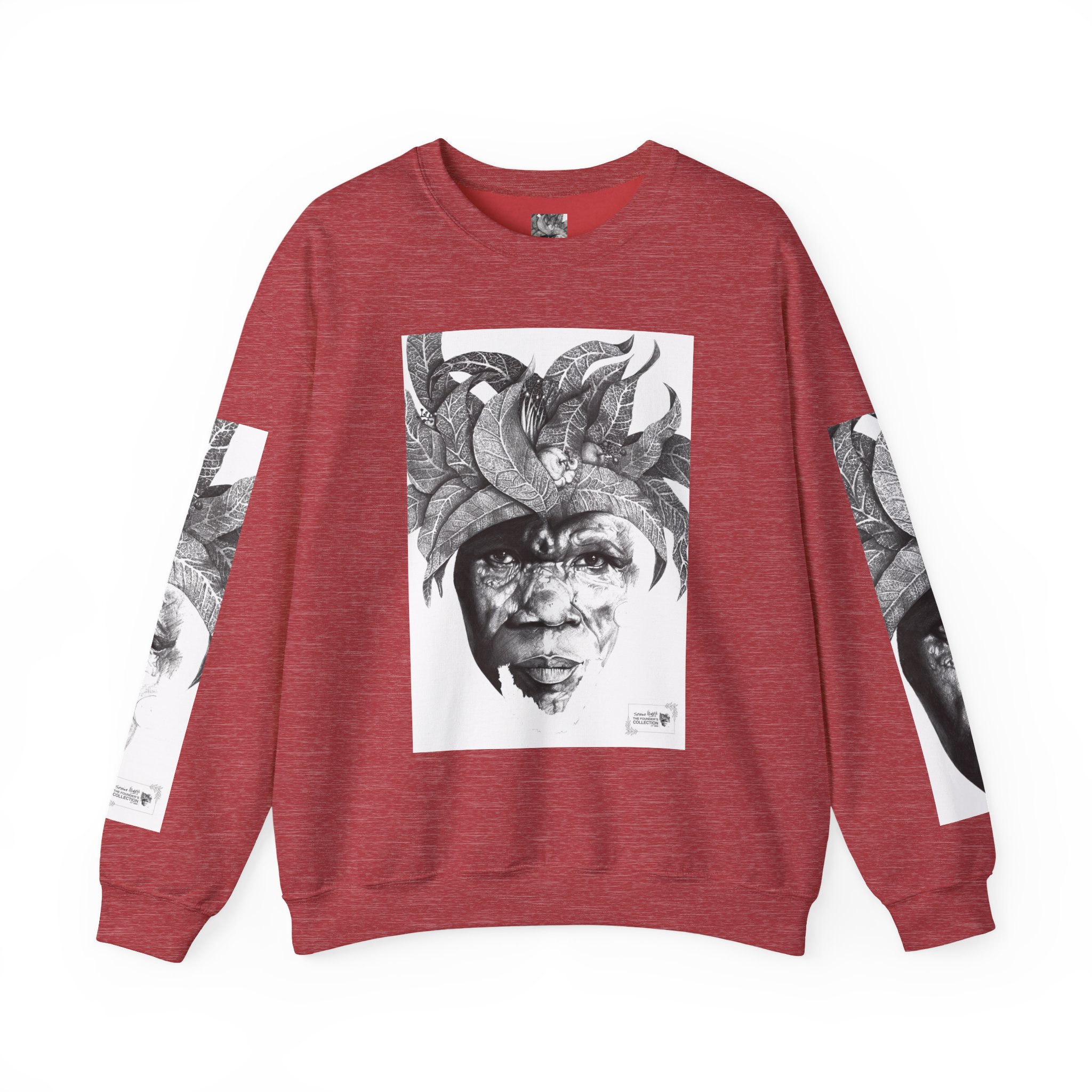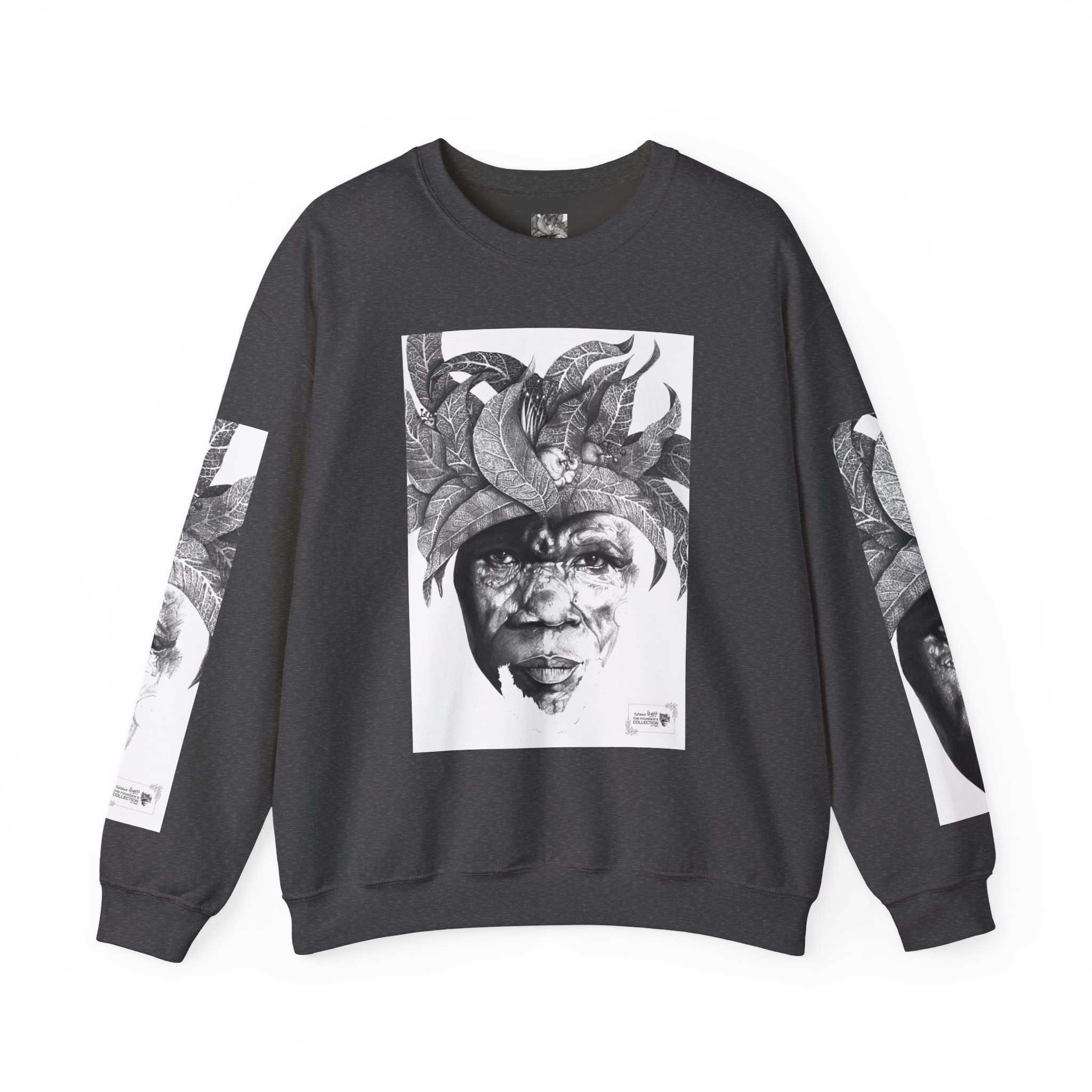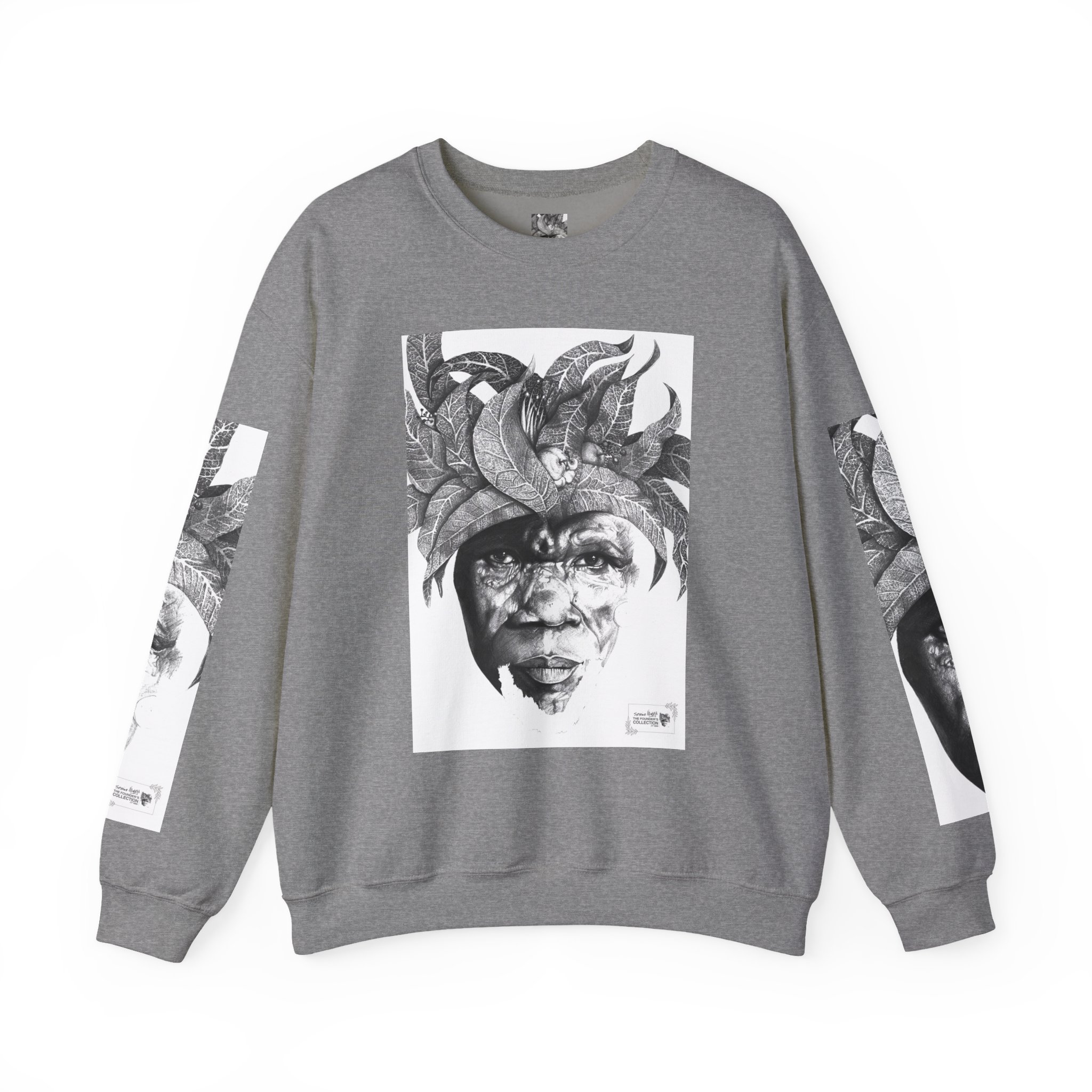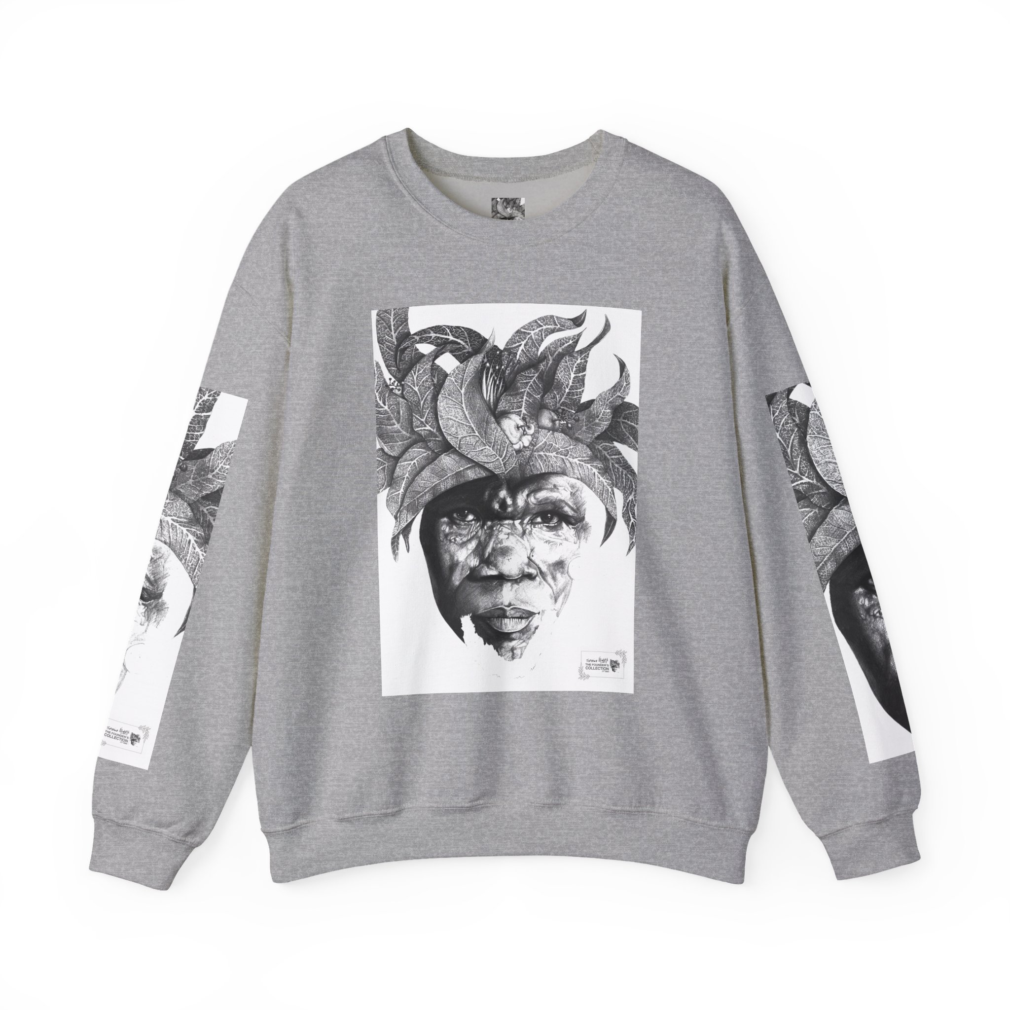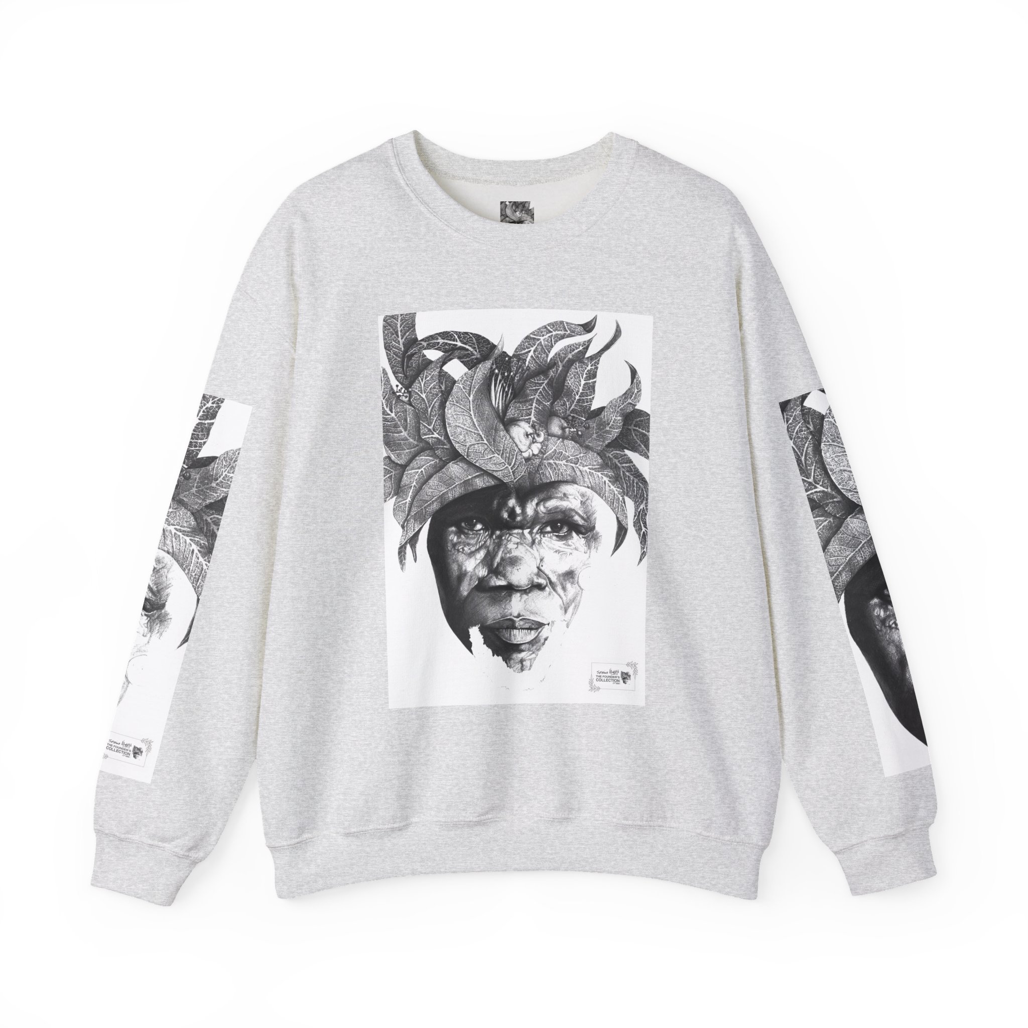 This crewneck sweatshirt carries the quiet, thoughtful energy of “The Original Sunman: Vision of the Founder’s Family” by Siphiwe Ngwenya. The monochrome portrait—layered with botanical swirls and a tribal headdress design—feels like a memory worn on the chest: gentle, soulful, and slightly mysterious. It embodies the “Artworks that Work” philosophy—art dedicated to driving economic and spiritual emancipation. This design draws on profound indigenous heritage, symbolizing the journey of communities transforming townships into vibrant centers of creative freedom and dignified self-expression.