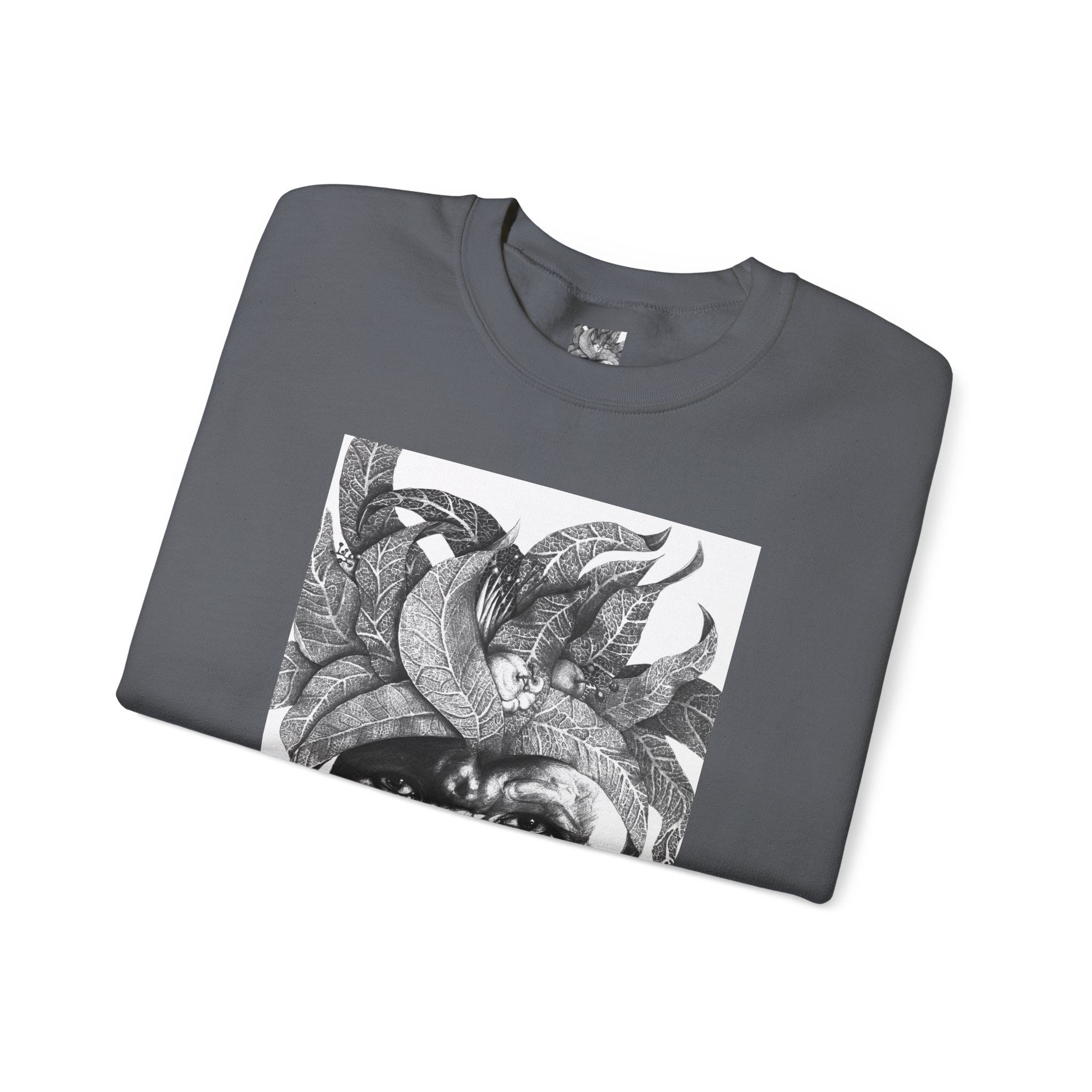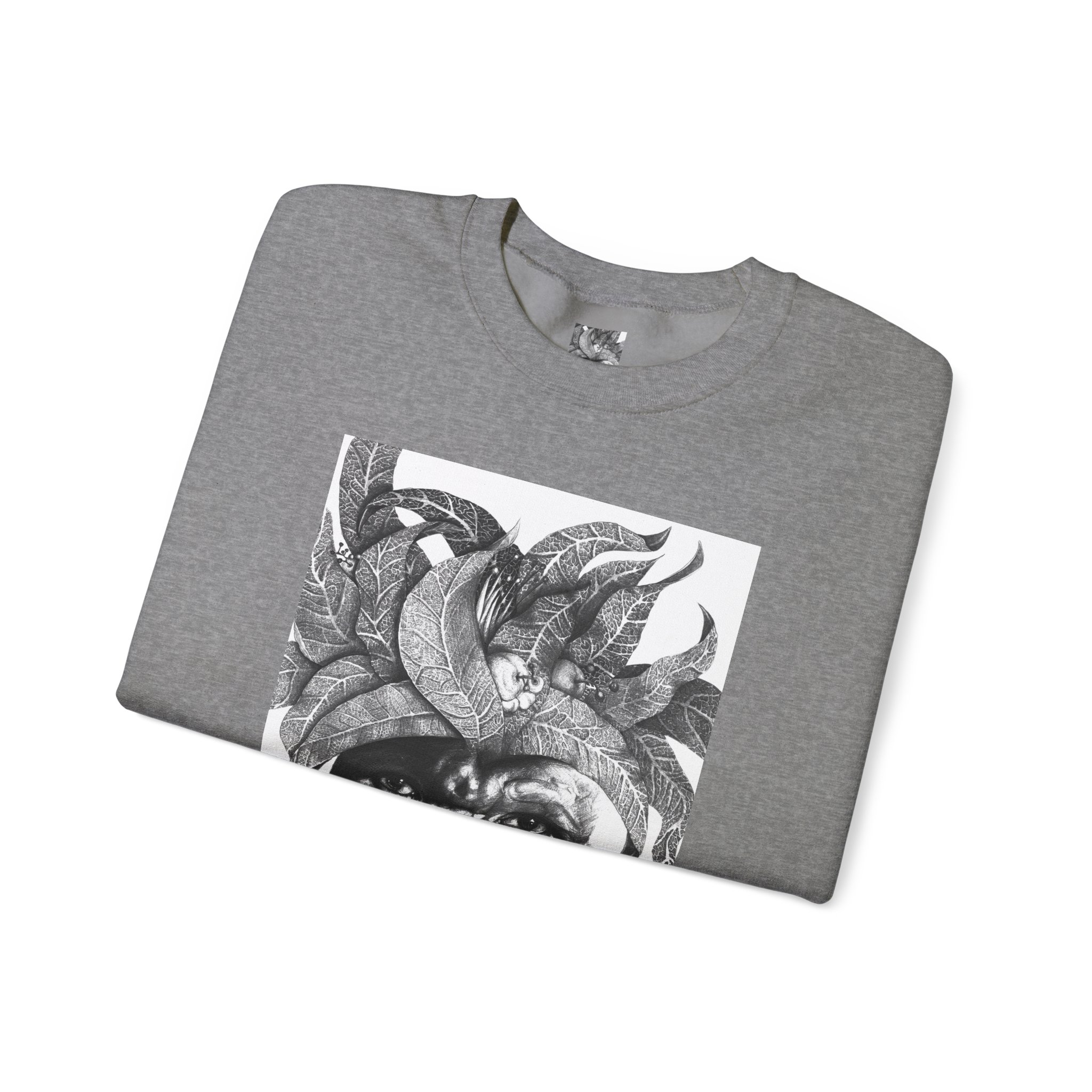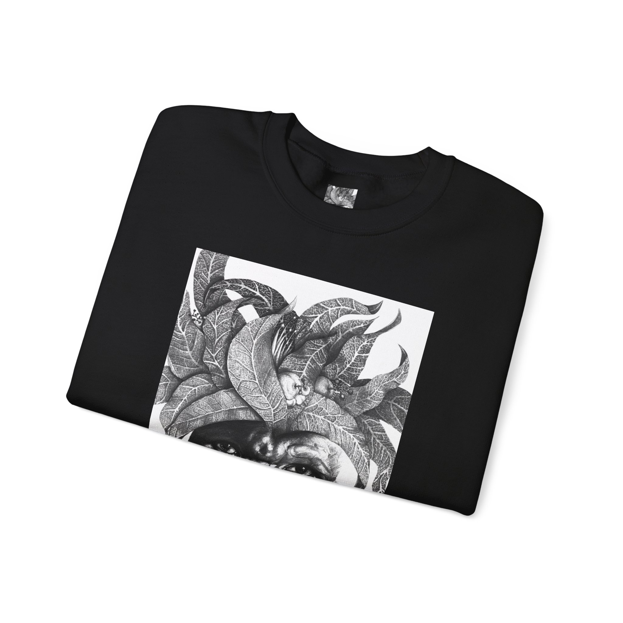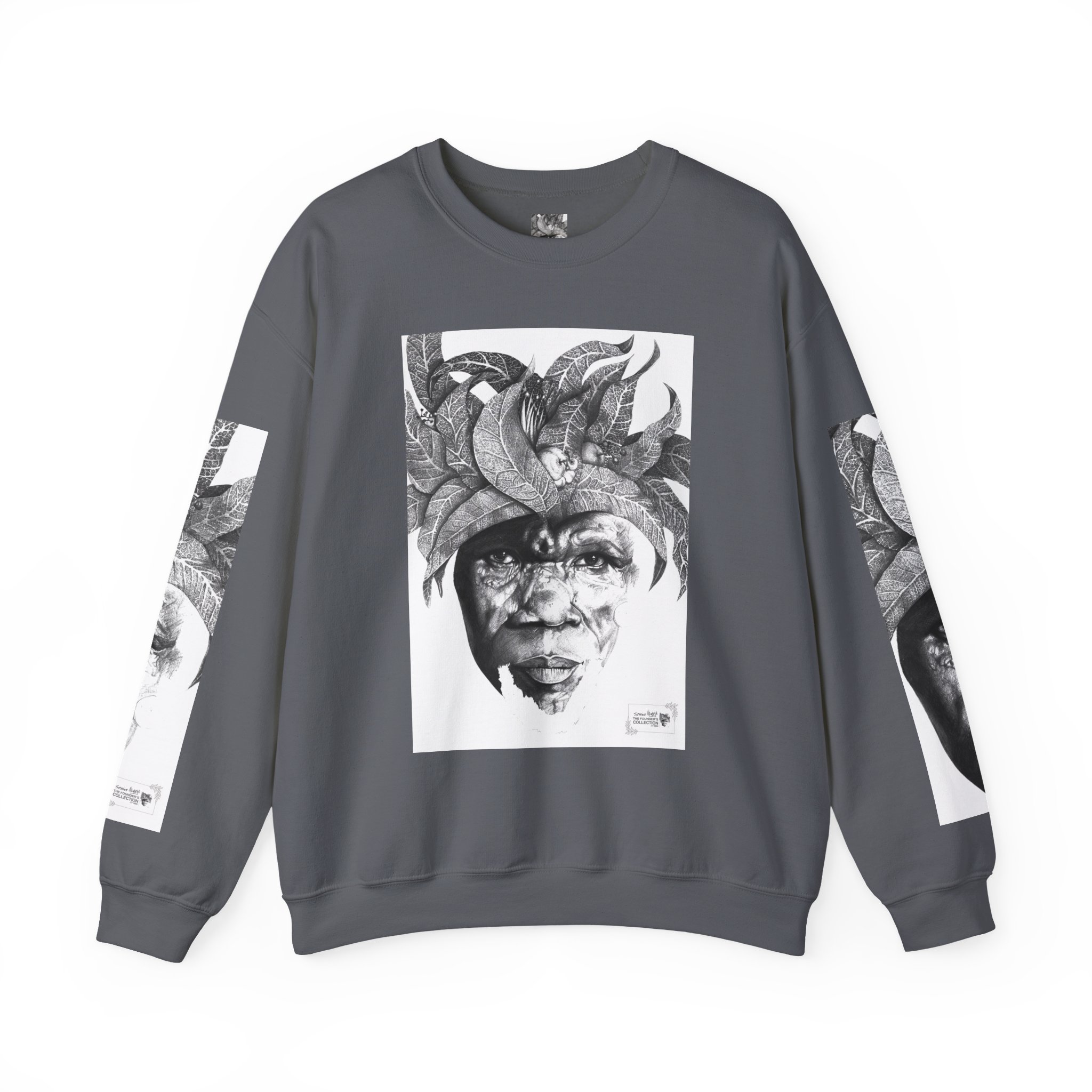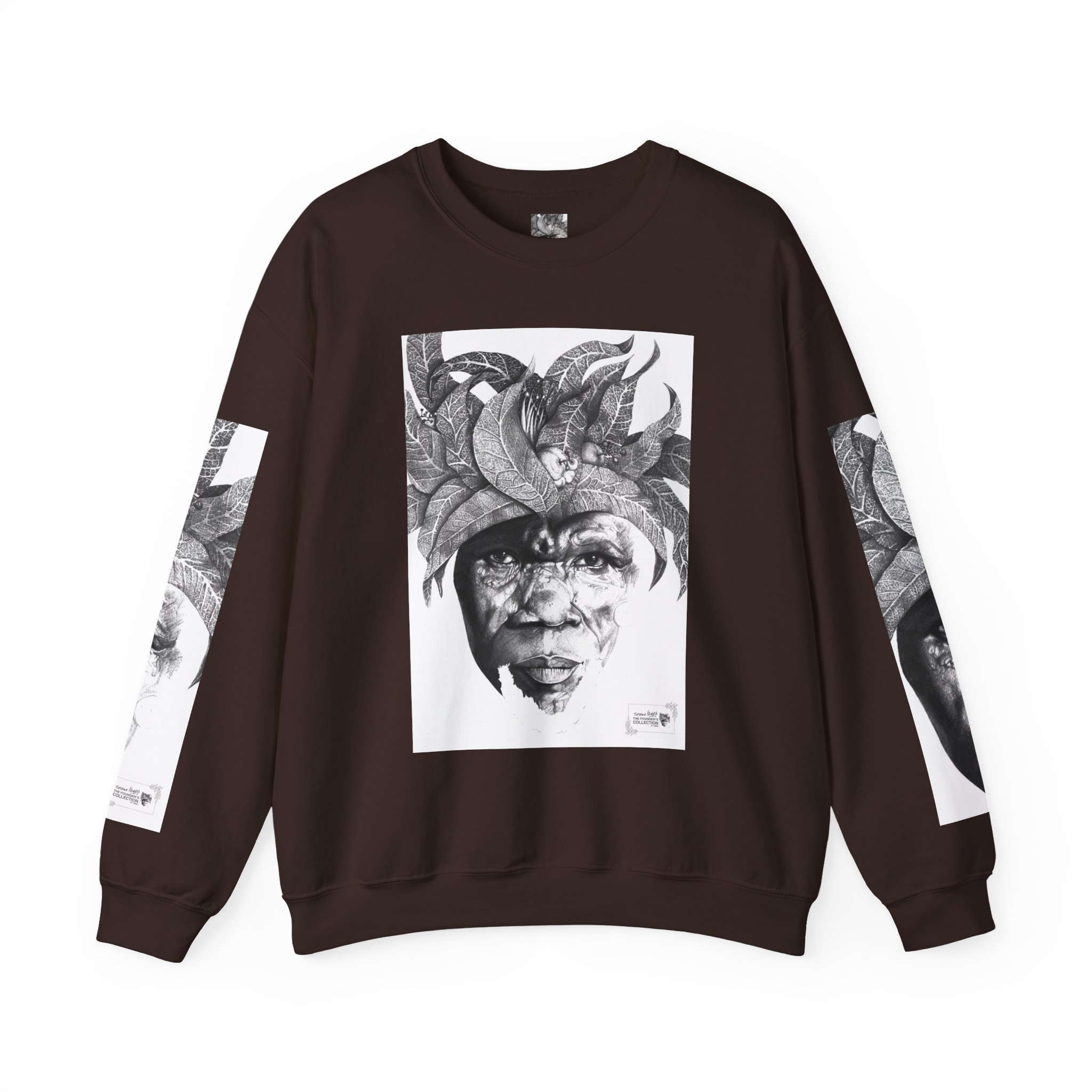 This crewneck sweatshirt carries the quiet, thoughtful energy of “The Original Sunman: Vision of the Founder’s Family” by Siphiwe Ngwenya. The monochrome portrait—layered with botanical swirls and a tribal headdress design—feels like a memory worn on the chest: gentle, soulful, and slightly mysterious. It embodies the “Artworks that Work” philosophy—art dedicated to driving economic and spiritual emancipation. This design draws on profound indigenous heritage, symbolizing the journey of communities transforming townships into vibrant centers of creative freedom and dignified self-expression.