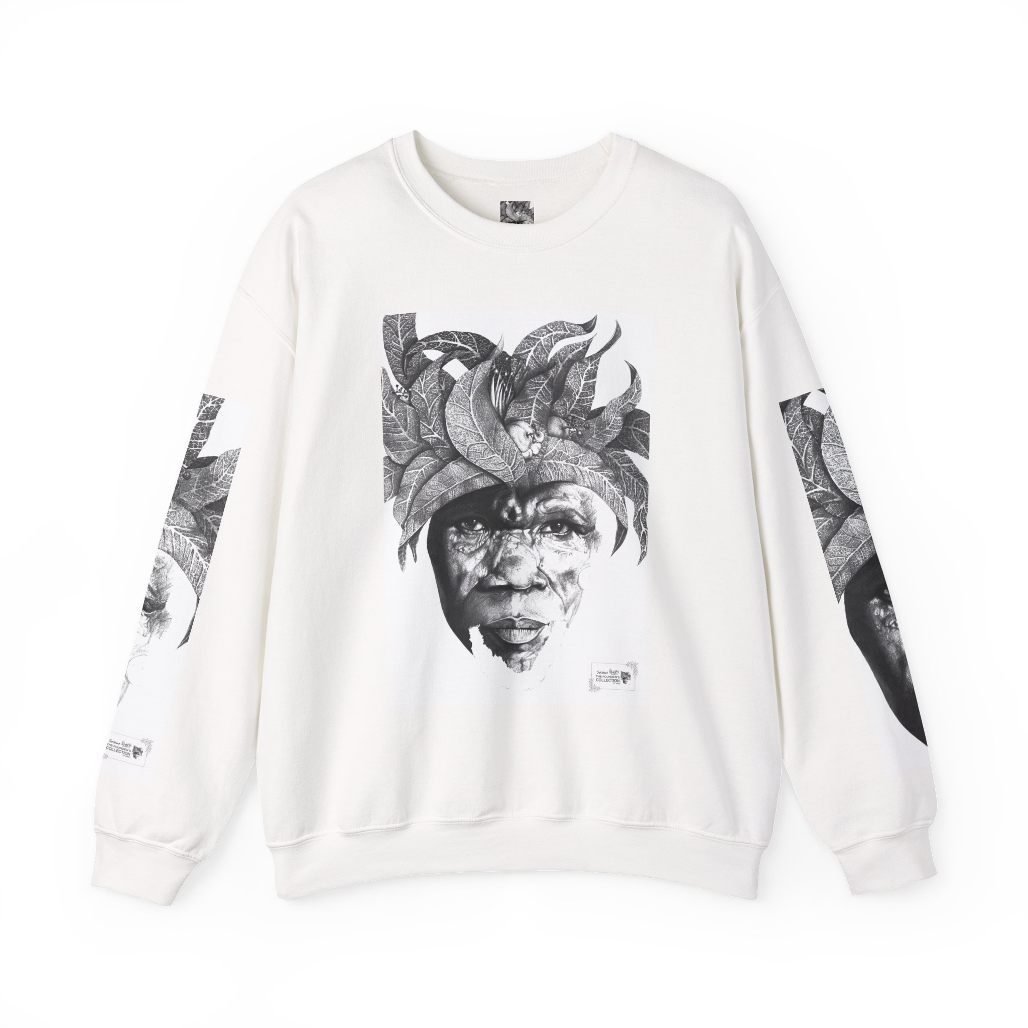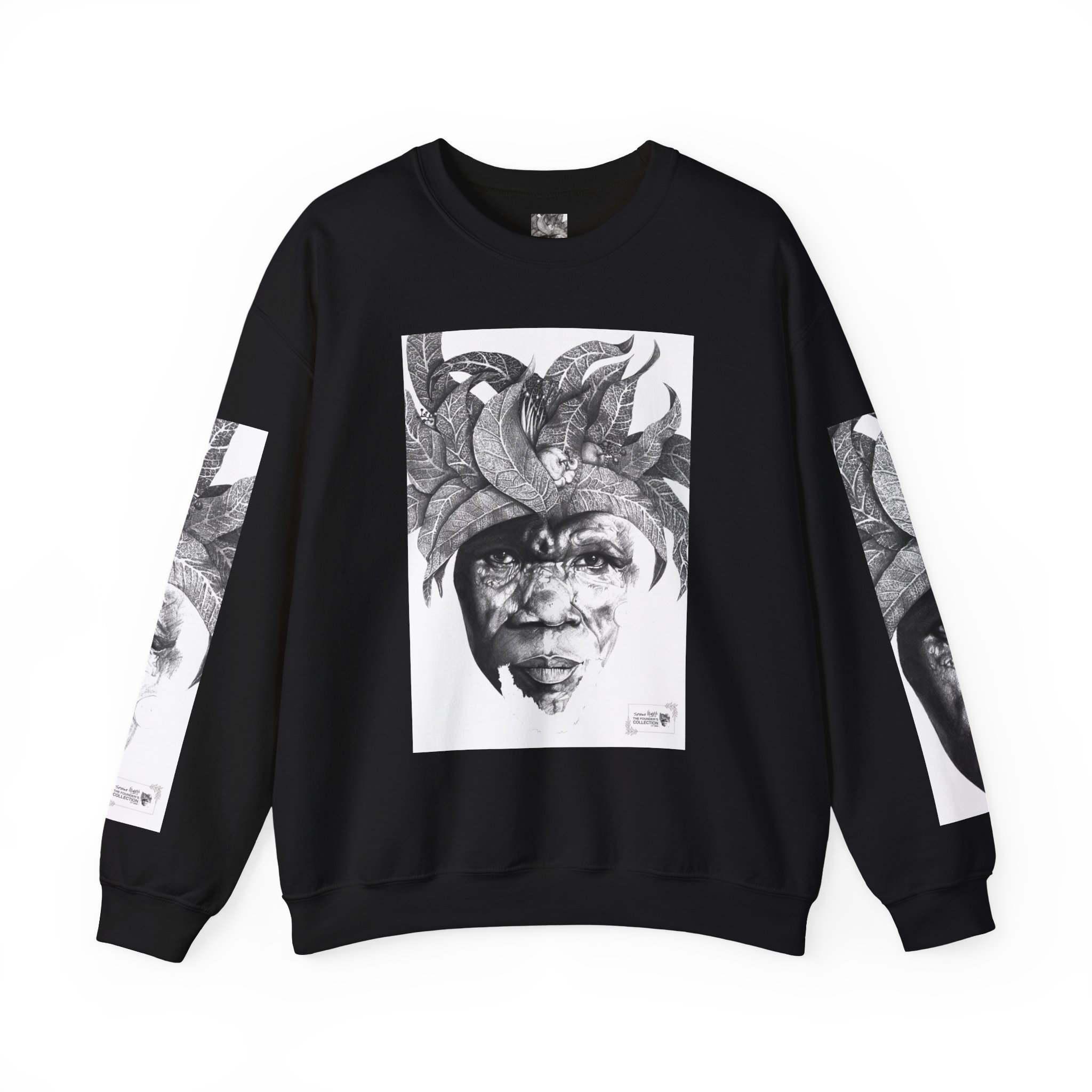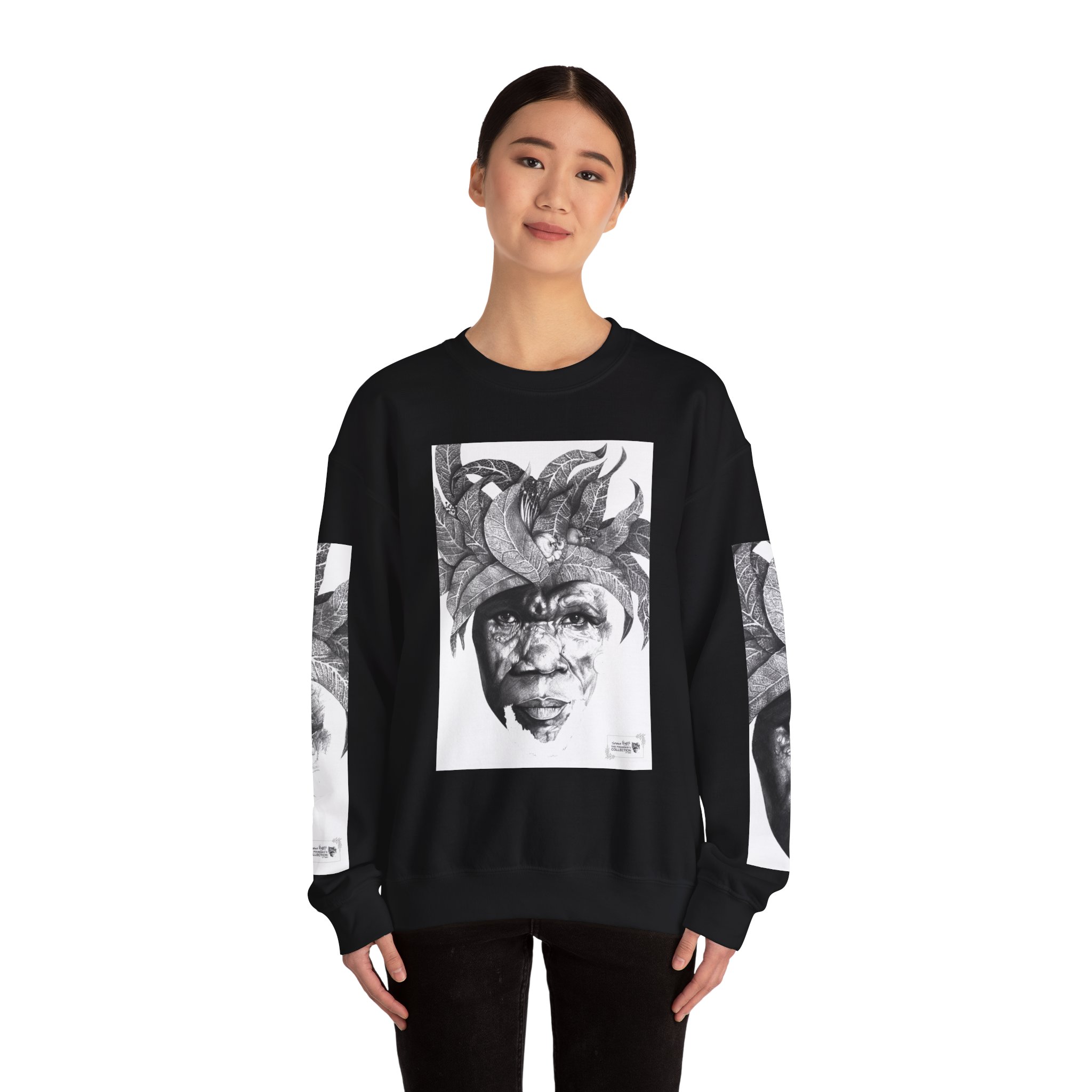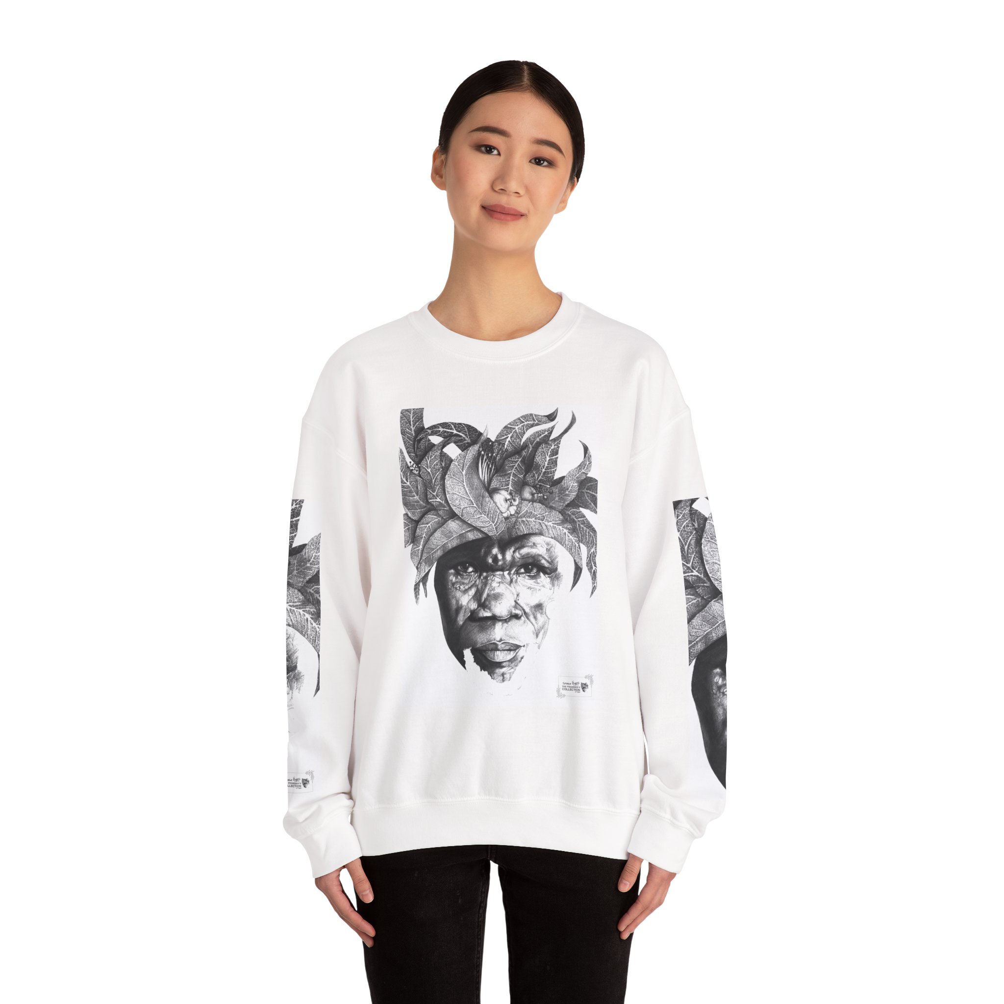 Soulful Legacy: “Artworks that Work” in a Monochrome Tribal Headdress Sweatshirt.