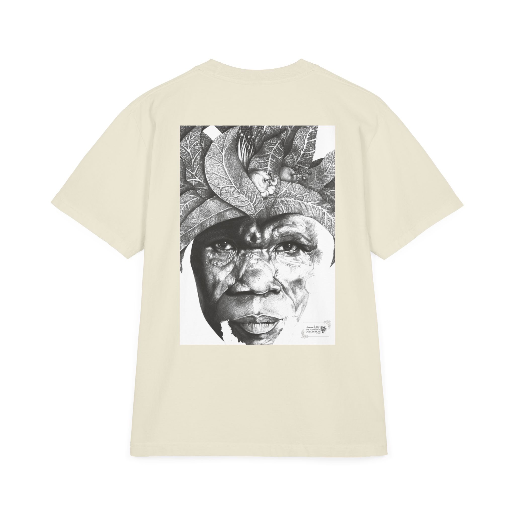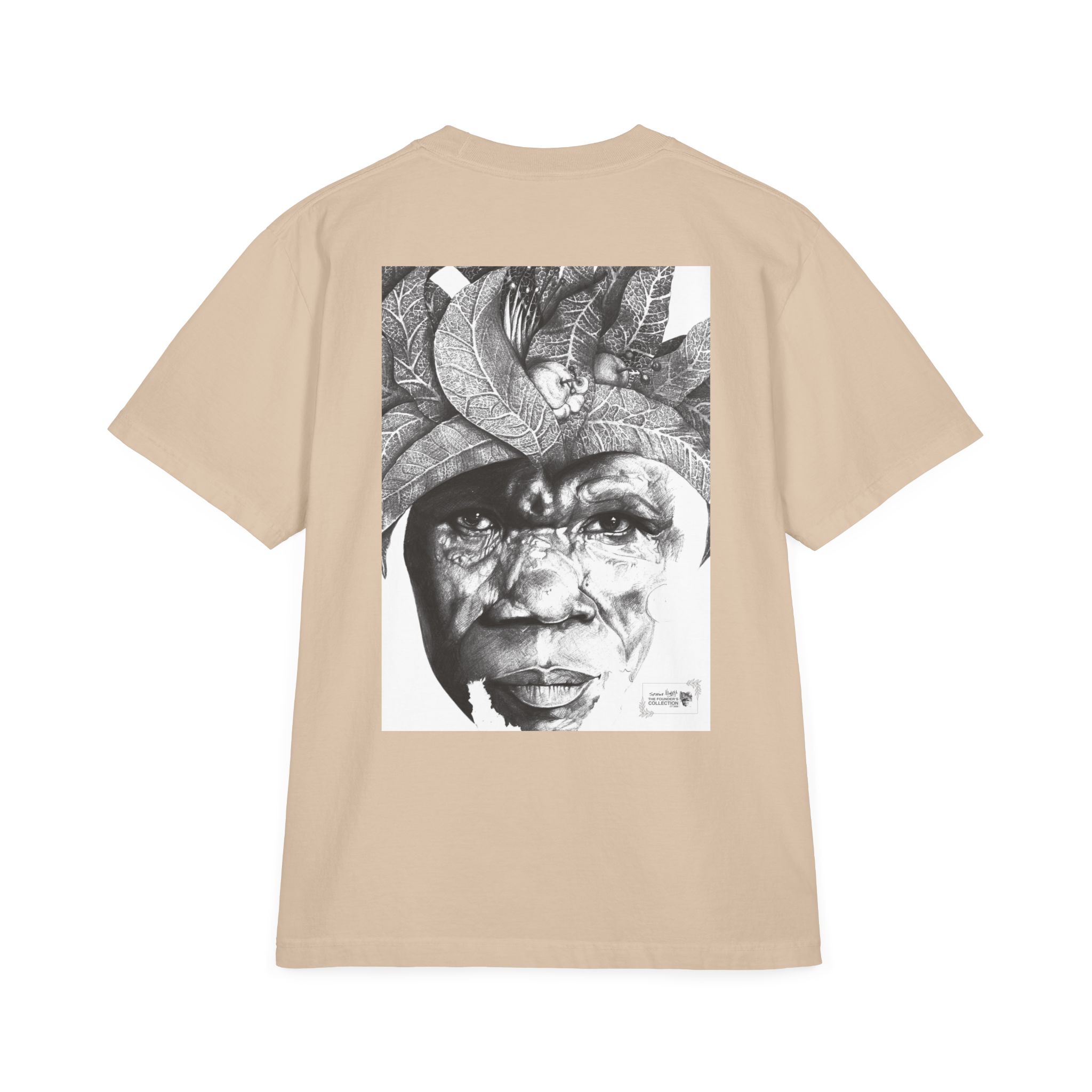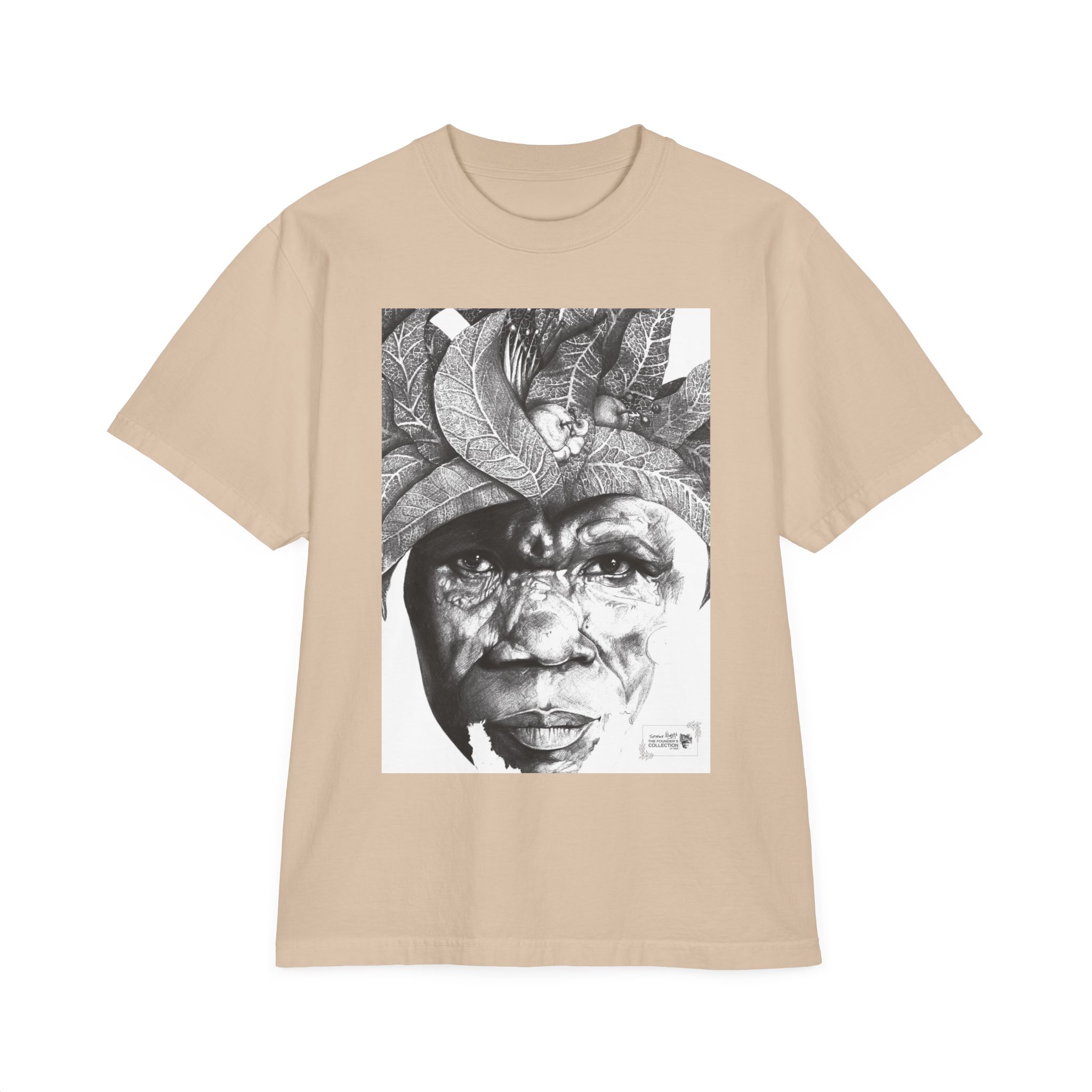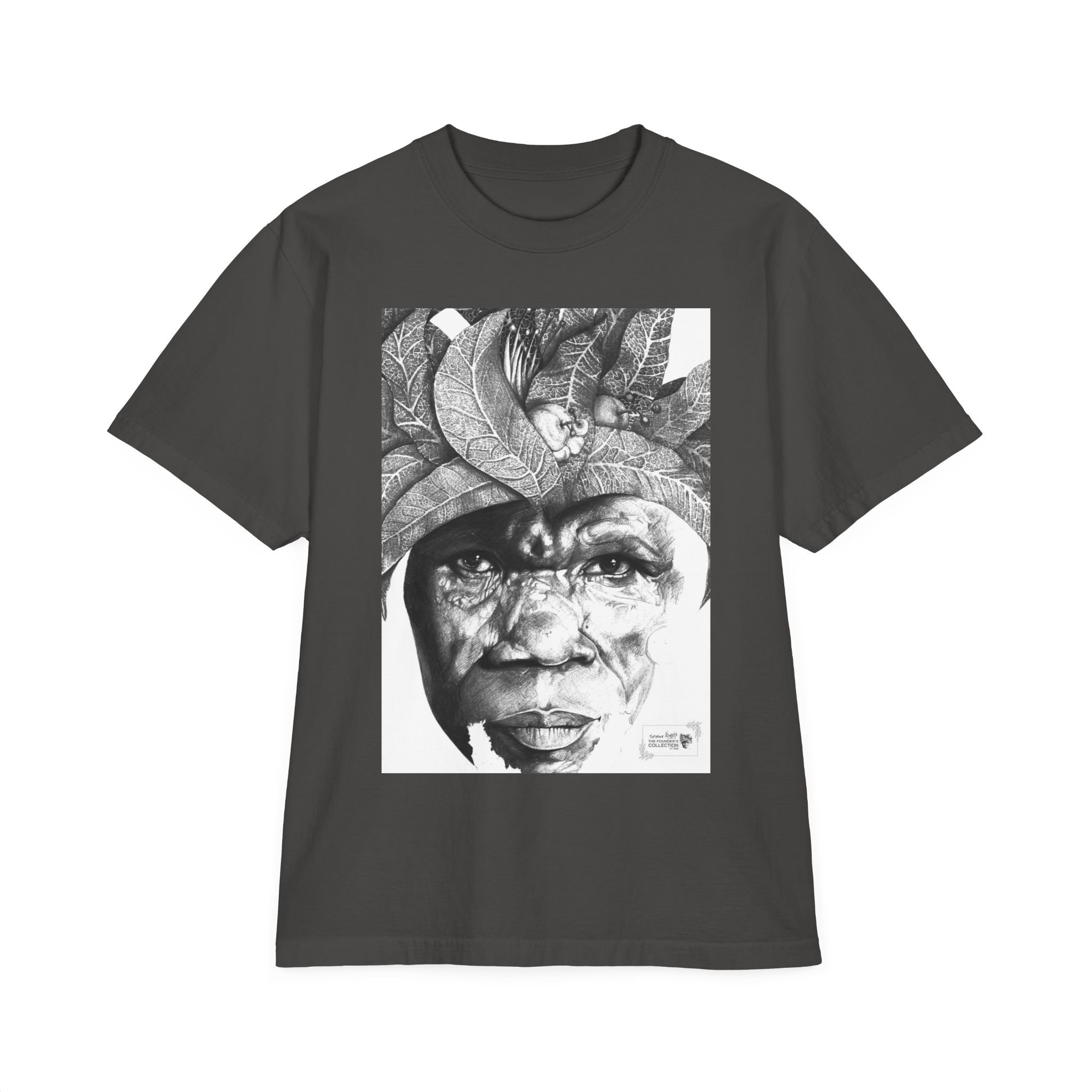 This garment-dyed drop-shoulder tee presents The Sunman – Guardian of the Orchard Mind as a handwritten, high-contrast portrait placed confidently at its center. Framed by organic, leaf-like forms, the face appears both rooted and reflective — an image that carries memory, care, and cultivated strength. The artwork reads like a wearable print gallery piece: bold in presence, yet softened by time and texture.