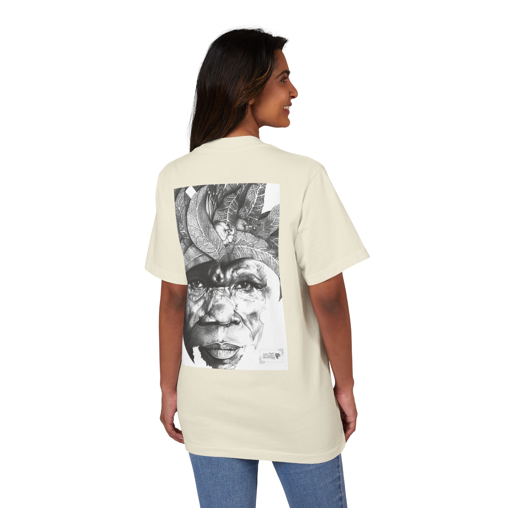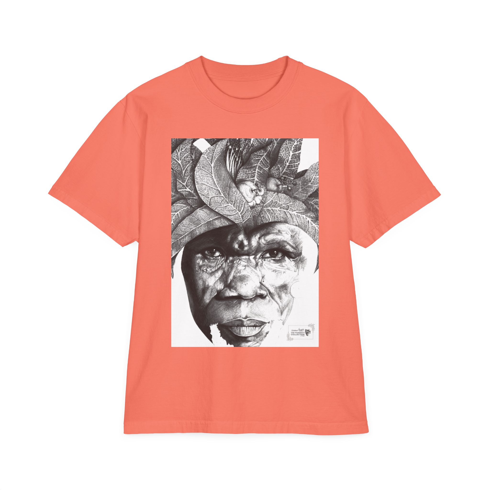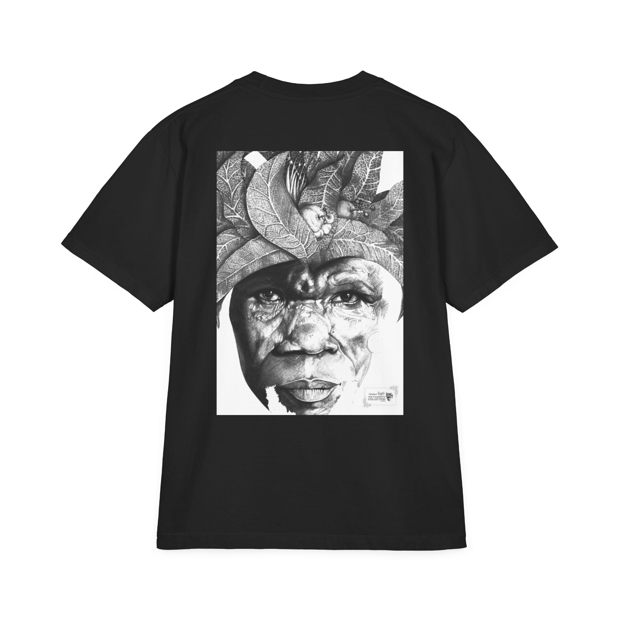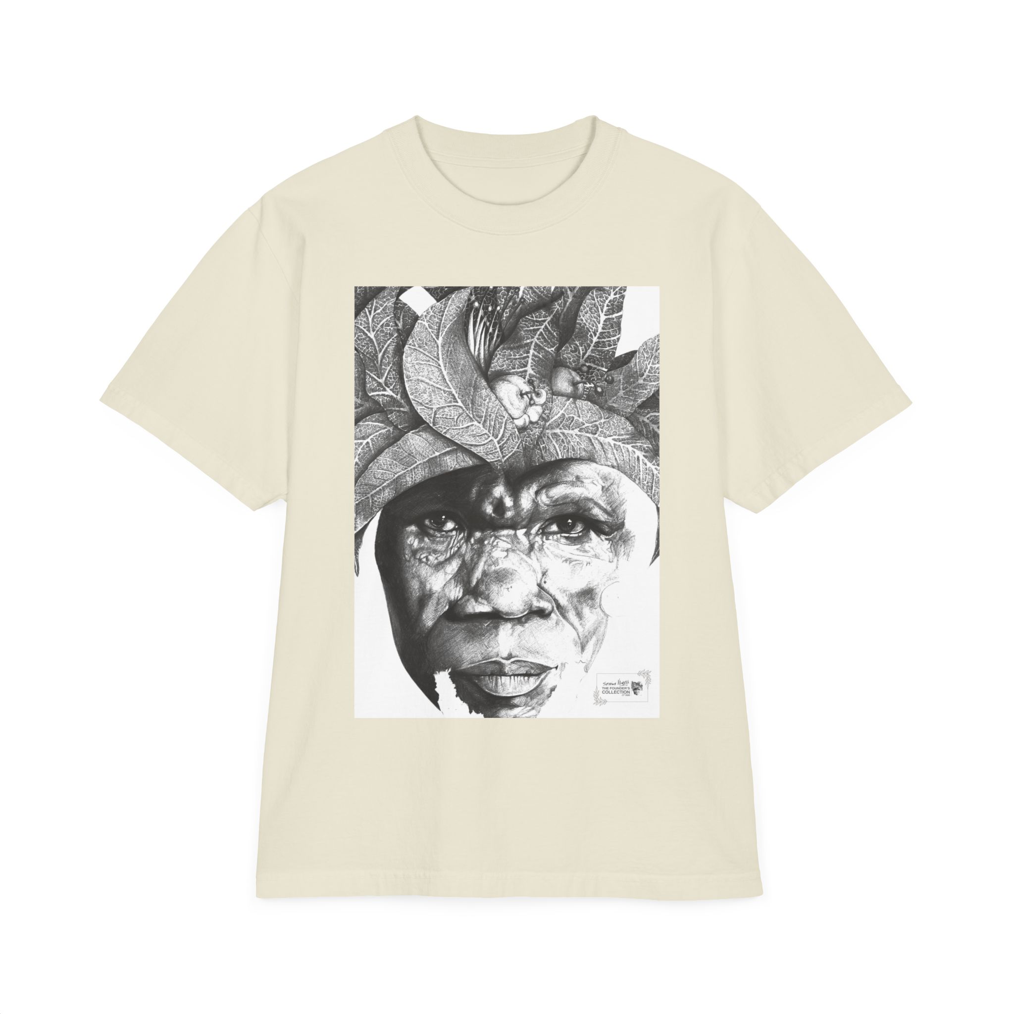 This garment-dyed drop-shoulder tee presents The Sunman – Guardian of the Orchard Mind as a handwritten, high-contrast portrait placed confidently at its center. Framed by organic, leaf-like forms, the face appears both rooted and reflective — an image that carries memory, care, and cultivated strength. The artwork reads like a wearable print gallery piece: bold in presence, yet softened by time and texture.