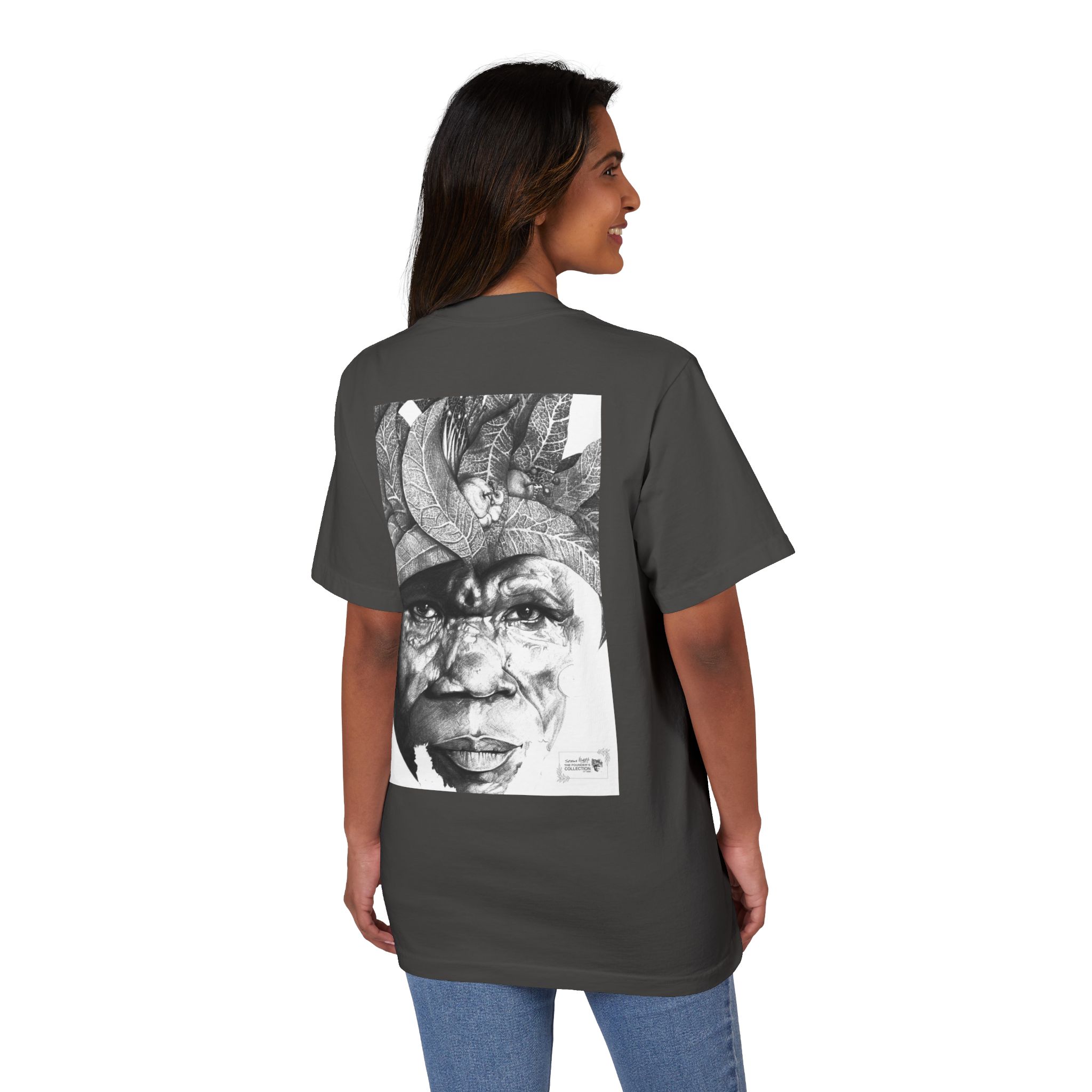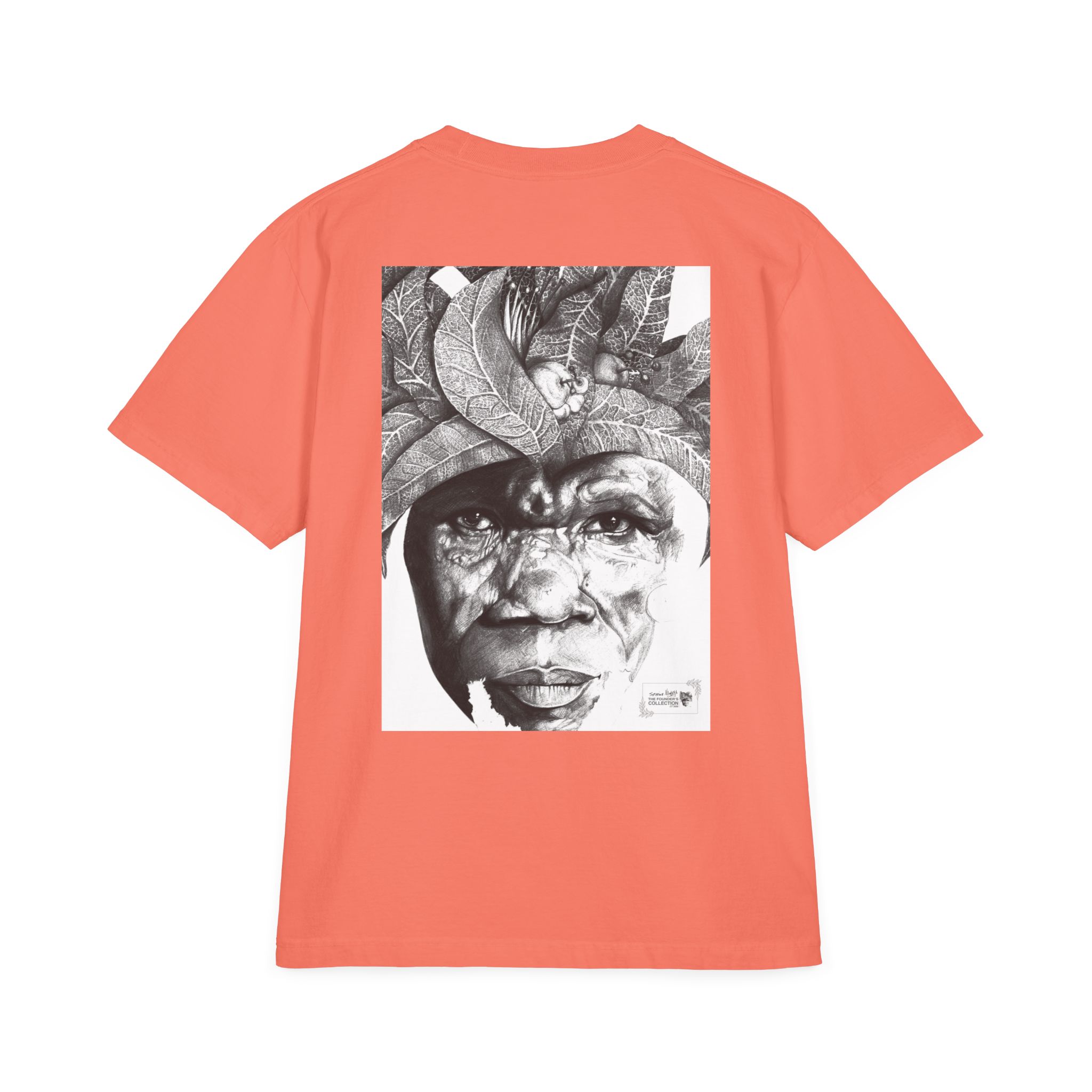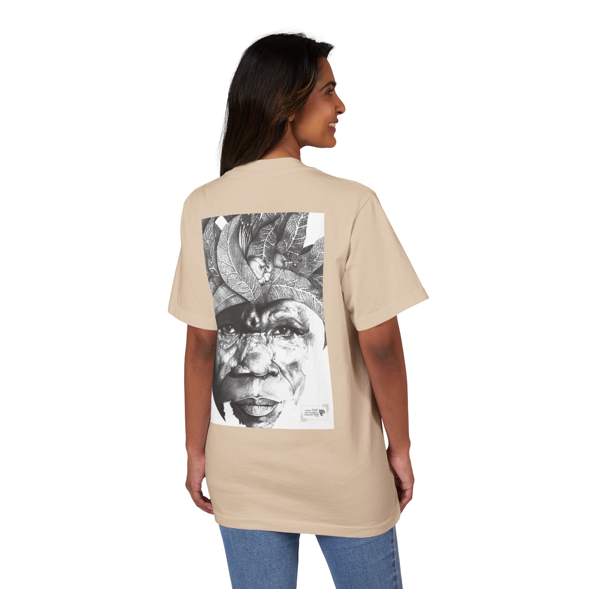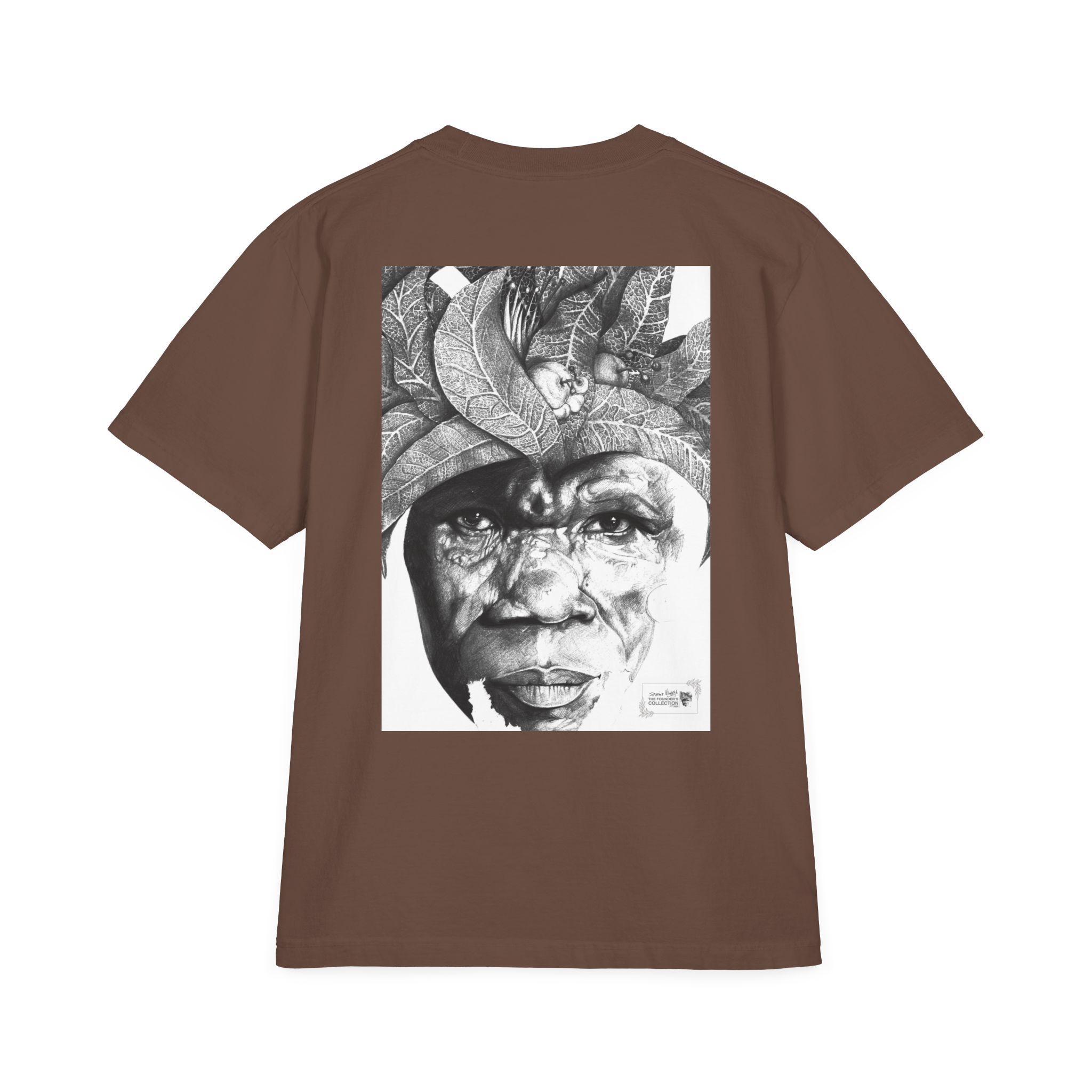 This garment-dyed drop-shoulder tee presents The Sunman – Guardian of the Orchard Mind as a handwritten, high-contrast portrait placed confidently at its center. Framed by organic, leaf-like forms, the face appears both rooted and reflective — an image that carries memory, care, and cultivated strength. The artwork reads like a wearable print gallery piece: bold in presence, yet softened by time and texture.