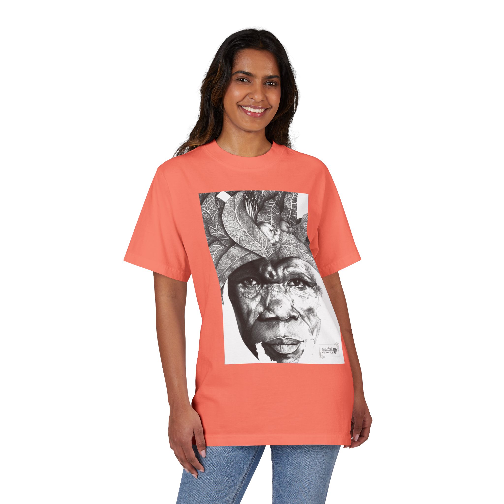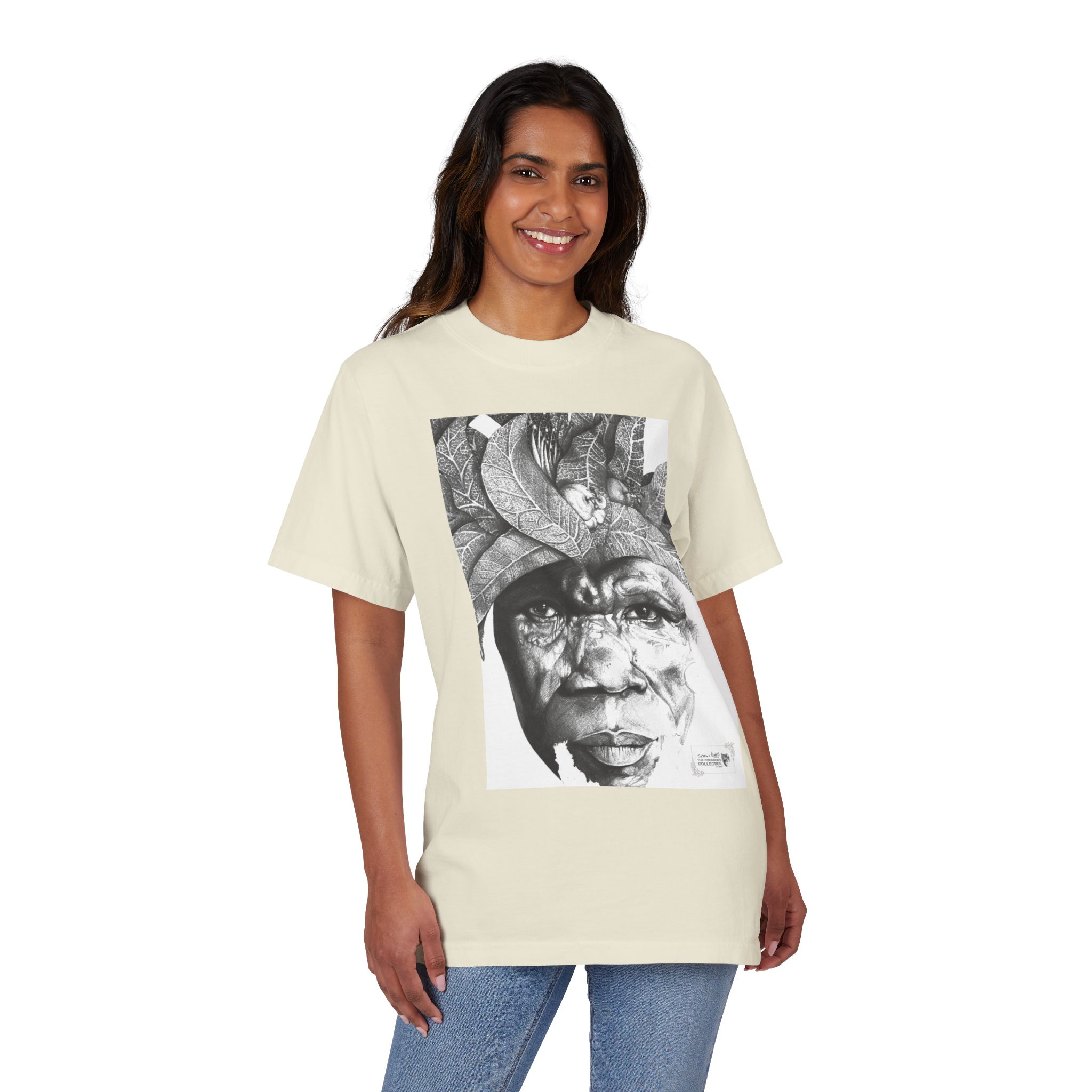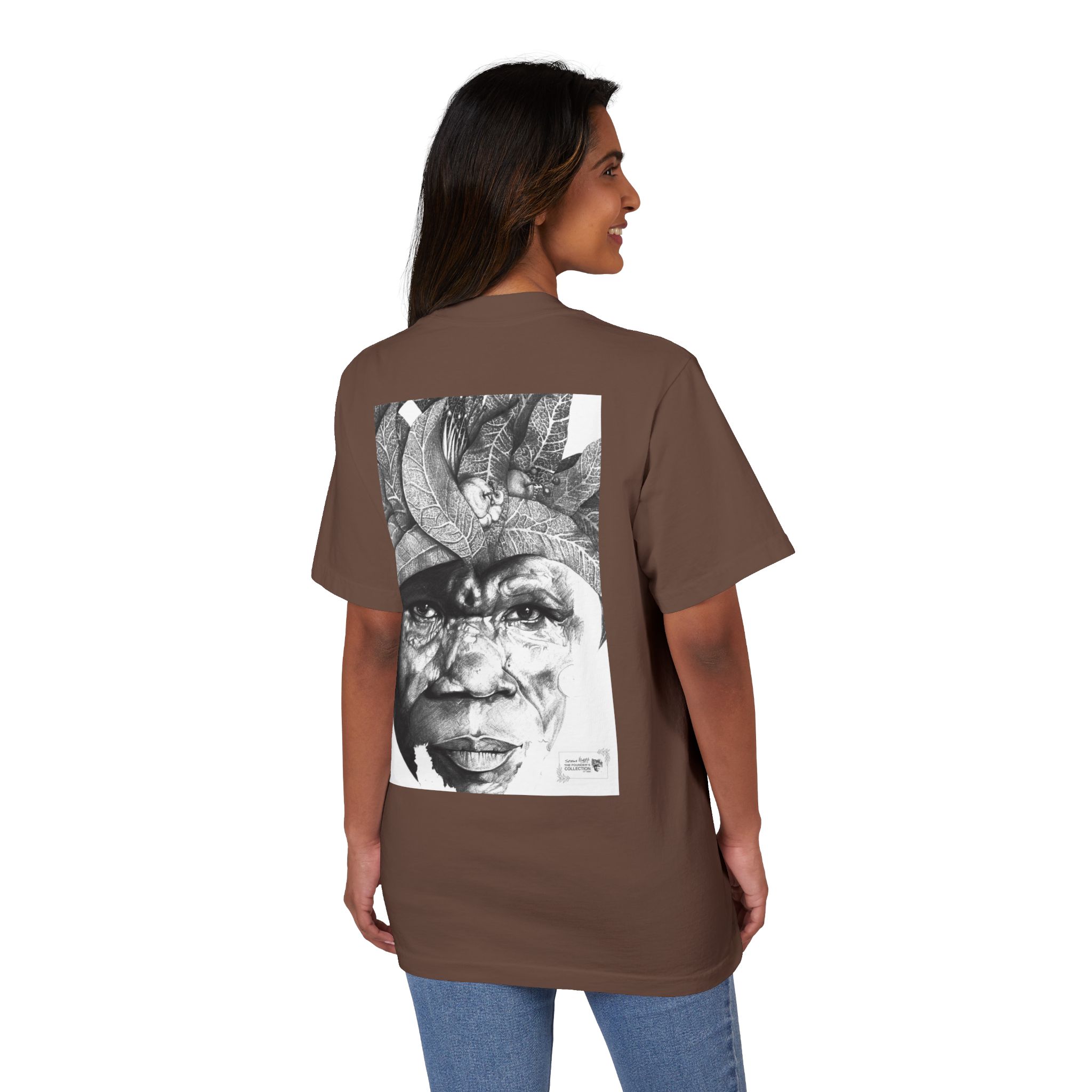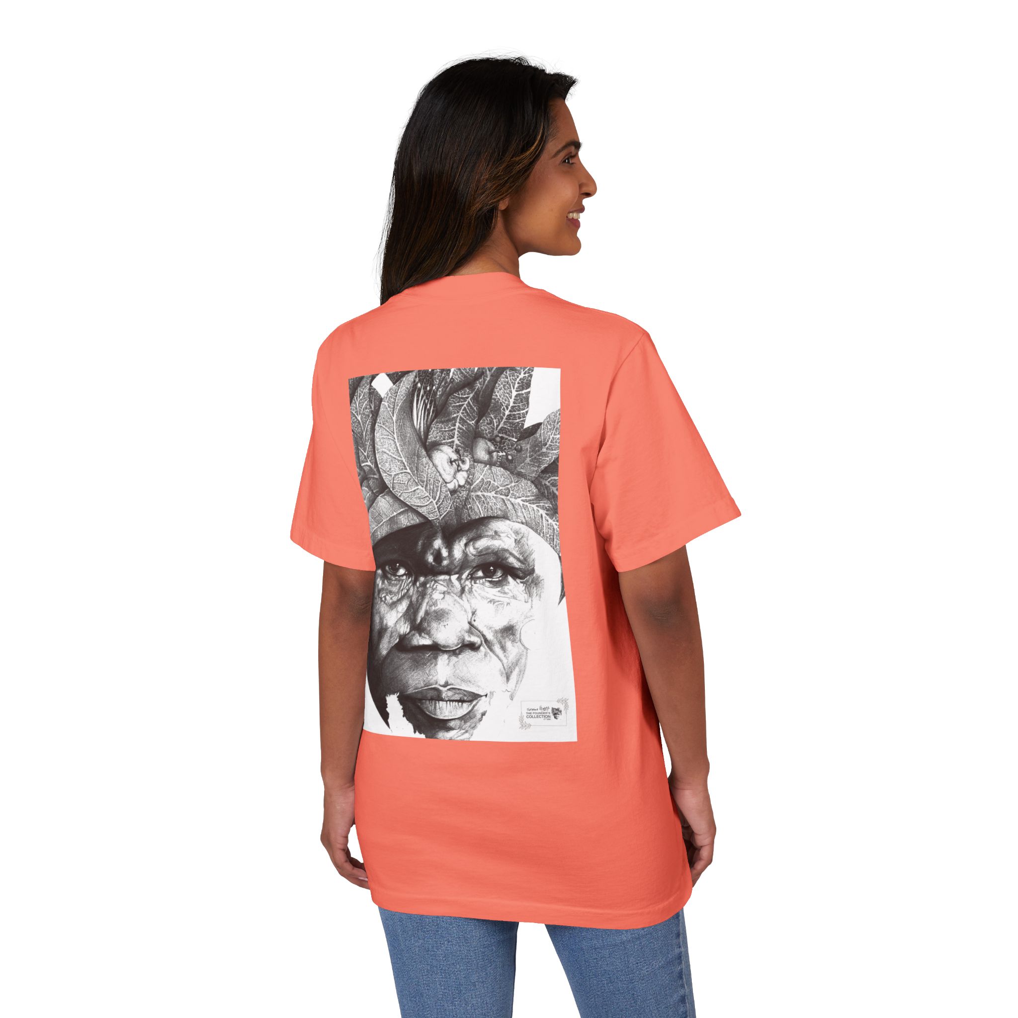 This garment-dyed drop-shoulder tee presents The Sunman – Guardian of the Orchard Mind as a handwritten, high-contrast portrait placed confidently at its center. Framed by organic, leaf-like forms, the face appears both rooted and reflective — an image that carries memory, care, and cultivated strength. The artwork reads like a wearable print gallery piece: bold in presence, yet softened by time and texture.