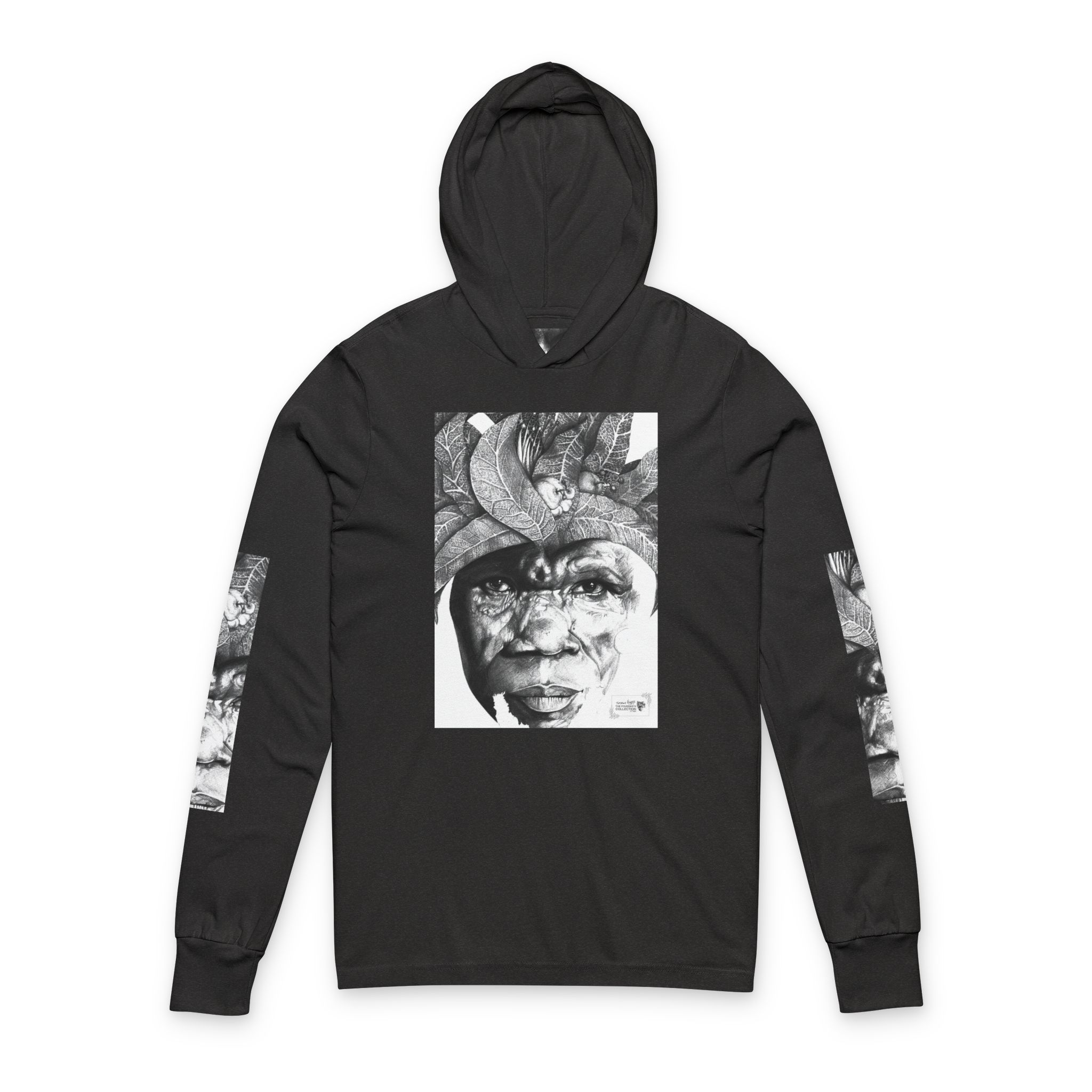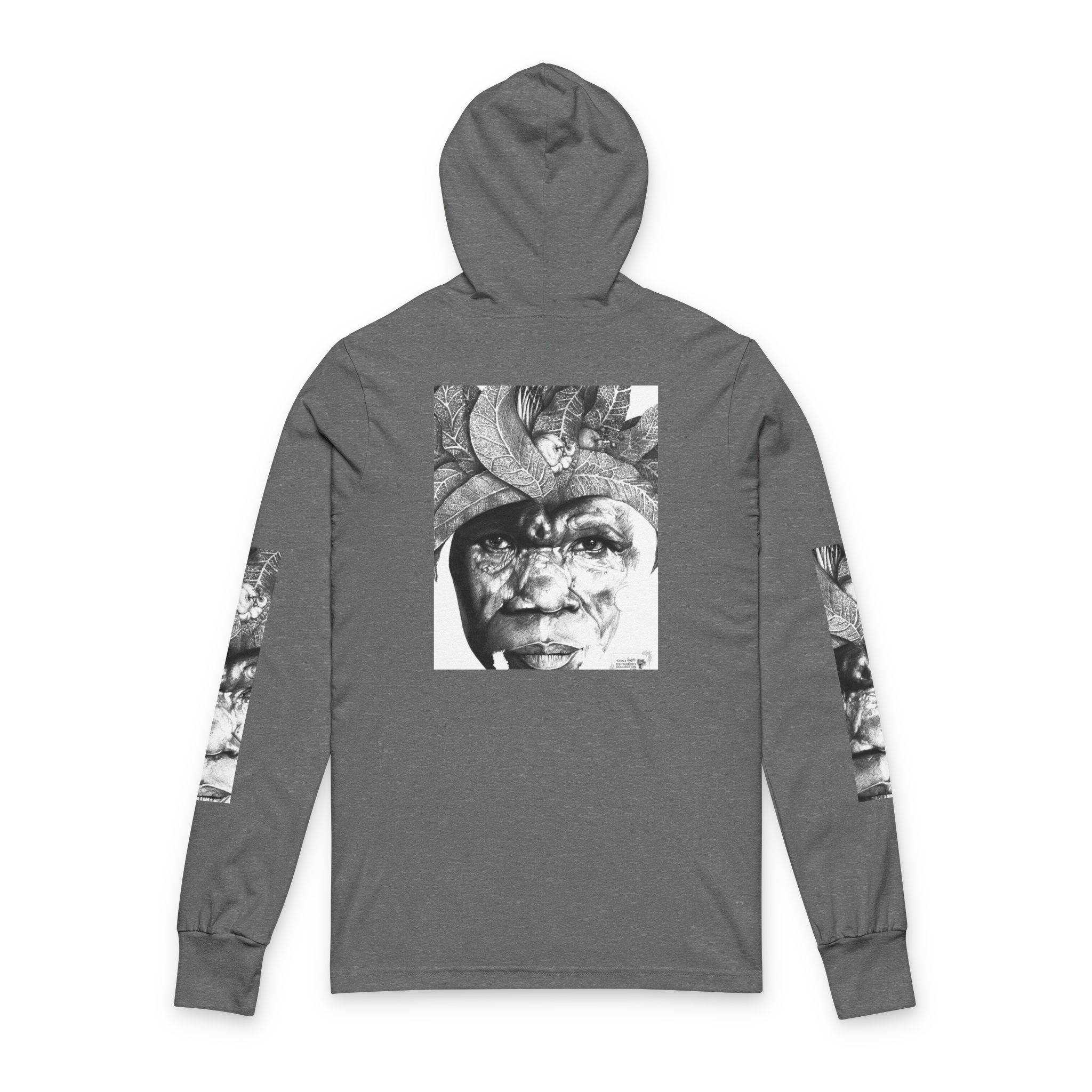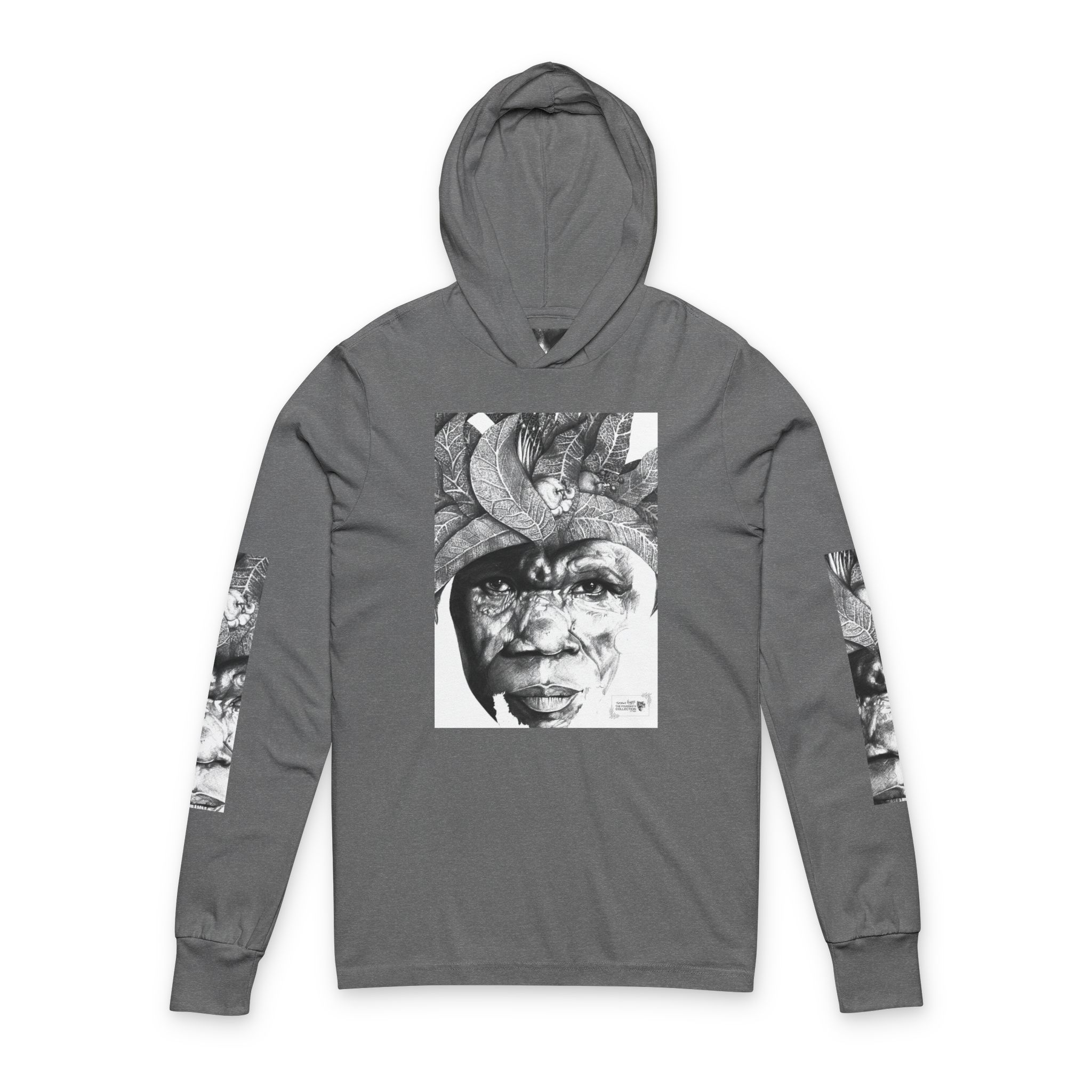 This lightweight hooded long-sleeve layers like a favorite band tee while carrying a quietly expressive, artful presence. A monochrome portrait collage — a weathered face framed by sculptural, organic forms — spans the front and back, with vertical matching prints running down each sleeve. The soft airlume cotton drapes smoothly against the skin, and side-seamed construction keeps the silhouette clean and resilient through repeated washes.
