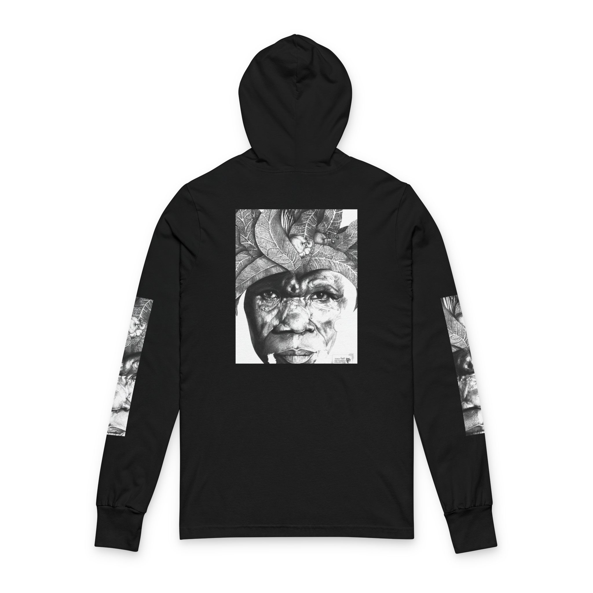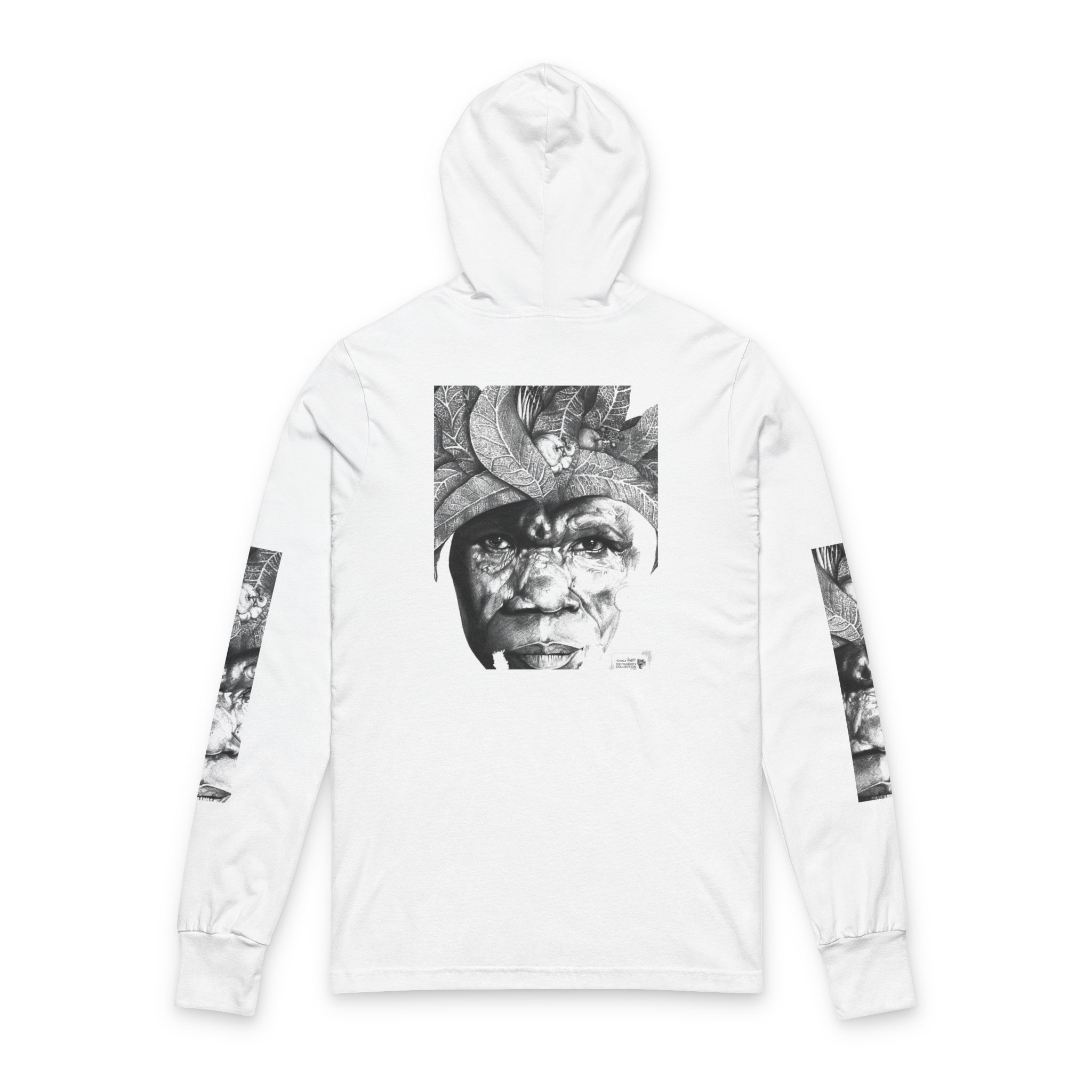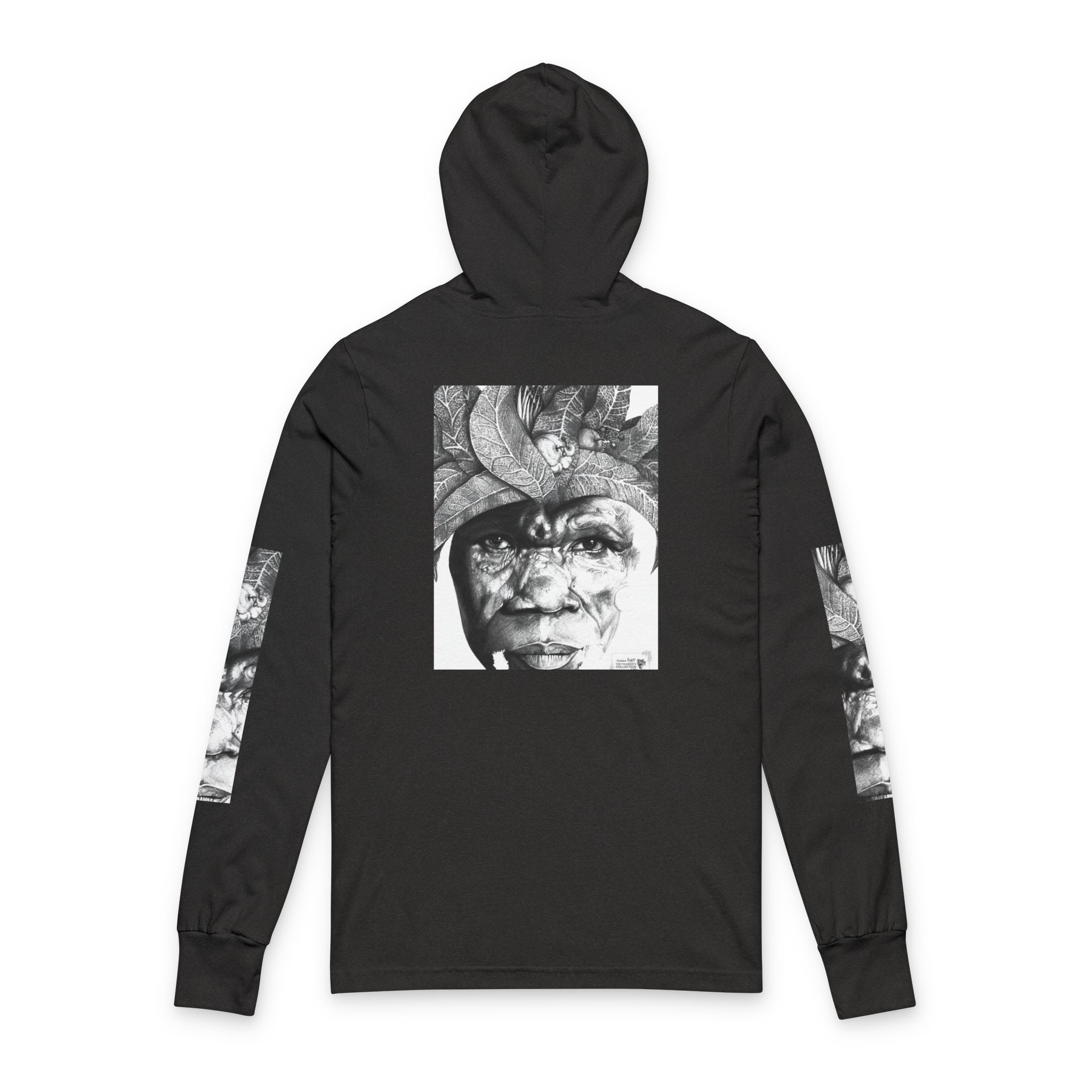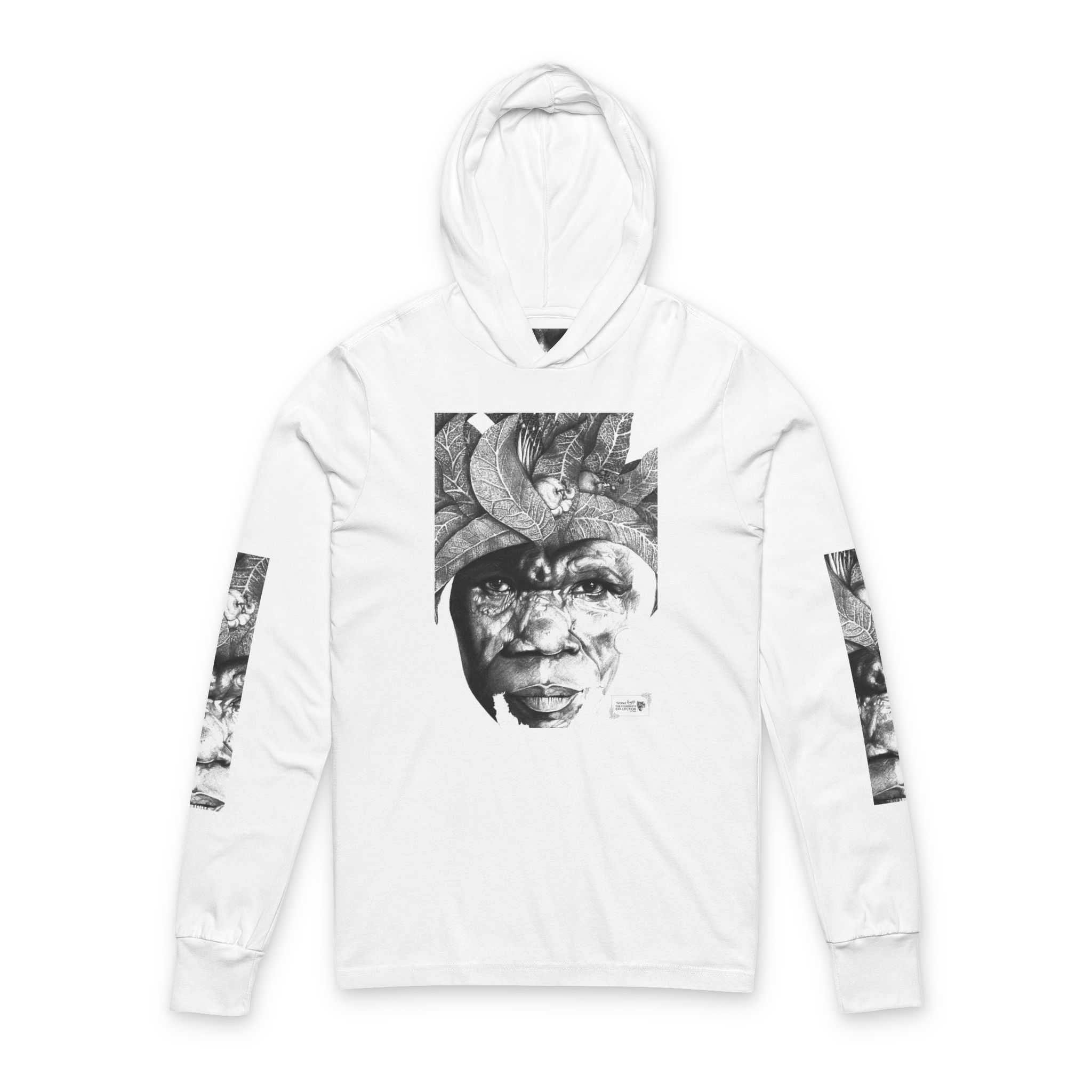 This lightweight hooded long-sleeve layers like a favorite band tee while carrying a quietly expressive, artful presence. A monochrome portrait collage — a weathered face framed by sculptural, organic forms — spans the front and back, with vertical matching prints running down each sleeve. The soft airlume cotton drapes smoothly against the skin, and side-seamed construction keeps the silhouette clean and resilient through repeated washes.