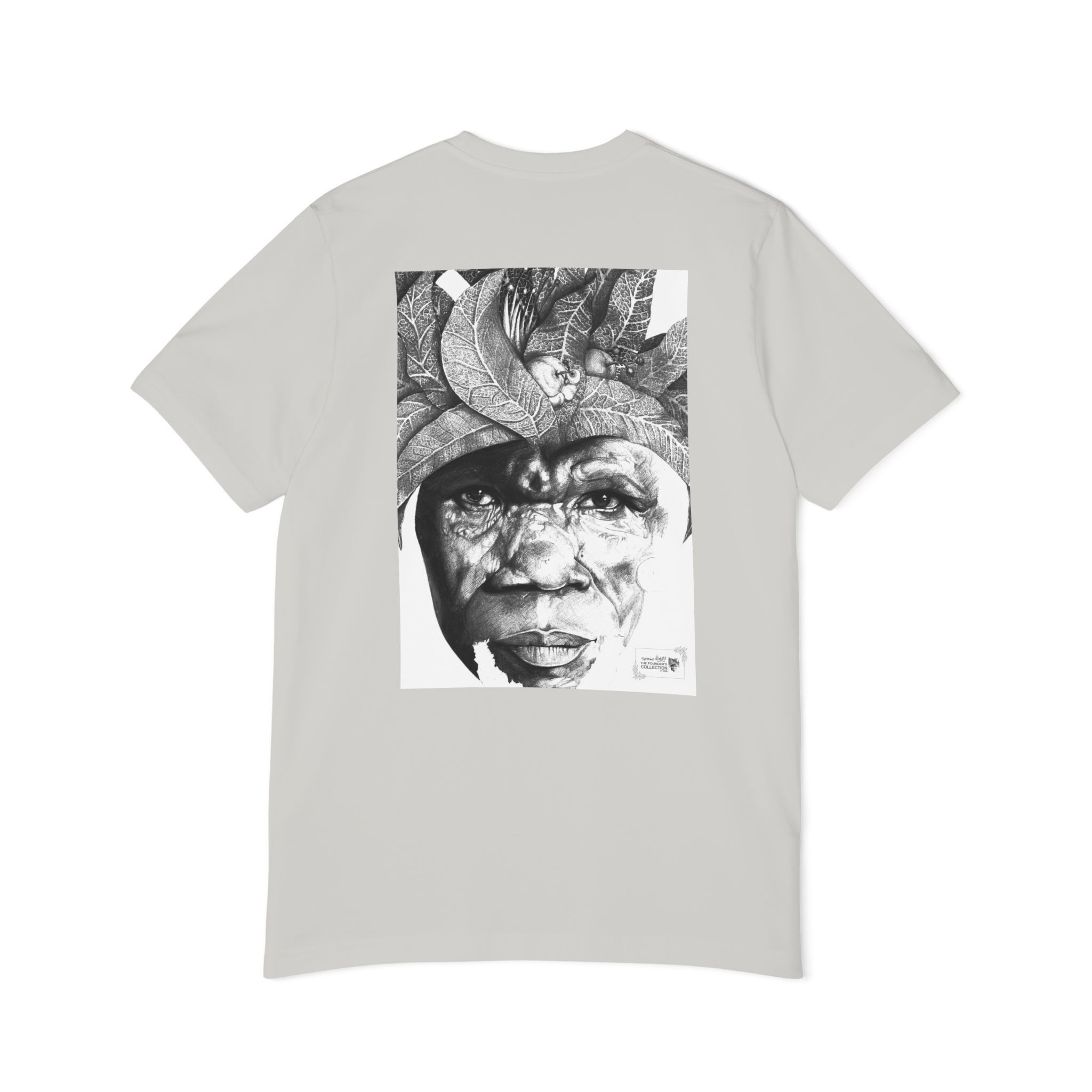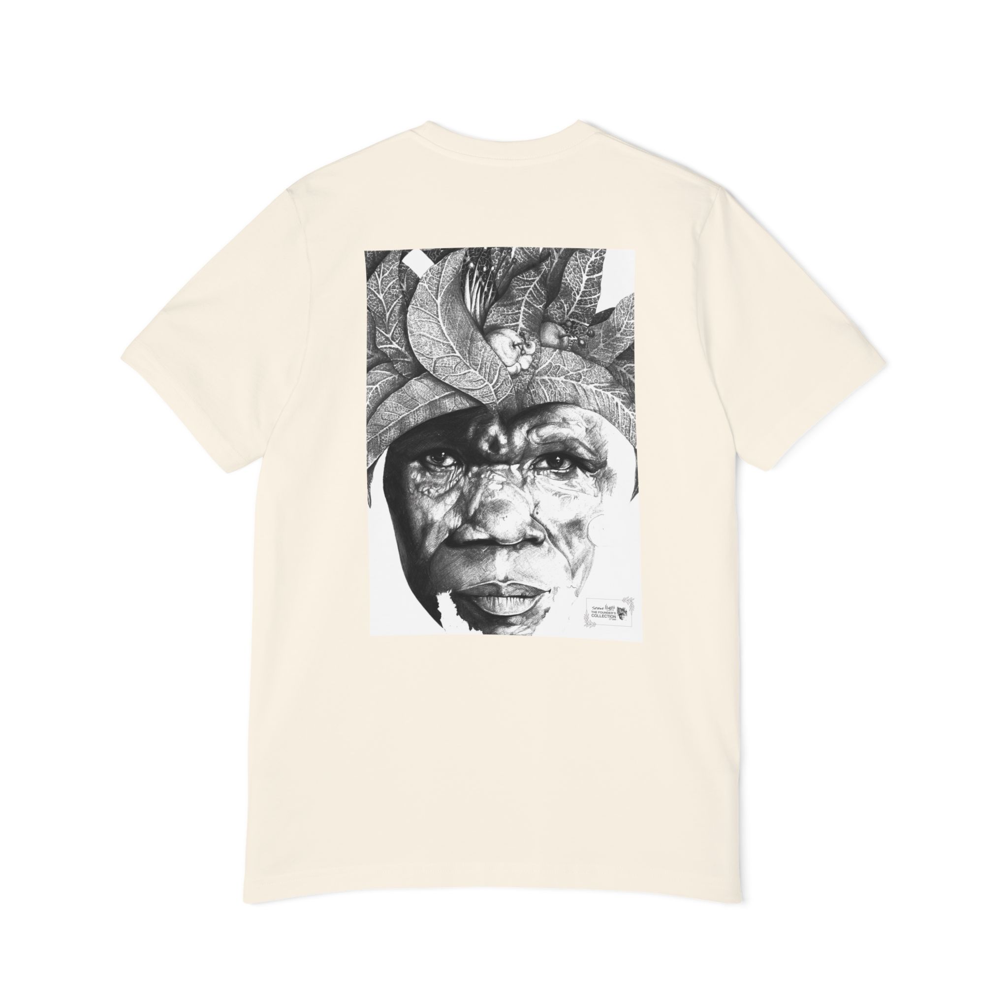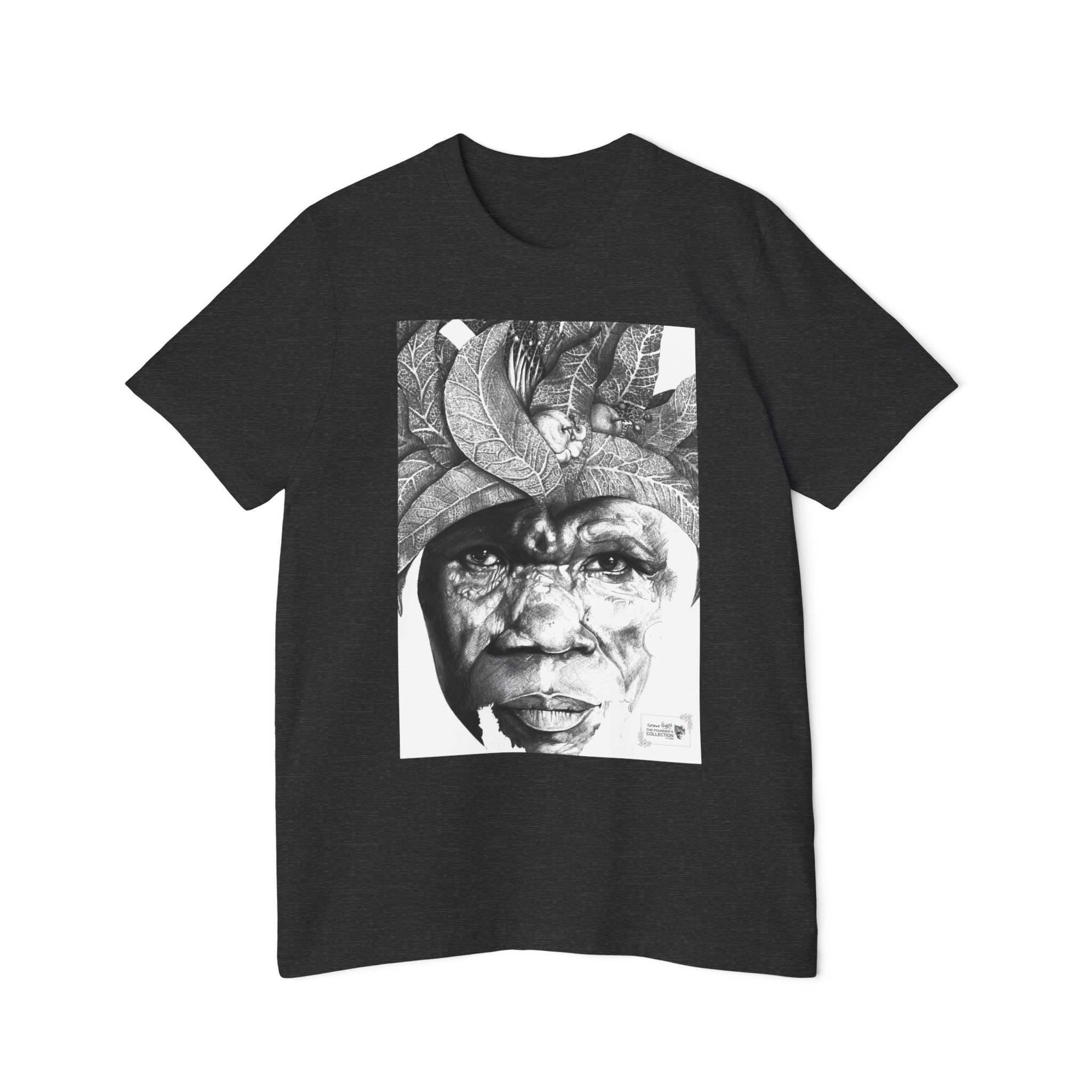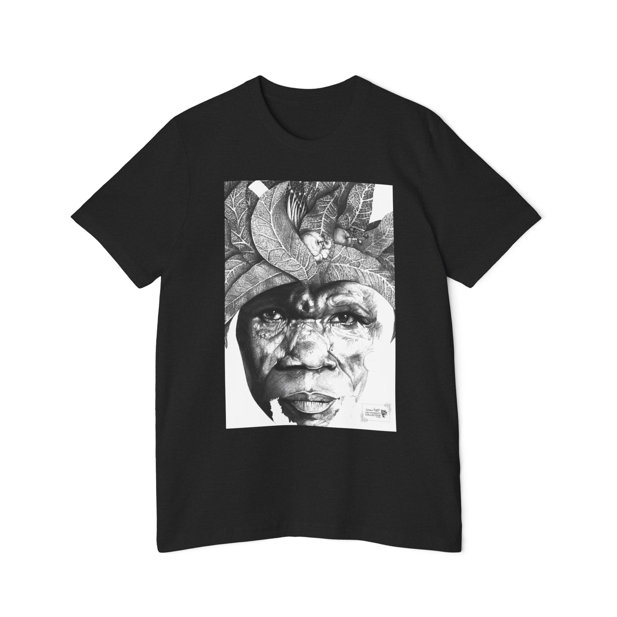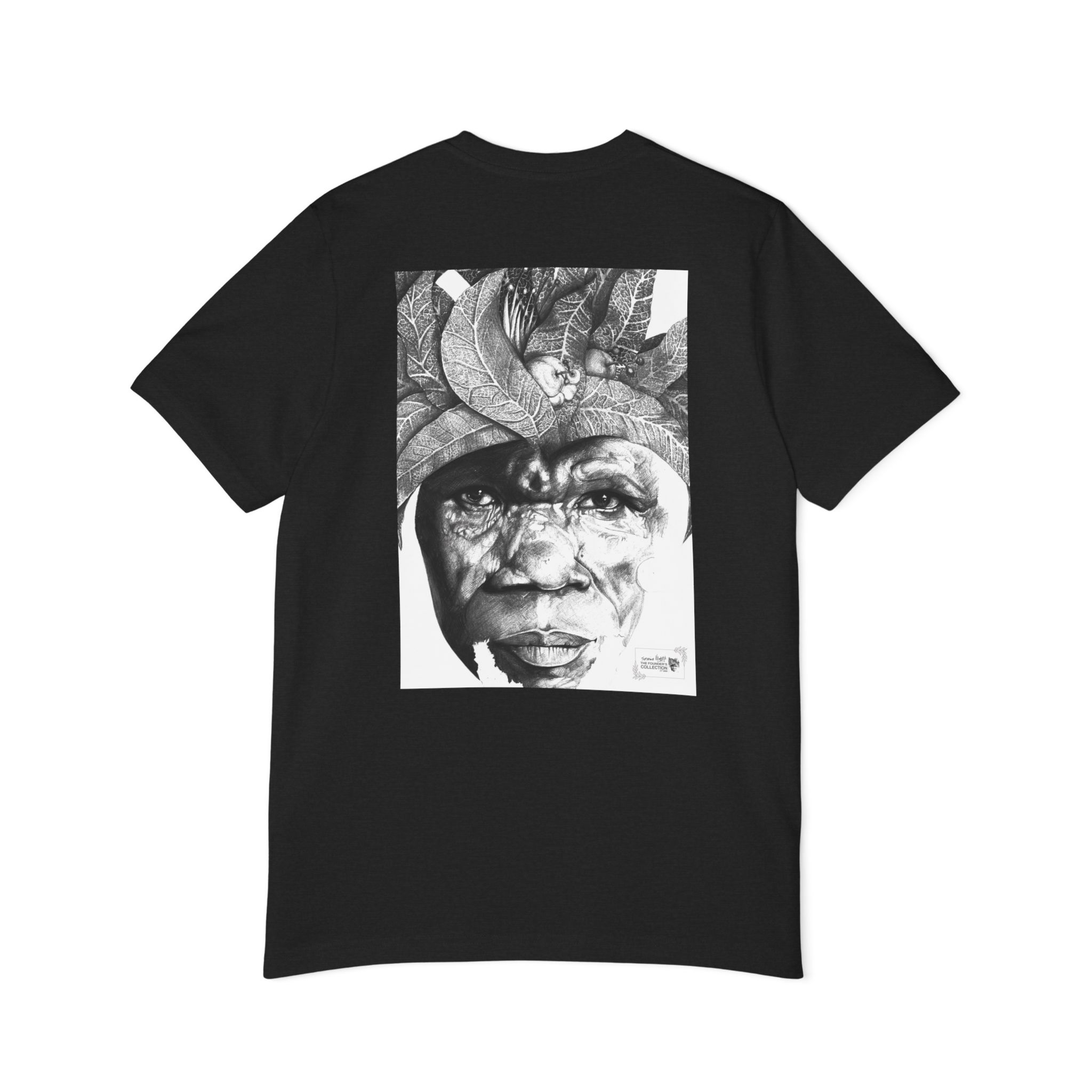This lightweight jersey T-shirt features The Sunman – Guardian of the Orchard Mind rendered as a bold, hand-drawn monochrome portrait that merges portraiture with botanical symbolism. The dignified face, framed by woven leaf forms and fine-line textures, reflects cultivated wisdom — a mind tended like an orchard and shared for the good of the collective. The composition reads as quiet but resolute wearable art, grounding contemporary style in ancestry, care, and continuity.