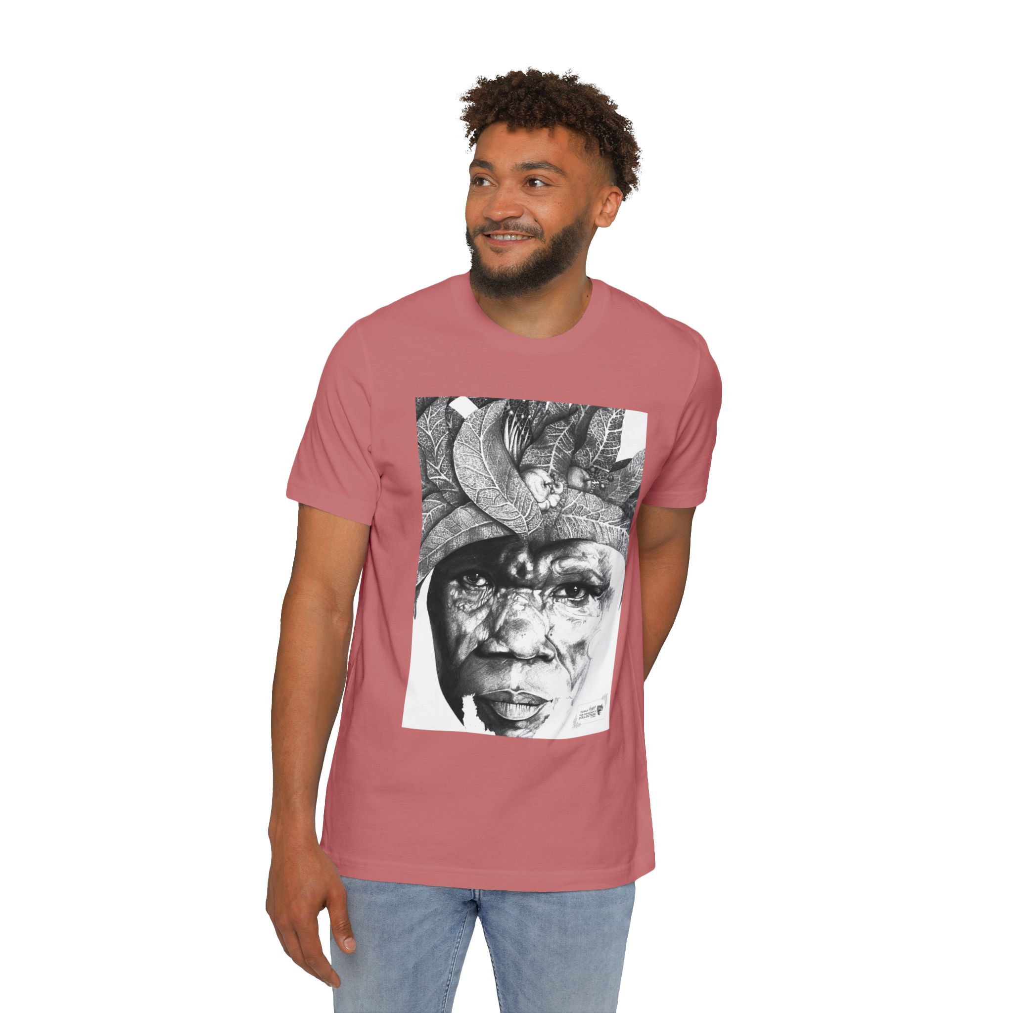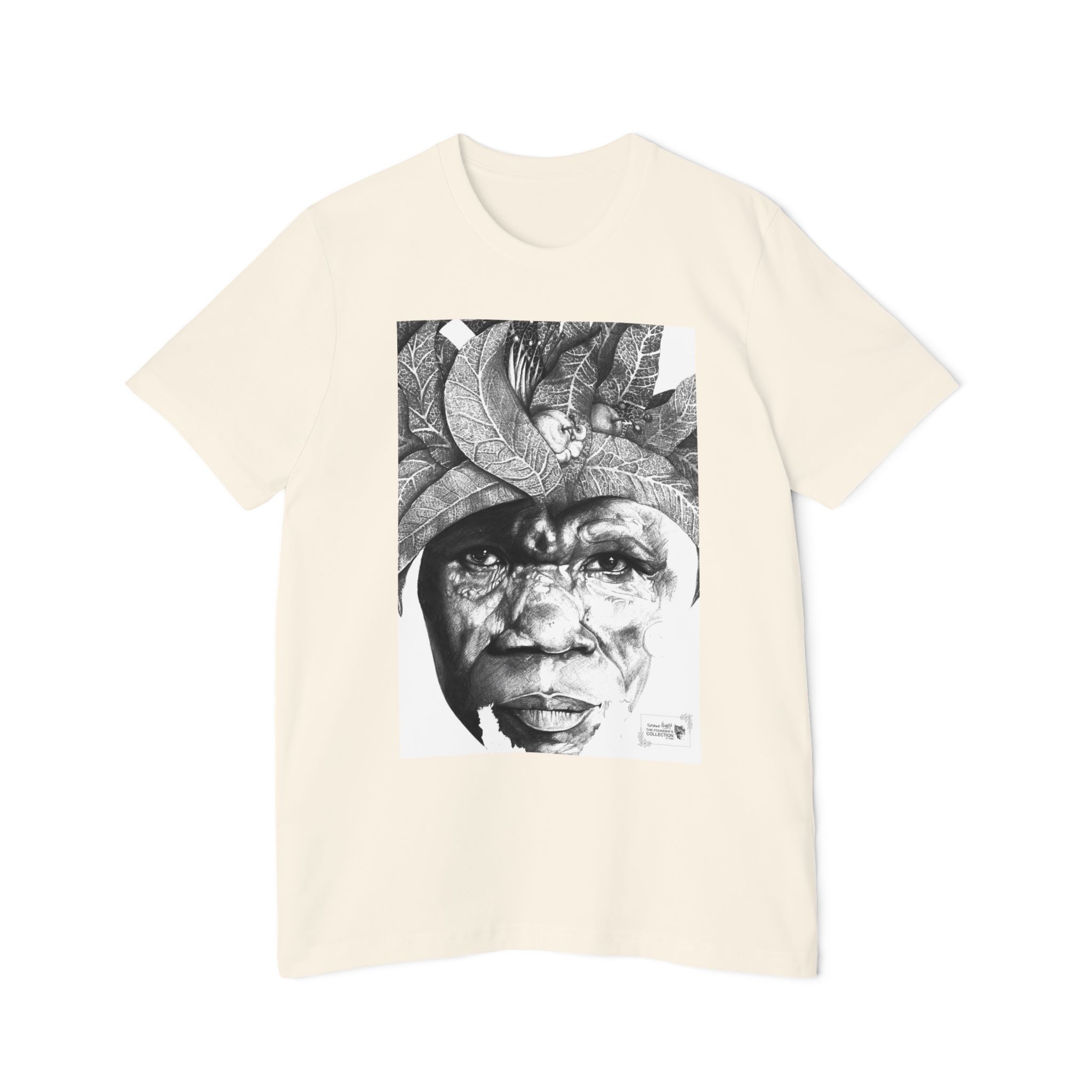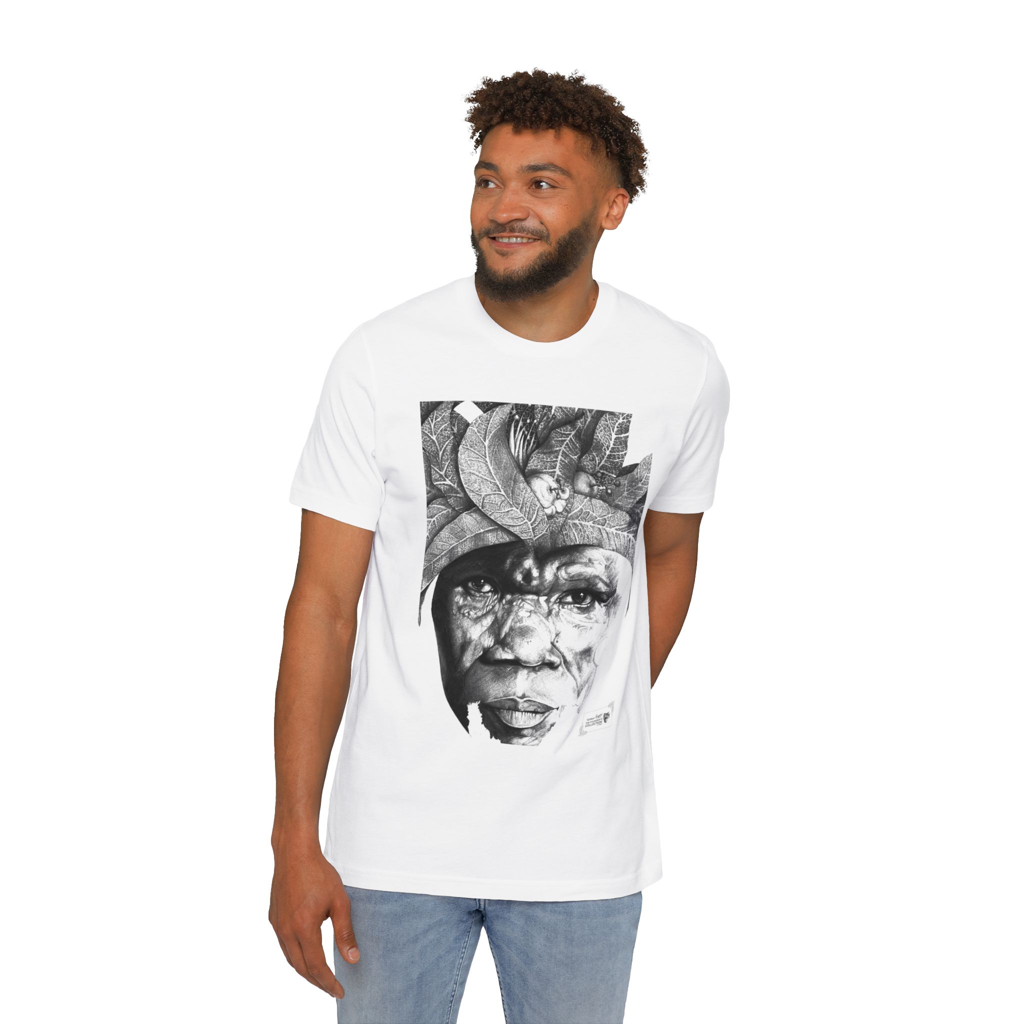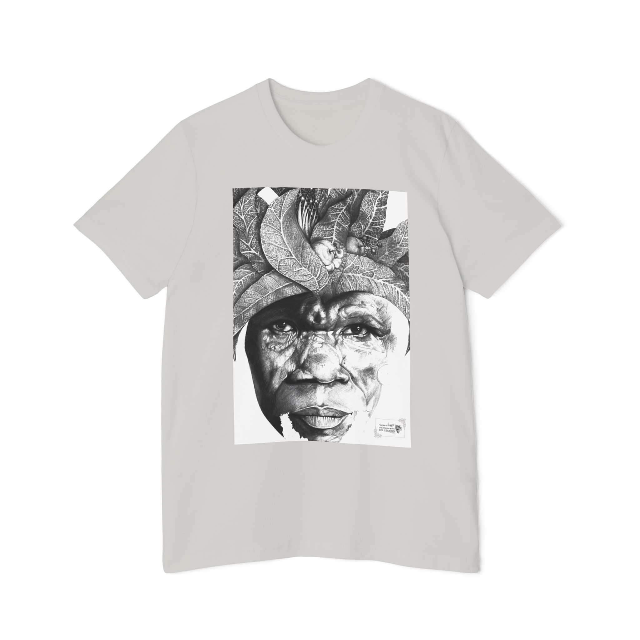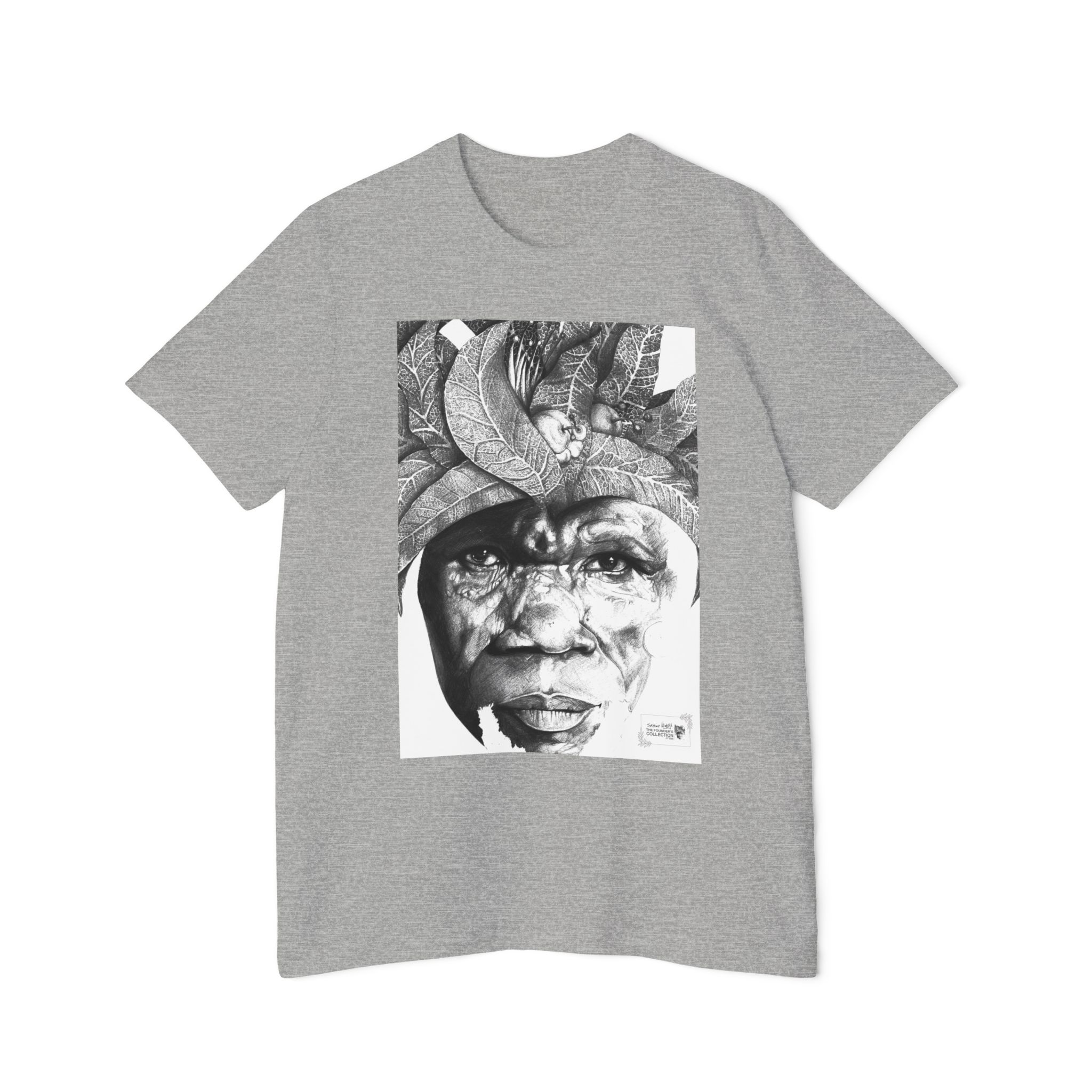 This lightweight jersey T-shirt features The Sunman – Guardian of the Orchard Mind rendered as a bold, hand-drawn monochrome portrait that merges portraiture with botanical symbolism. The dignified face, framed by woven leaf forms and fine-line textures, reflects cultivated wisdom — a mind tended like an orchard and shared for the good of the collective. The composition reads as quiet but resolute wearable art, grounding contemporary style in ancestry, care, and continuity.