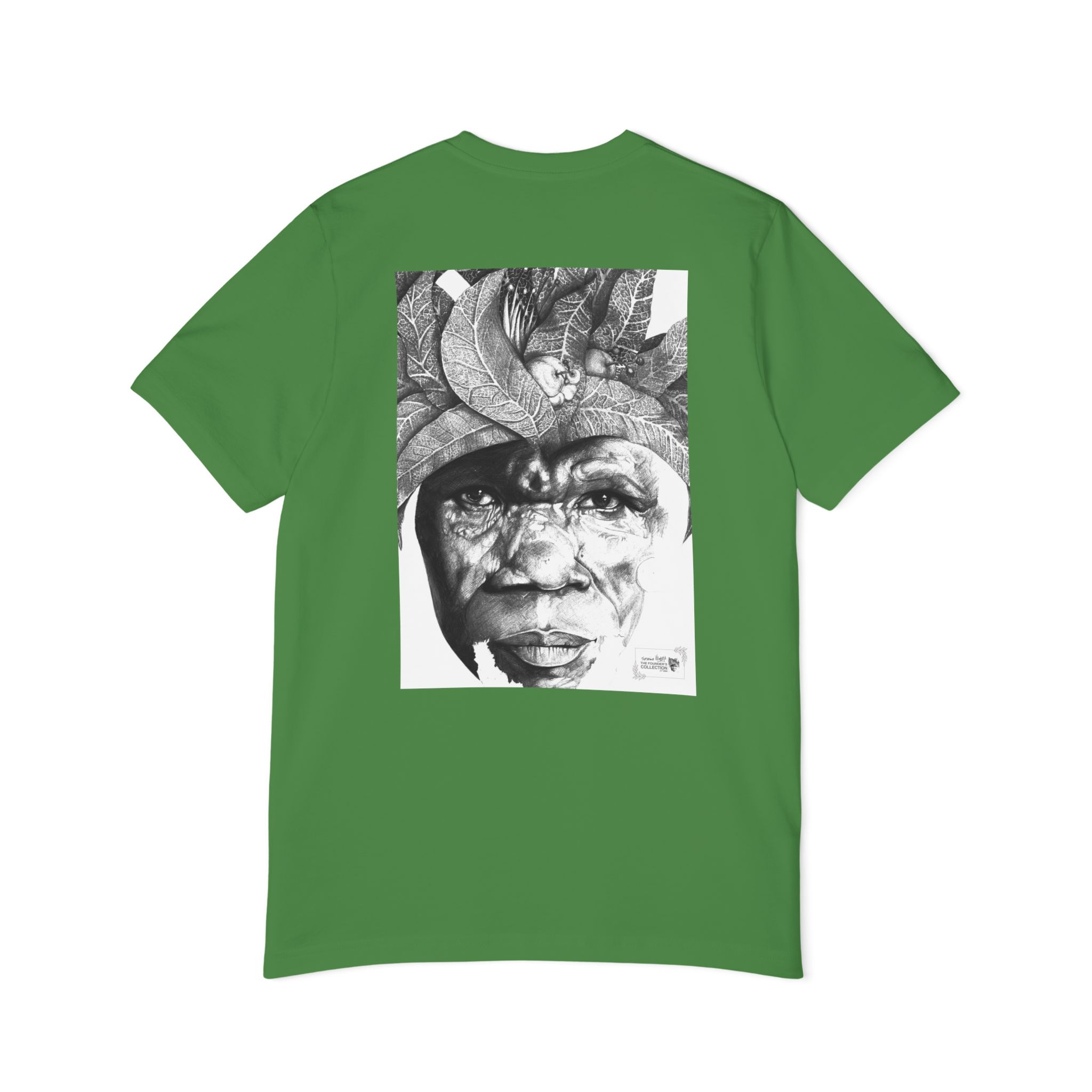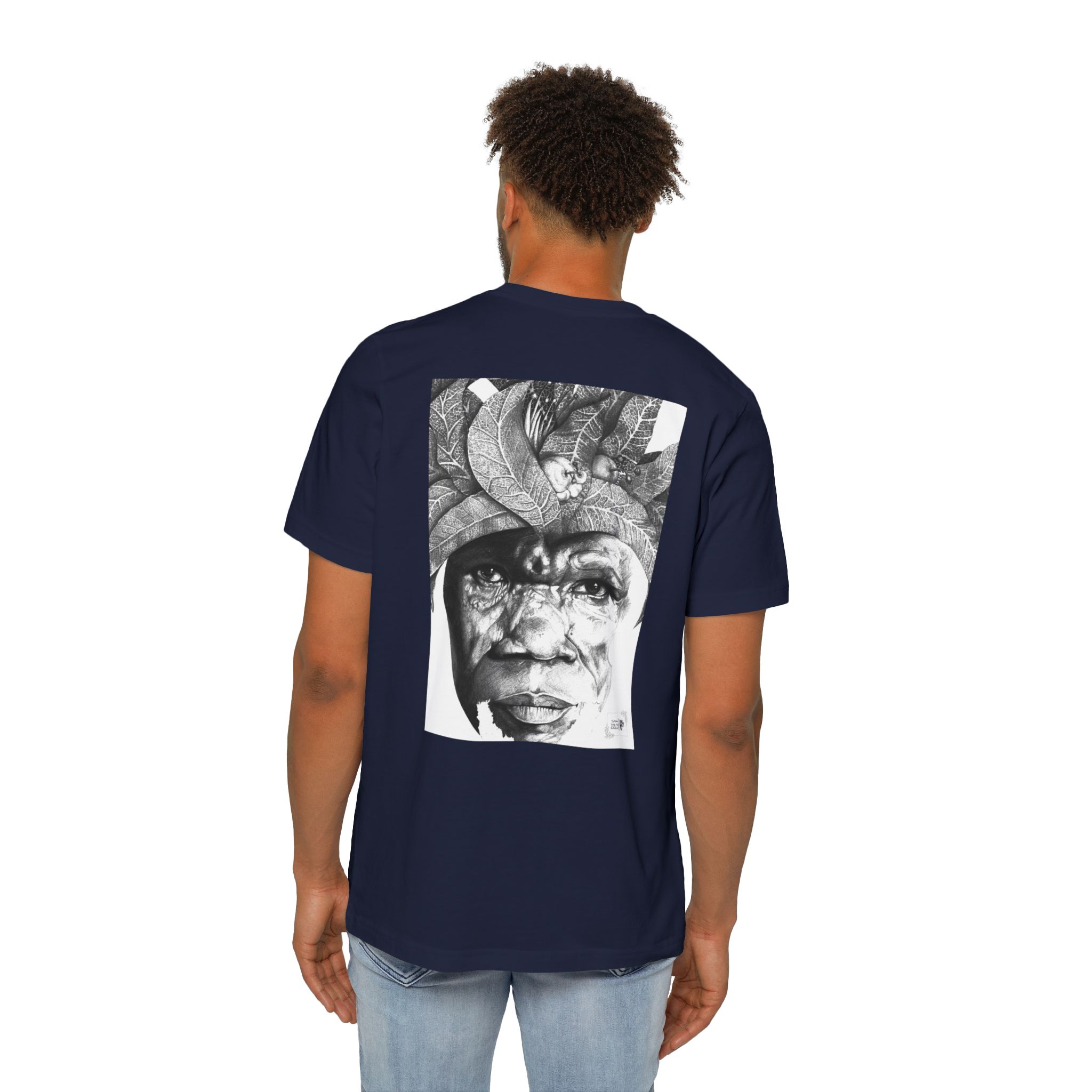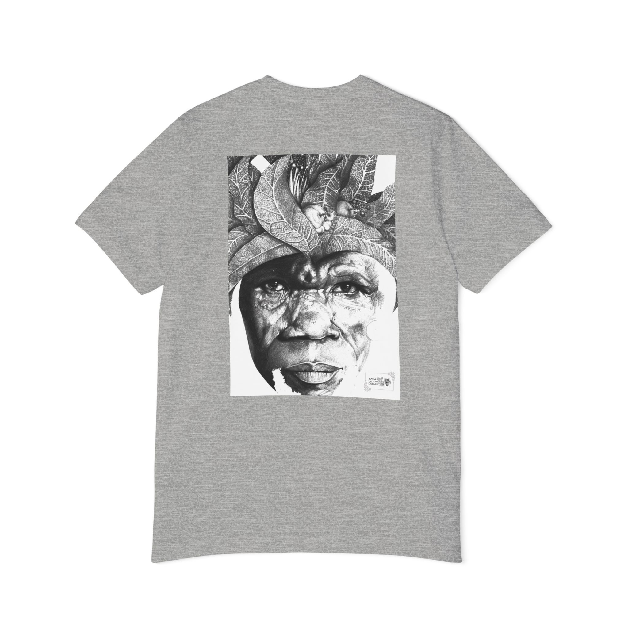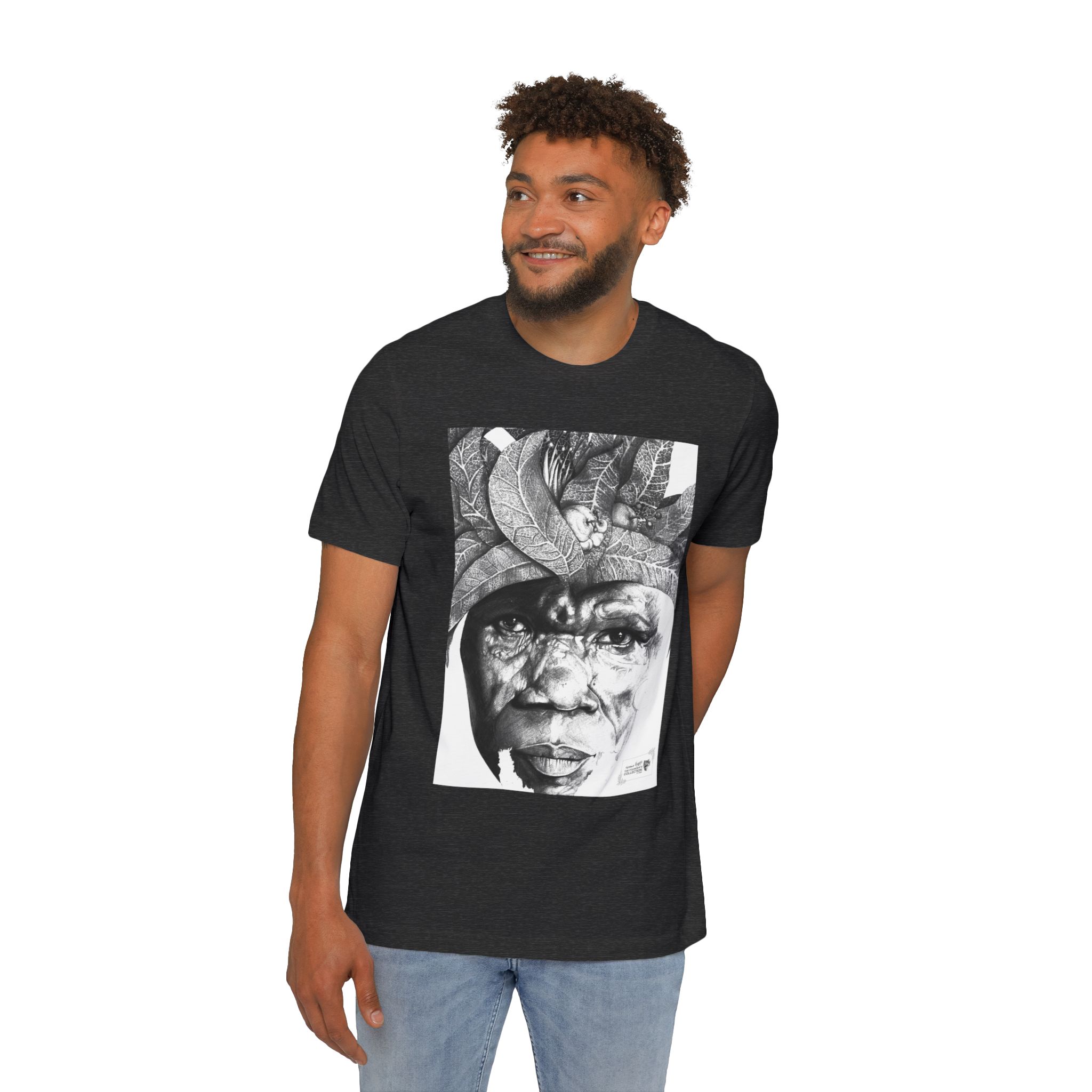 This lightweight jersey T-shirt features The Sunman – Guardian of the Orchard Mind rendered as a bold, hand-drawn monochrome portrait that merges portraiture with botanical symbolism. The dignified face, framed by woven leaf forms and fine-line textures, reflects cultivated wisdom — a mind tended like an orchard and shared for the good of the collective. The composition reads as quiet but resolute wearable art, grounding contemporary style in ancestry, care, and continuity.