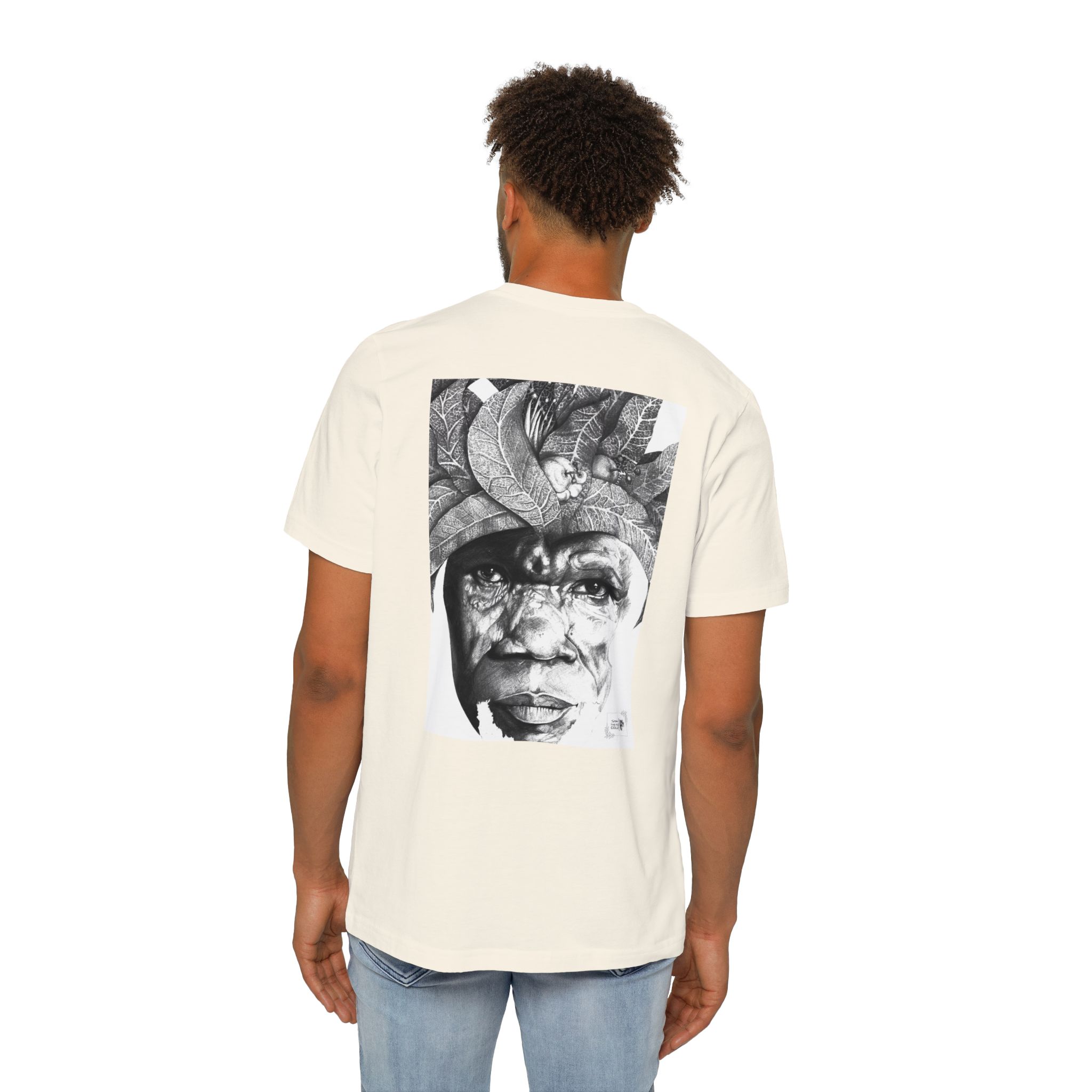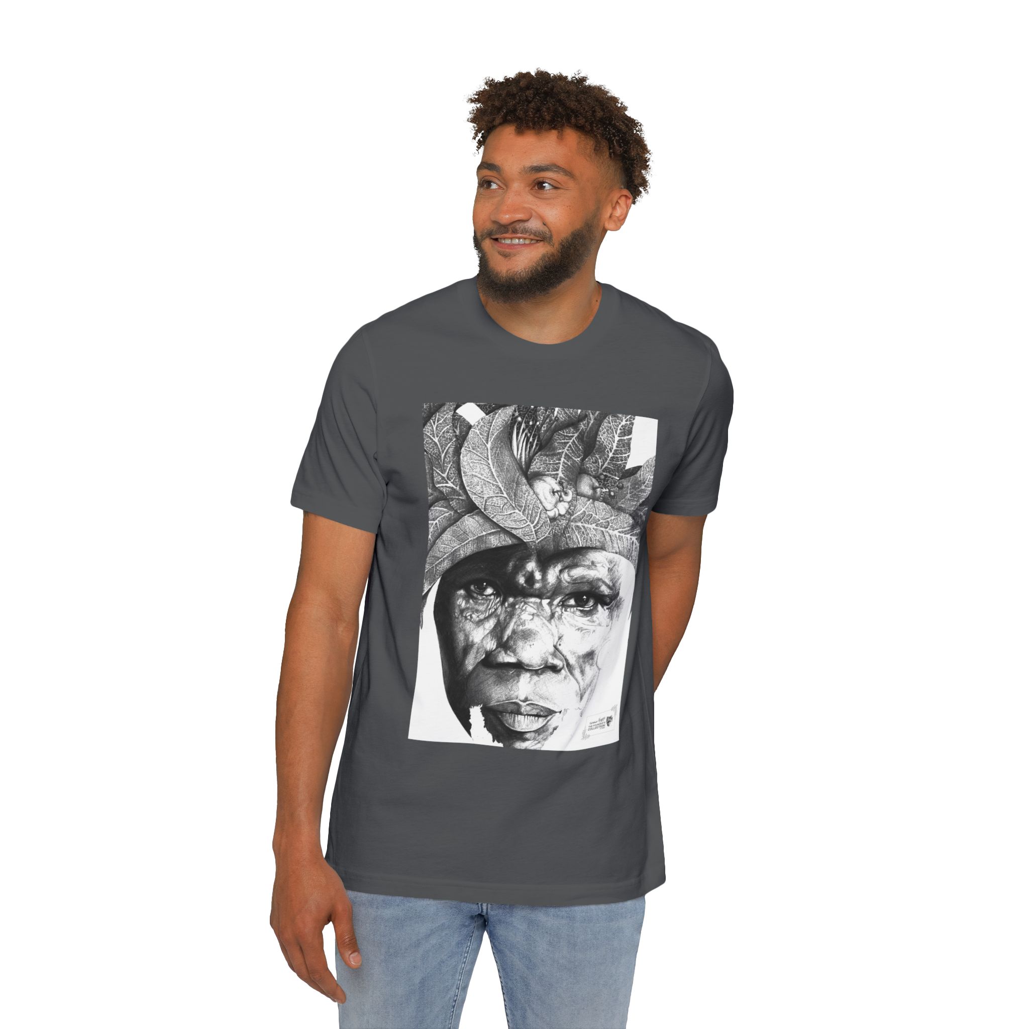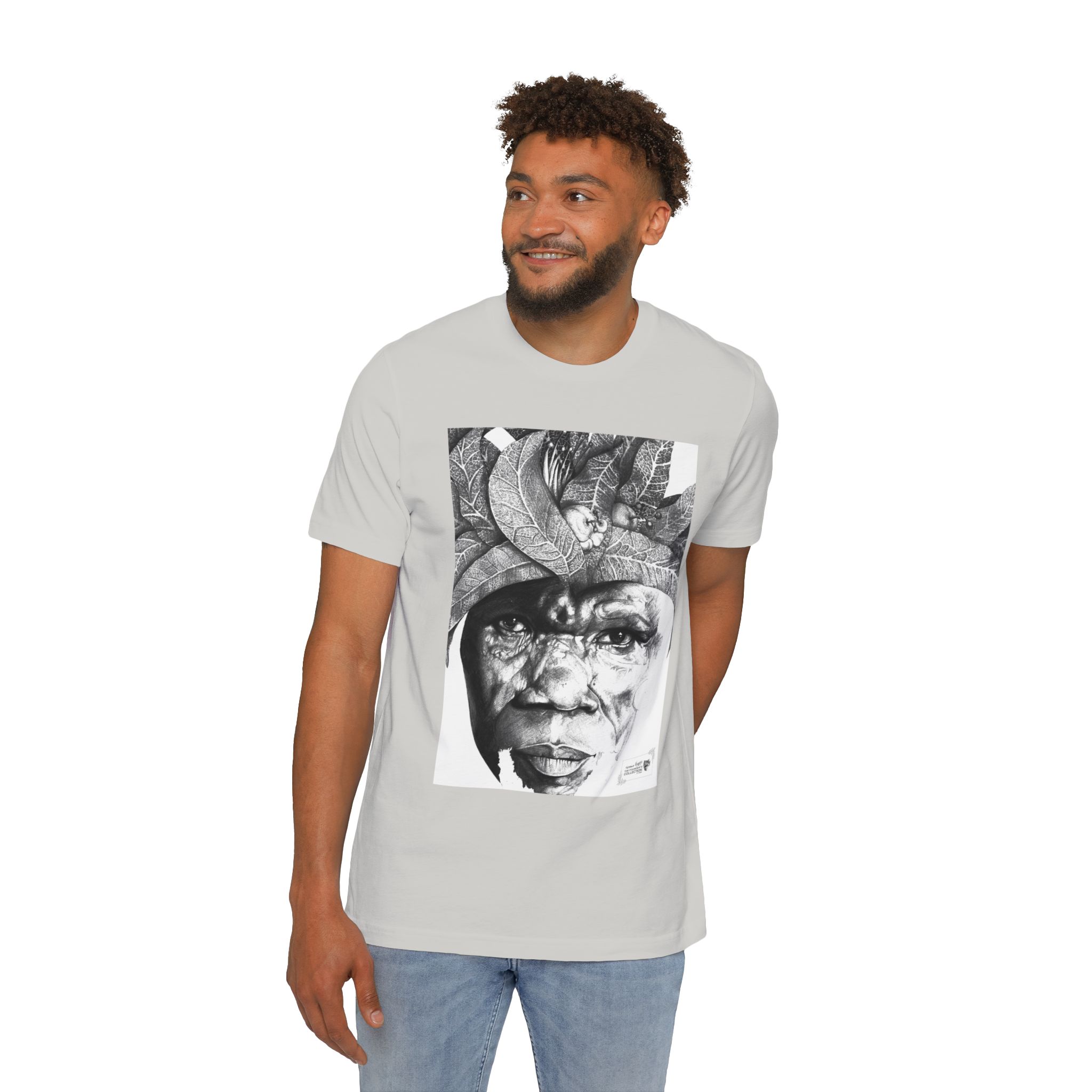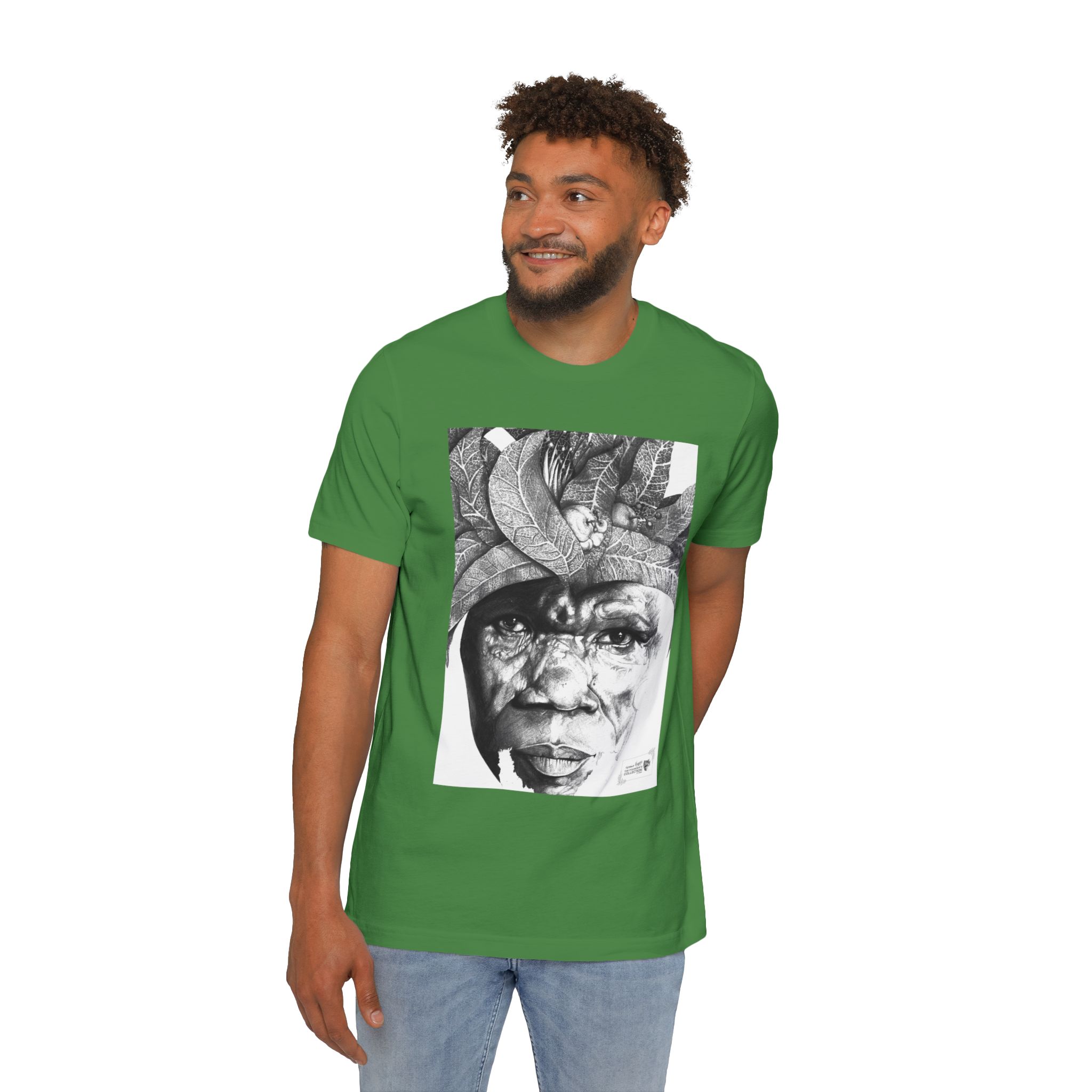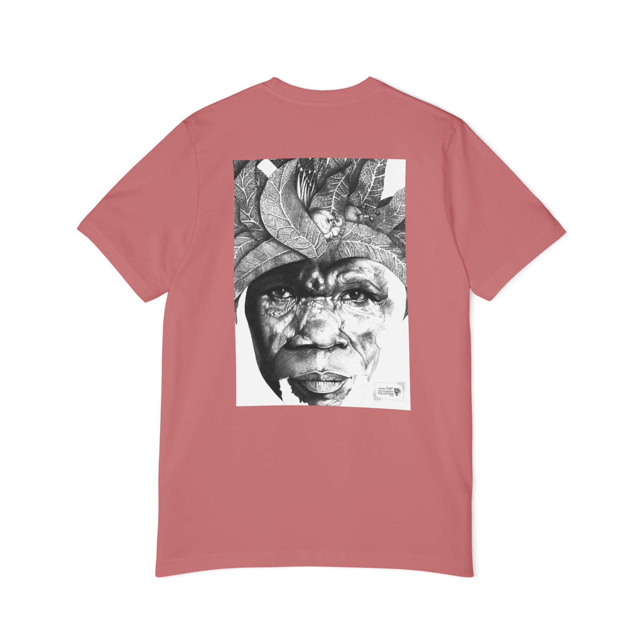 This lightweight jersey T-shirt features The Sunman – Guardian of the Orchard Mind rendered as a bold, hand-drawn monochrome portrait that merges portraiture with botanical symbolism. The dignified face, framed by woven leaf forms and fine-line textures, reflects cultivated wisdom — a mind tended like an orchard and shared for the good of the collective. The composition reads as quiet but resolute wearable art, grounding contemporary style in ancestry, care, and continuity.