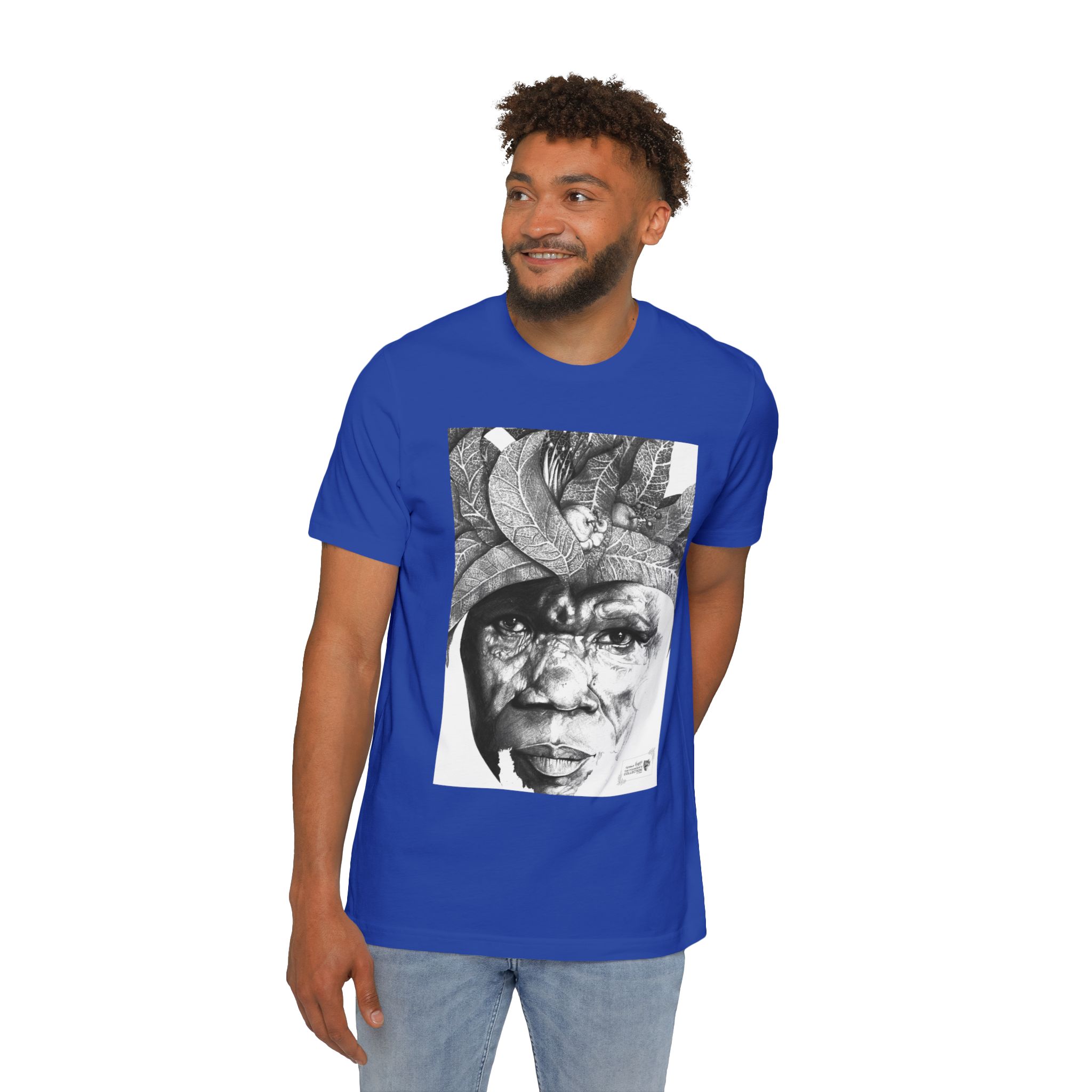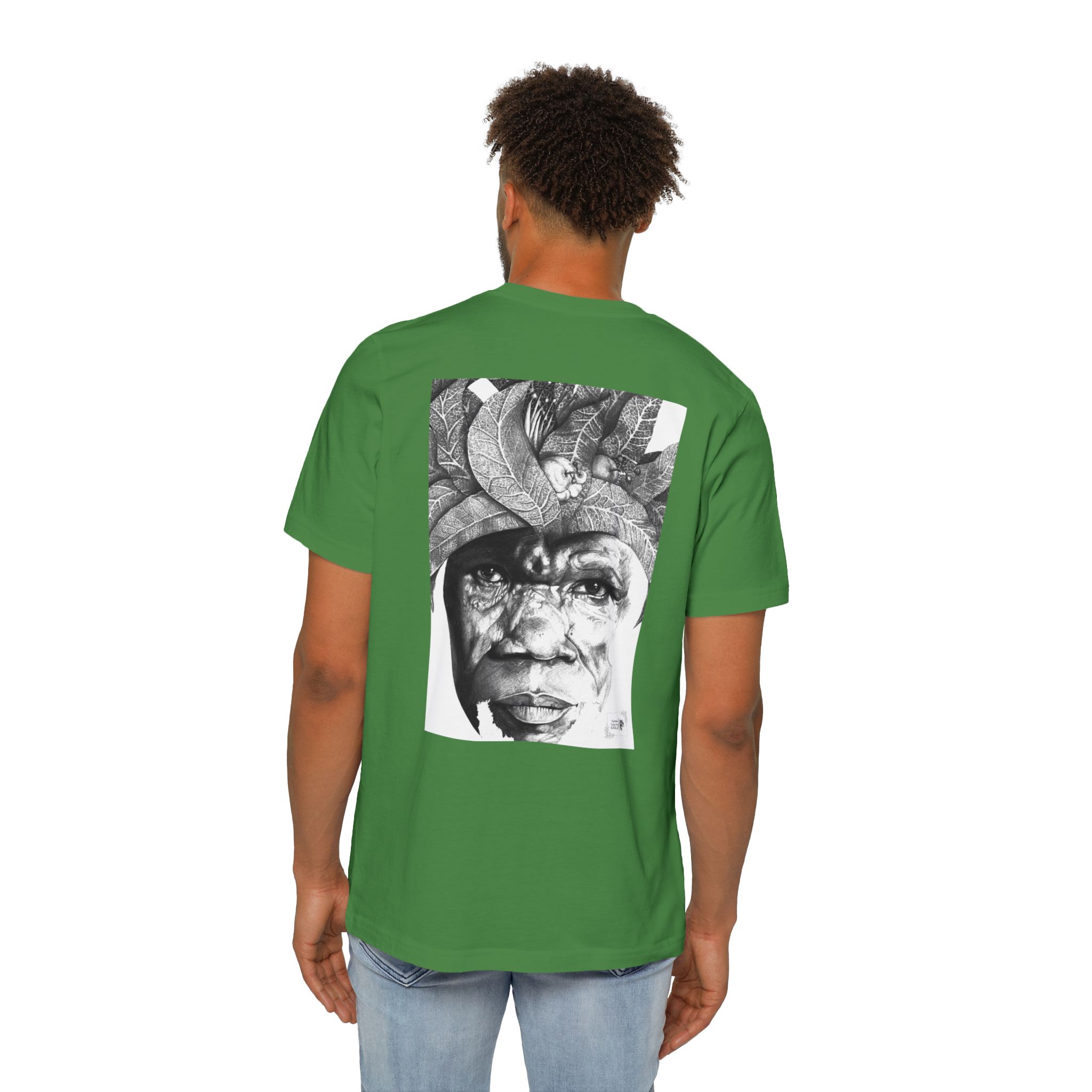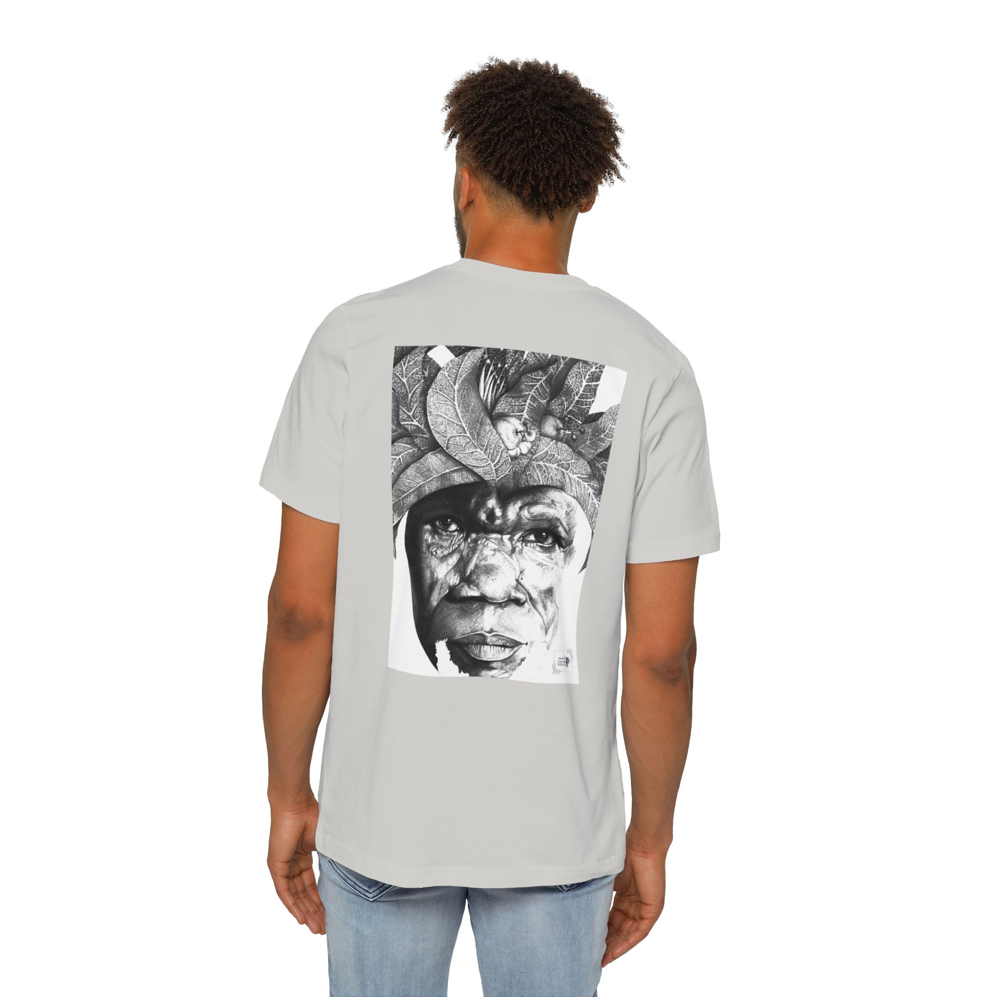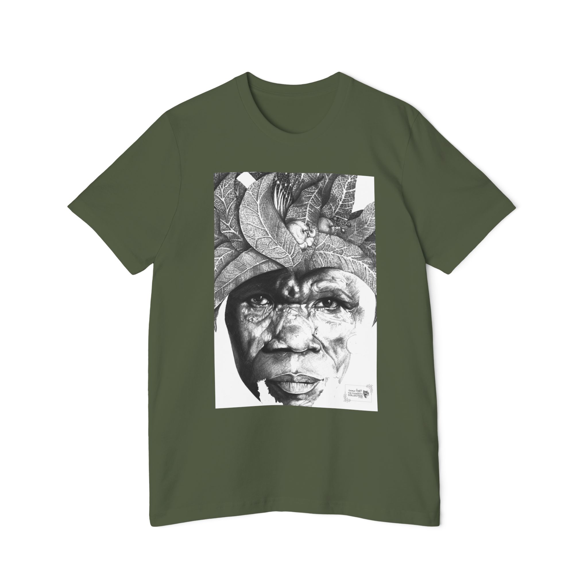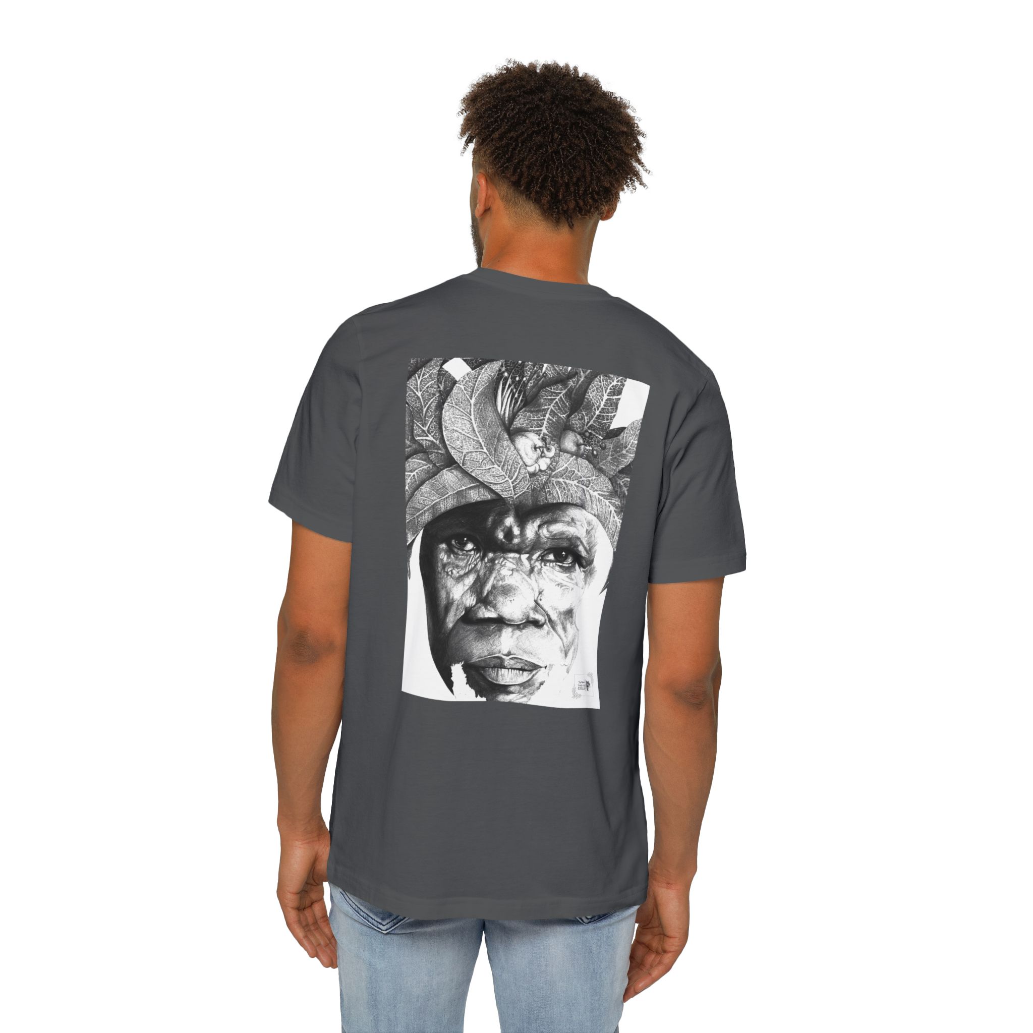 This lightweight jersey T-shirt features The Sunman – Guardian of the Orchard Mind rendered as a bold, hand-drawn monochrome portrait that merges portraiture with botanical symbolism. The dignified face, framed by woven leaf forms and fine-line textures, reflects cultivated wisdom — a mind tended like an orchard and shared for the good of the collective. The composition reads as quiet but resolute wearable art, grounding contemporary style in ancestry, care, and continuity.