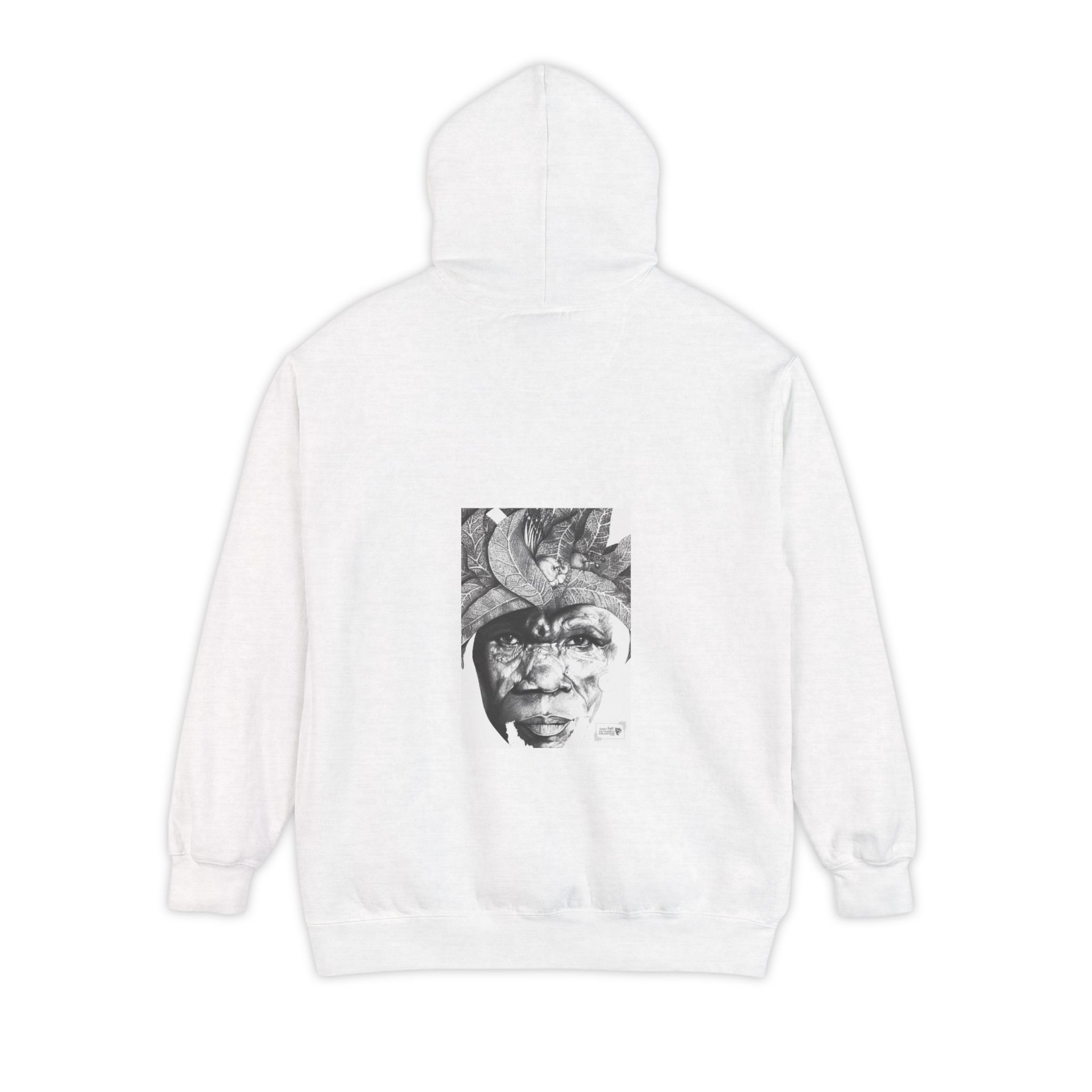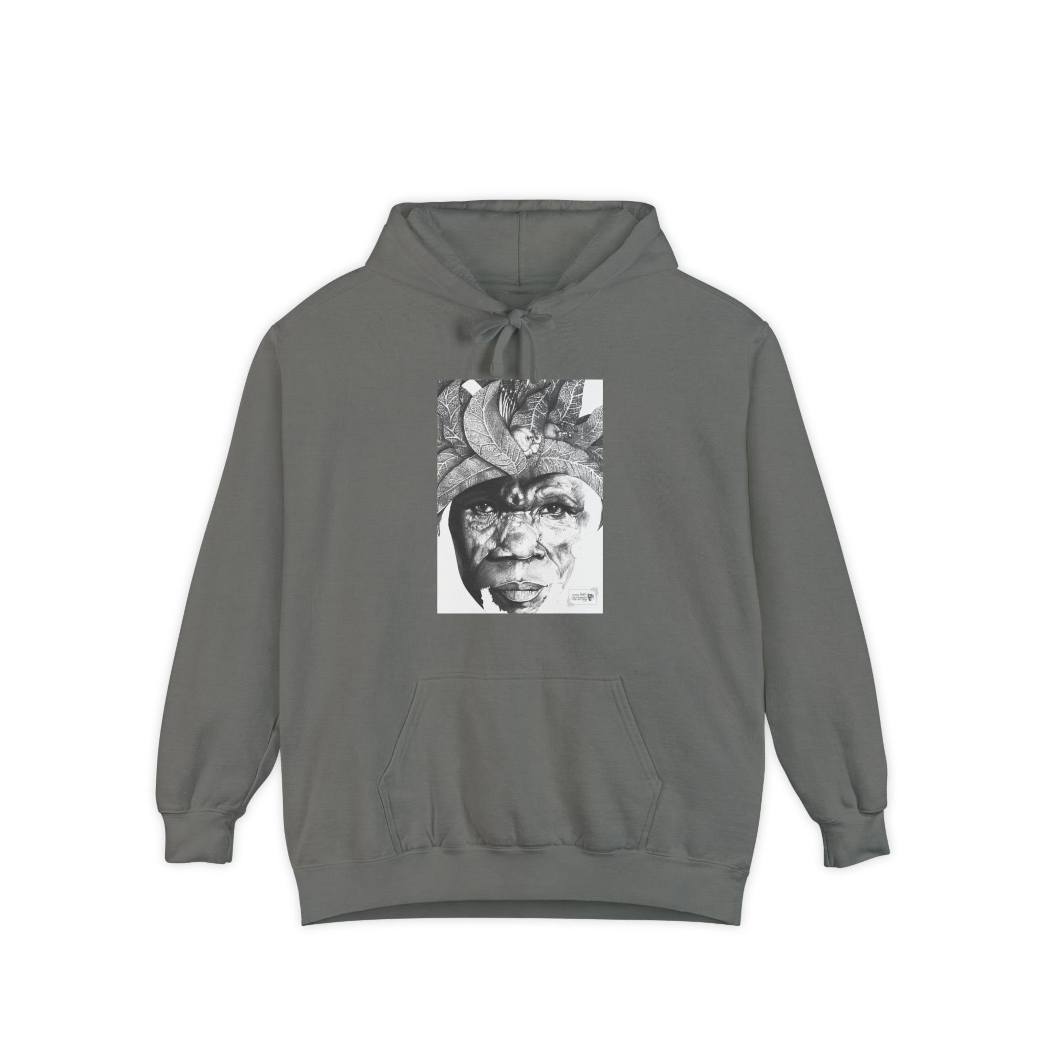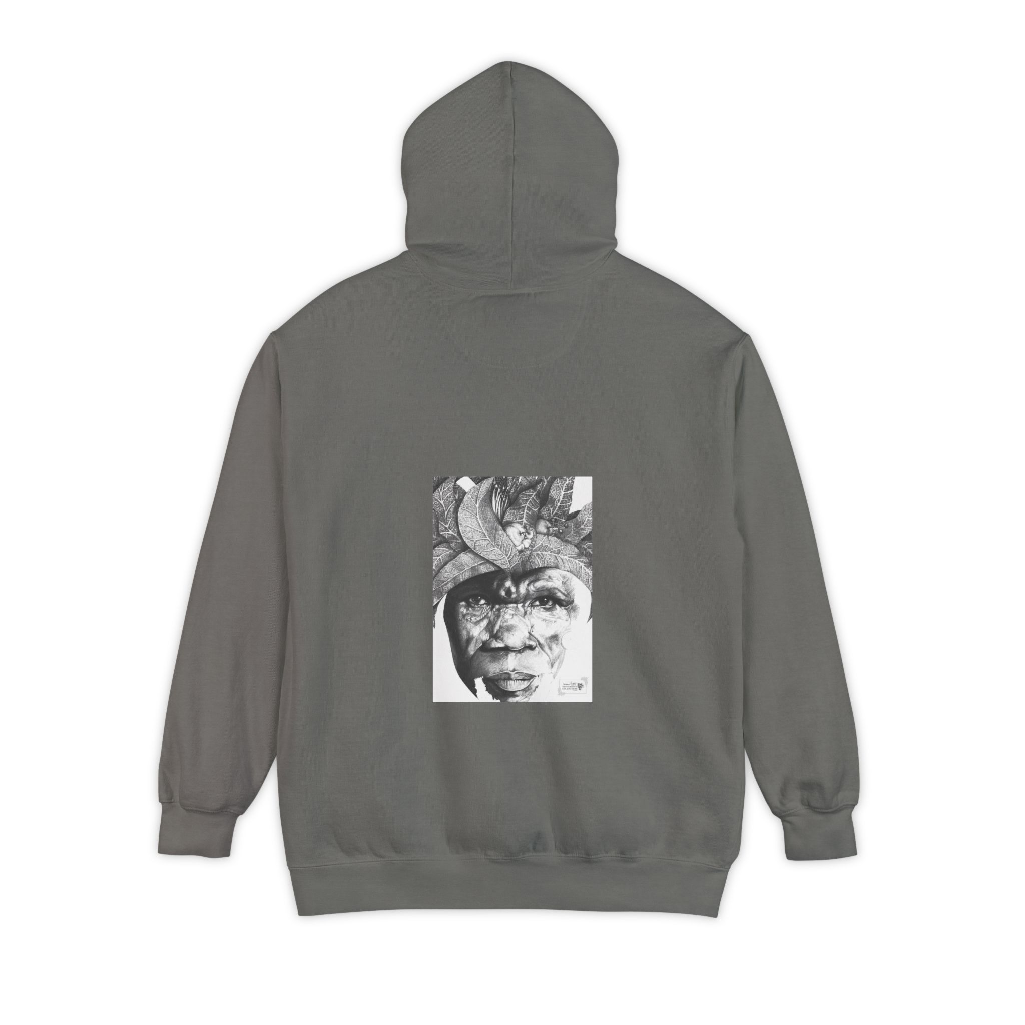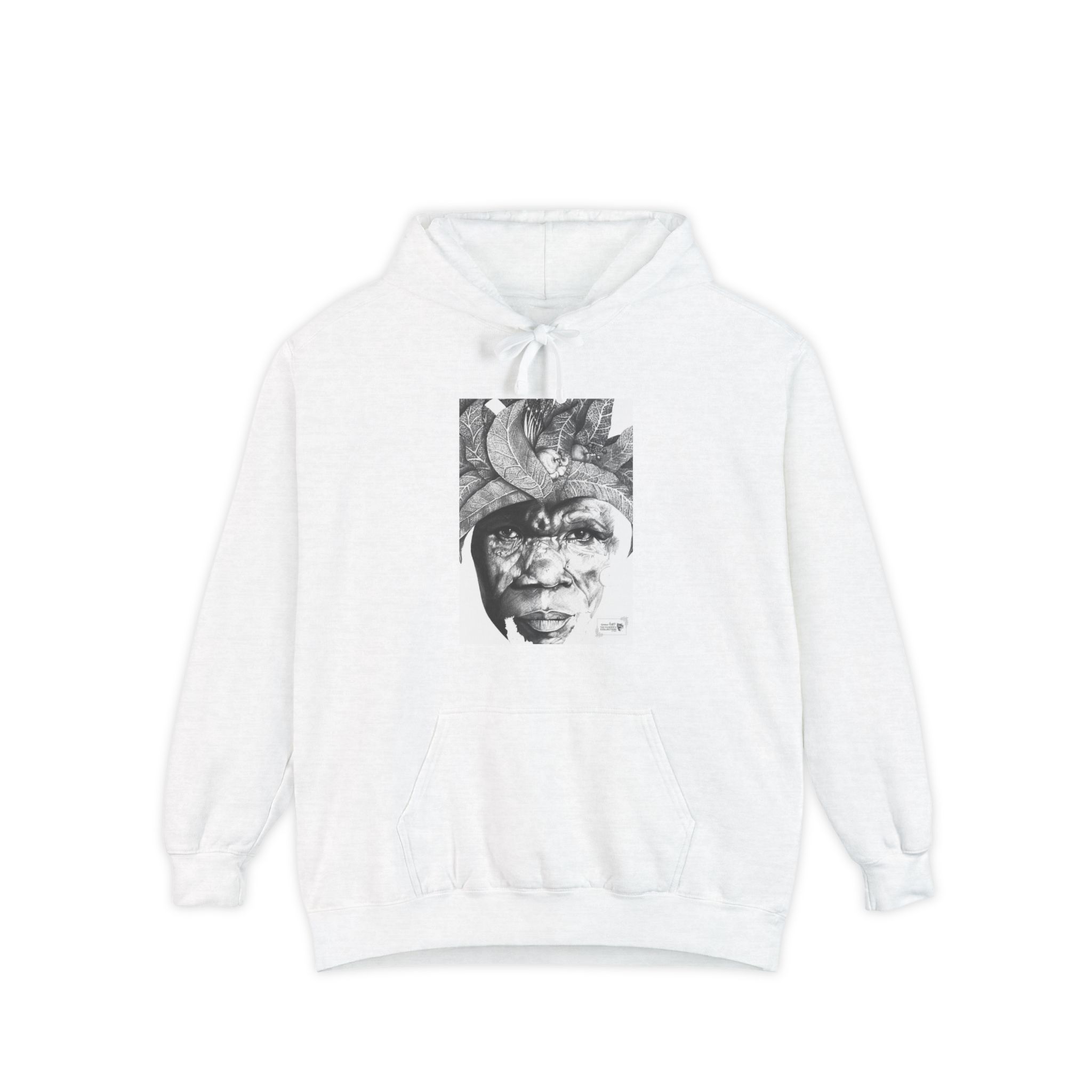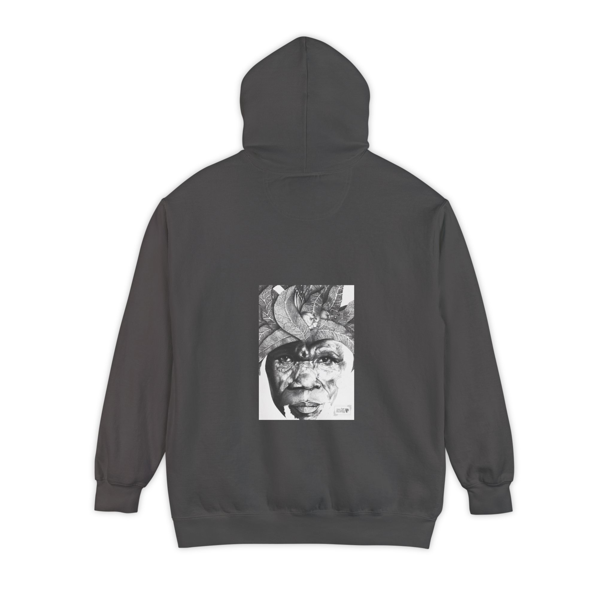 This garment-dyed hoodie carries quiet strength. The soft, heavy ringspun cotton feels plush against the skin while the relaxed silhouette drapes easily over layers. A monochrome, collage-style face print sits centered on front and back, giving the piece an artful, slightly mysterious presence — like wearing a fragment of someone’s story. The lined hood, flatcord drawstrings, and reinforced neck tape add comfort and durability, while ribbed cuffs and hem keep the shape looking intentional even after repeated wear. When you pull it on, it settles into your routine: a go-to layer for late gallery nights, slow city walks, or studio mornings when you want something both rugged and thoughtful.