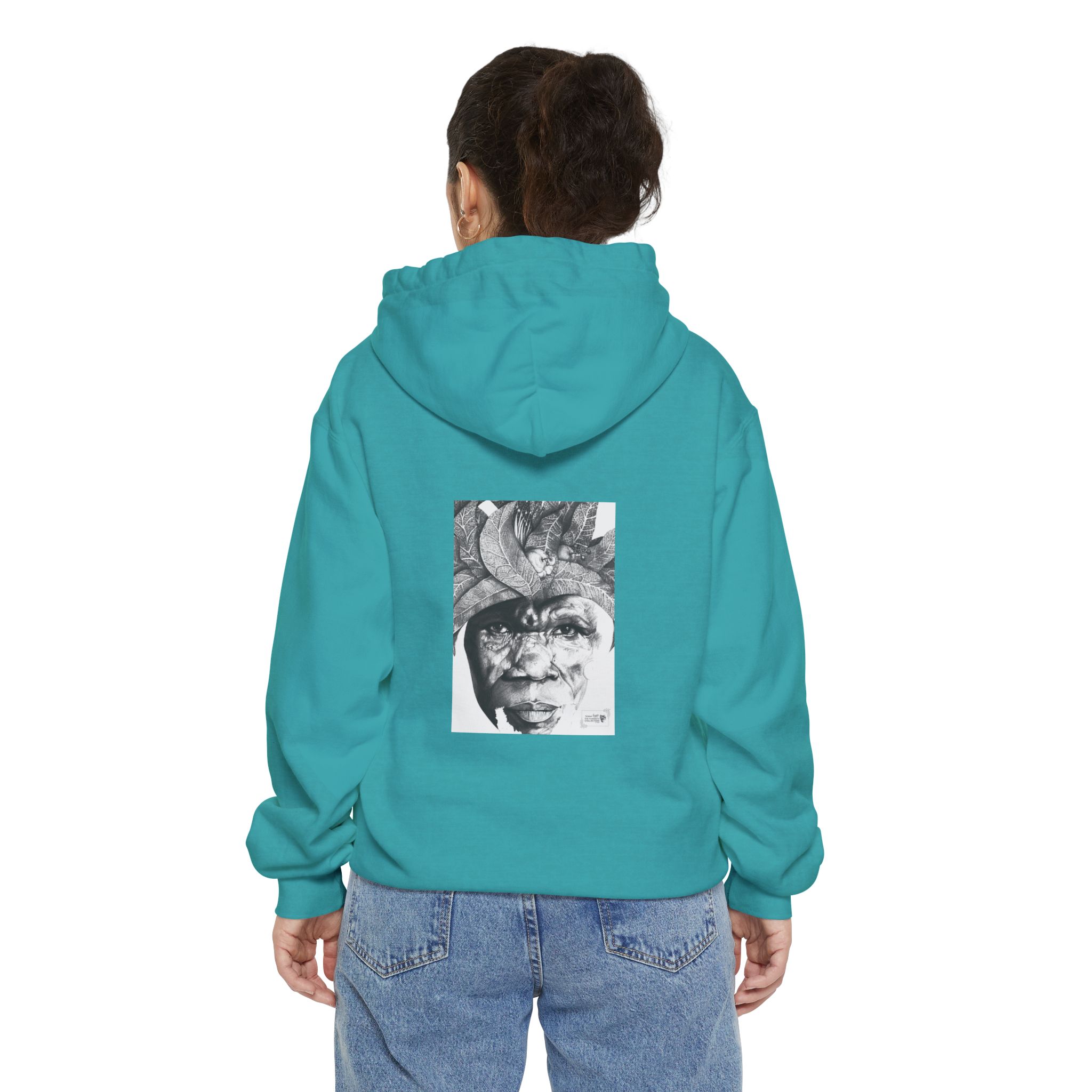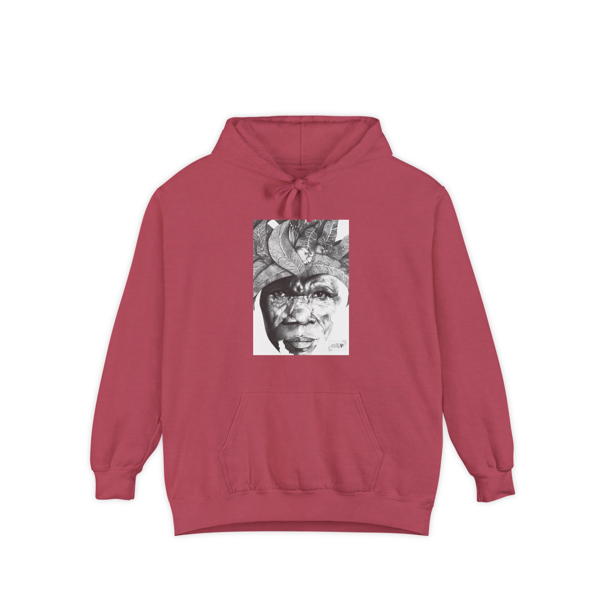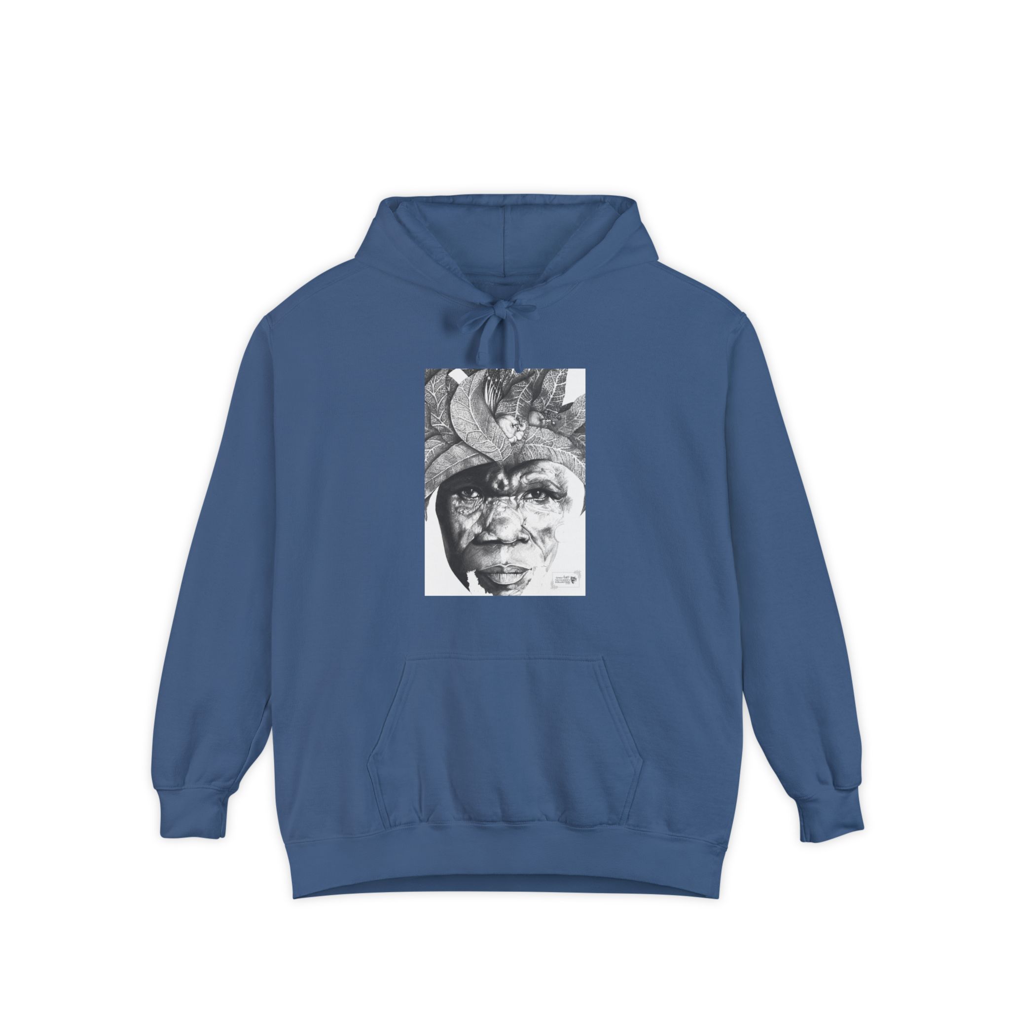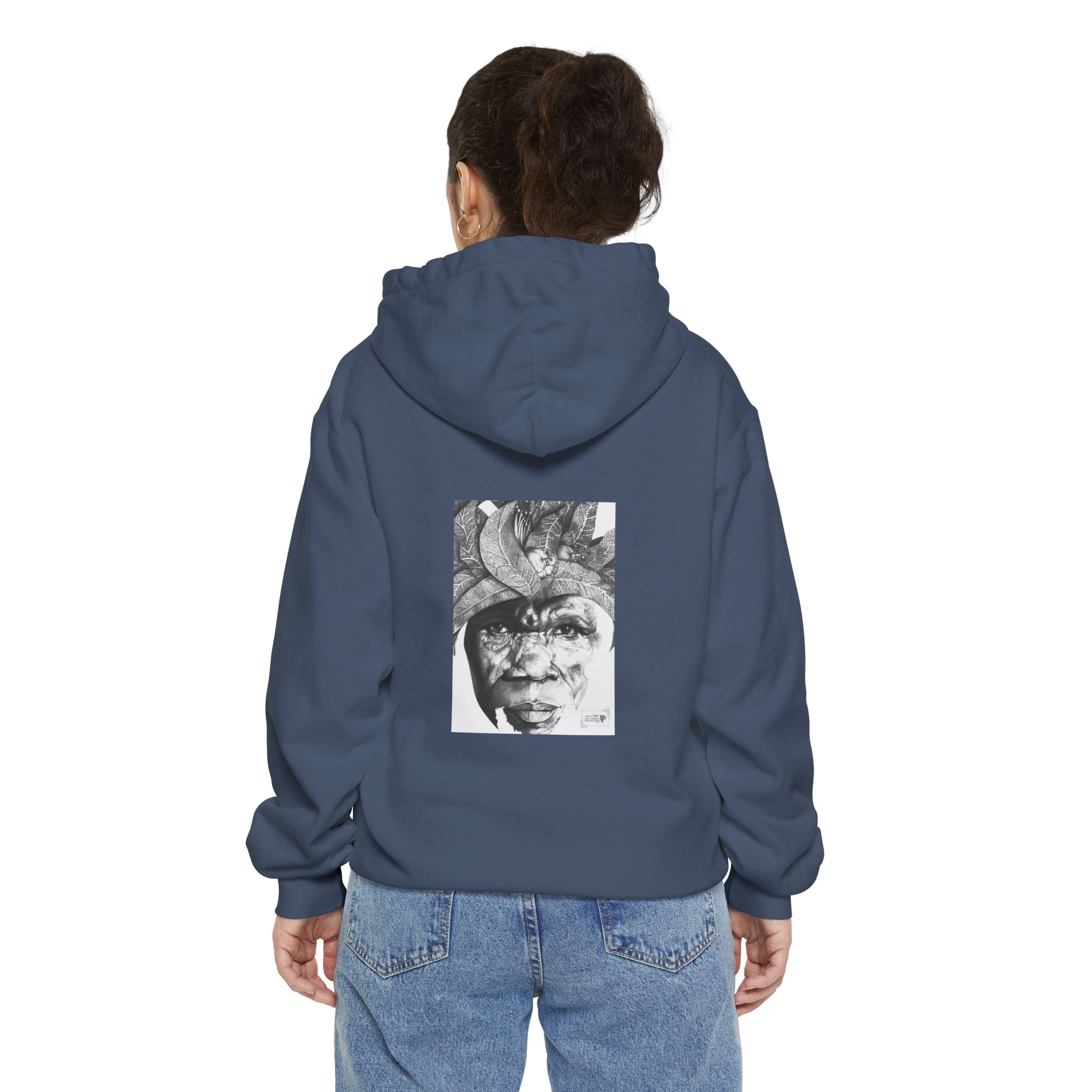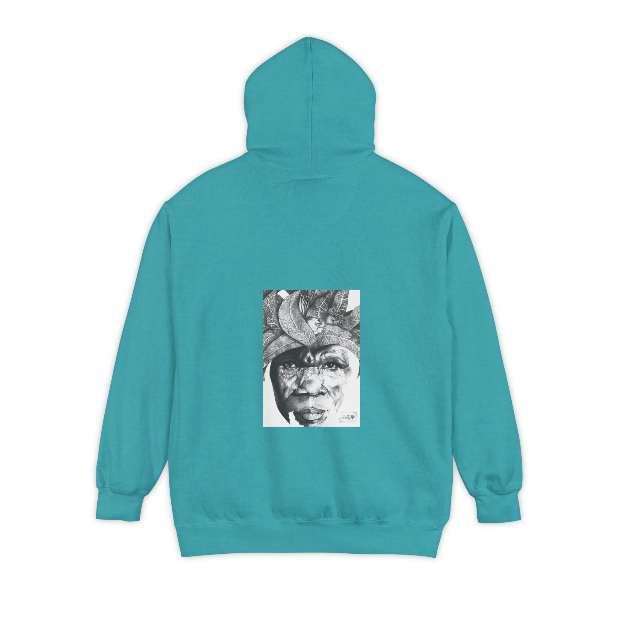 This garment-dyed hoodie carries quiet strength. The soft, heavy ringspun cotton feels plush against the skin while the relaxed silhouette drapes easily over layers. A monochrome, collage-style face print sits centered on front and back, giving the piece an artful, slightly mysterious presence — like wearing a fragment of someone’s story. The lined hood, flatcord drawstrings, and reinforced neck tape add comfort and durability, while ribbed cuffs and hem keep the shape looking intentional even after repeated wear. When you pull it on, it settles into your routine: a go-to layer for late gallery nights, slow city walks, or studio mornings when you want something both rugged and thoughtful.