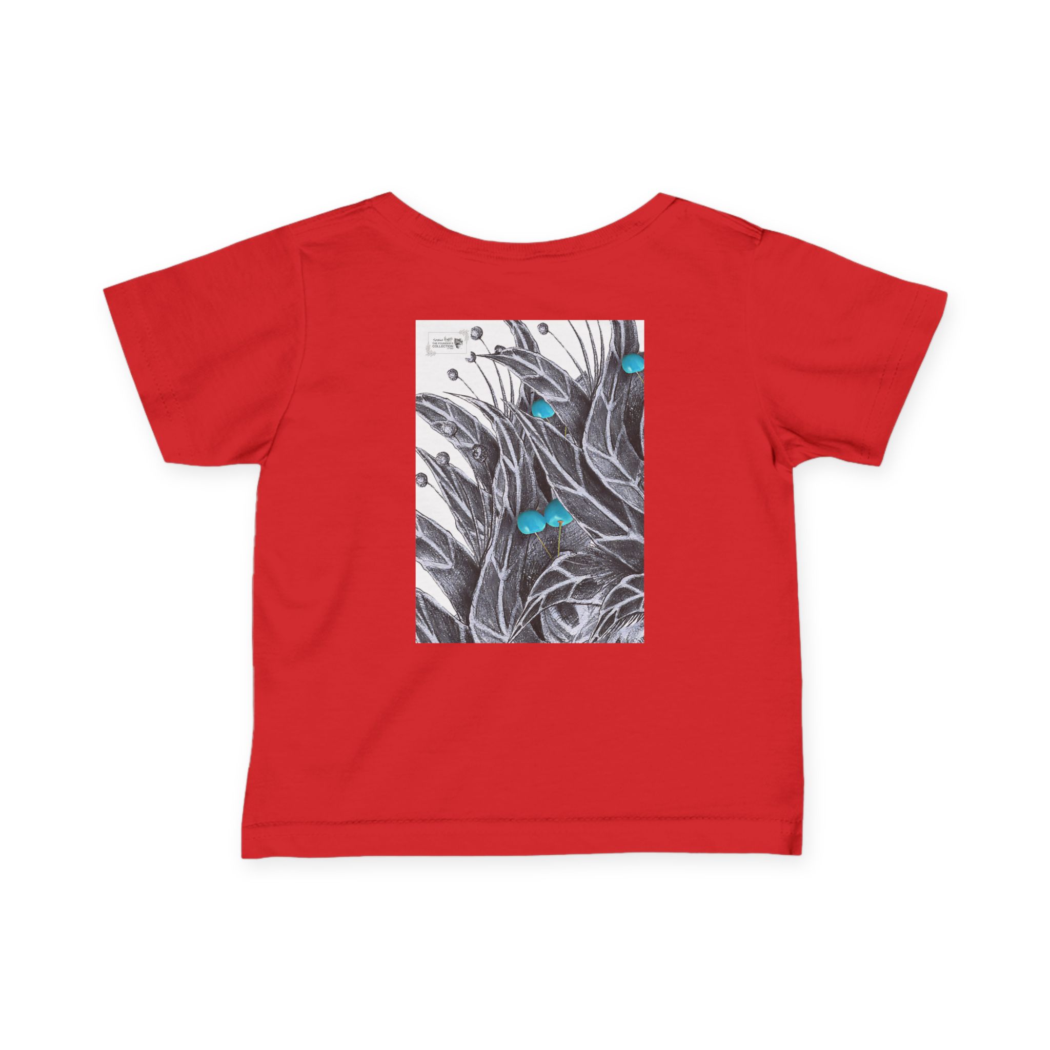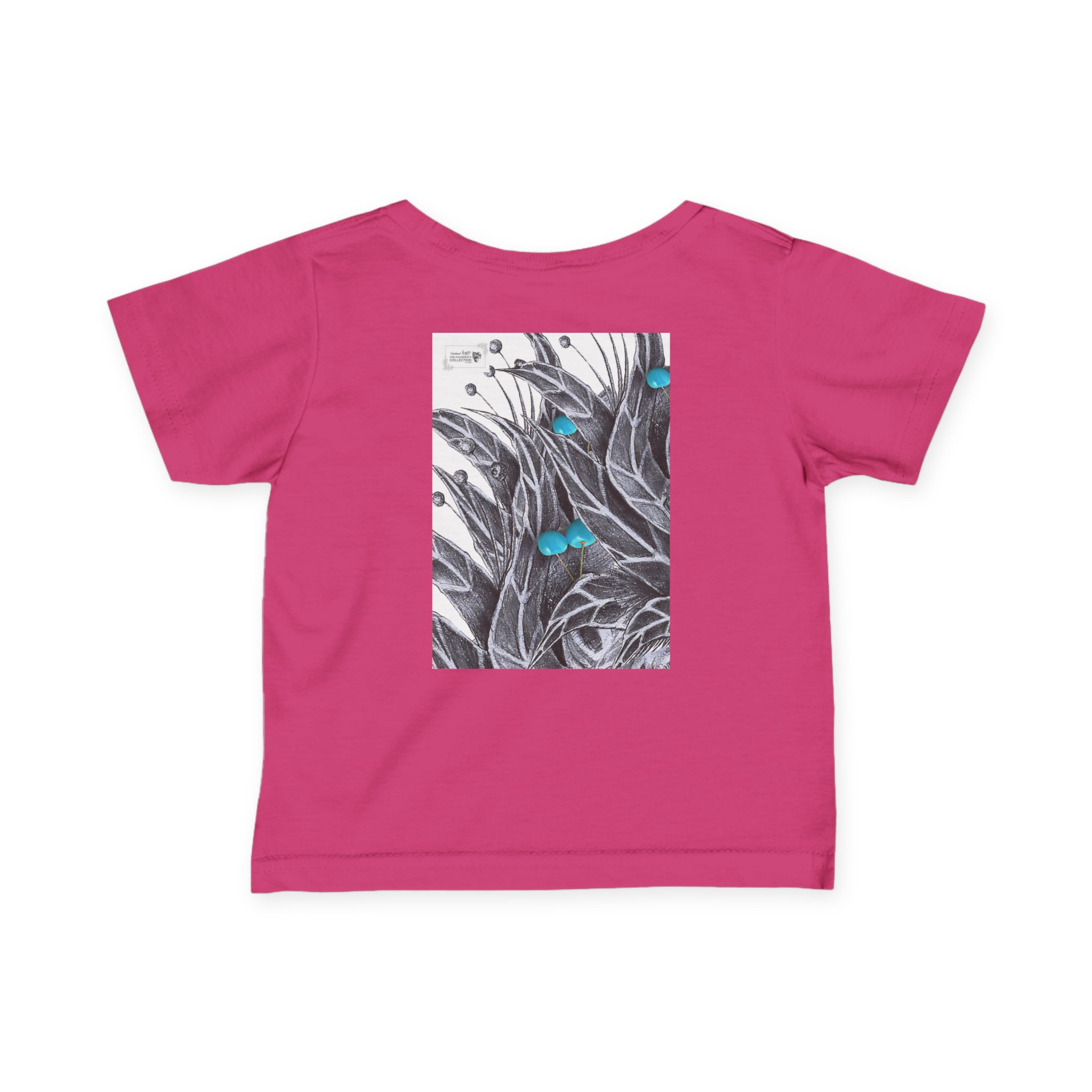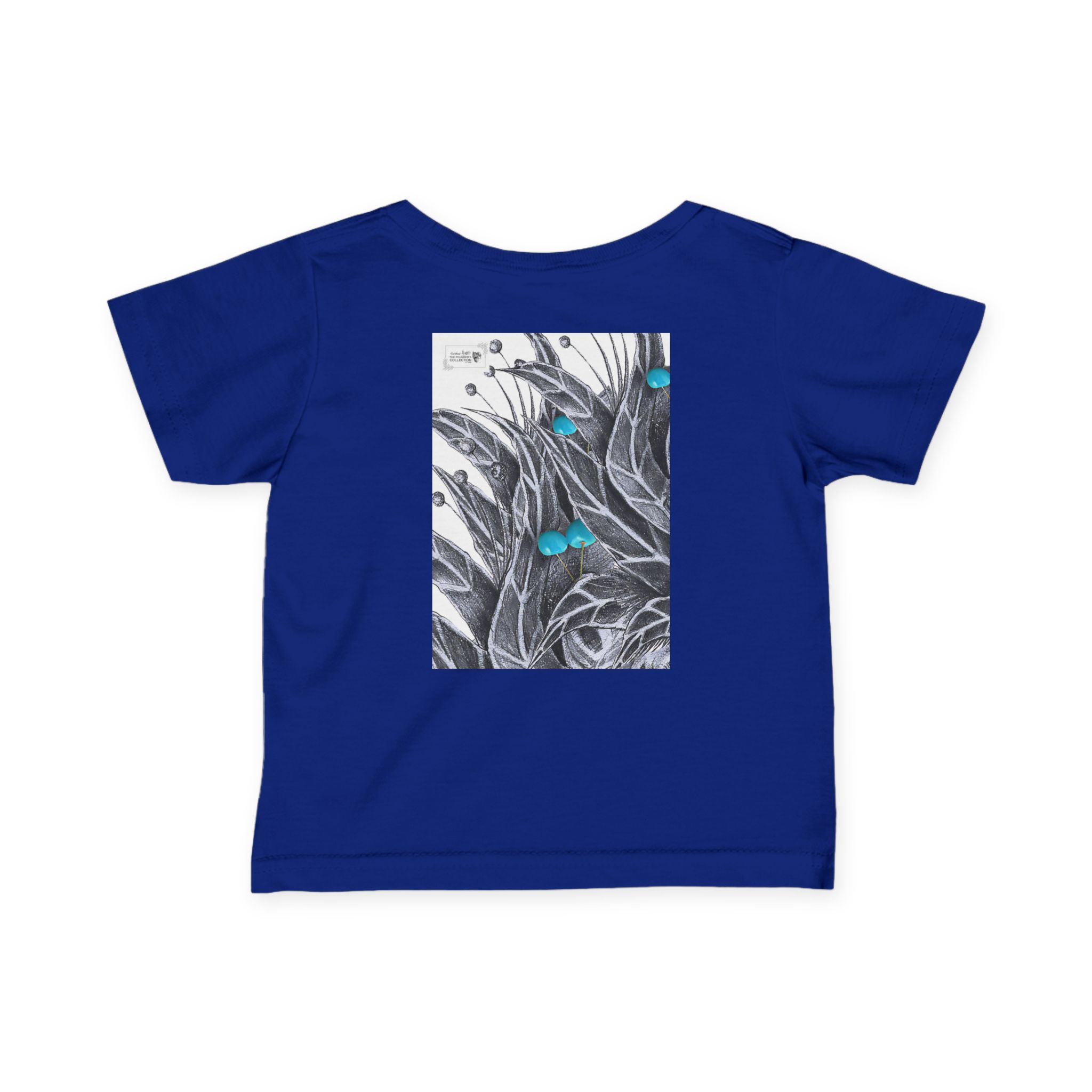 Bring gentle artistry into everyday wear with “Amathunzi Aluhlaza” by Siphiwe Ngwenya. This soft infant tee features a hand-drawn monochrome botanical illustration, accented with tiny bright blue highlights, giving a sketchbook-like quality to a classic wardrobe staple. Lightweight and breathable, it moves with little bodies while keeping the artwork as the quiet focal point.
