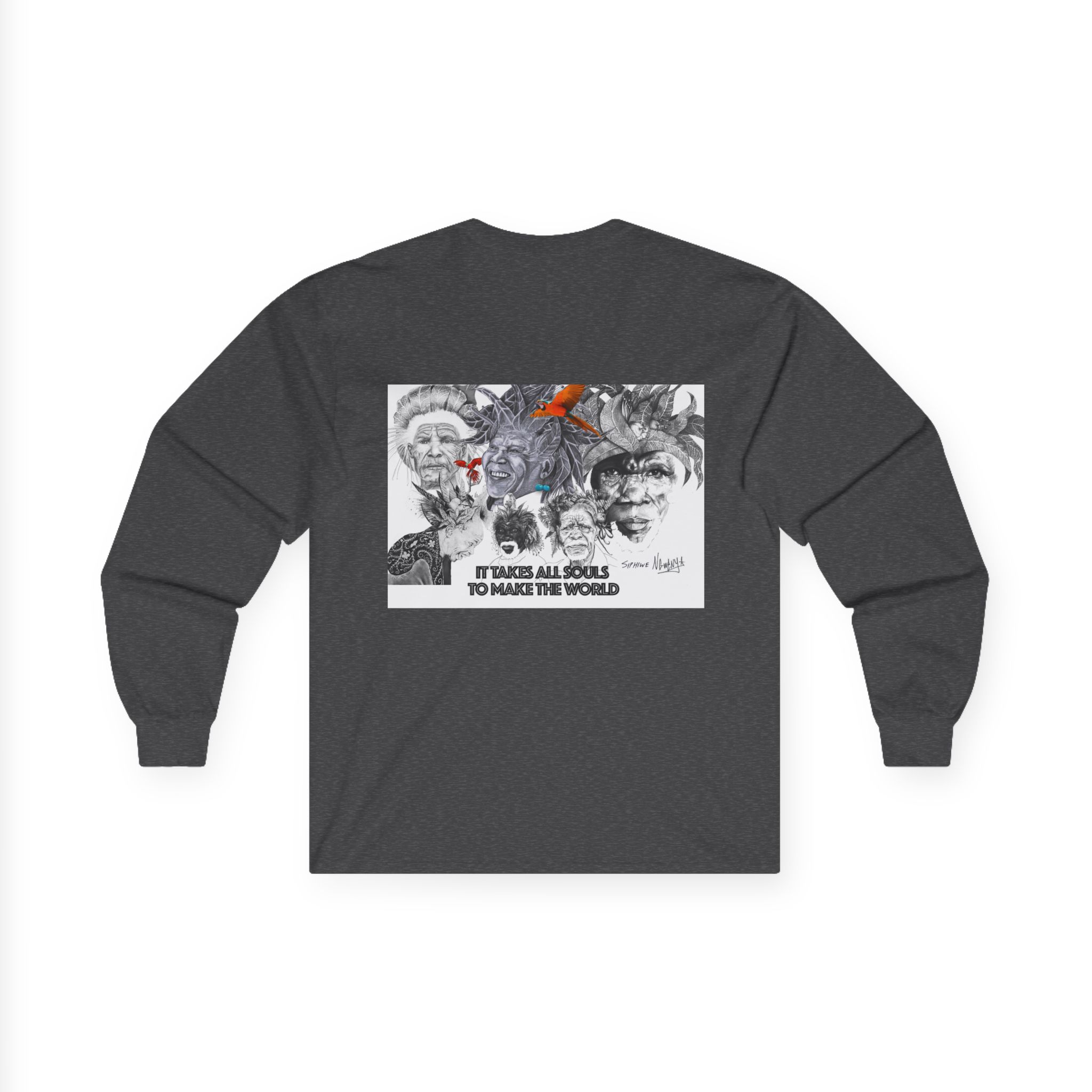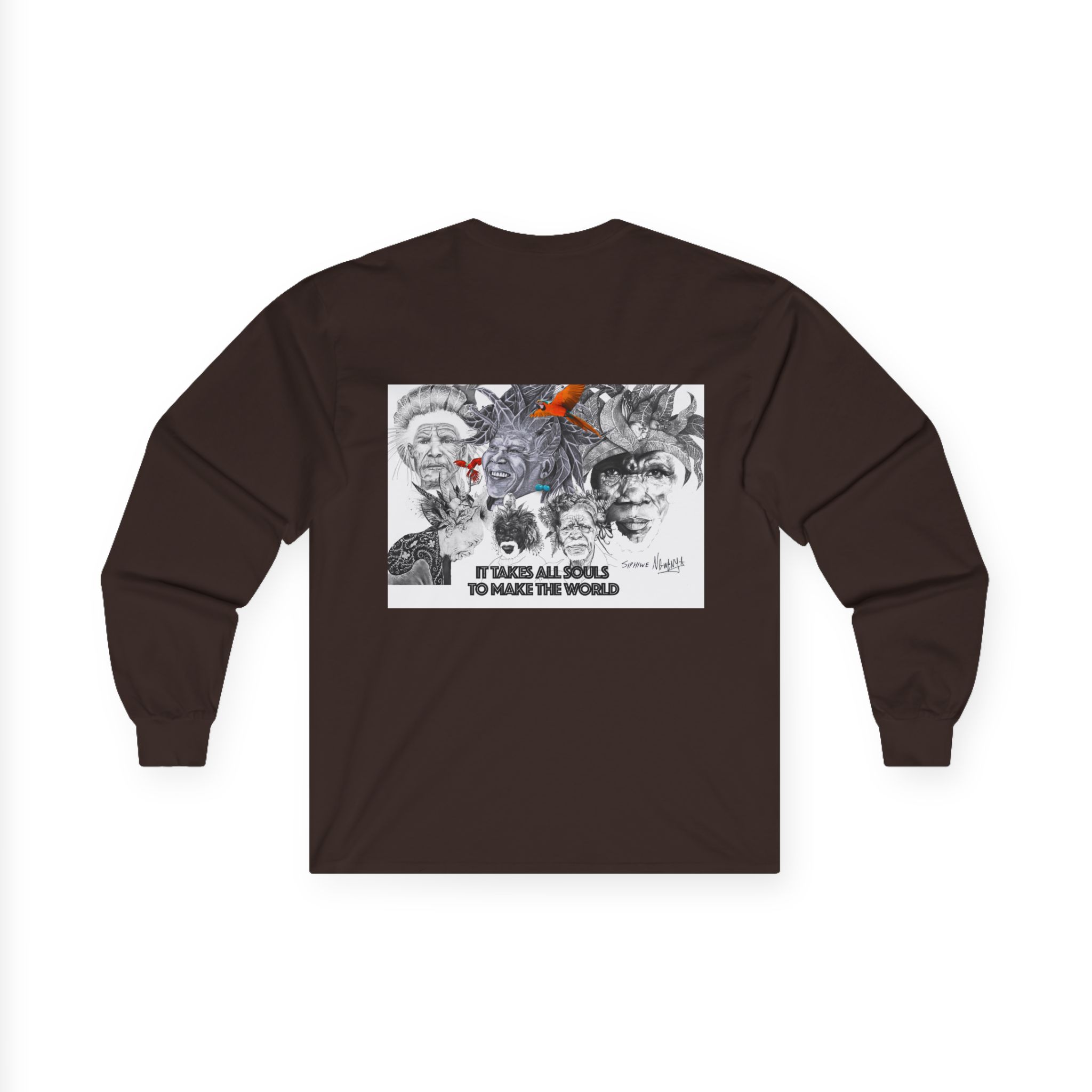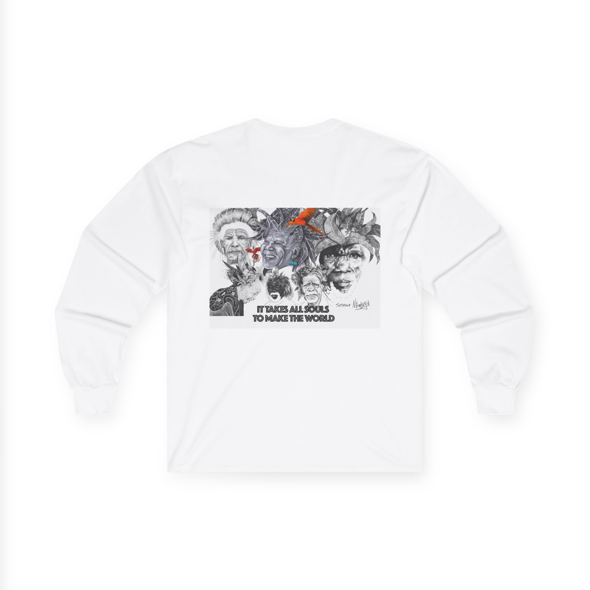Carry quiet rebellion and reflection in Siphiwe Ngwenya’s “All Souls Collage,” a long-sleeve tee where layered, mural-like portraits meet hand-inked details and a whisper of rusty orange. The handwritten line — “It takes all souls to make the world” — evokes the Townships Into Towns philosophy, celebrating community, heritage, and creative empowerment through wearable art.