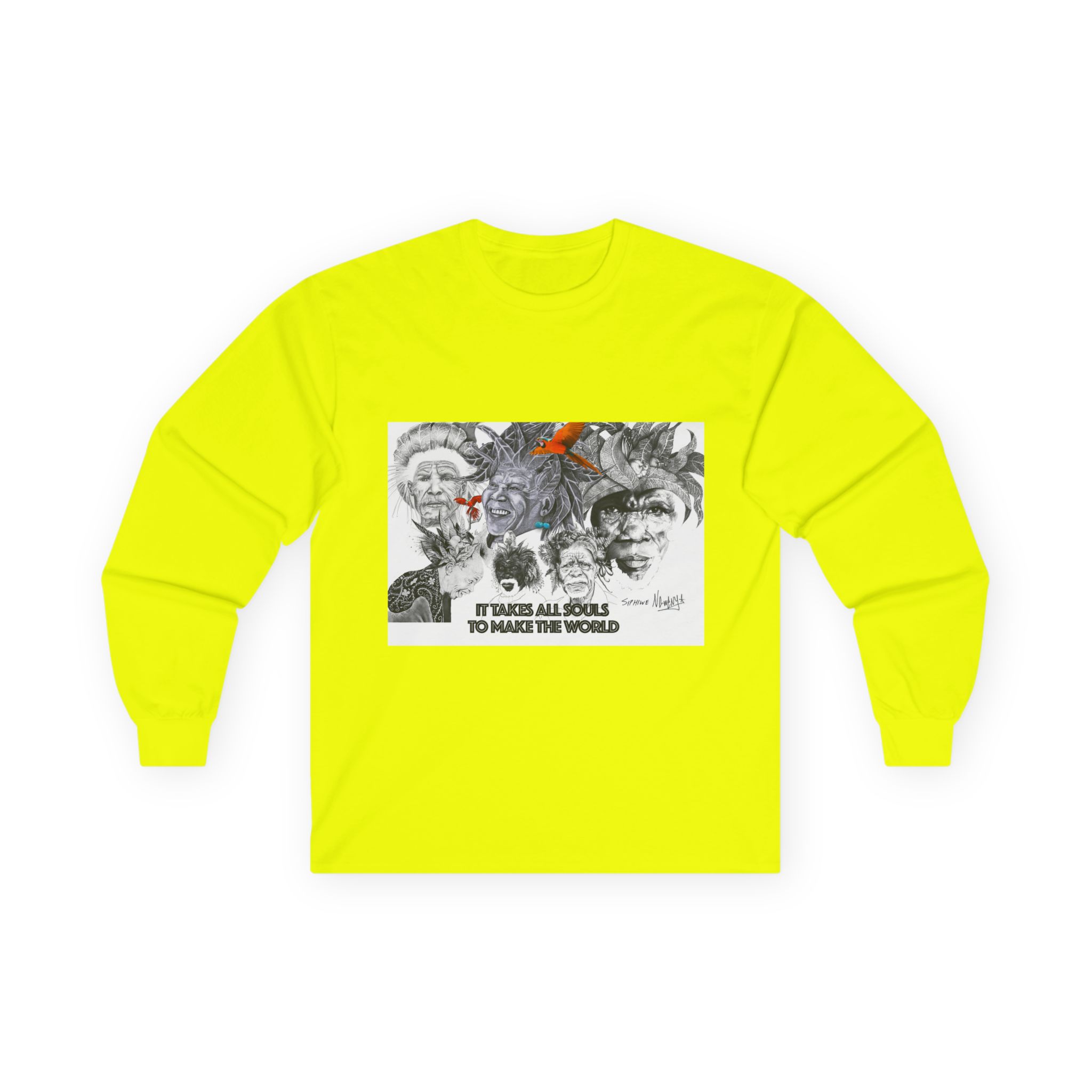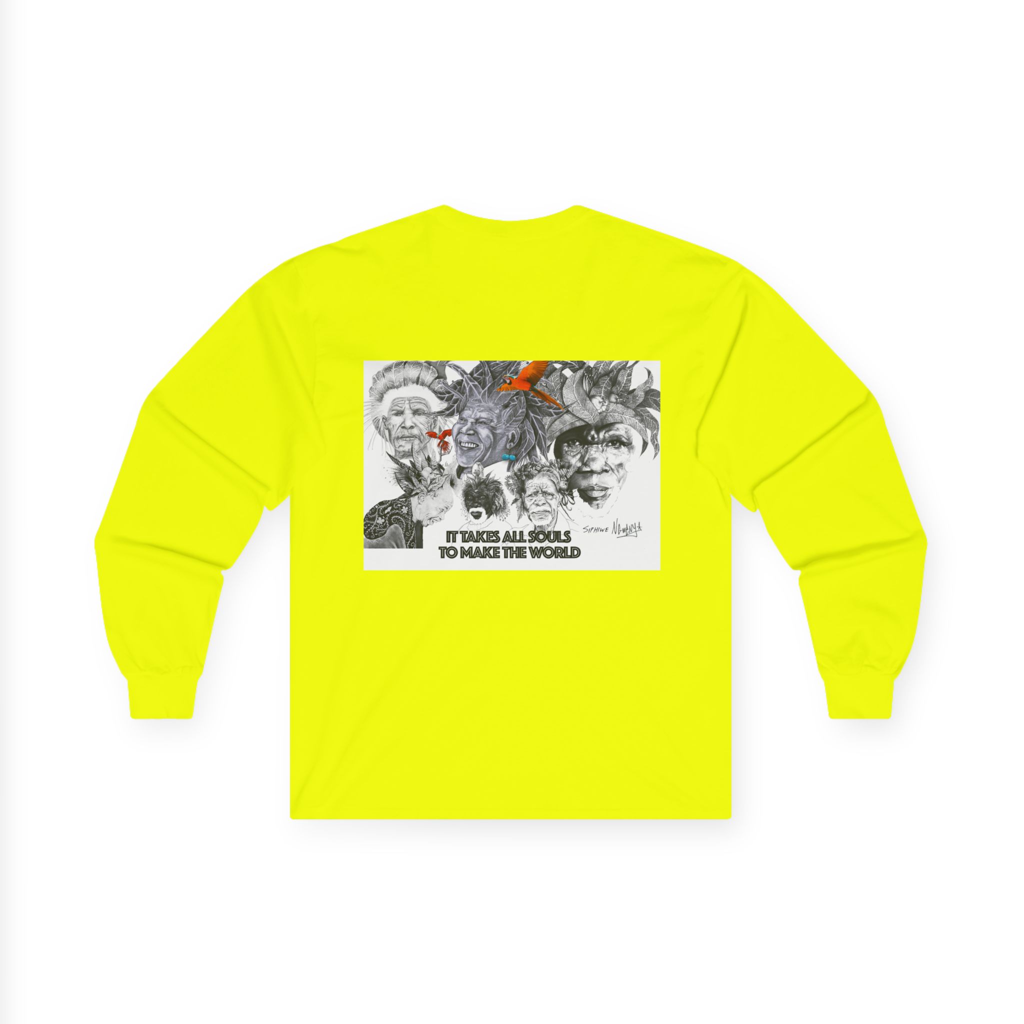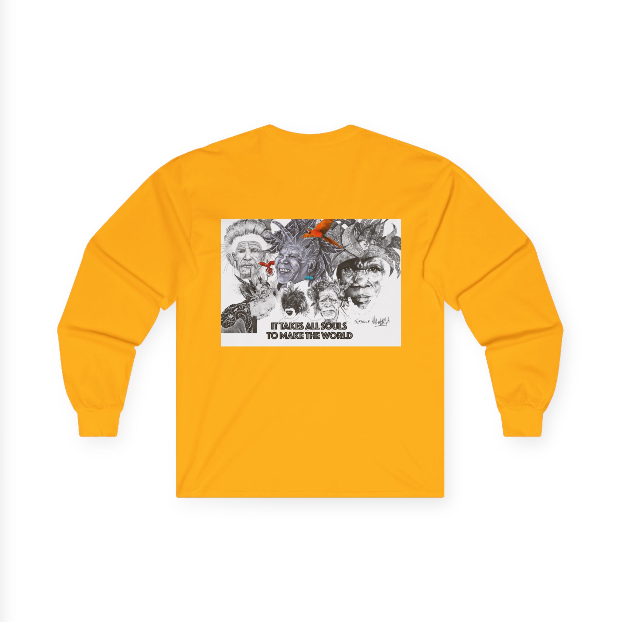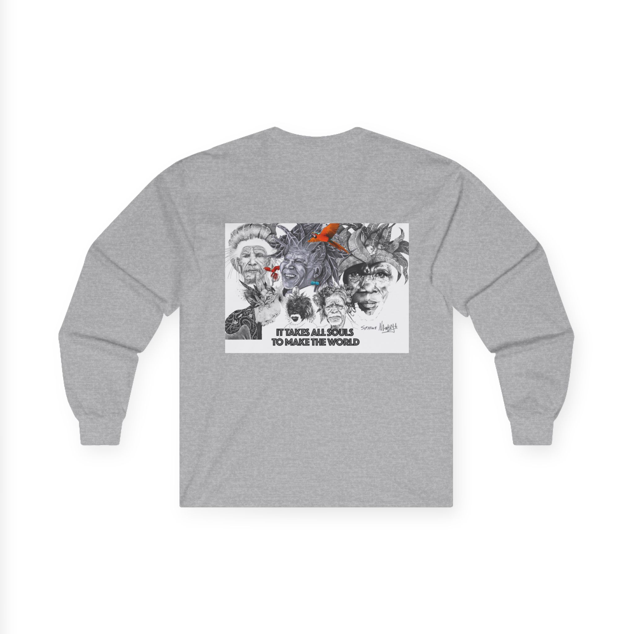 Carry quiet rebellion and reflection in Siphiwe Ngwenya’s “All Souls Collage,” a long-sleeve tee where layered, mural-like portraits meet hand-inked details and a whisper of rusty orange. The handwritten line — “It takes all souls to make the world” — evokes the Townships Into Towns philosophy, celebrating community, heritage, and creative empowerment through wearable art.