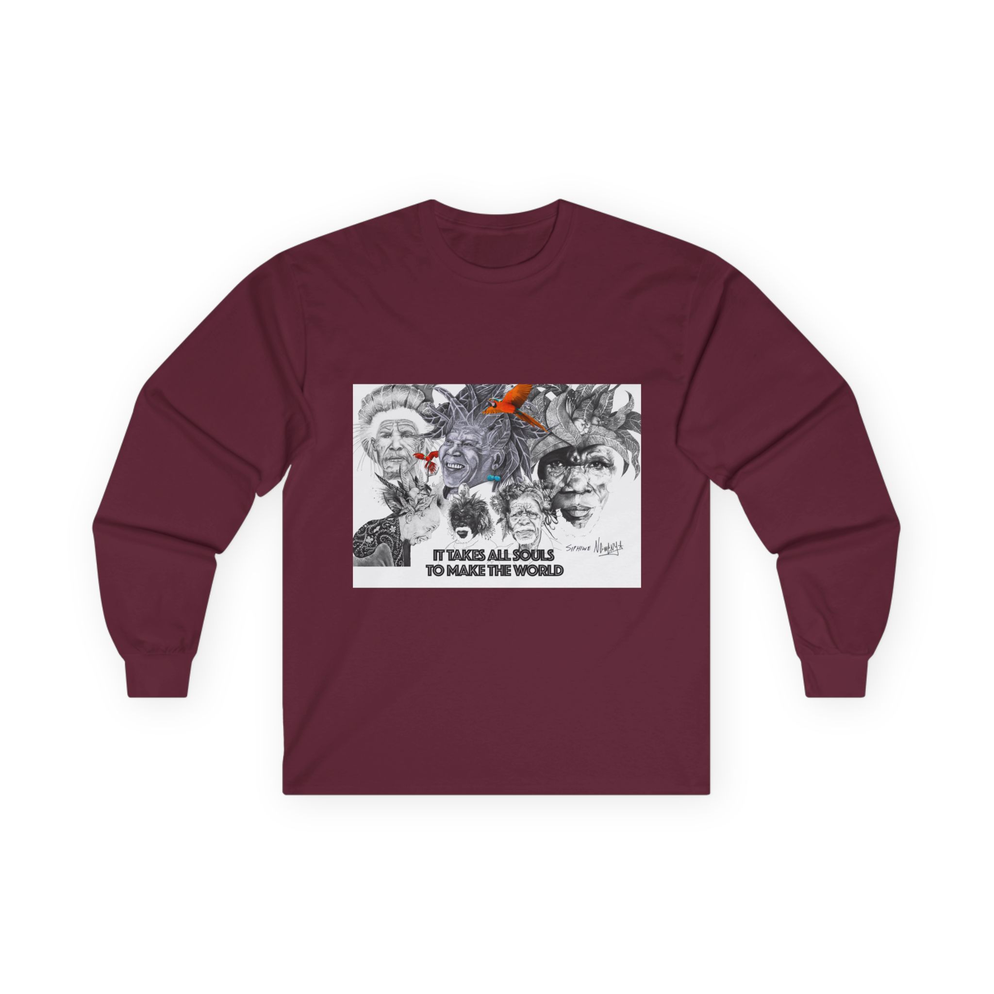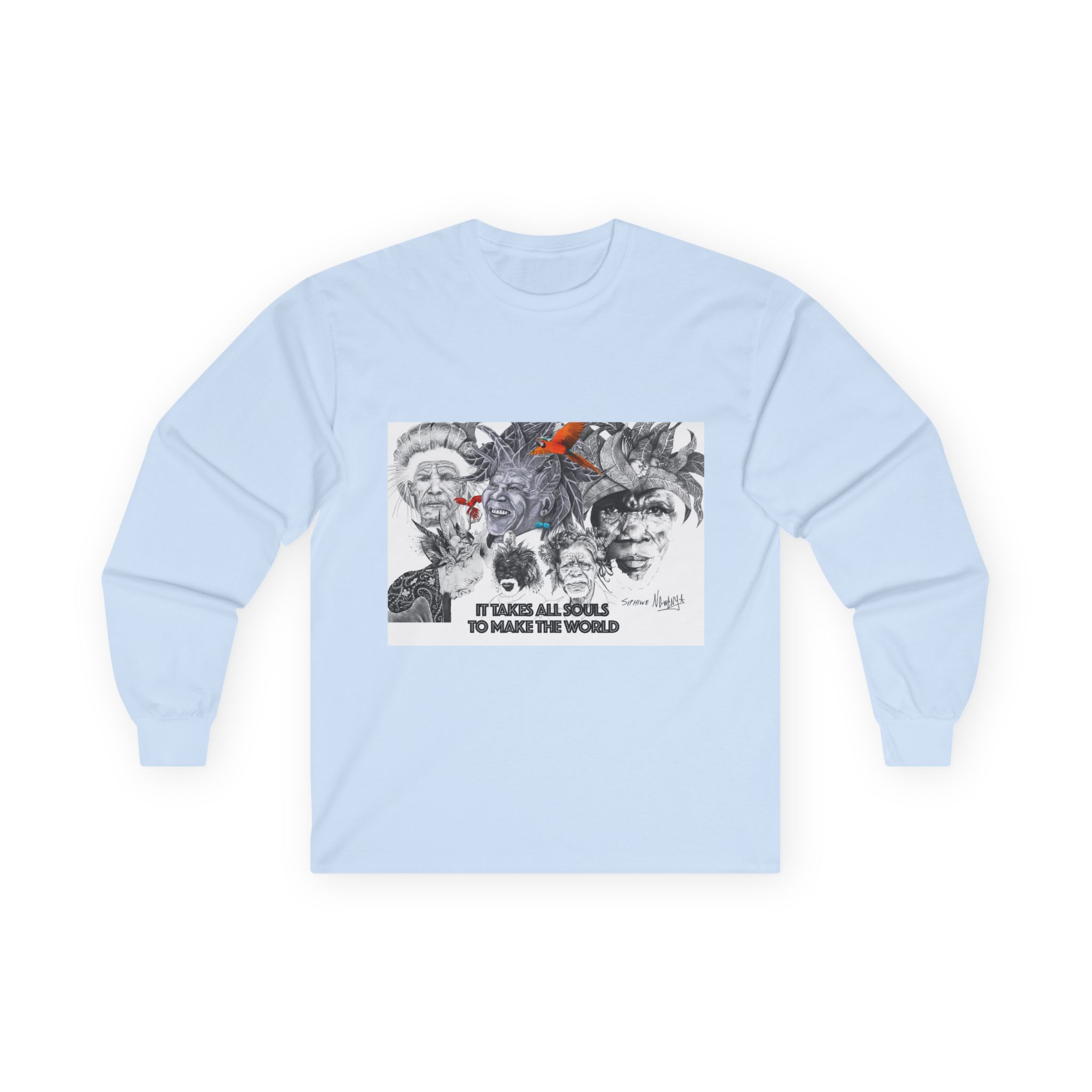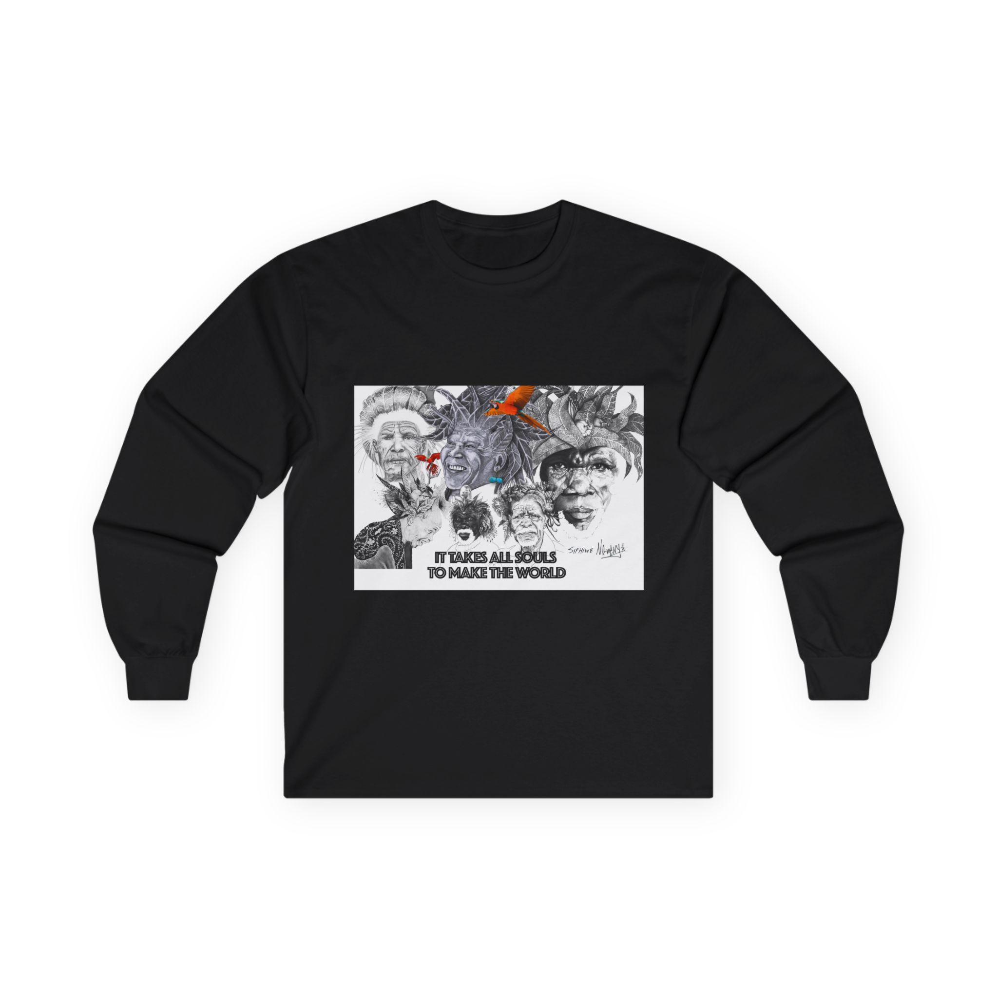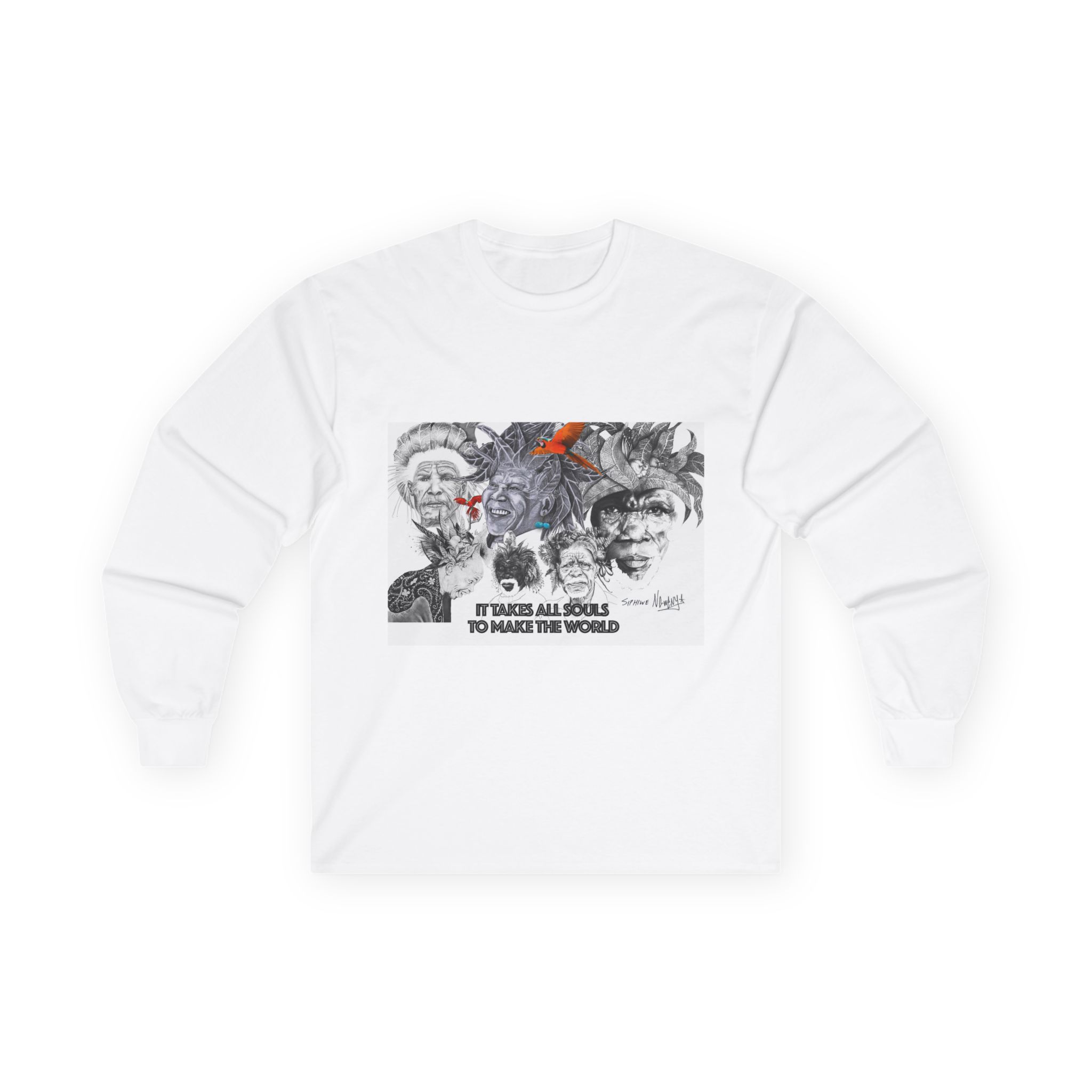 Long Sleeve Tee — “It Takes All Souls to Make the World” Vintage Portrait Graphic