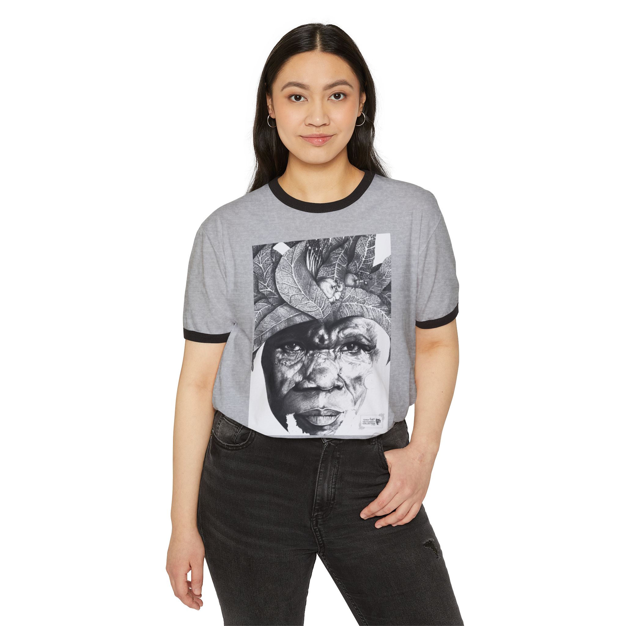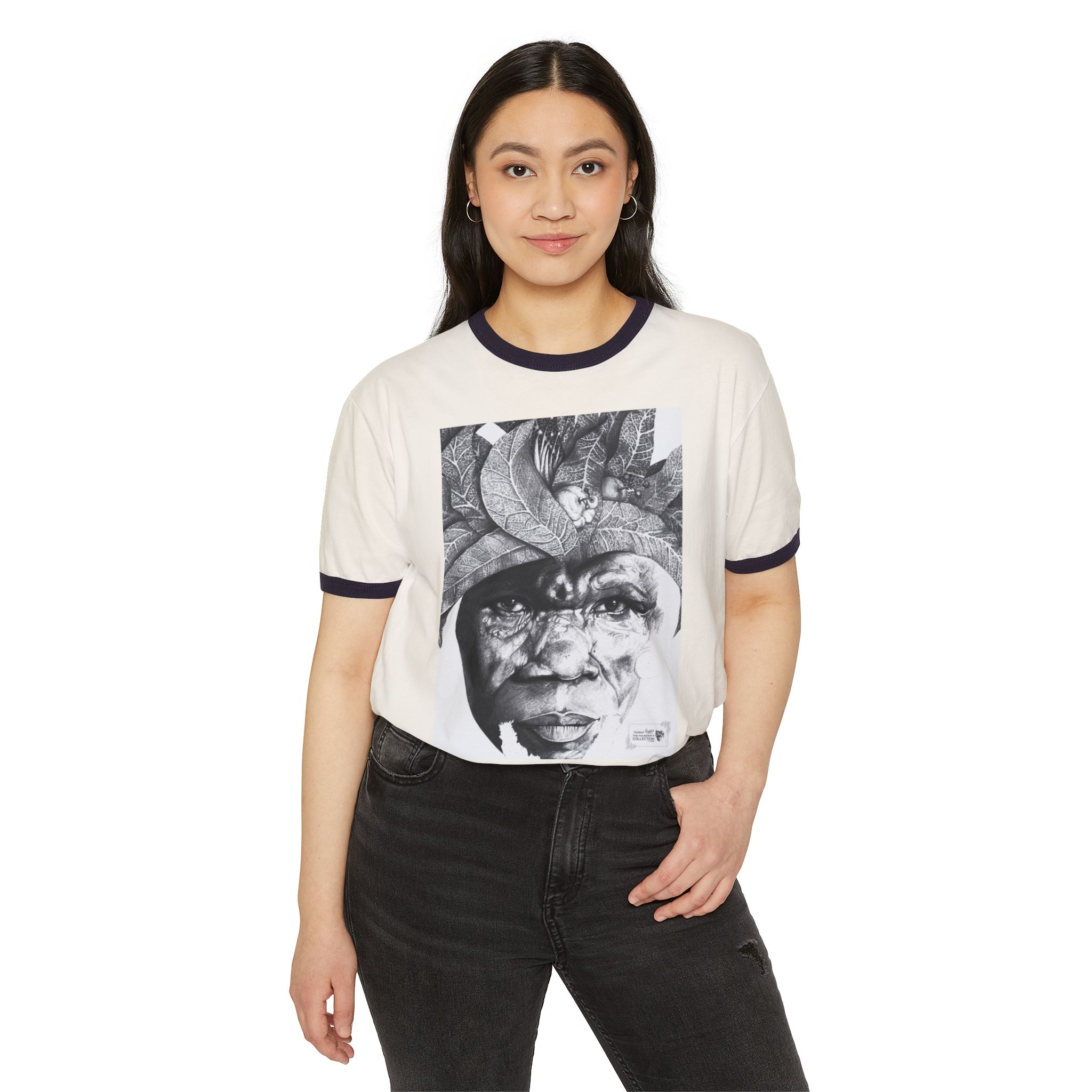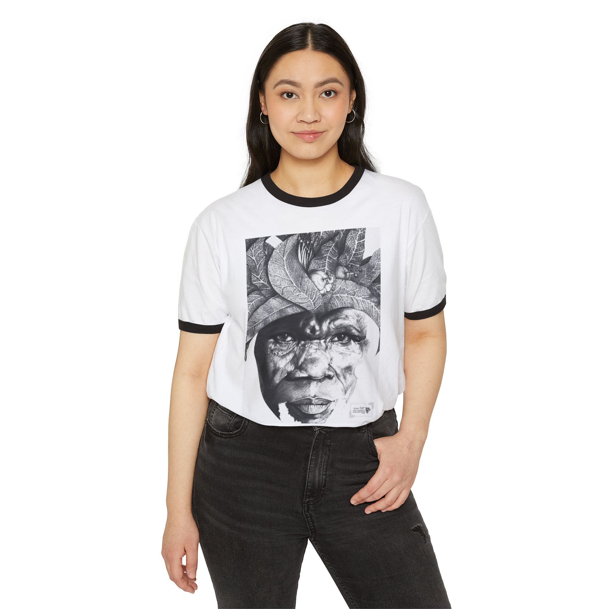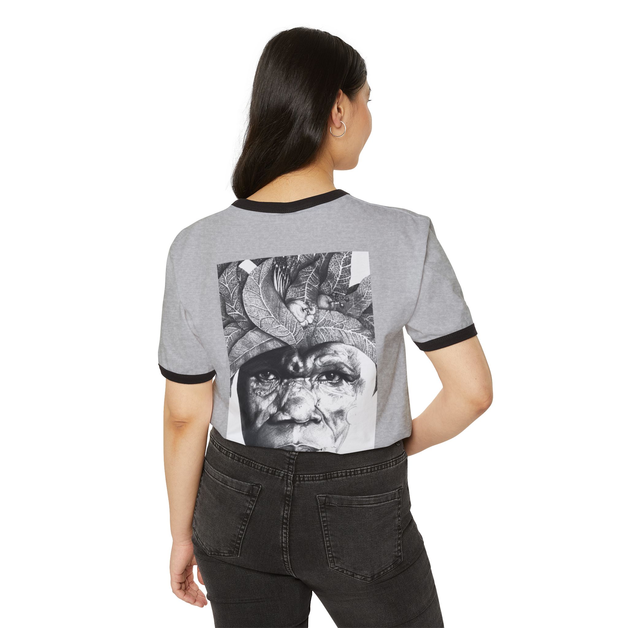 Portrait Art Ringer T‑Shirt — Monochrome Leaf Face Graphic