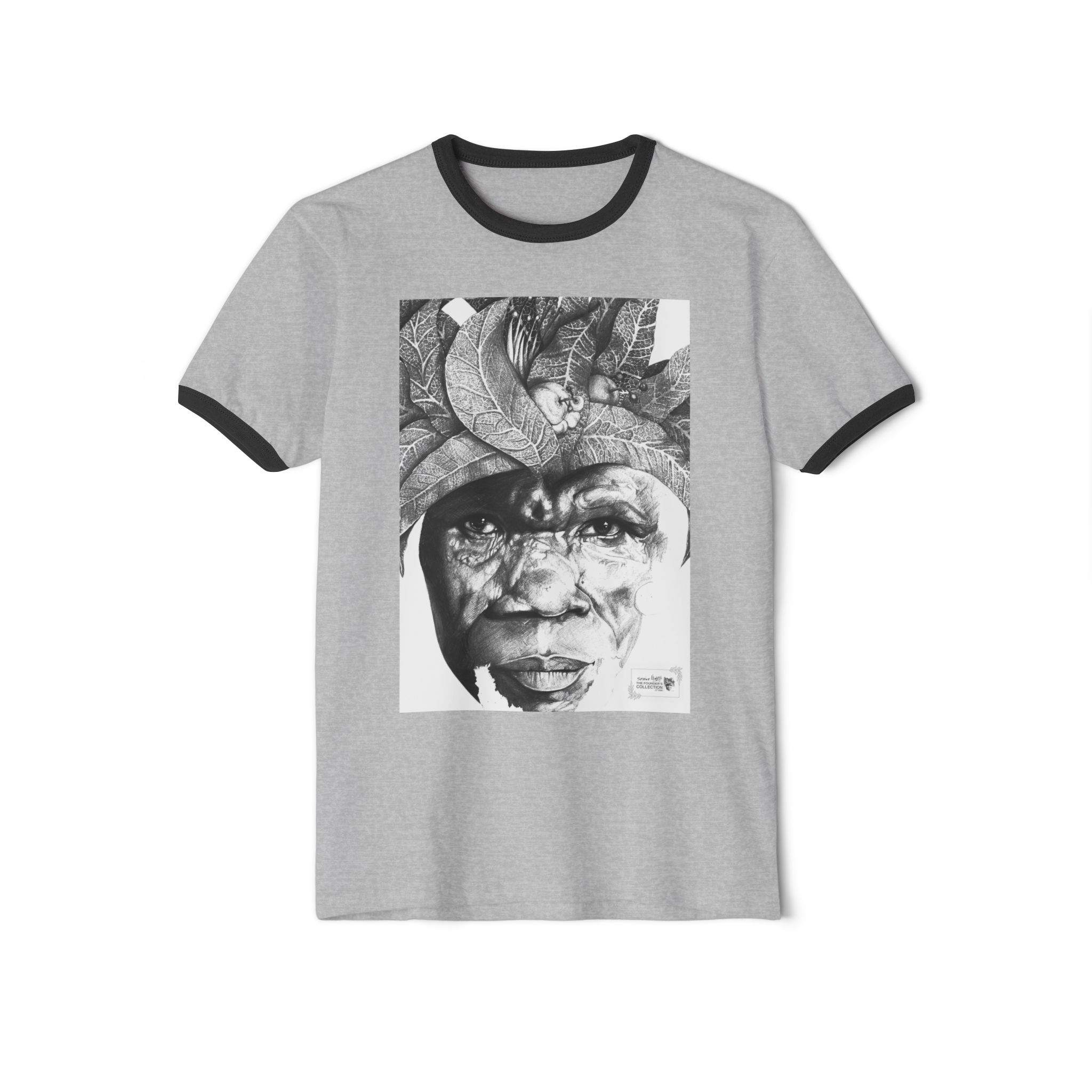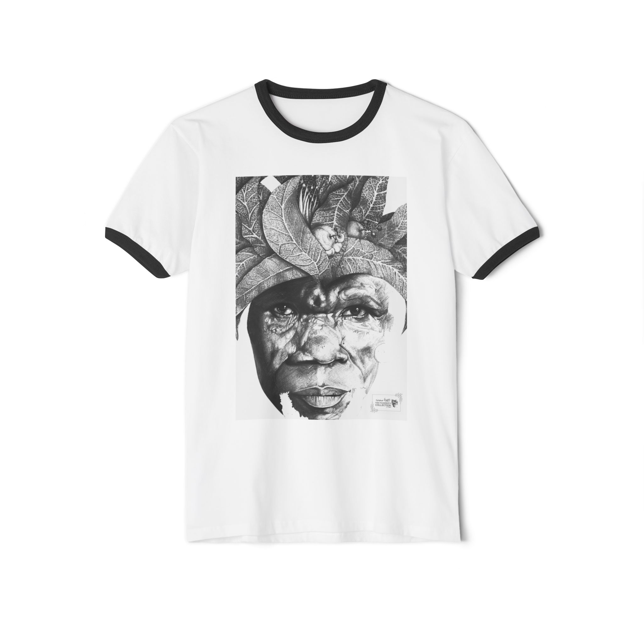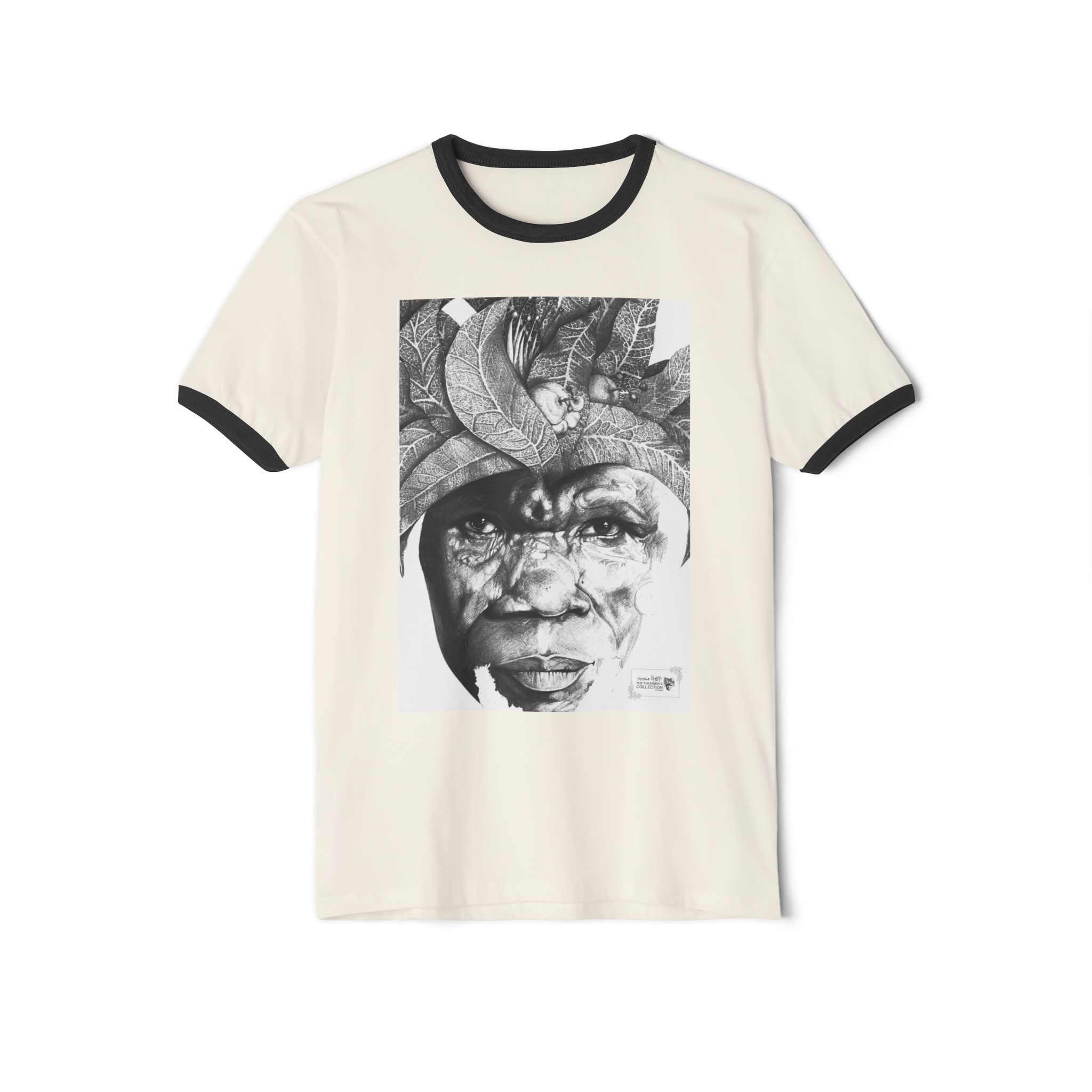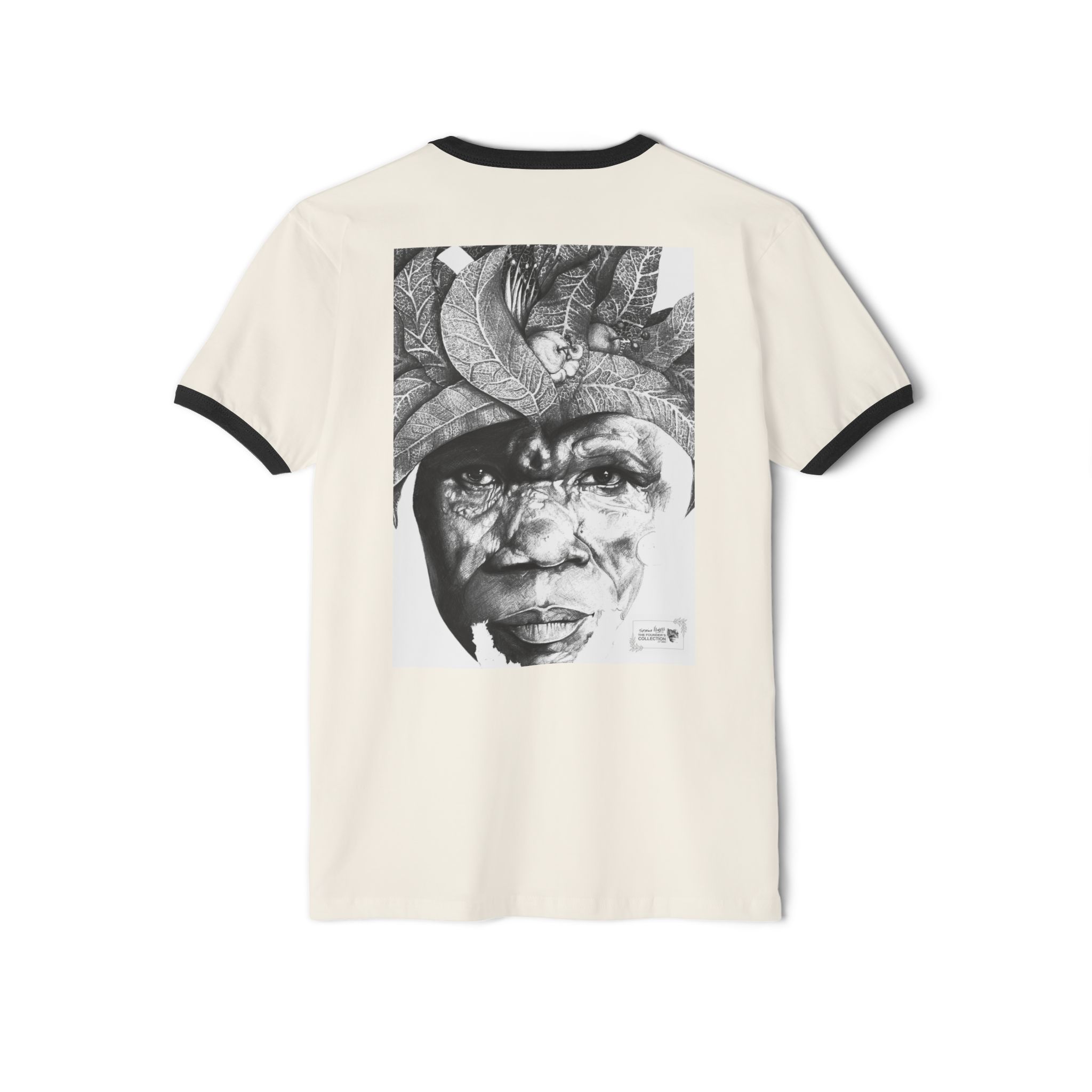 This soft, lightweight ringer tee blends vintage lines with contemporary expression, featuring The Sunman – Guardian of the Orchard Mind as a crisp black-and-white portrait centered on a creamy base. Dark contrast trim at the collar and sleeves frames the artwork, giving the piece a subtle retro edge while allowing the image to remain calm, focused, and quietly commanding.