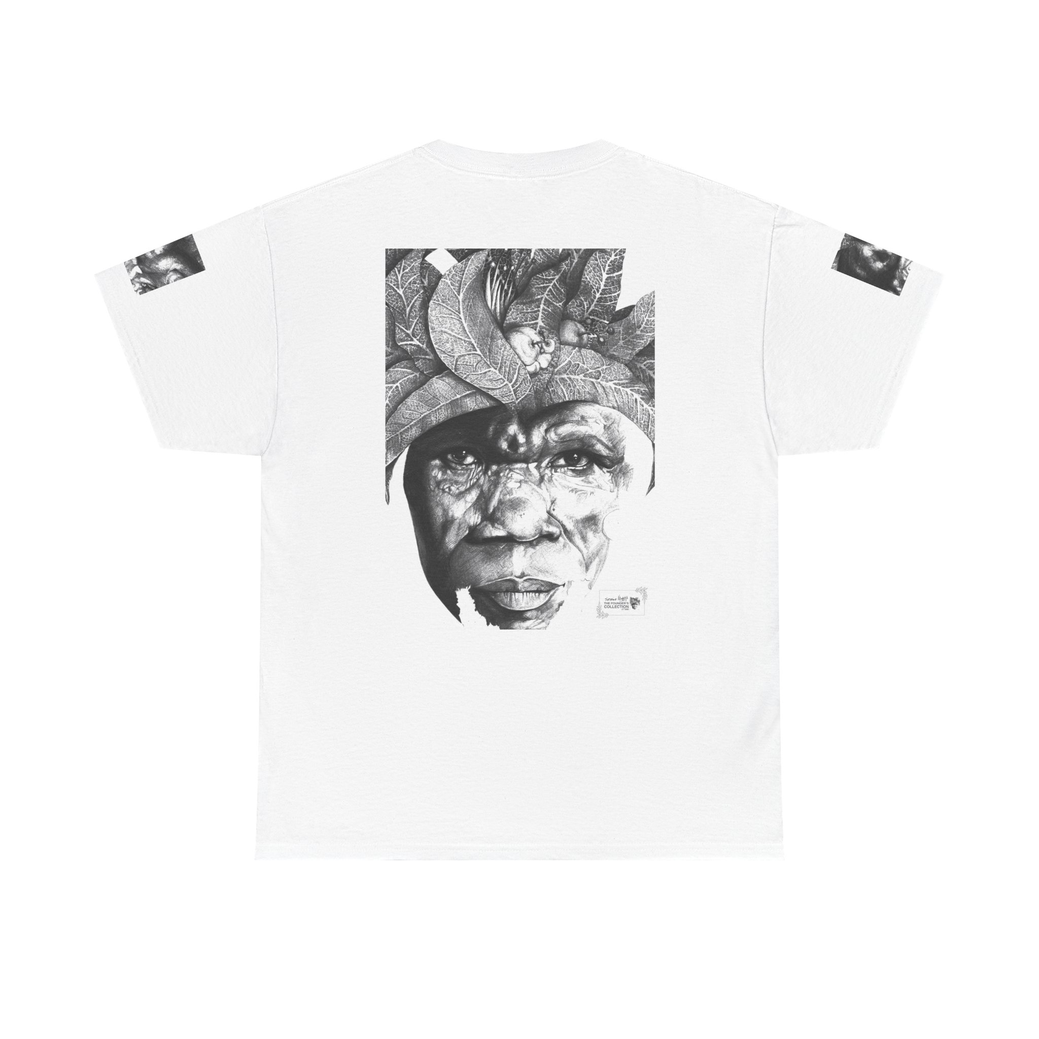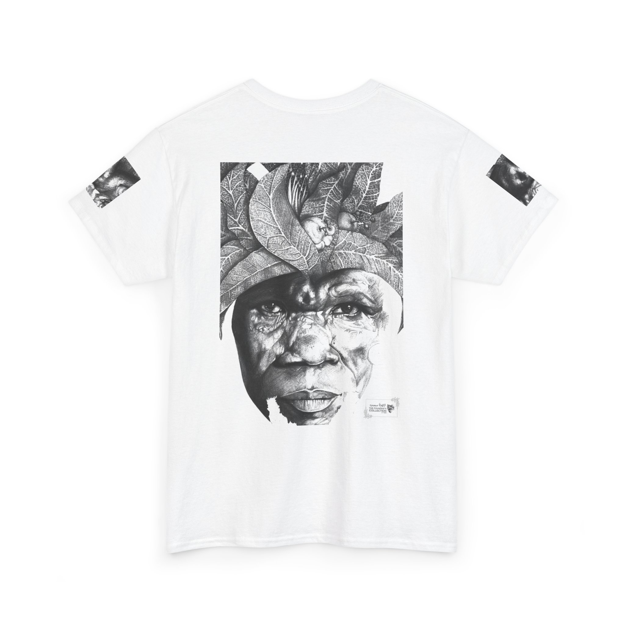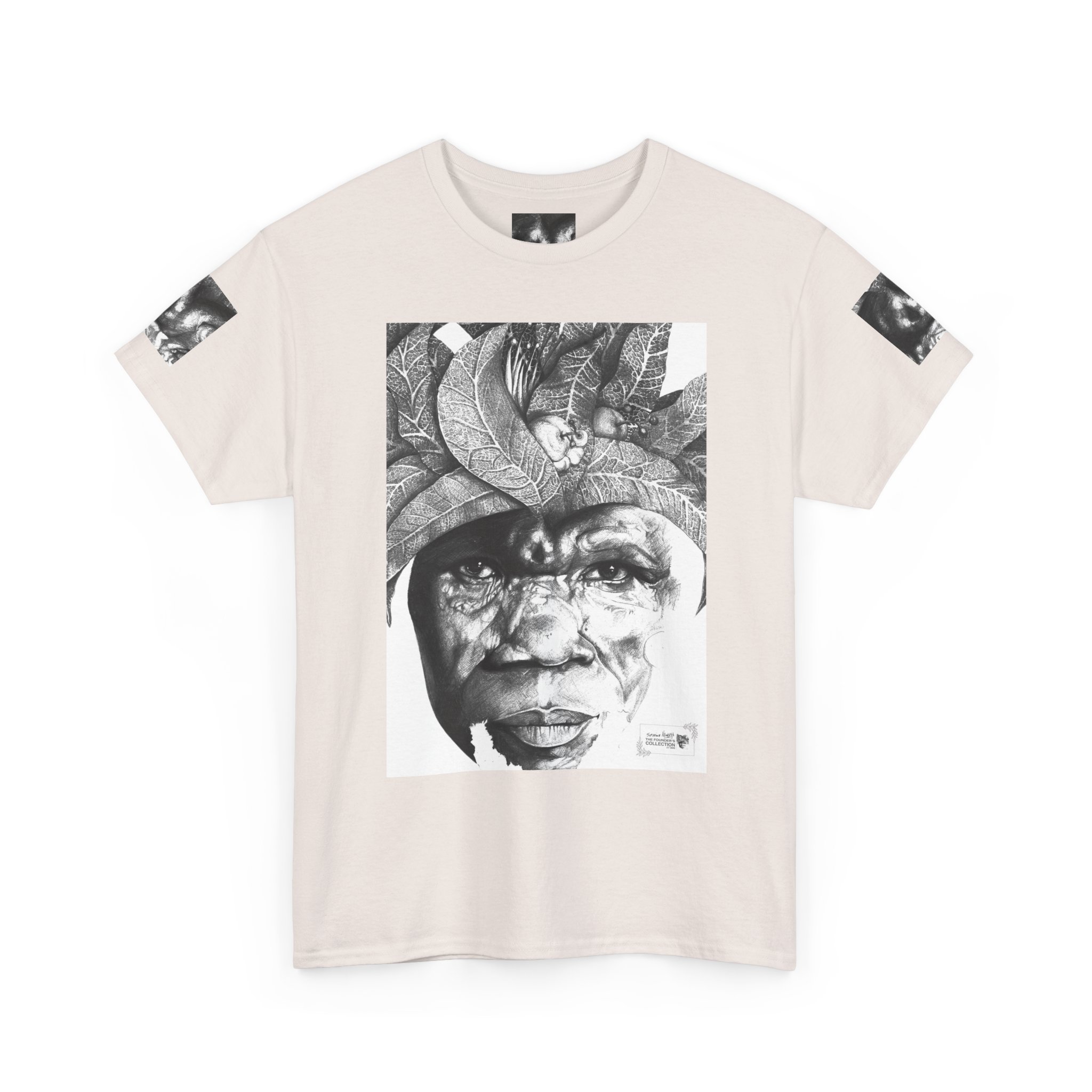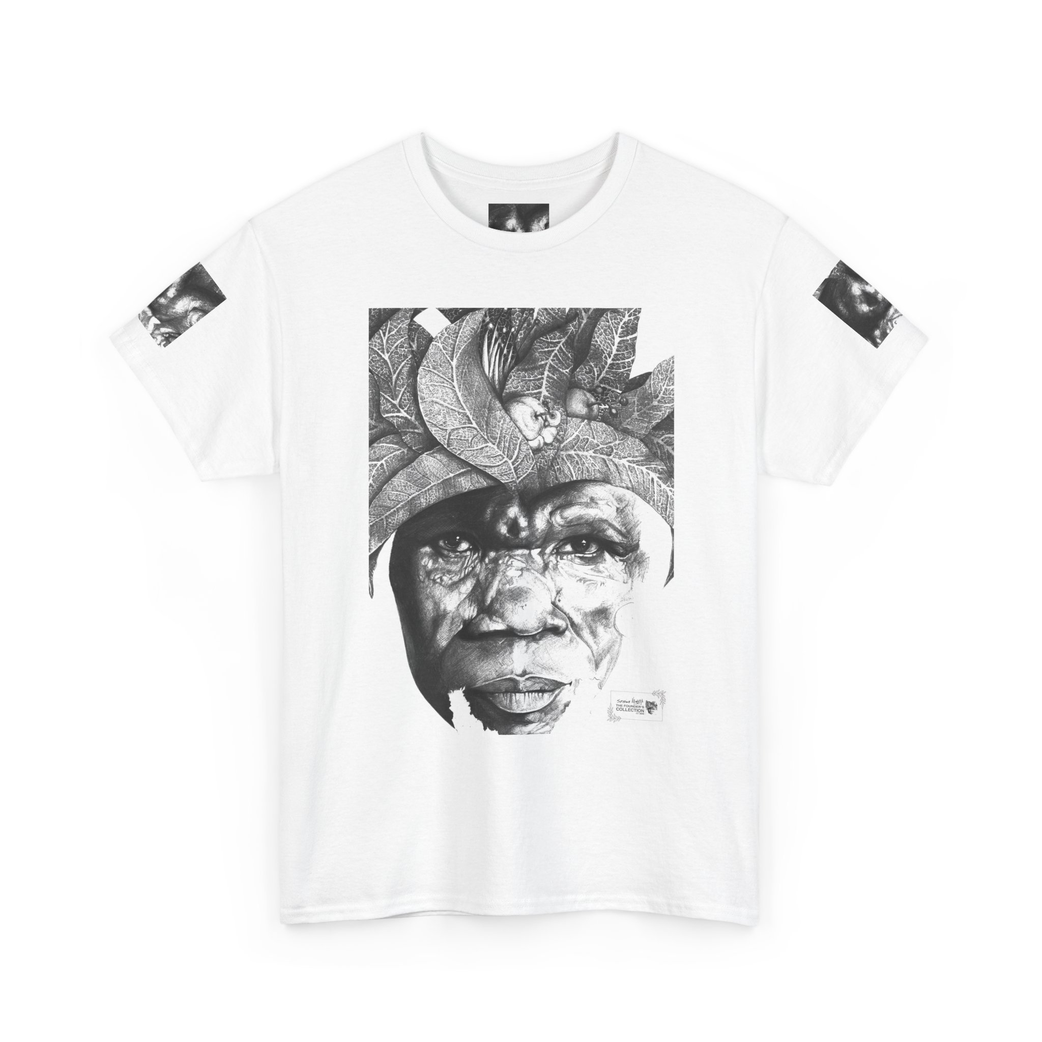 This heavyweight cotton tee wears like a living canvas for The Sunman – Guardian of the Orchard Mind. The central black-and-white portrait blends a dignified human presence with layered botanical elements, creating a visual tension that feels both grounded and stirring. It sits comfortably between streetwear and contemplative art — a piece that communicates depth without excess.
