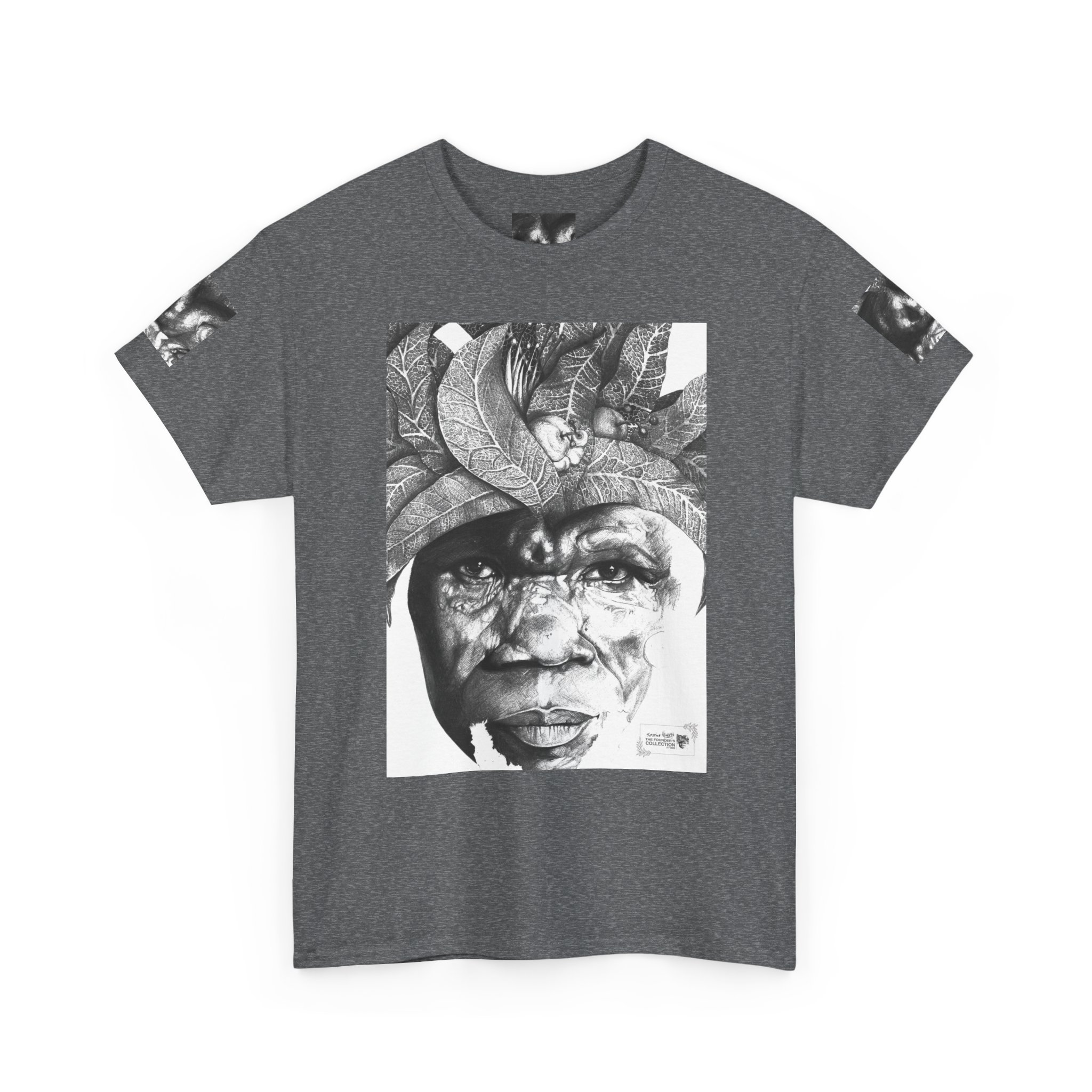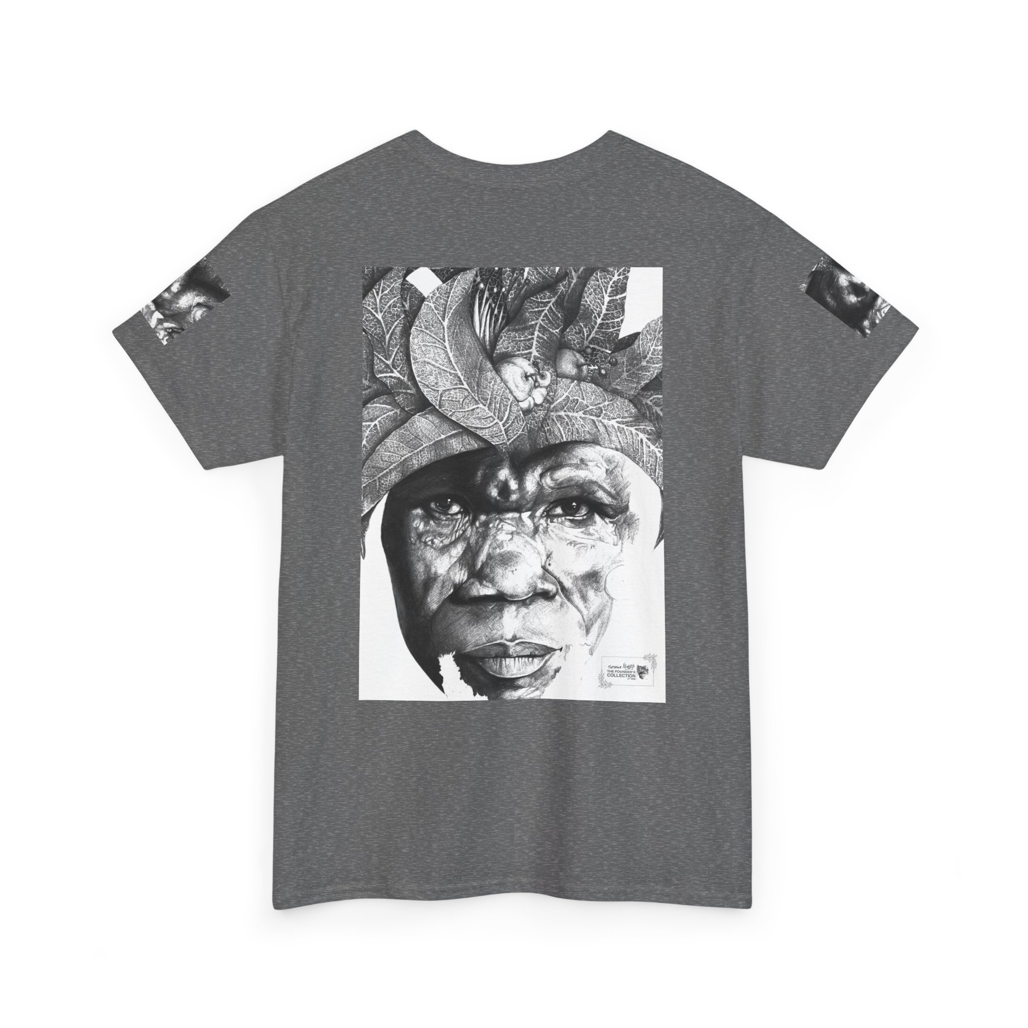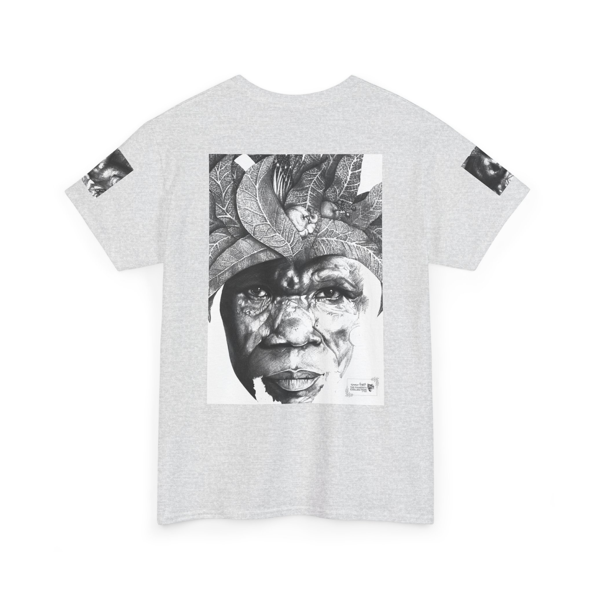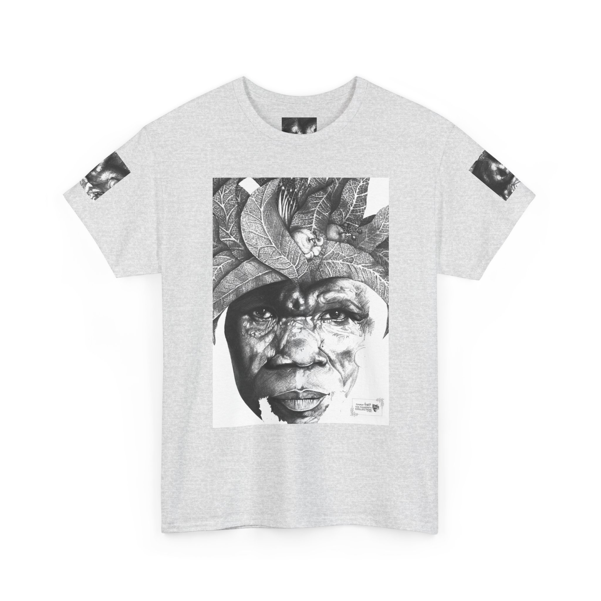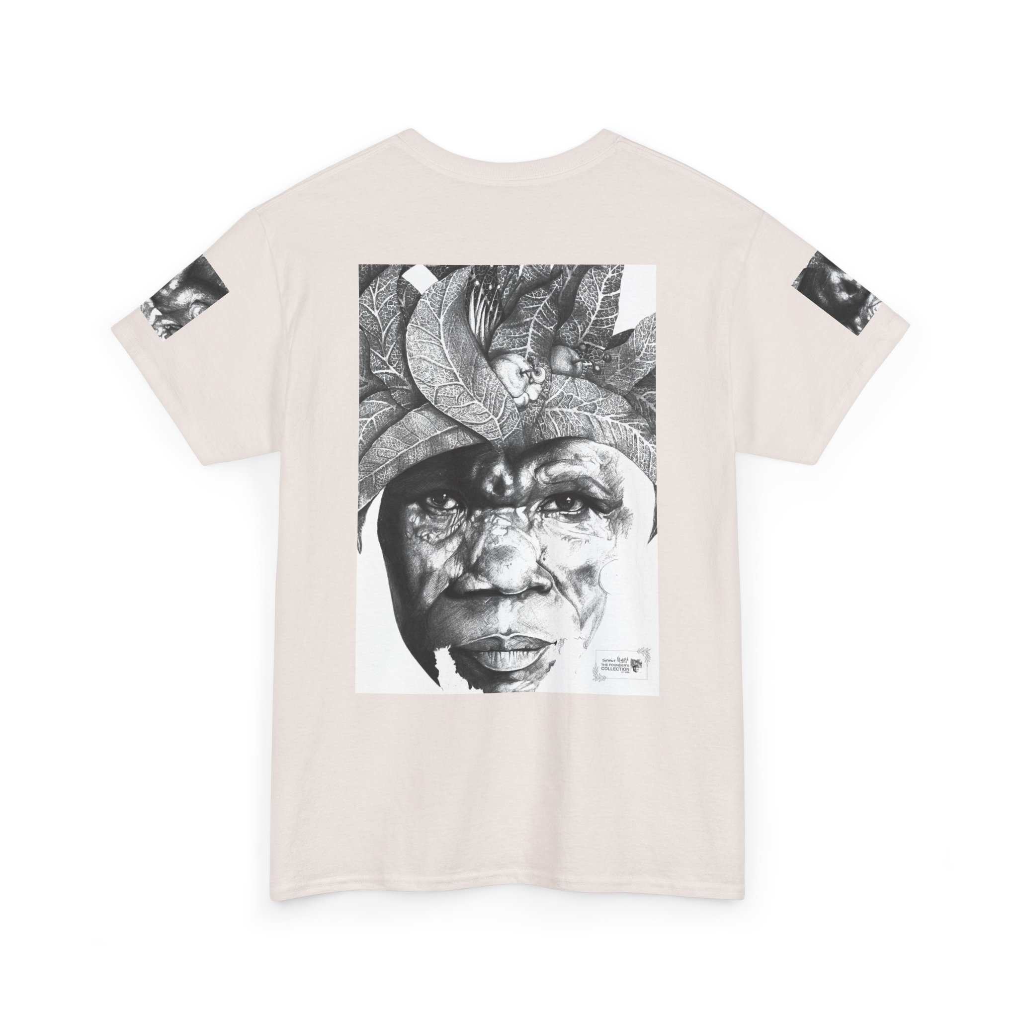 This heavyweight cotton tee wears like a living canvas for The Sunman – Guardian of the Orchard Mind. The central black-and-white portrait blends a dignified human presence with layered botanical elements, creating a visual tension that feels both grounded and stirring. It sits comfortably between streetwear and contemplative art — a piece that communicates depth without excess.