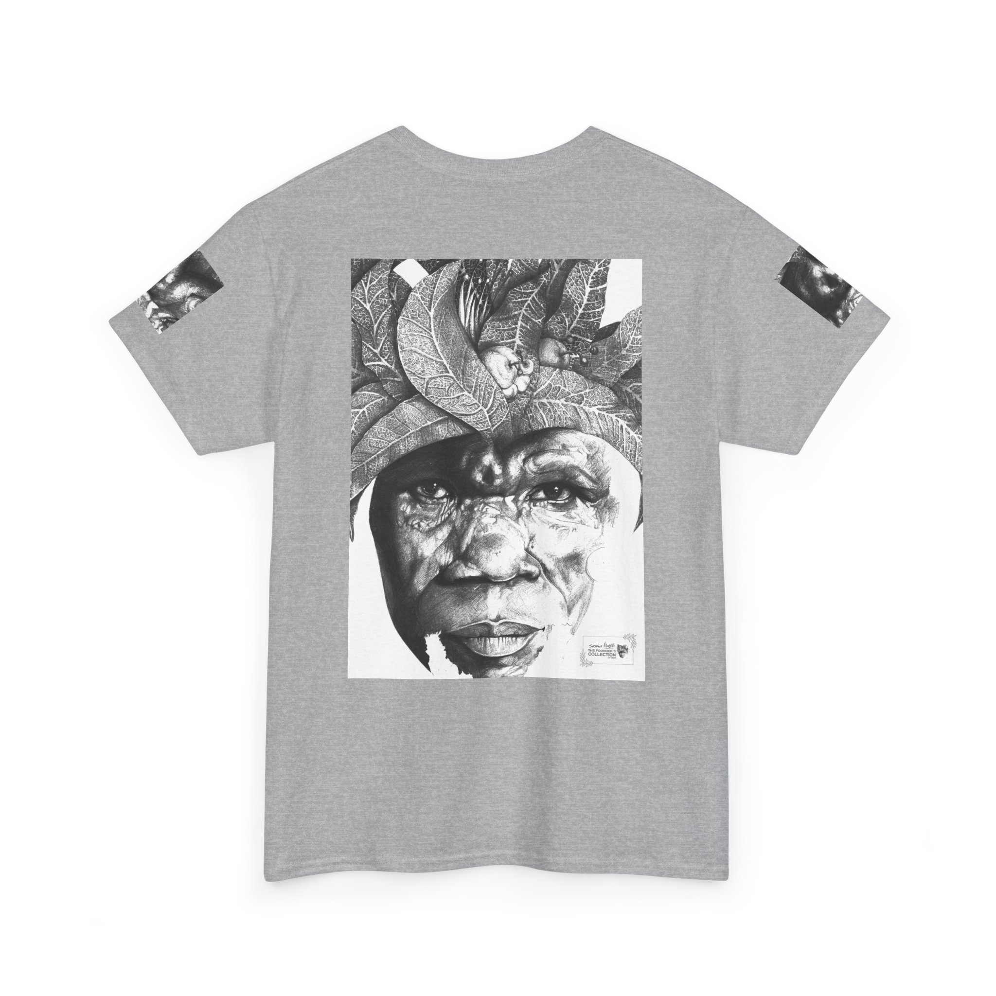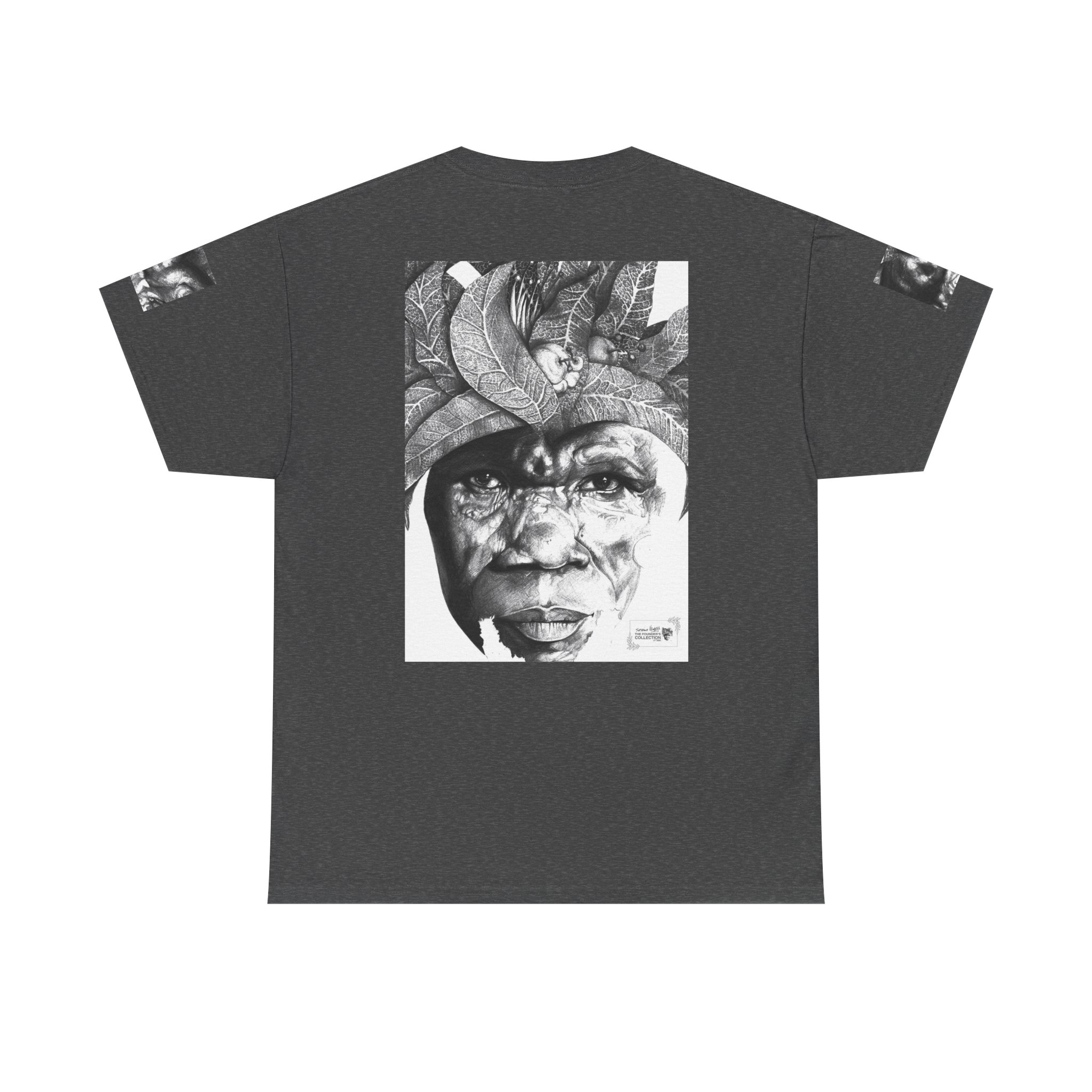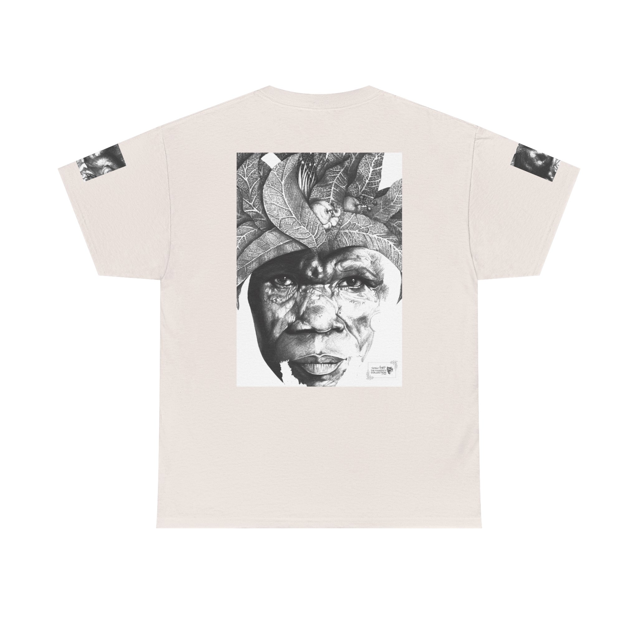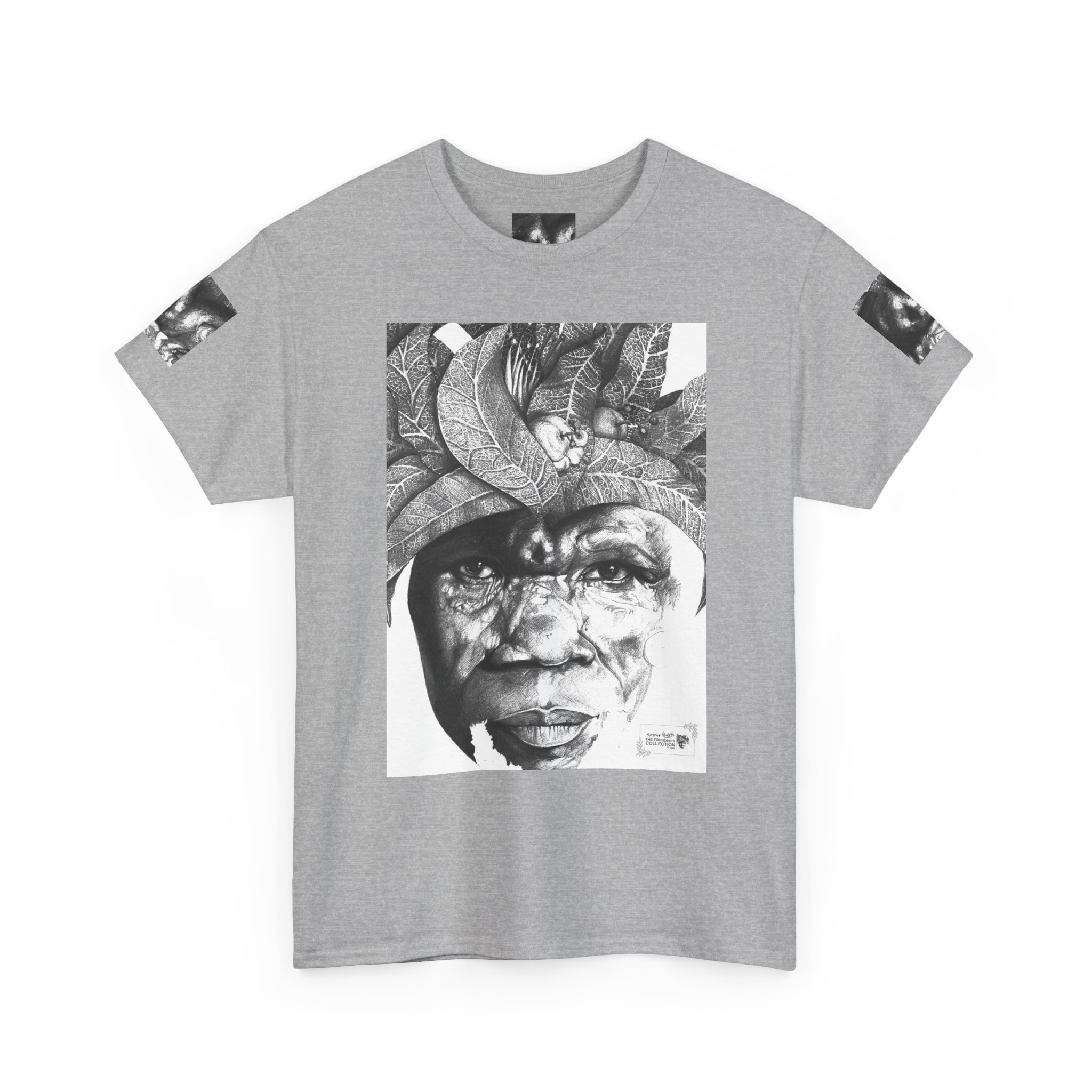 This heavyweight cotton tee wears like a living canvas for The Sunman – Guardian of the Orchard Mind. The central black-and-white portrait blends a dignified human presence with layered botanical elements, creating a visual tension that feels both grounded and stirring. It sits comfortably between streetwear and contemplative art — a piece that communicates depth without excess.