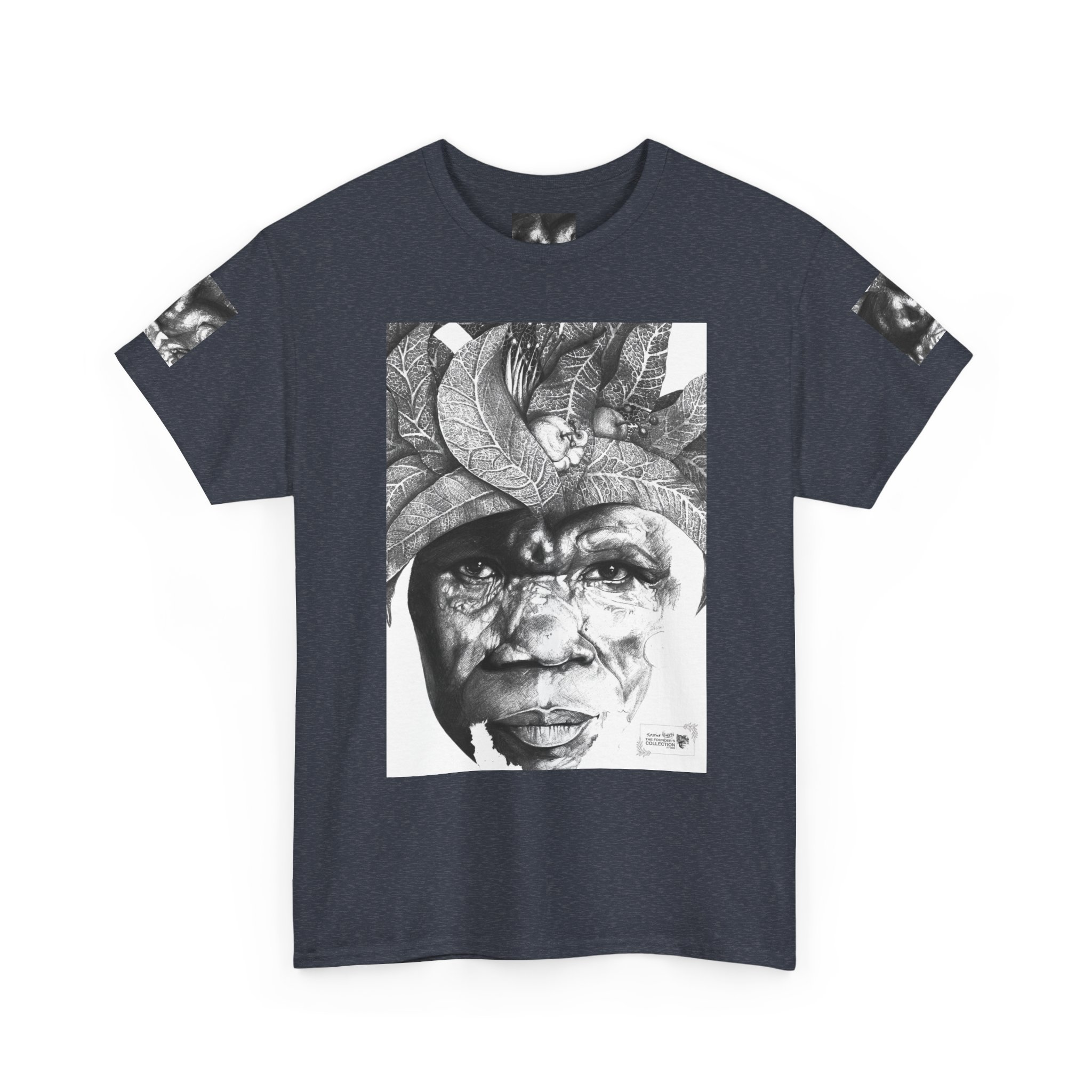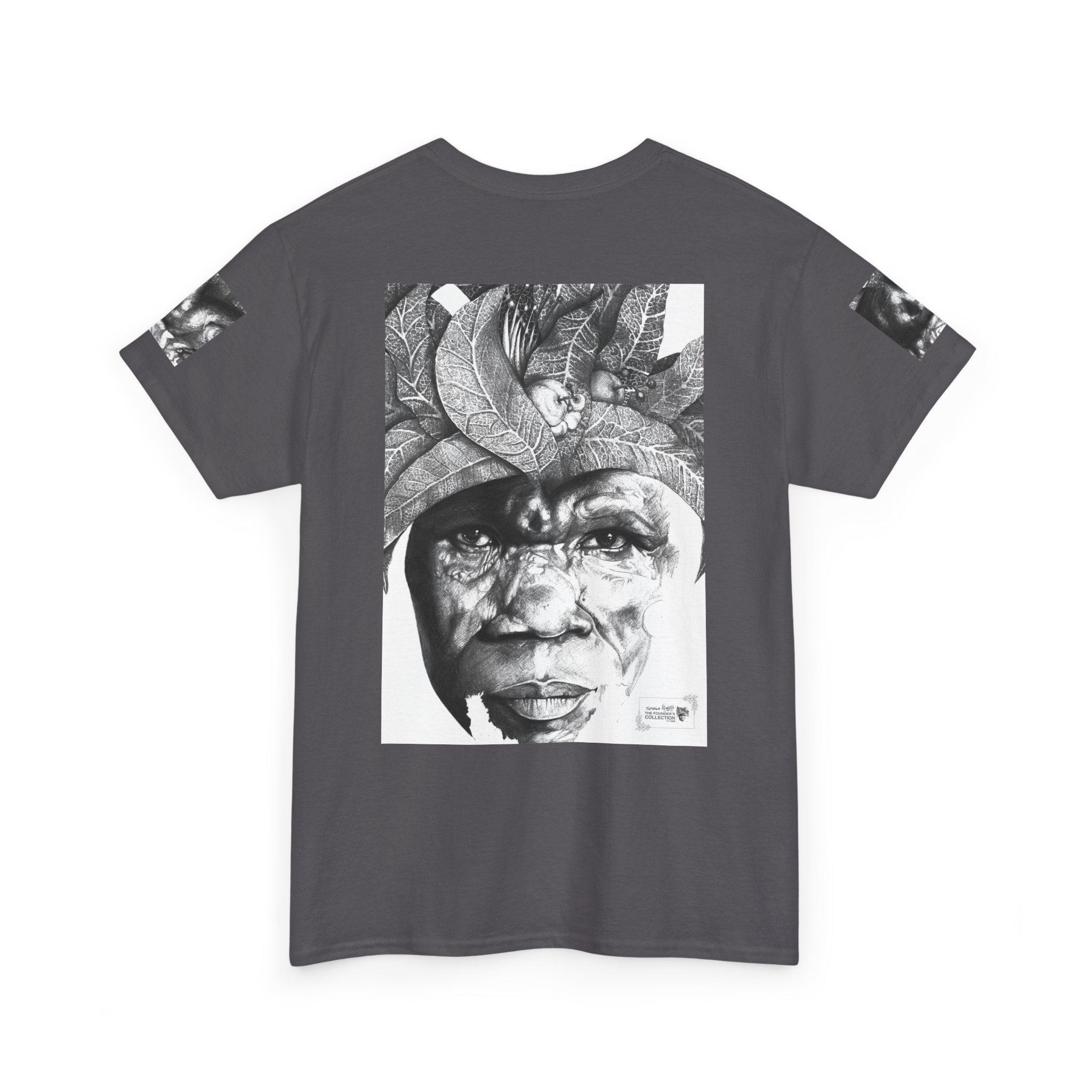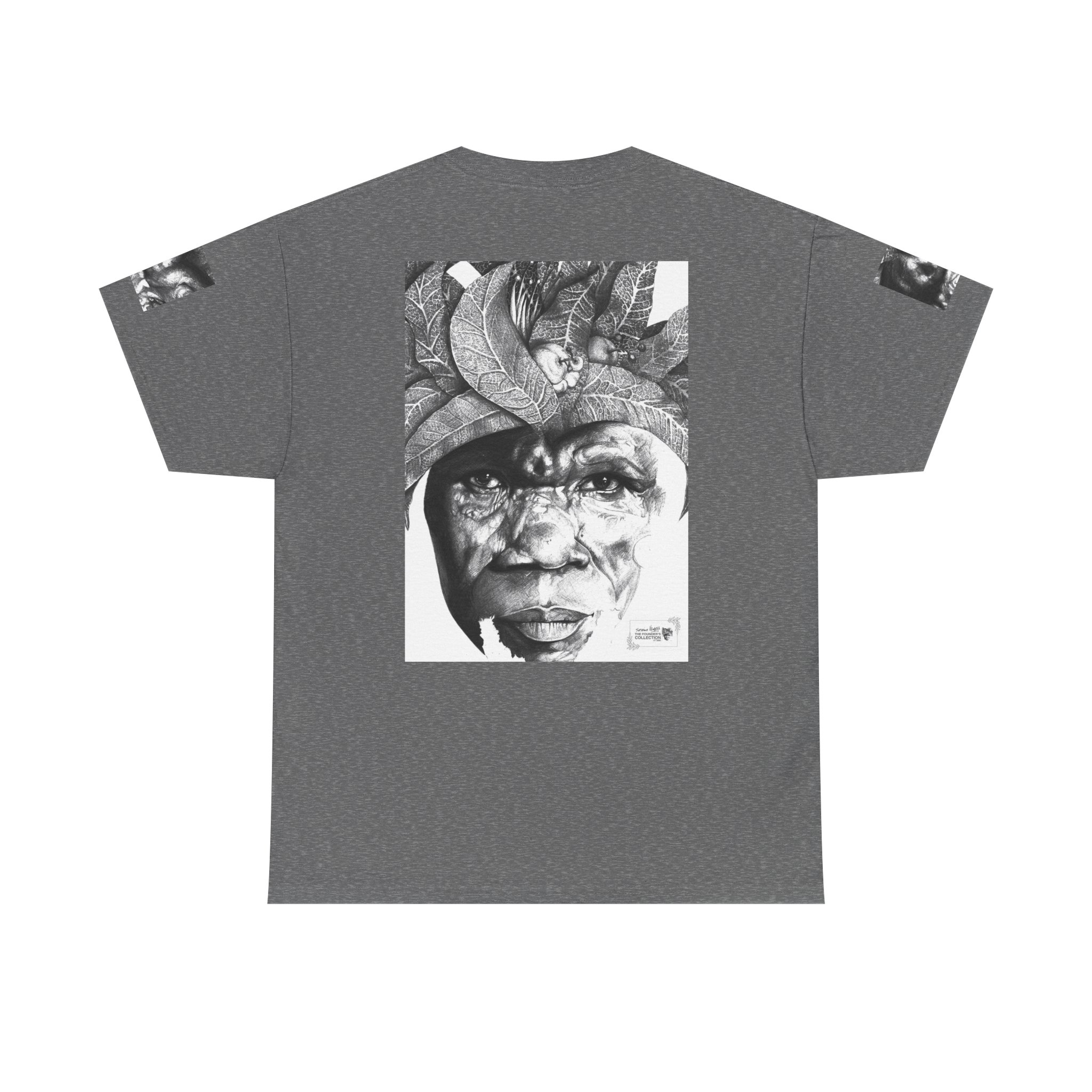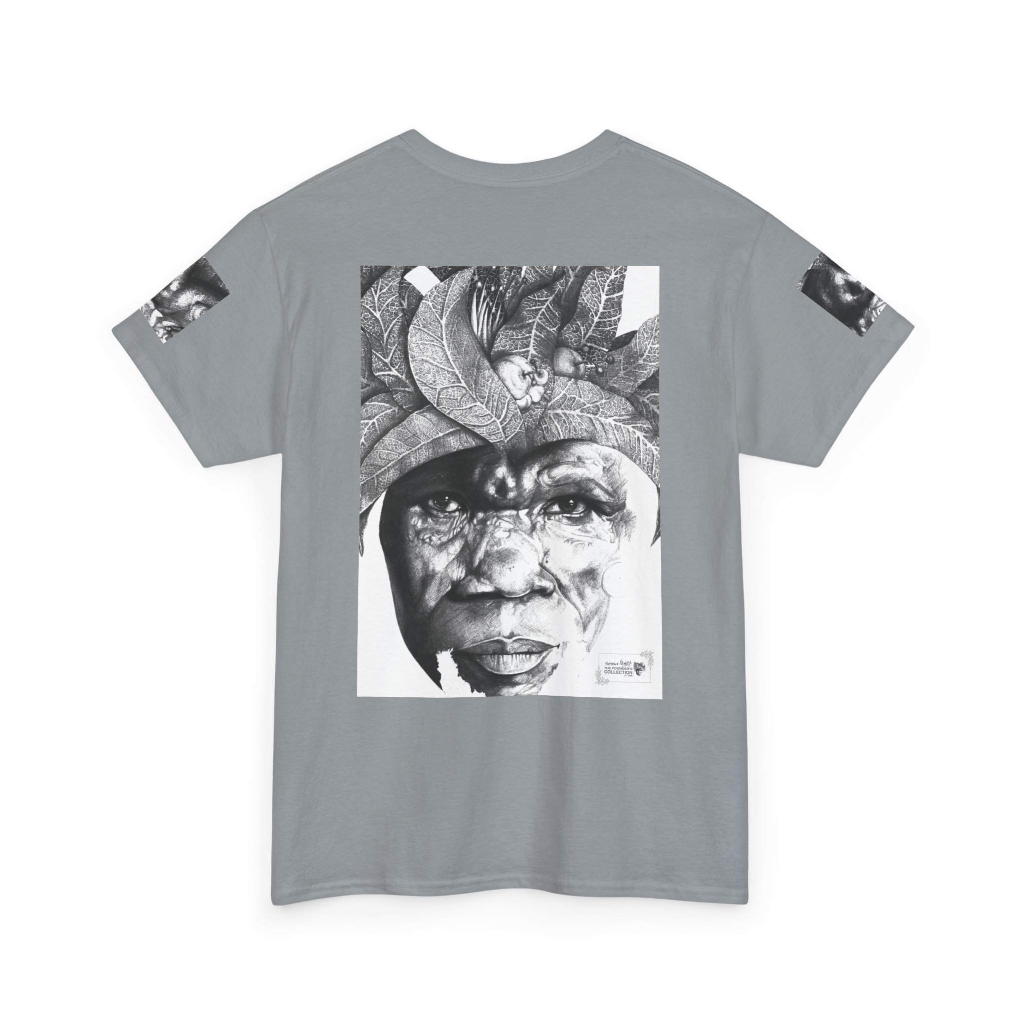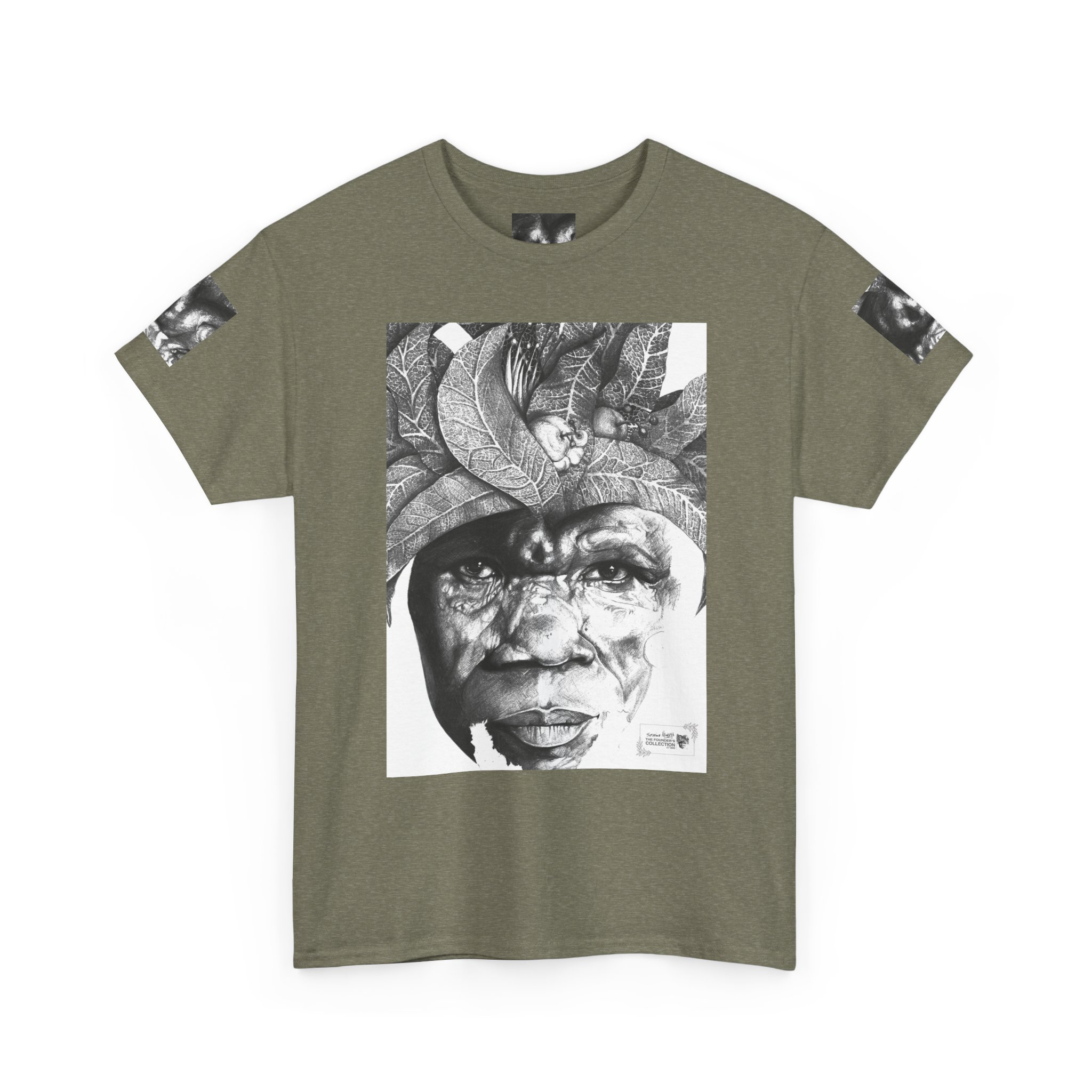This heavyweight cotton tee wears like a living canvas for The Sunman – Guardian of the Orchard Mind. The central black-and-white portrait blends a dignified human presence with layered botanical elements, creating a visual tension that feels both grounded and stirring. It sits comfortably between streetwear and contemplative art — a piece that communicates depth without excess.