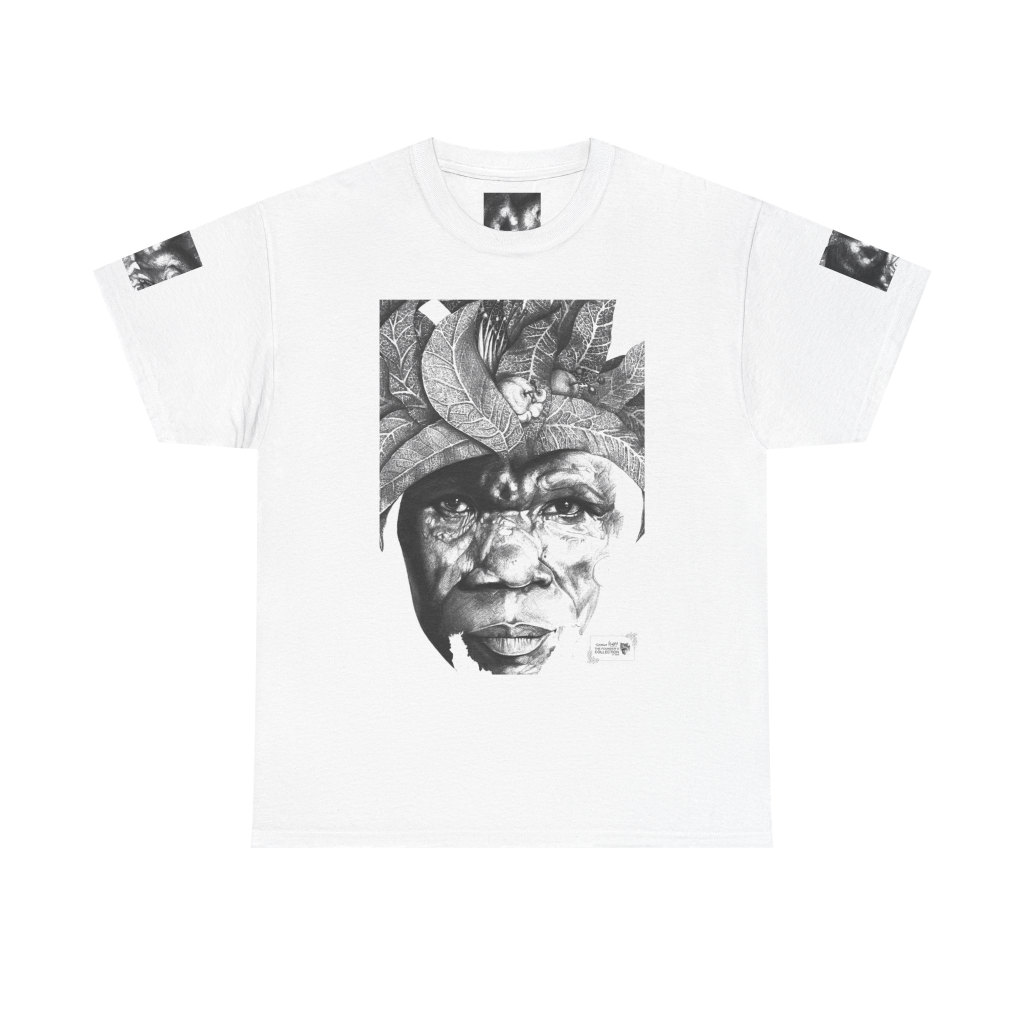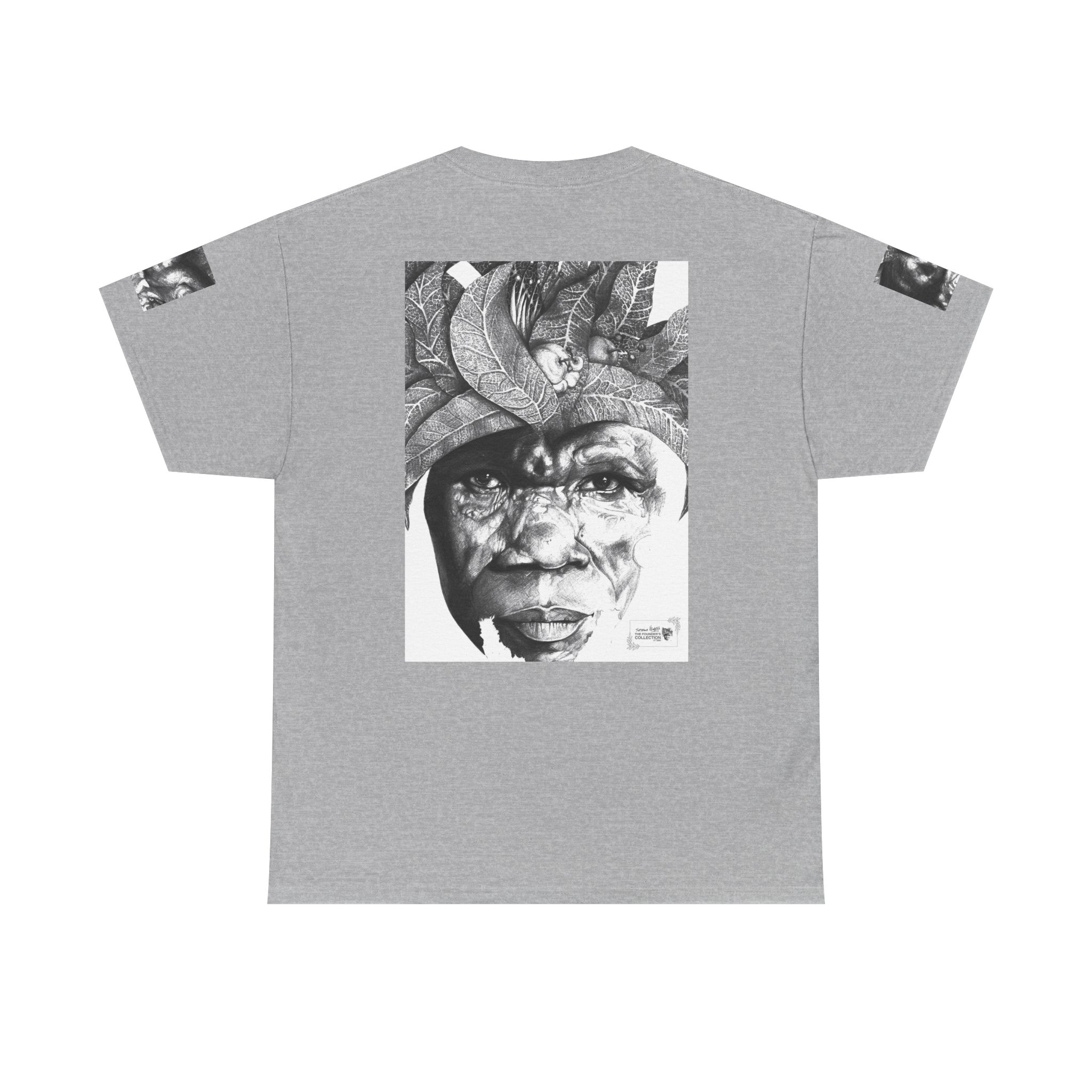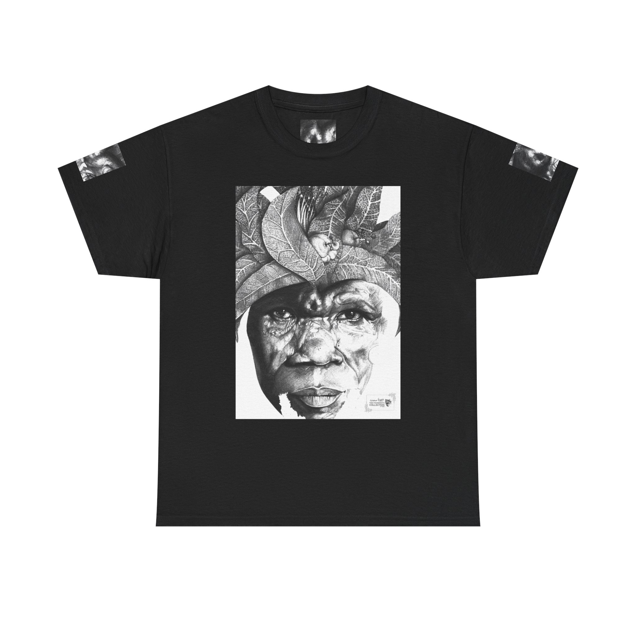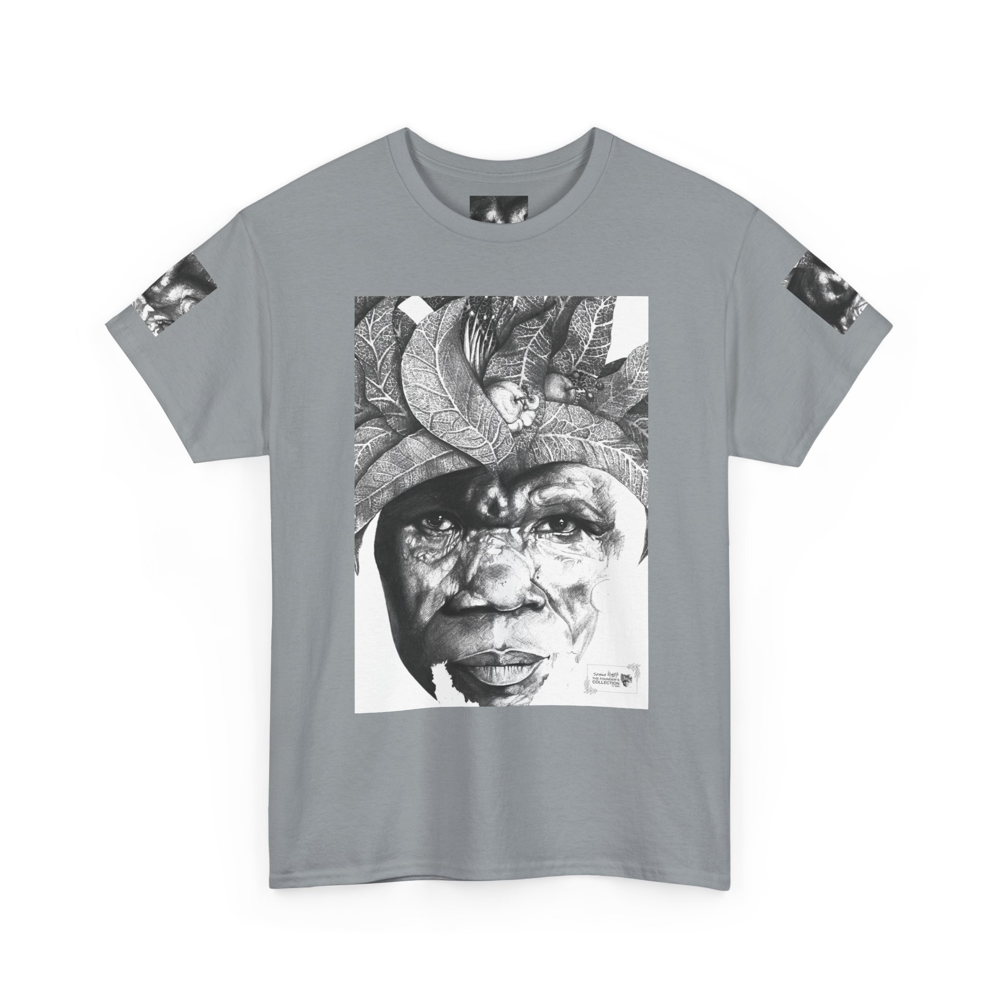This heavyweight cotton tee wears like a living canvas for The Sunman – Guardian of the Orchard Mind. The central black-and-white portrait blends a dignified human presence with layered botanical elements, creating a visual tension that feels both grounded and stirring. It sits comfortably between streetwear and contemplative art — a piece that communicates depth without excess.