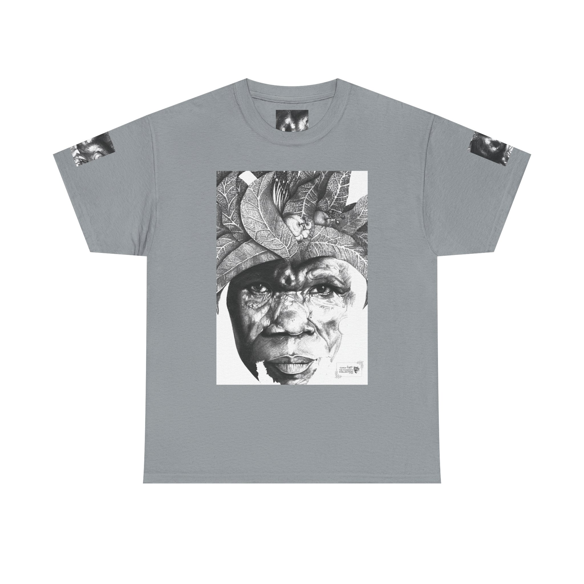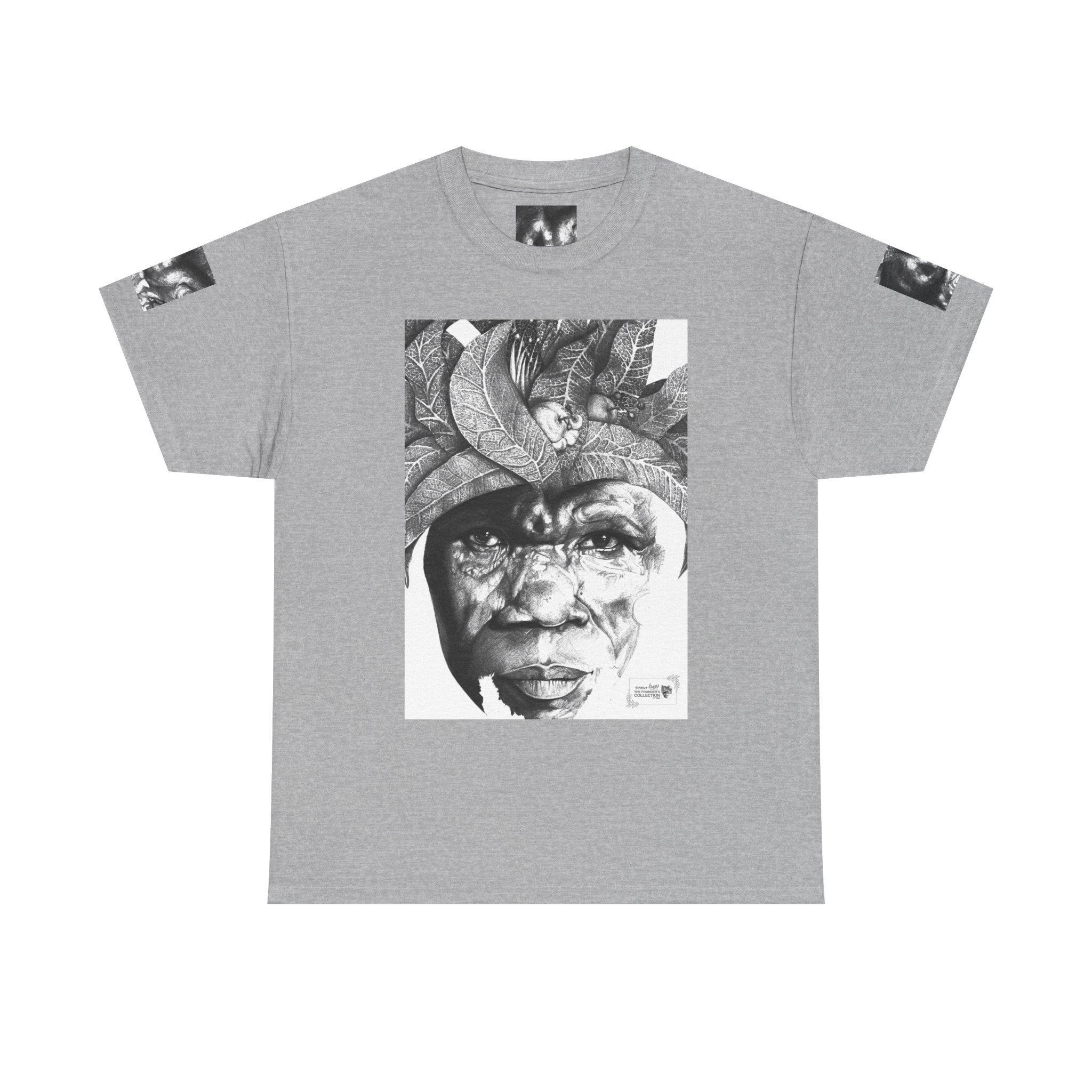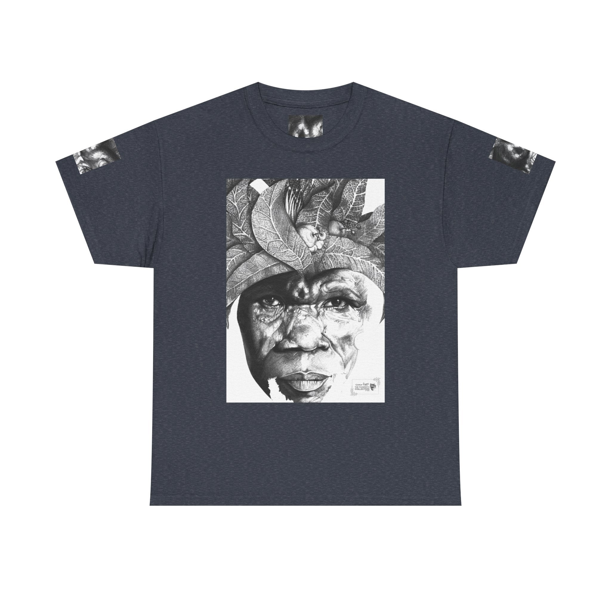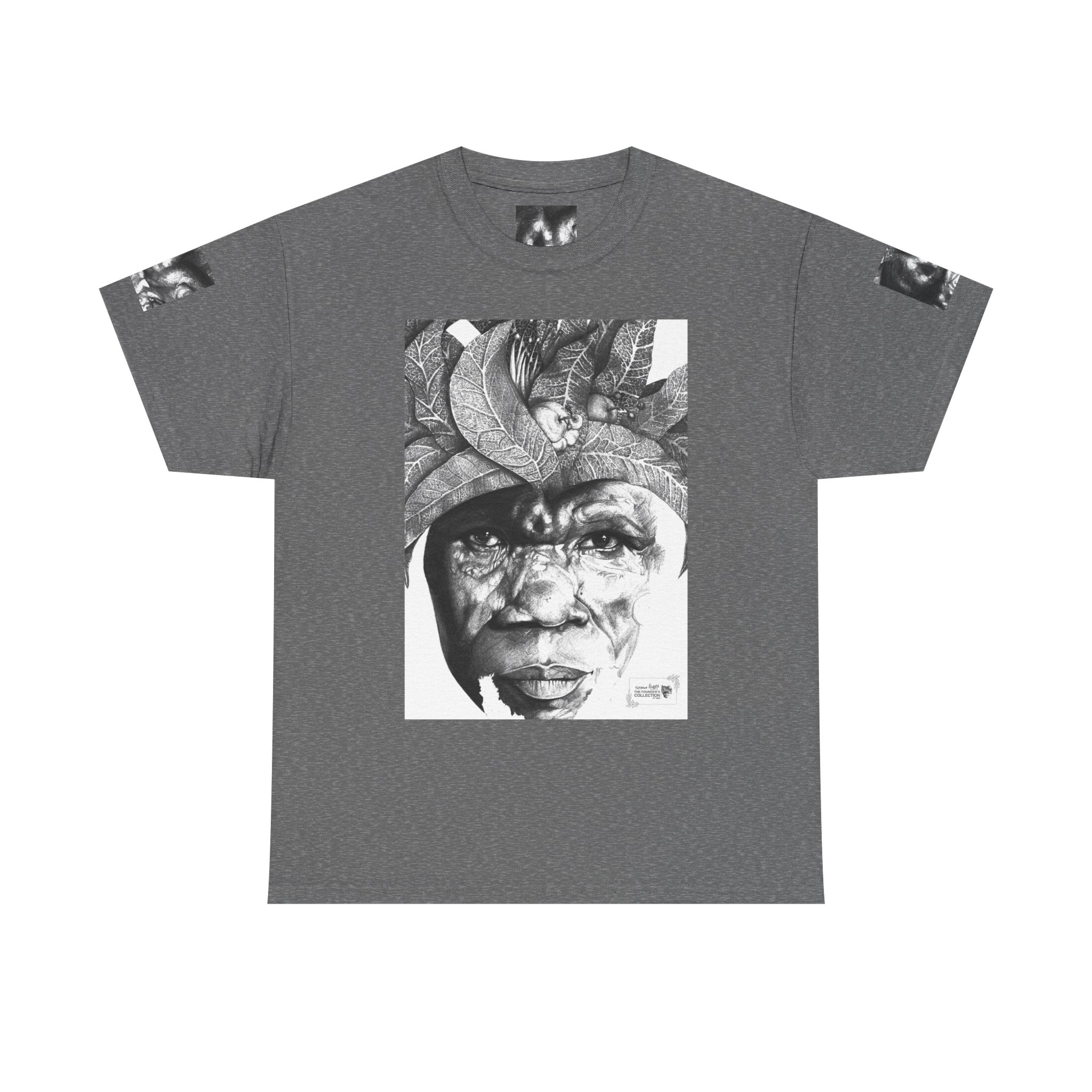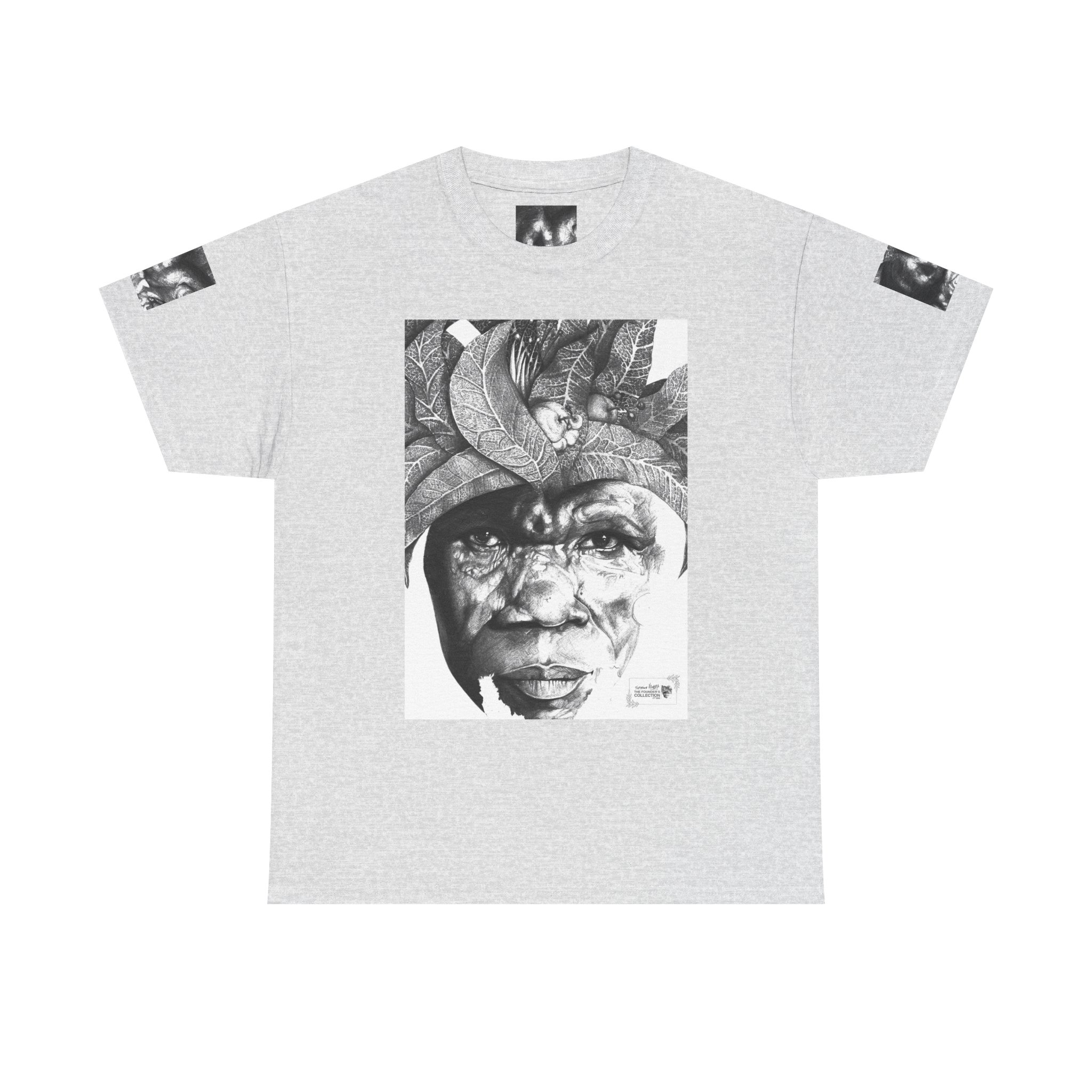 This heavyweight cotton tee wears like a living canvas for The Sunman – Guardian of the Orchard Mind. The central black-and-white portrait blends a dignified human presence with layered botanical elements, creating a visual tension that feels both grounded and stirring. It sits comfortably between streetwear and contemplative art — a piece that communicates depth without excess.