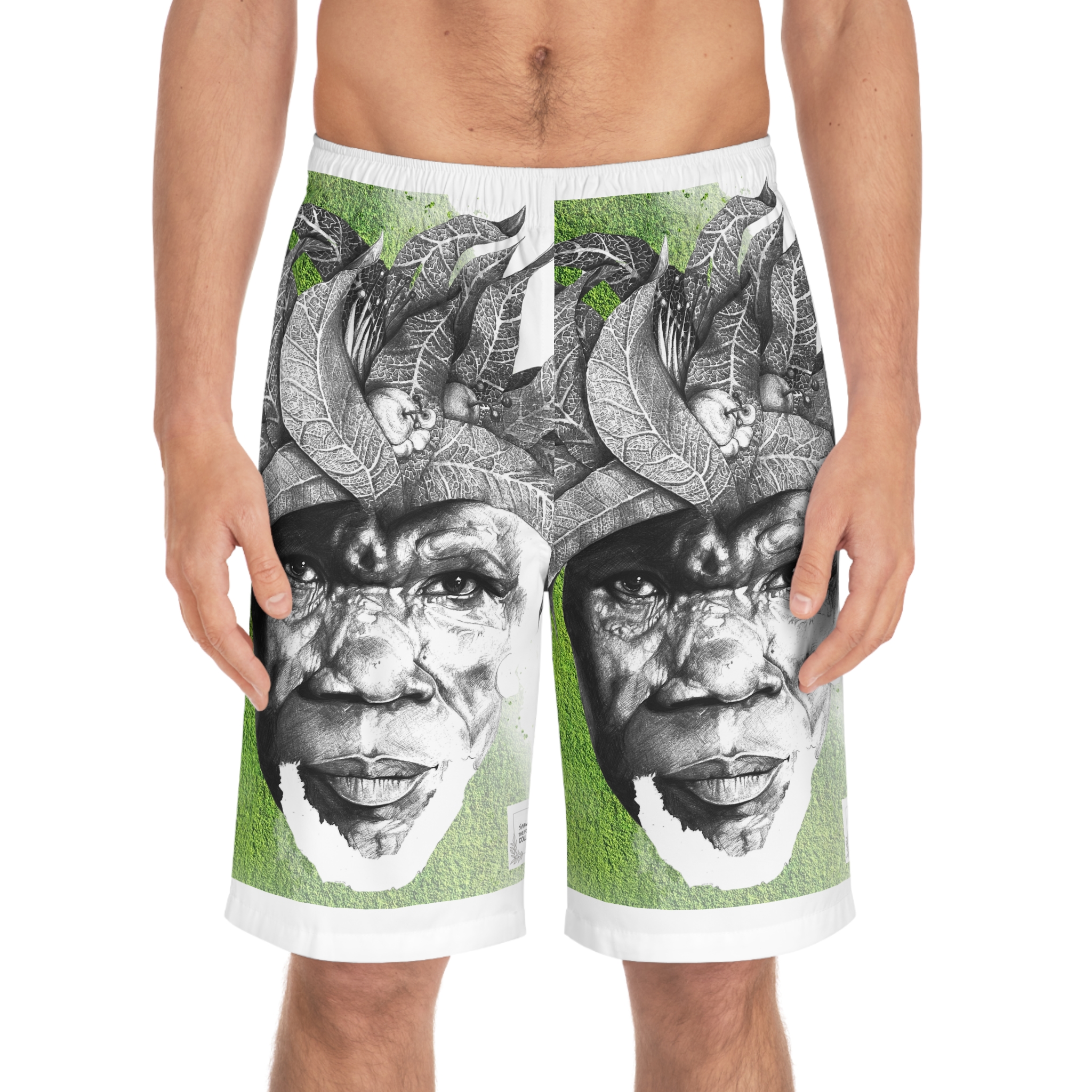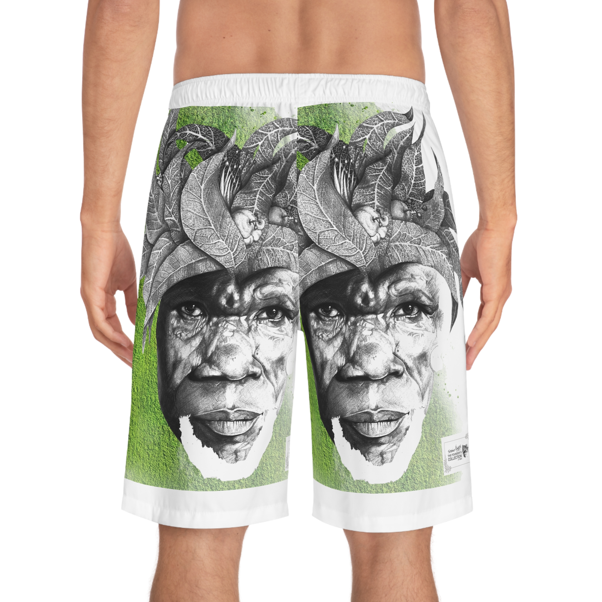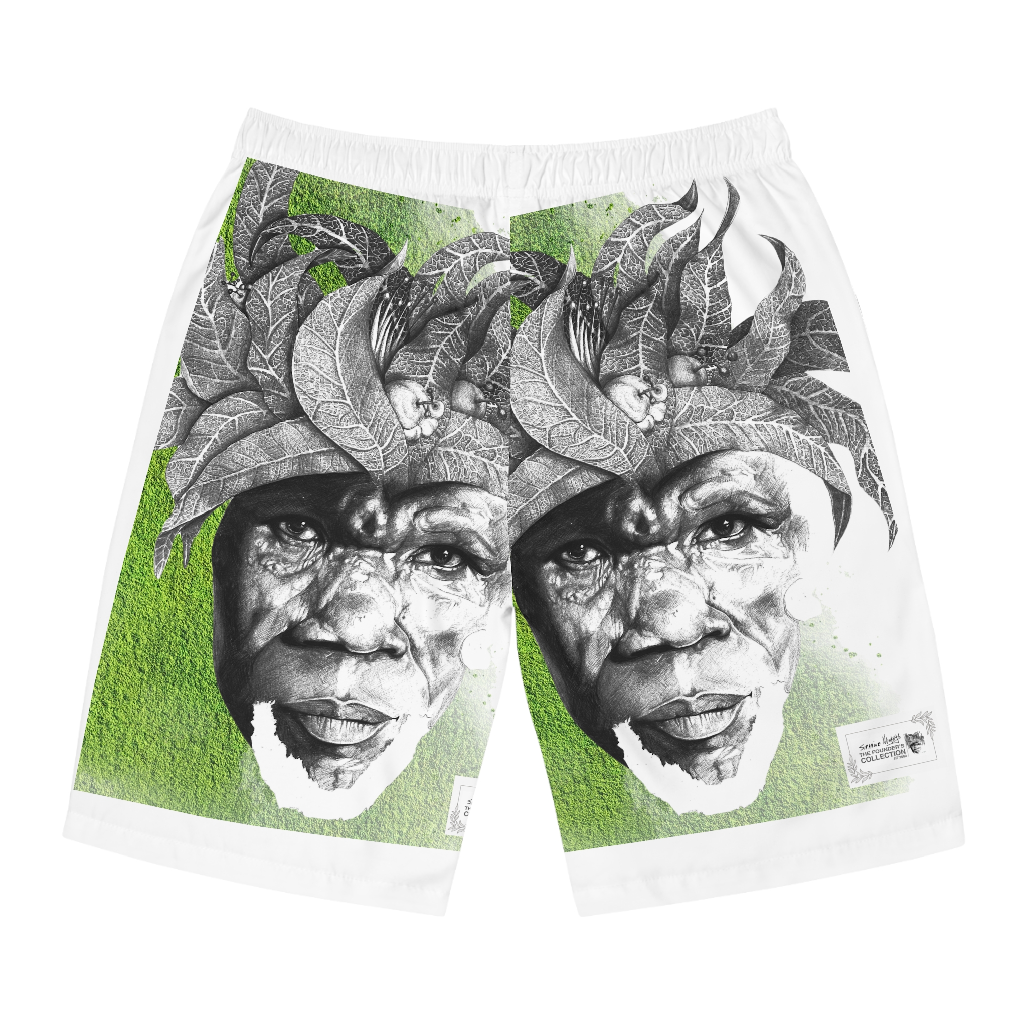 Move with quiet confidence and artful presence in “Shoreline Reverie” by Siphiwe Ngwenya. These board shorts embody the “Artworks that Work” philosophy—art that uplifts communities, celebrates African creativity, and transforms functional wear into storytelling. The black-and-white illustrated portrait, framed by leaf-like motifs and set against a vibrant grass-green background, evokes ancestral roots while adding a fresh, contemporary energy, perfectly reflecting the visionary spirit of the Townships Into Towns exhibition.
