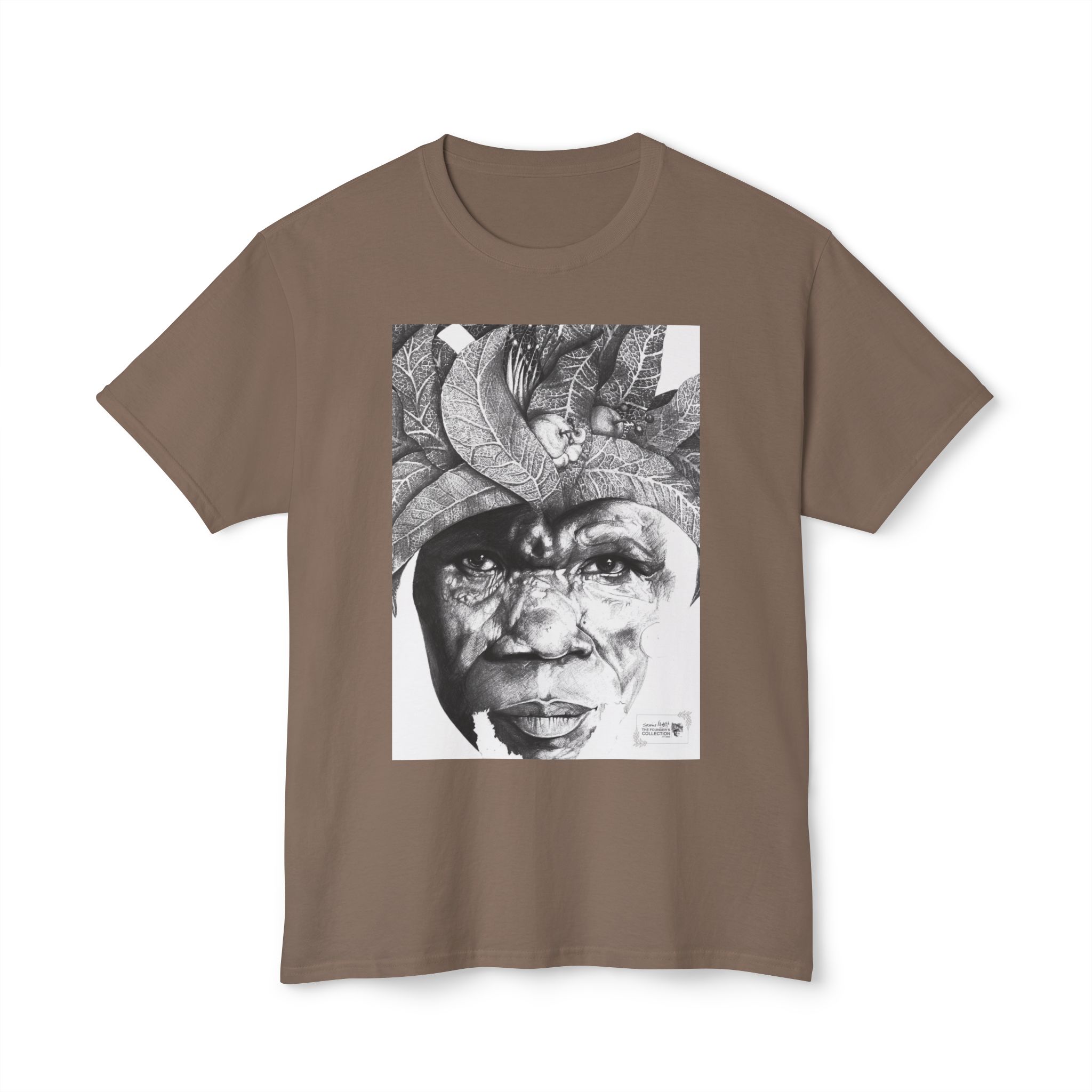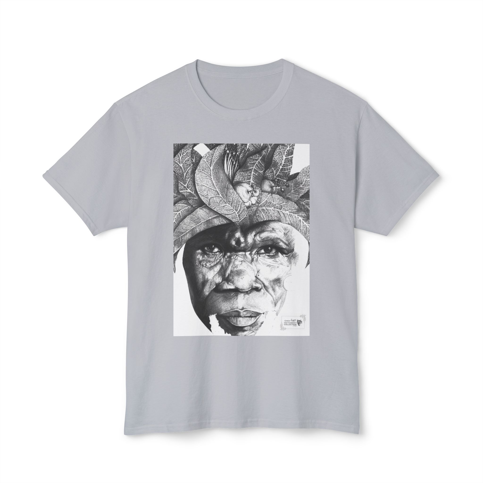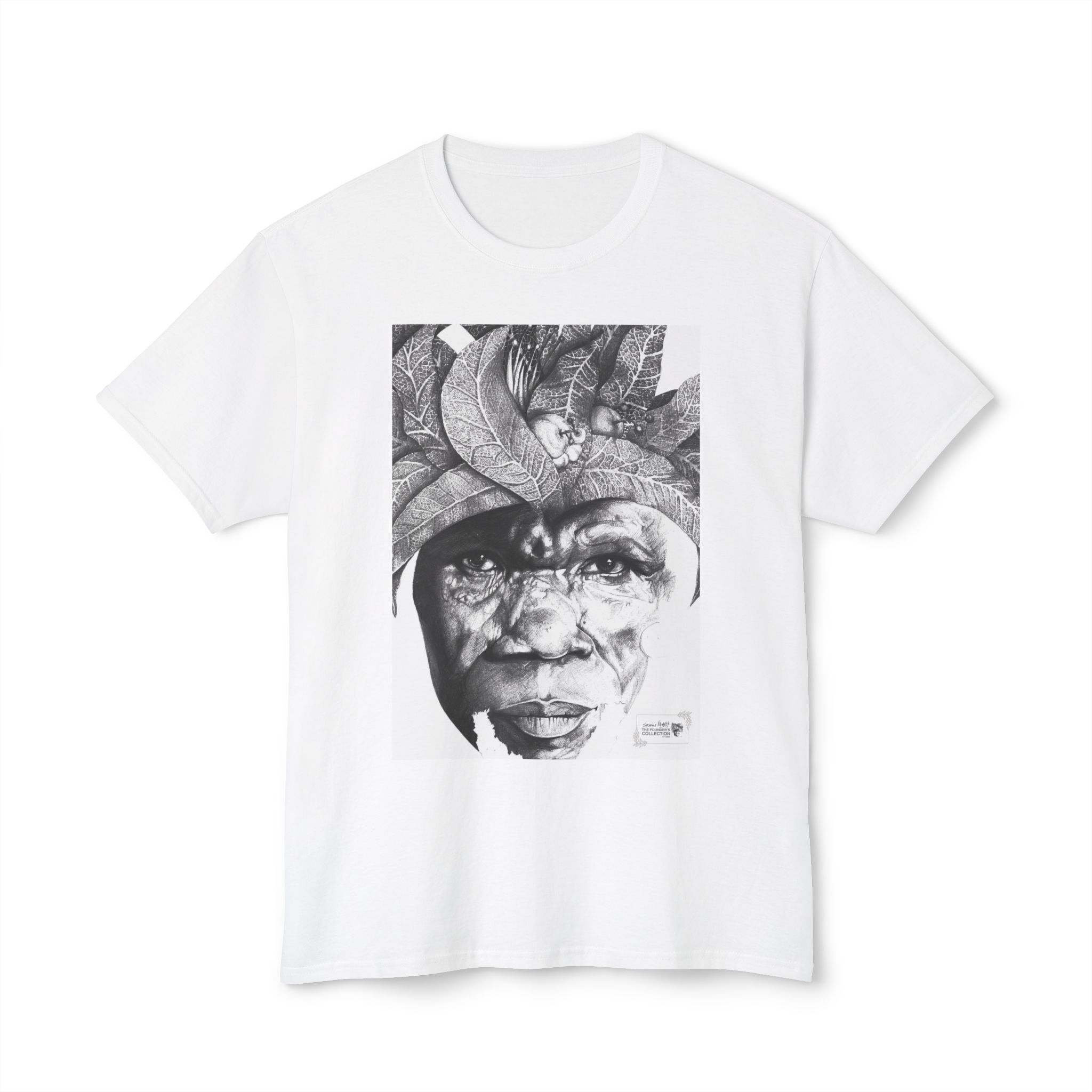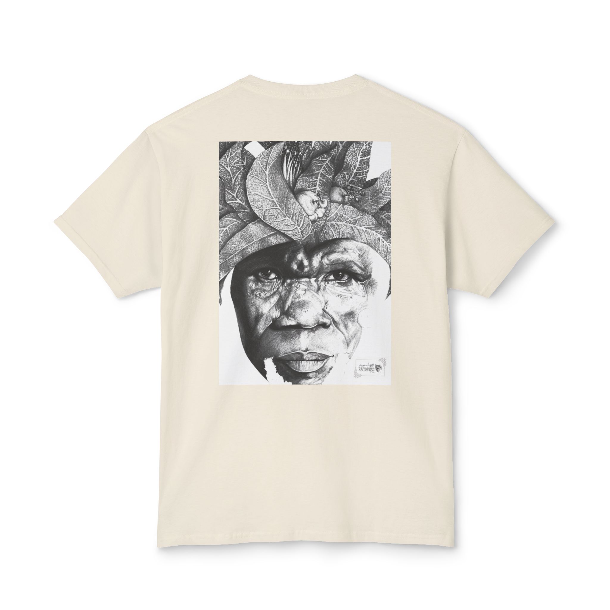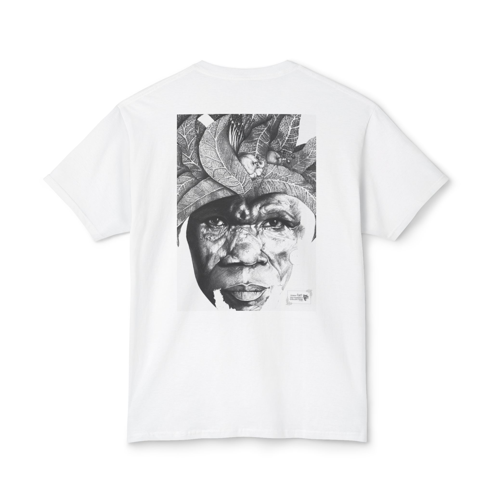 This cotton tee carries a quiet, soulful presence, featuring The Sunman – Guardian of the Orchard Mind as a finely detailed monochrome portrait centered on the chest. Layered with botanical textures and inked shadows, the image reads like a conversation between age and nature — steady eyes, weathered skin, and leaf-like forms that feel simultaneously rooted and free. The artwork invites close attention, revealing depth and intention through its subtle detailing and calm authority.
