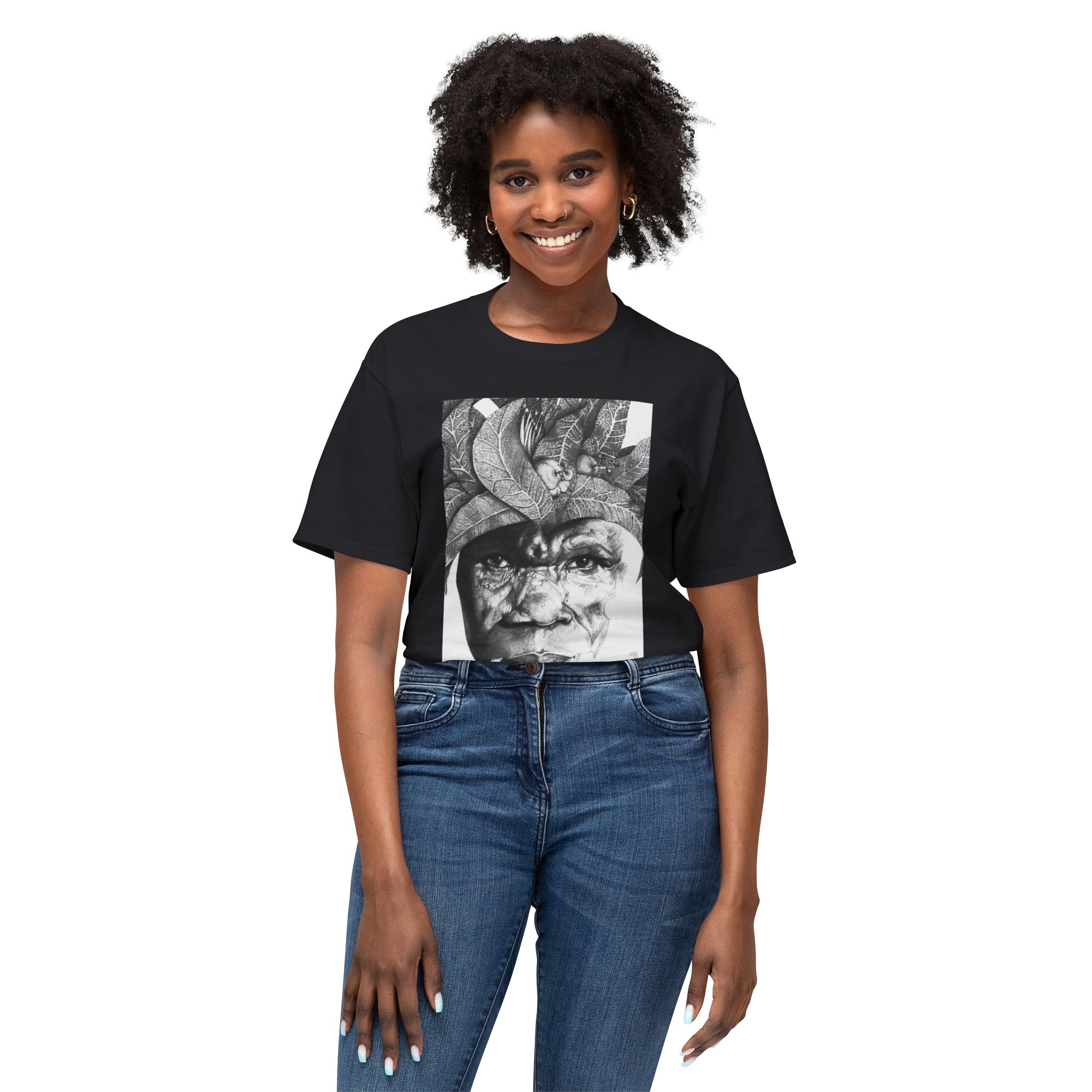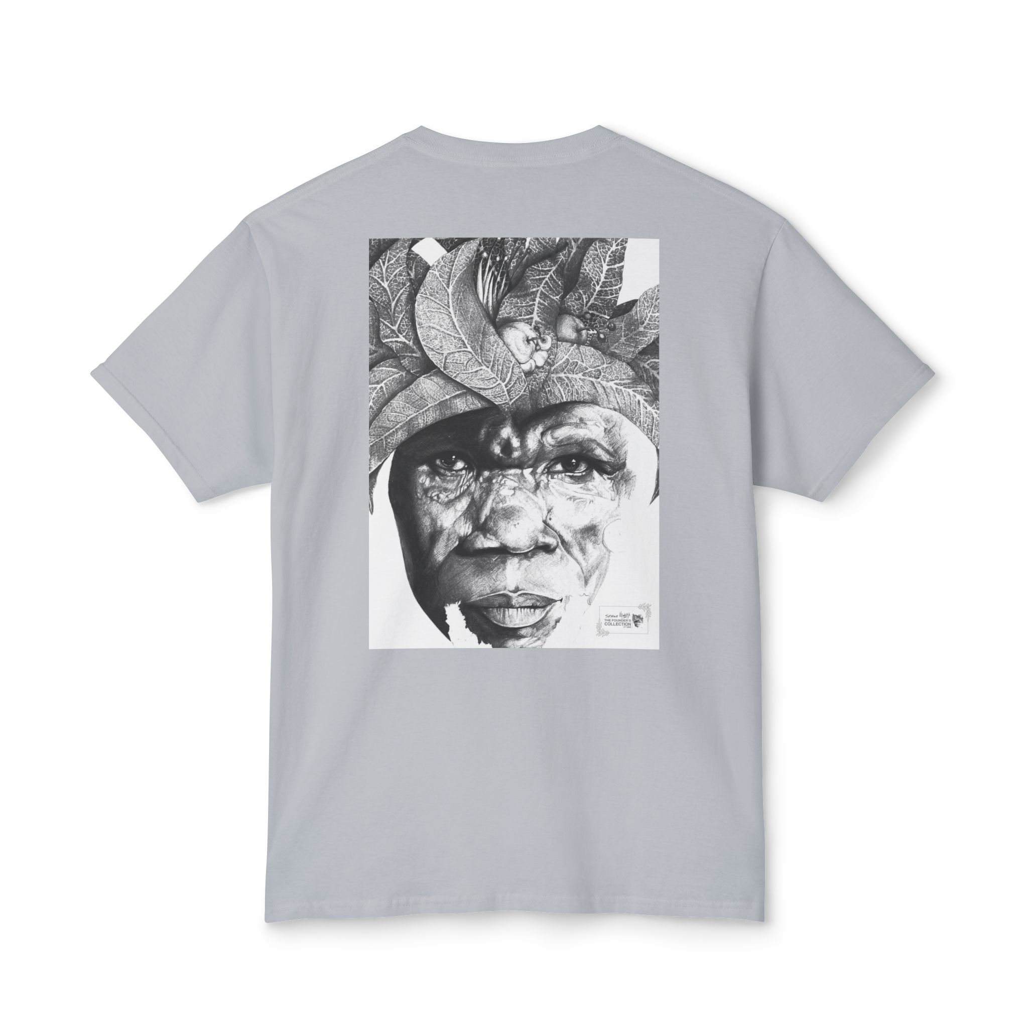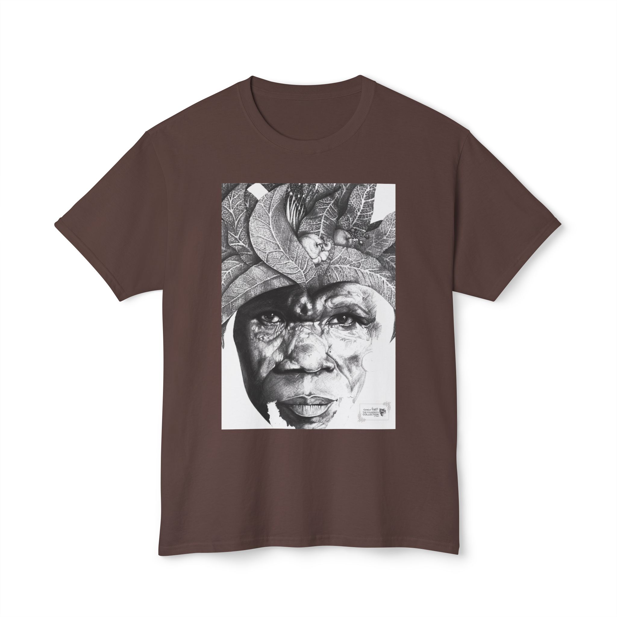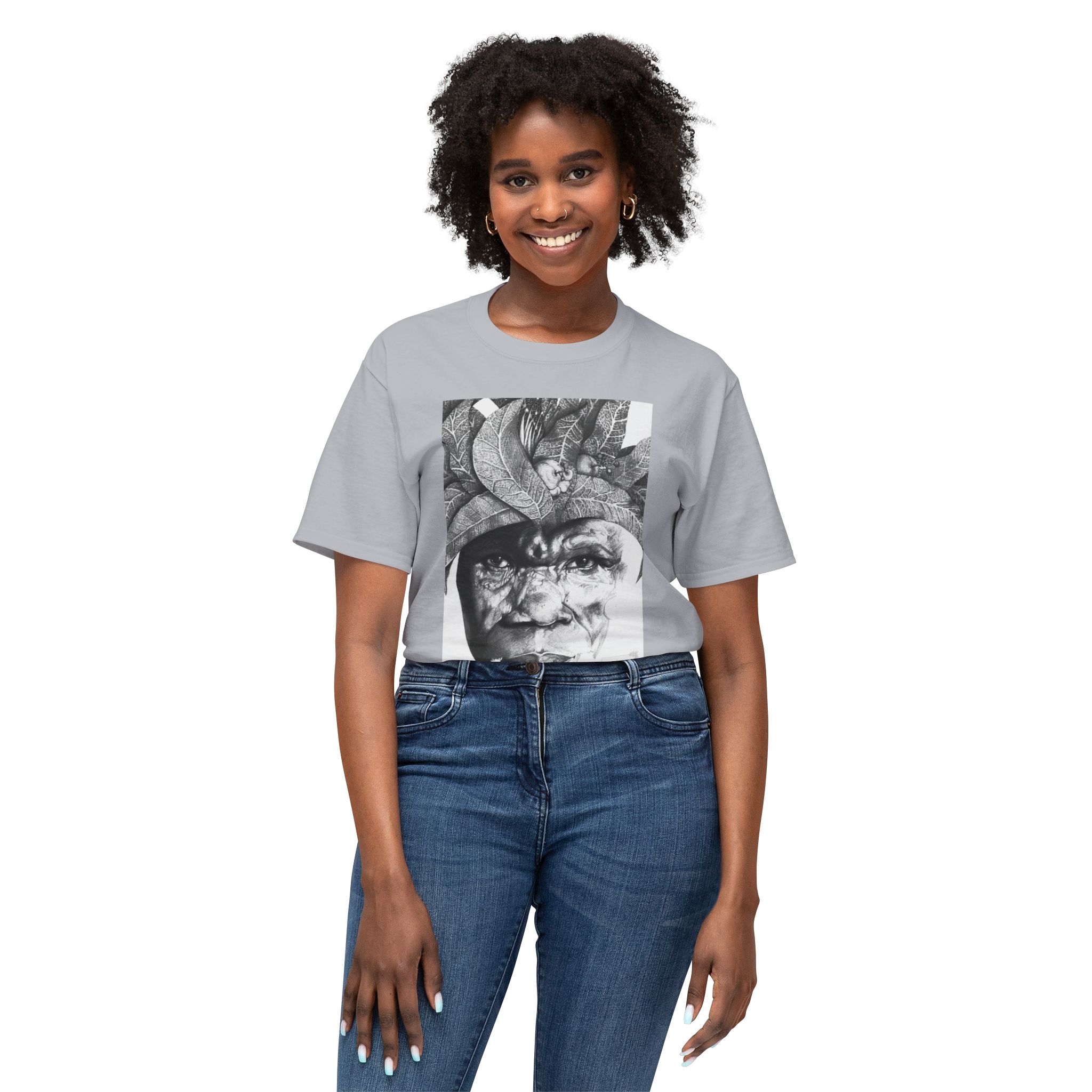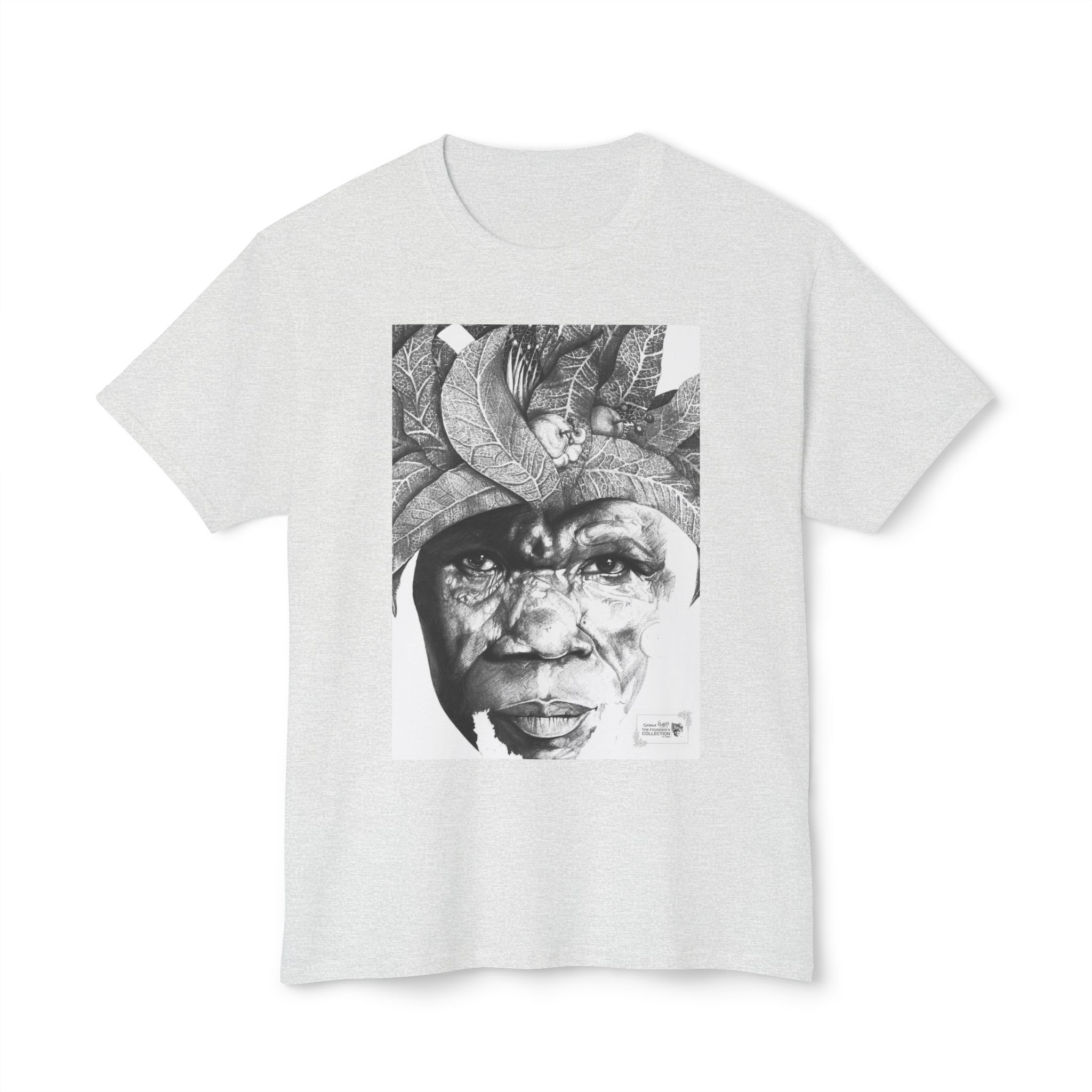 This cotton tee carries a quiet, soulful presence, featuring The Sunman – Guardian of the Orchard Mind as a finely detailed monochrome portrait centered on the chest. Layered with botanical textures and inked shadows, the image reads like a conversation between age and nature — steady eyes, weathered skin, and leaf-like forms that feel simultaneously rooted and free. The artwork invites close attention, revealing depth and intention through its subtle detailing and calm authority.