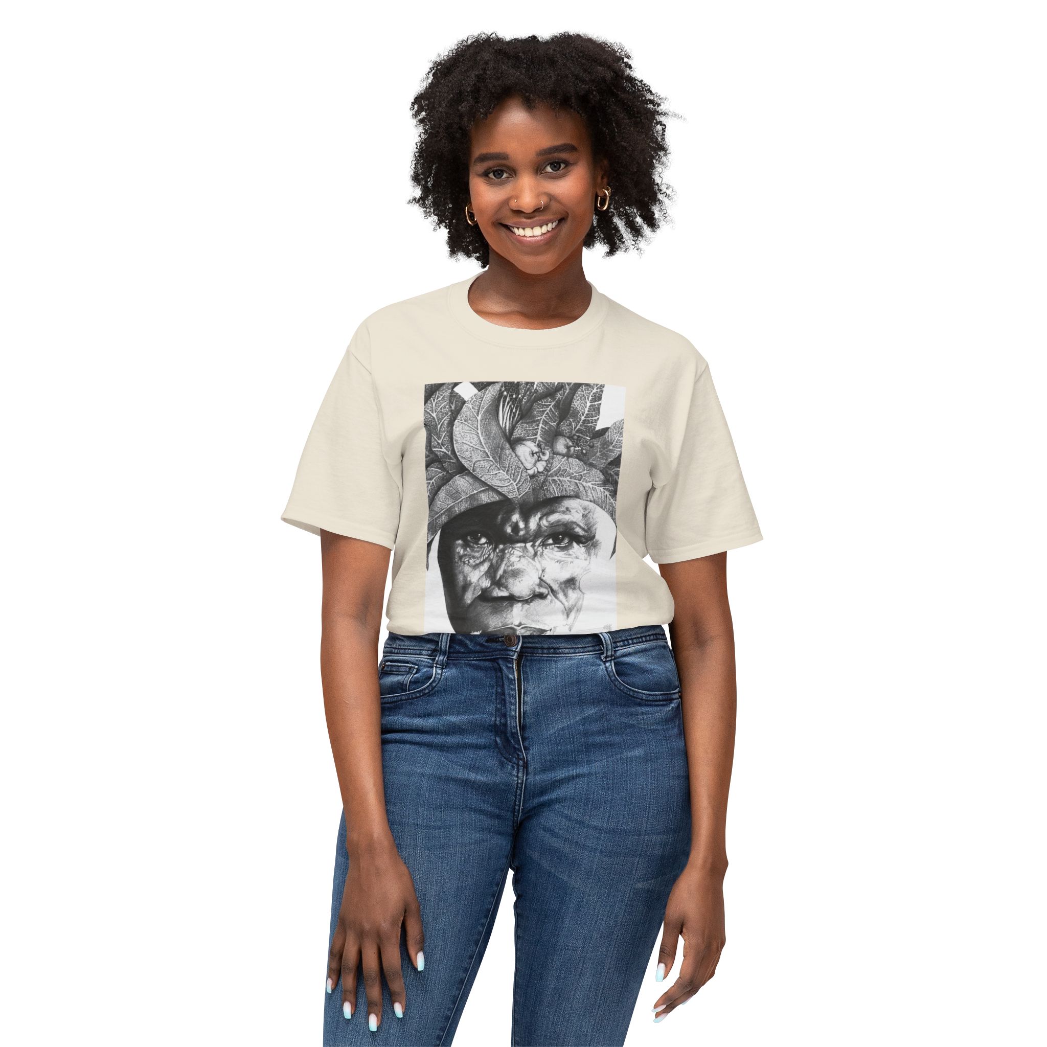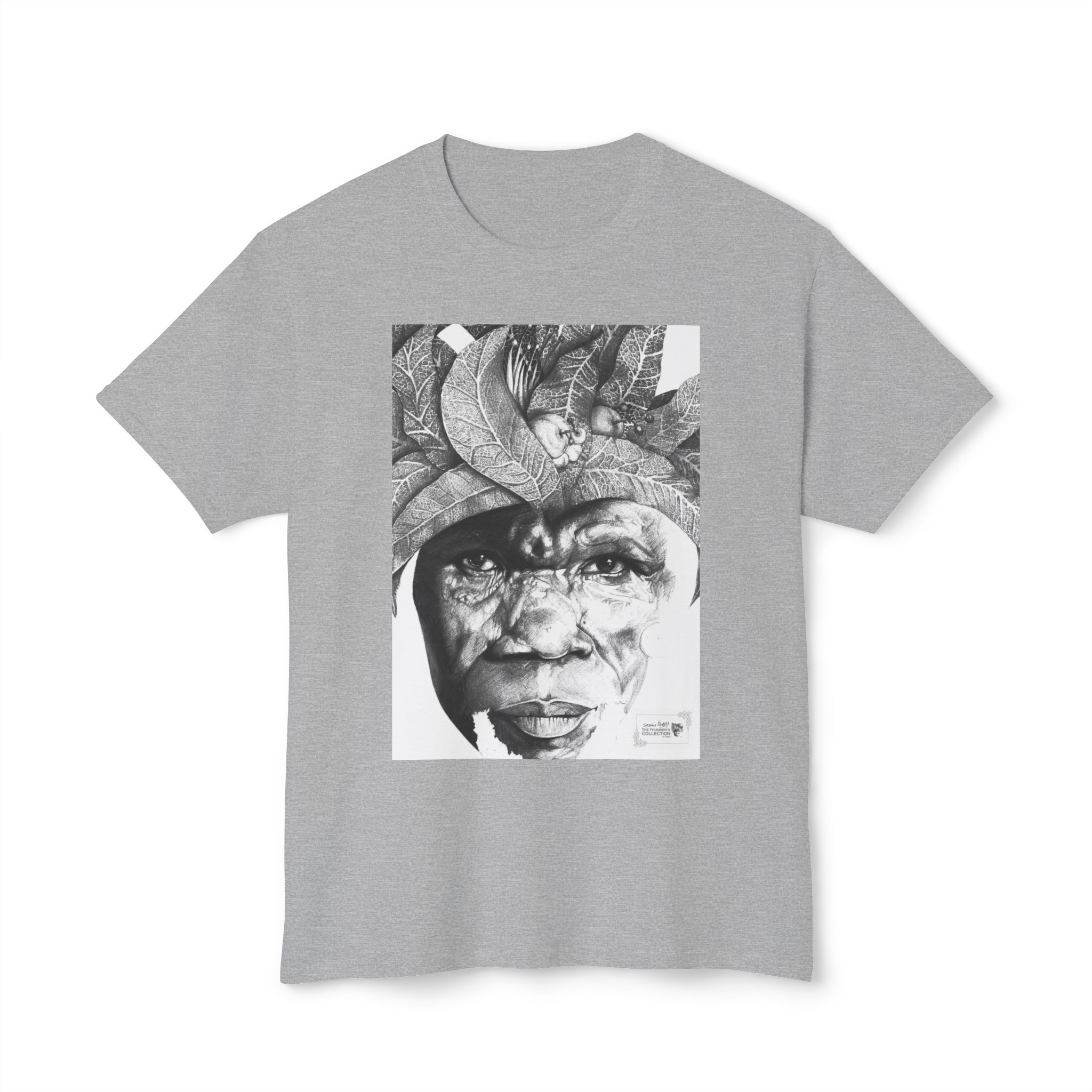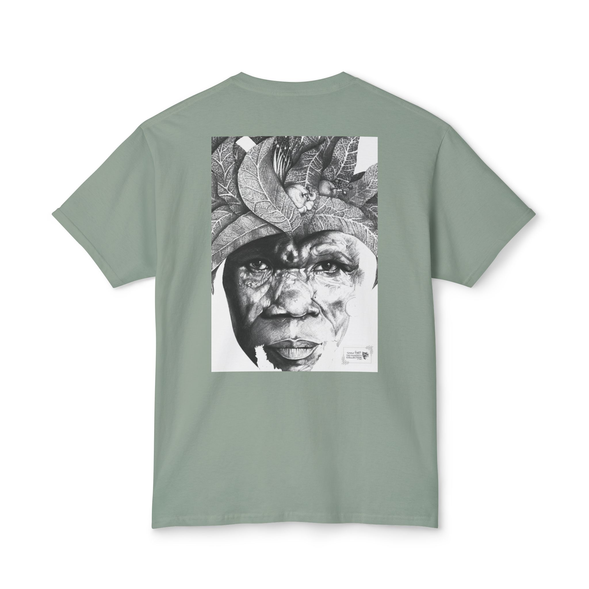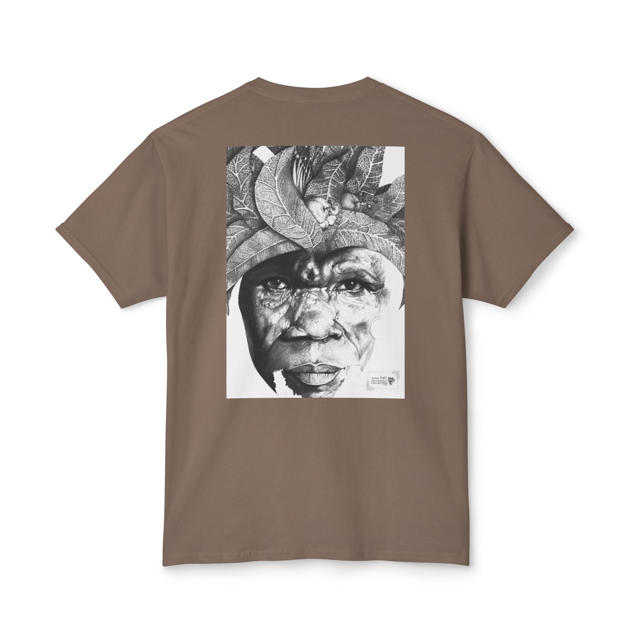 This cotton tee carries a quiet, soulful presence, featuring The Sunman – Guardian of the Orchard Mind as a finely detailed monochrome portrait centered on the chest. Layered with botanical textures and inked shadows, the image reads like a conversation between age and nature — steady eyes, weathered skin, and leaf-like forms that feel simultaneously rooted and free. The artwork invites close attention, revealing depth and intention through its subtle detailing and calm authority.