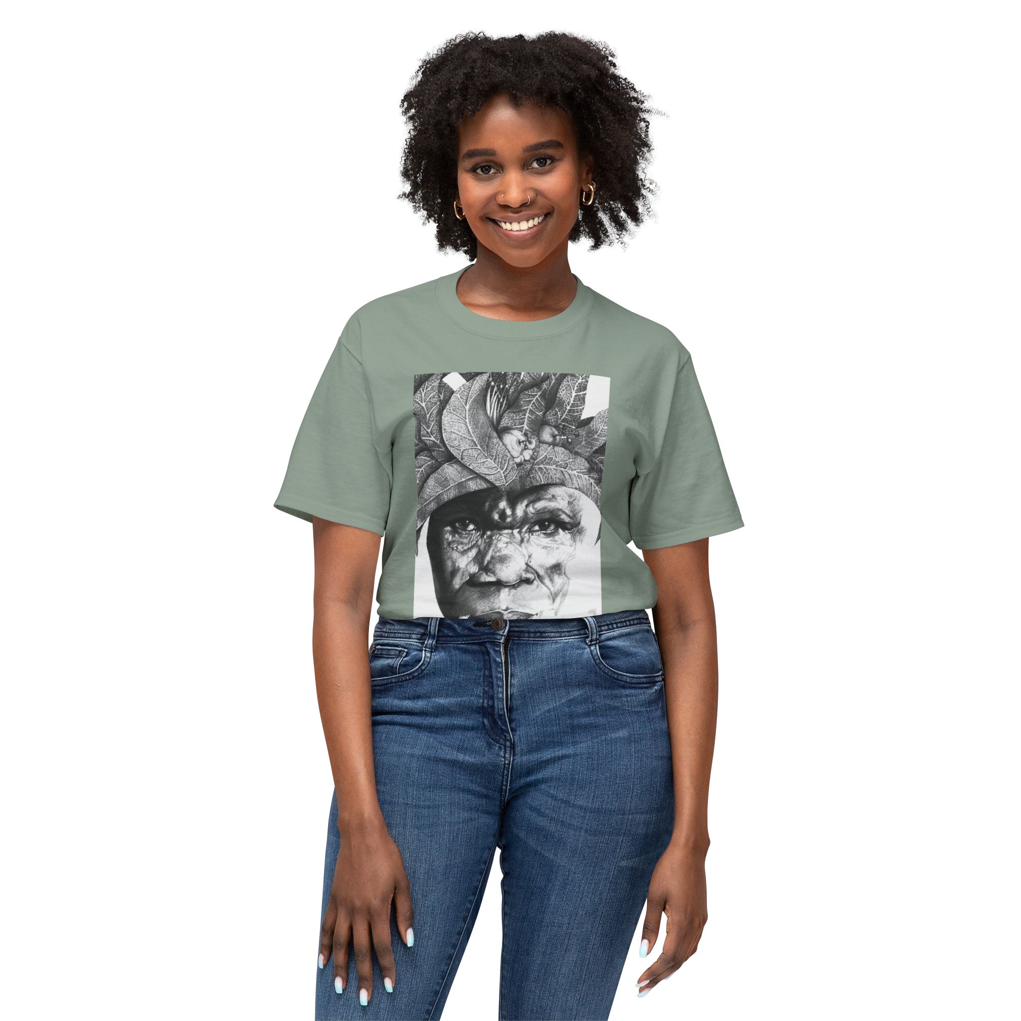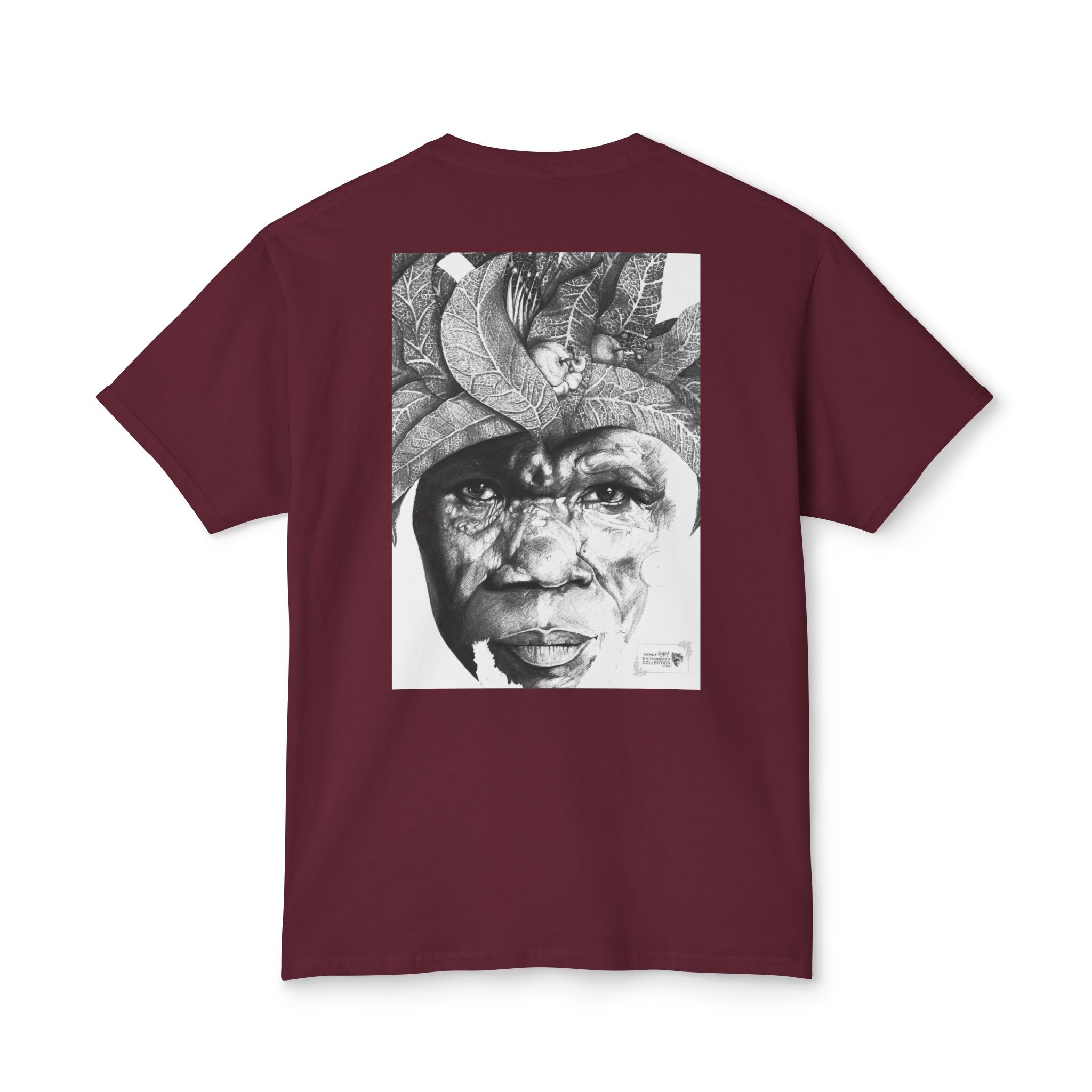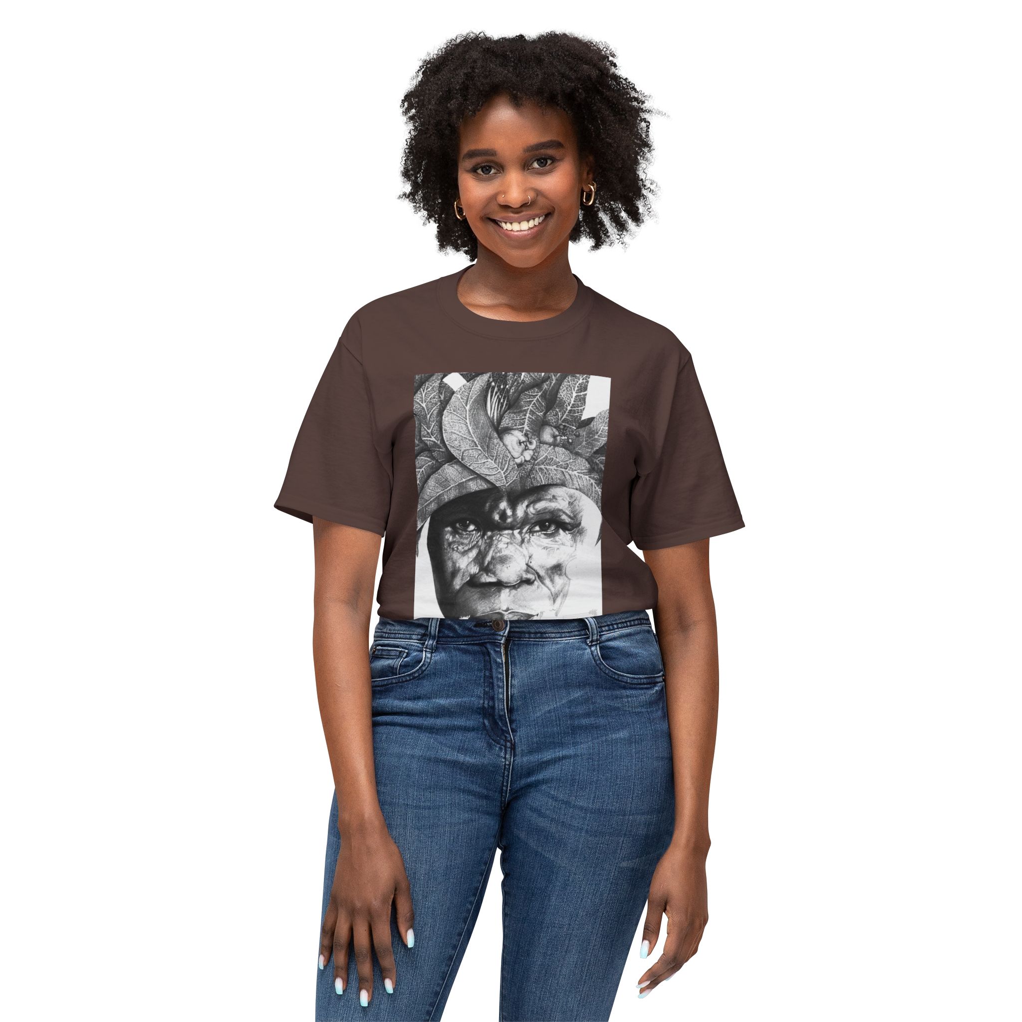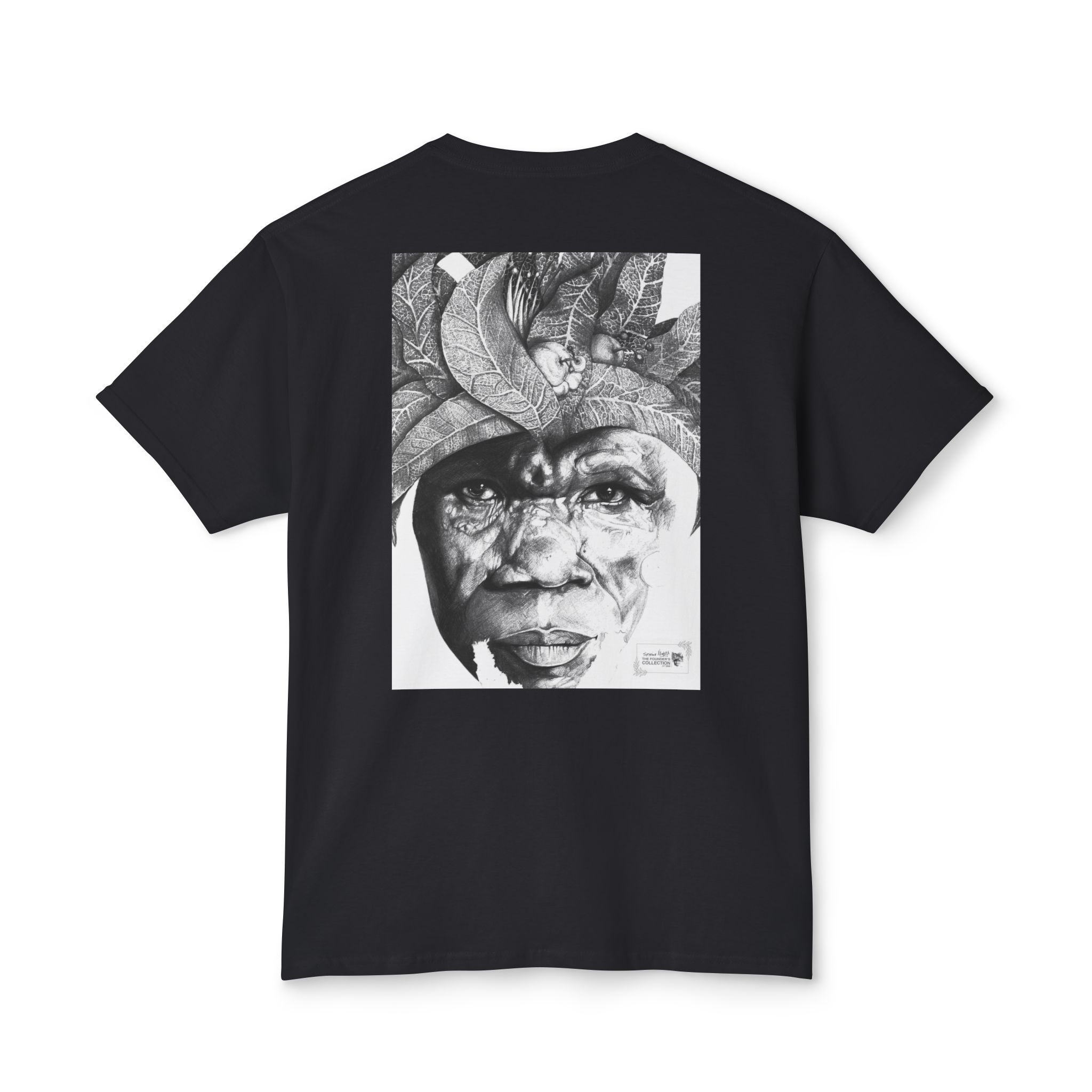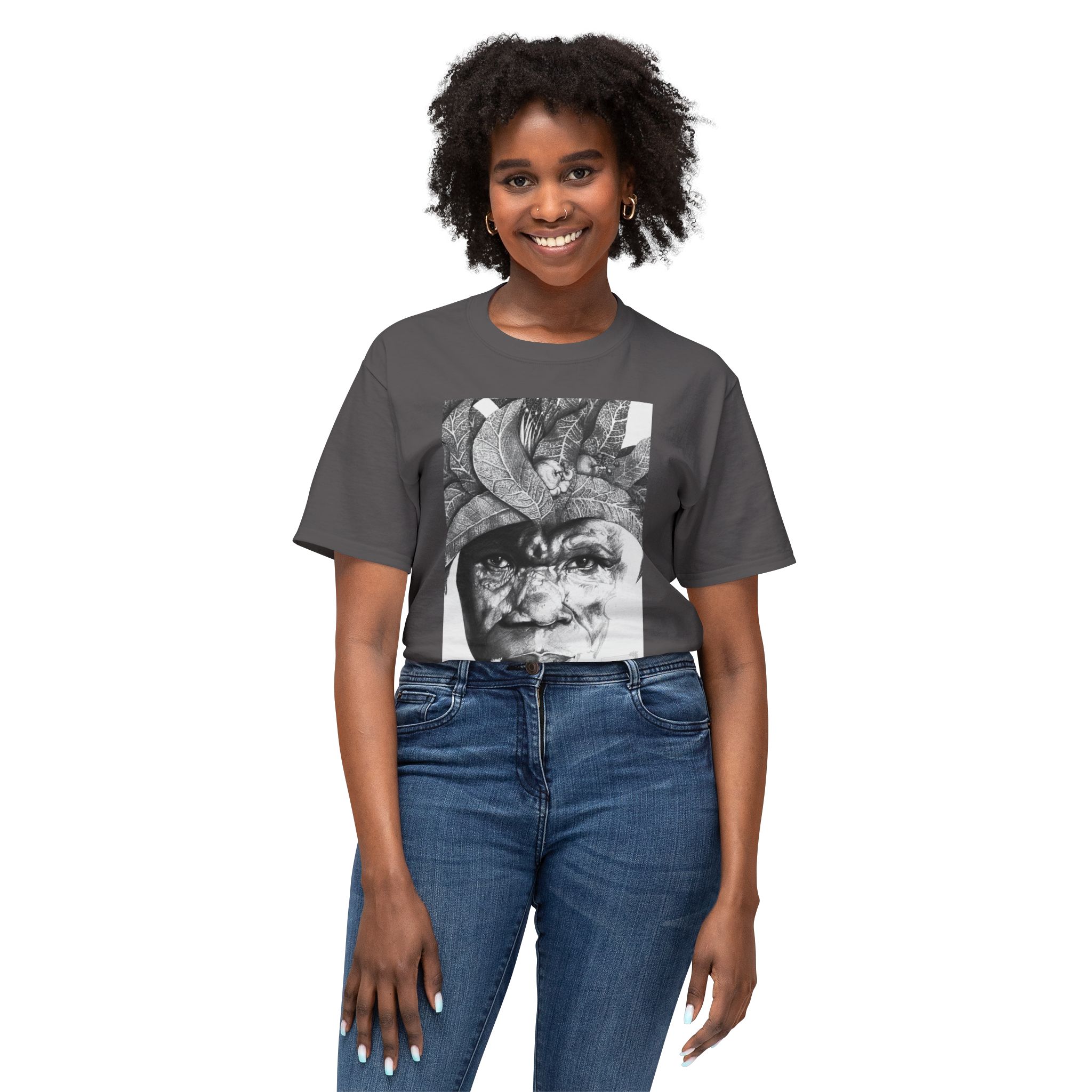 This cotton tee carries a quiet, soulful presence, featuring The Sunman – Guardian of the Orchard Mind as a finely detailed monochrome portrait centered on the chest. Layered with botanical textures and inked shadows, the image reads like a conversation between age and nature — steady eyes, weathered skin, and leaf-like forms that feel simultaneously rooted and free. The artwork invites close attention, revealing depth and intention through its subtle detailing and calm authority.
