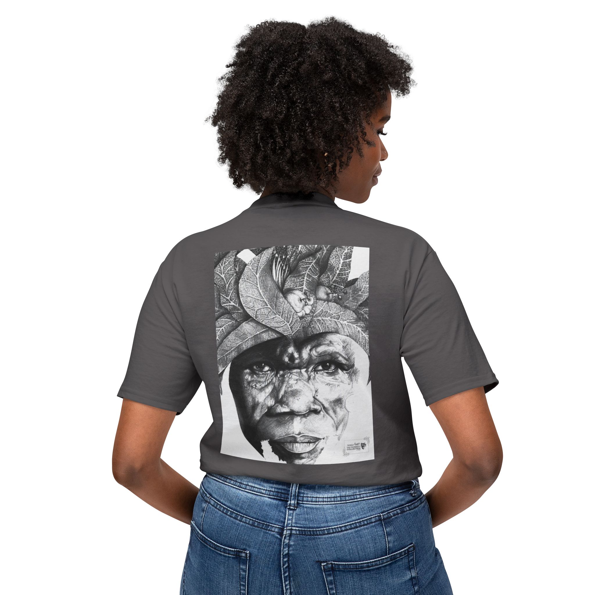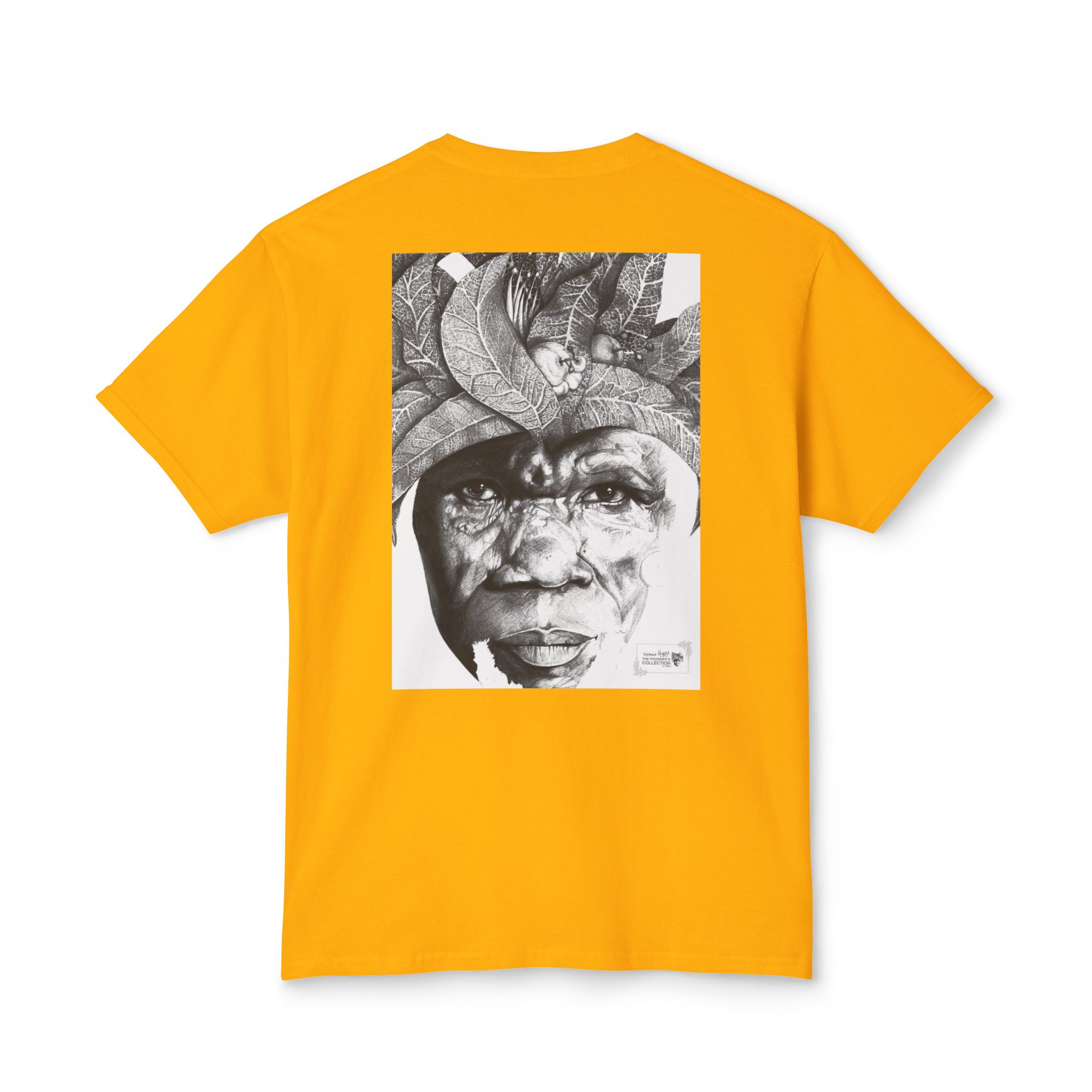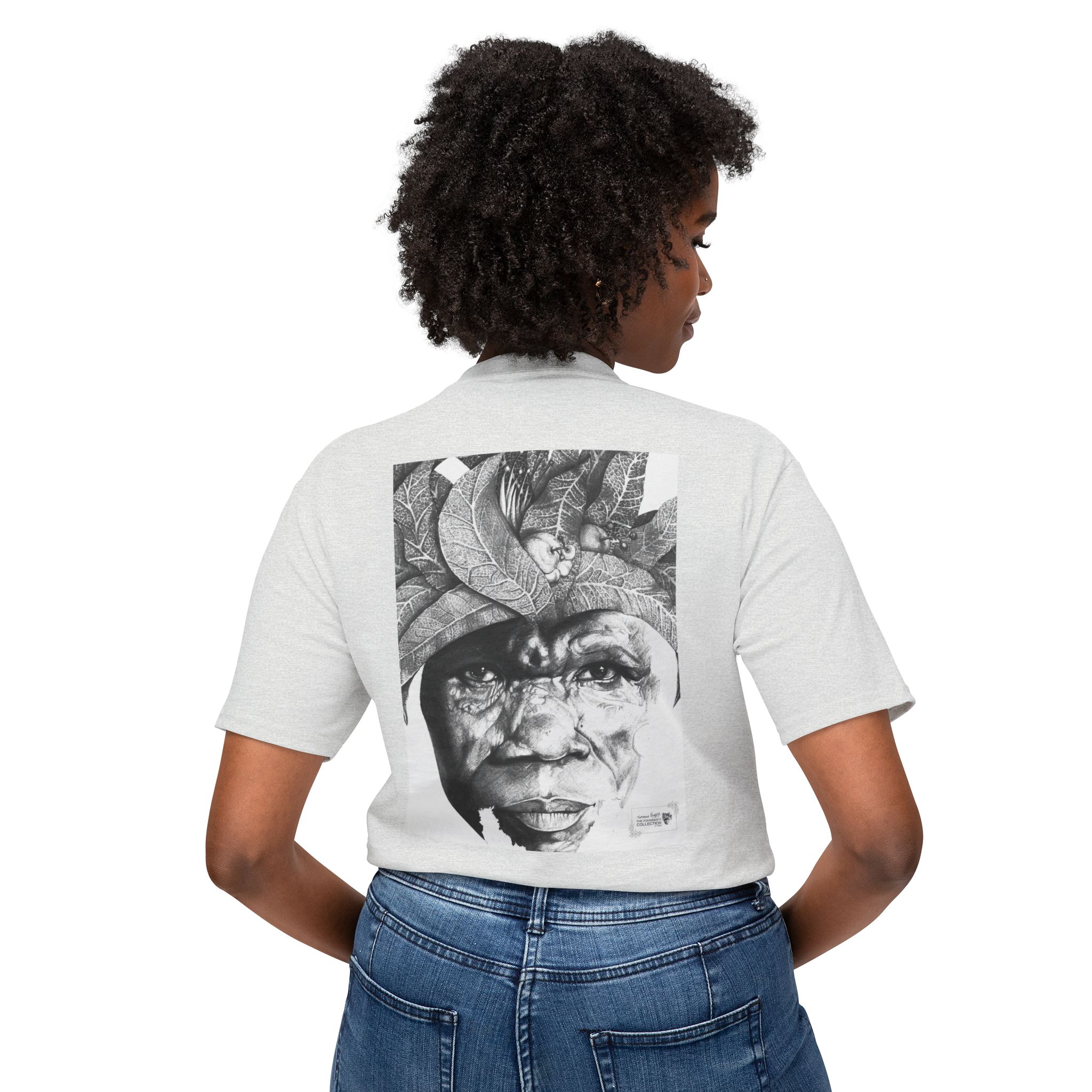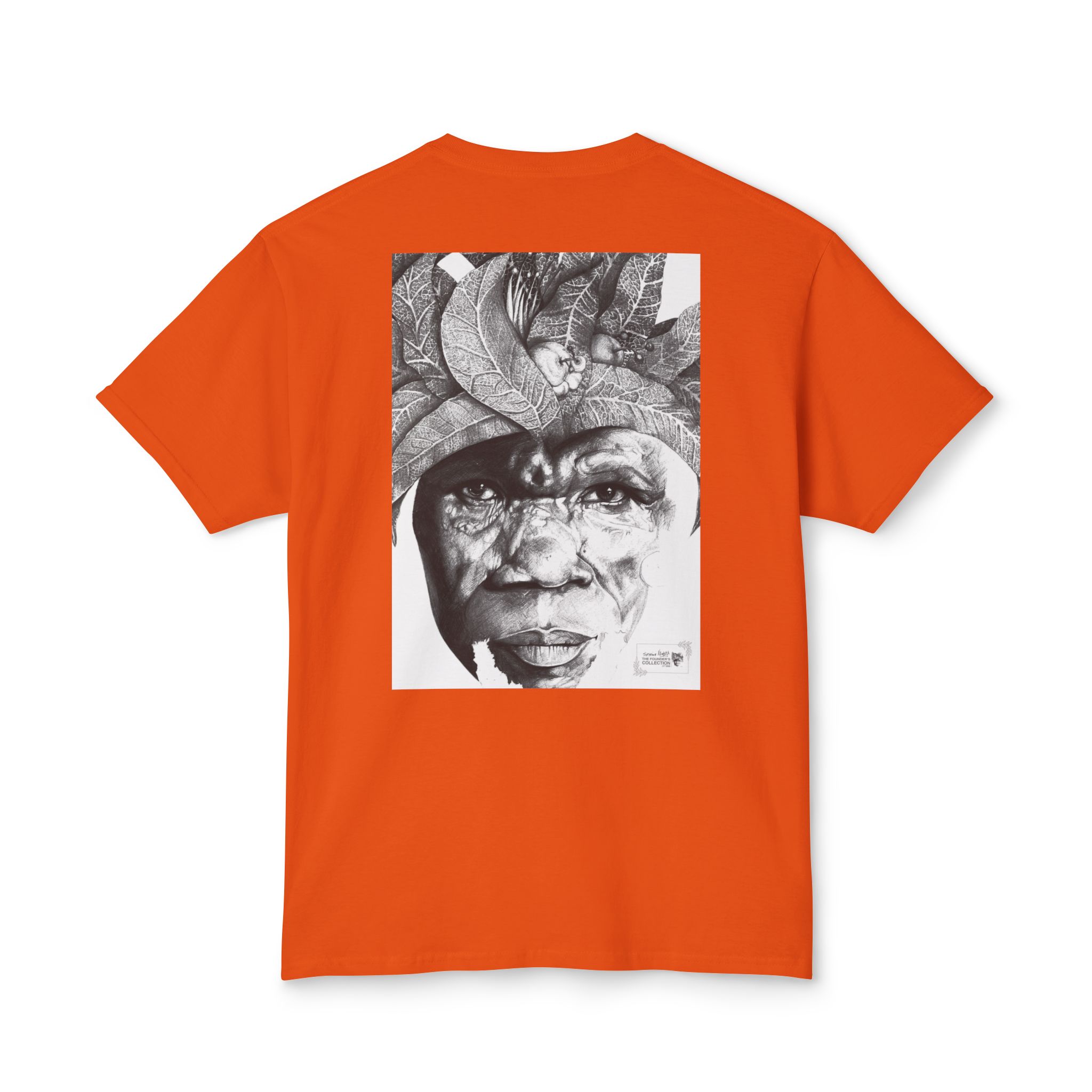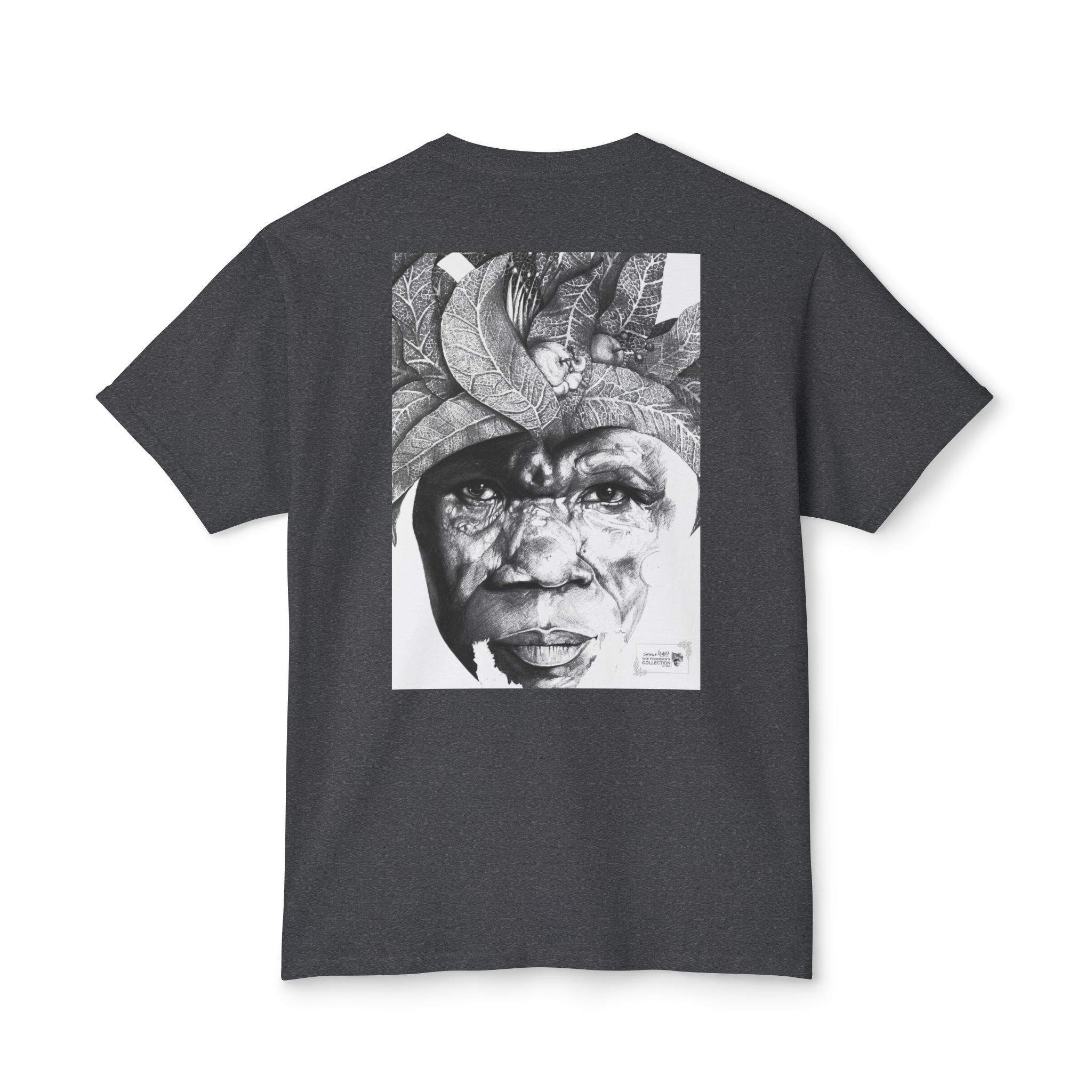 This cotton tee carries a quiet, soulful presence, featuring The Sunman – Guardian of the Orchard Mind as a finely detailed monochrome portrait centered on the chest. Layered with botanical textures and inked shadows, the image reads like a conversation between age and nature — steady eyes, weathered skin, and leaf-like forms that feel simultaneously rooted and free. The artwork invites close attention, revealing depth and intention through its subtle detailing and calm authority.