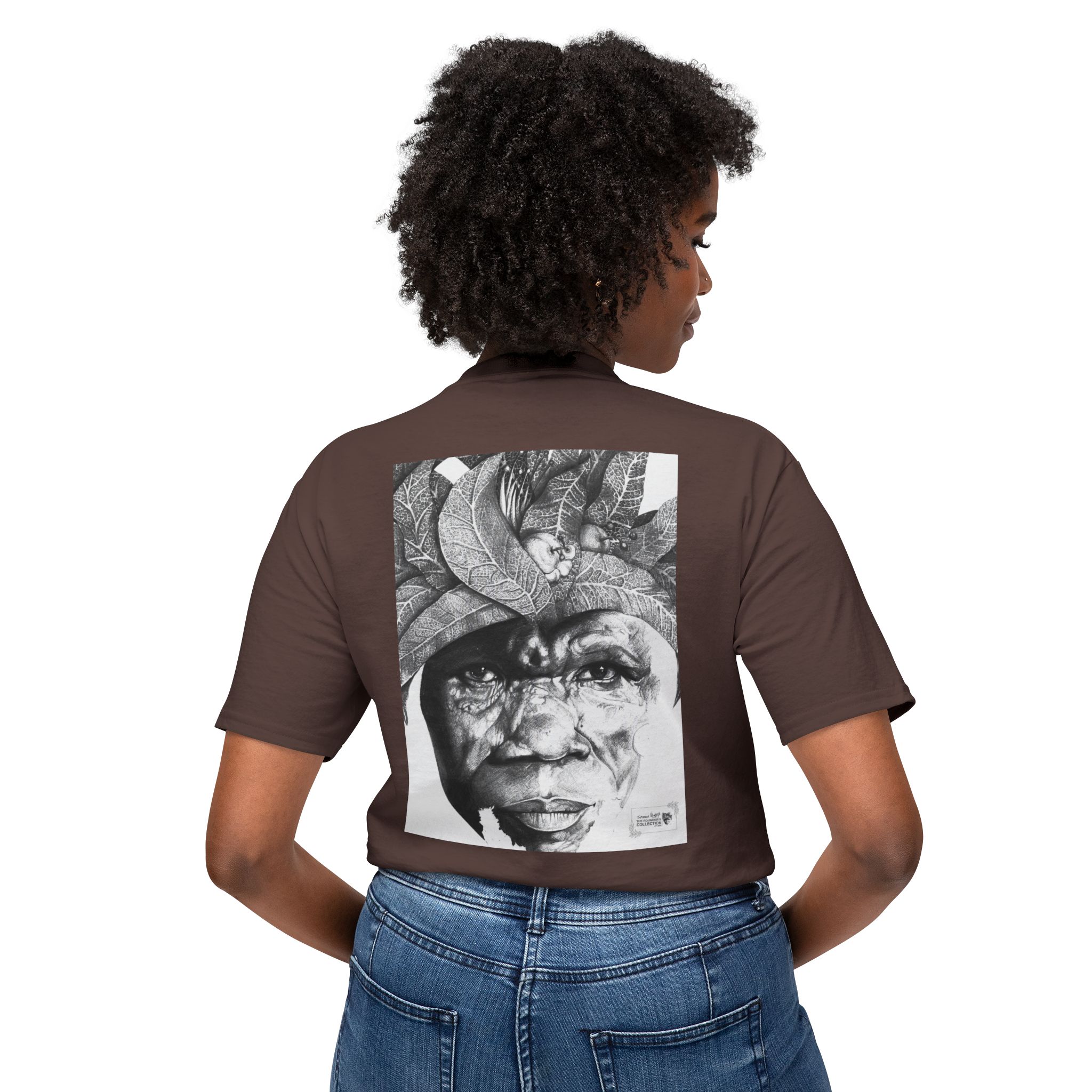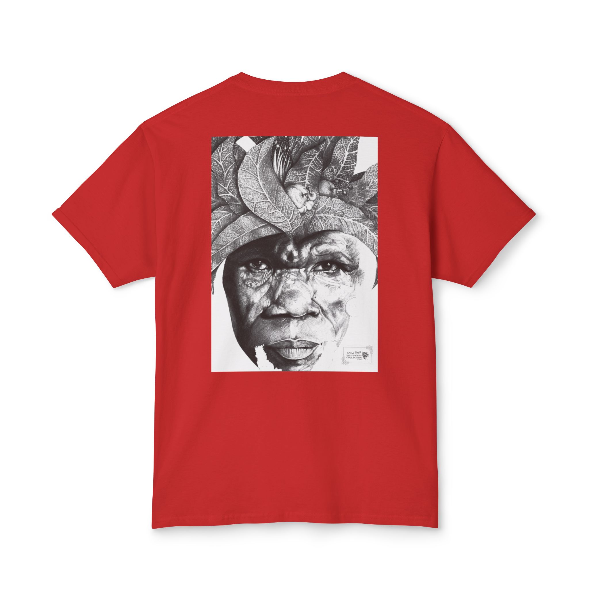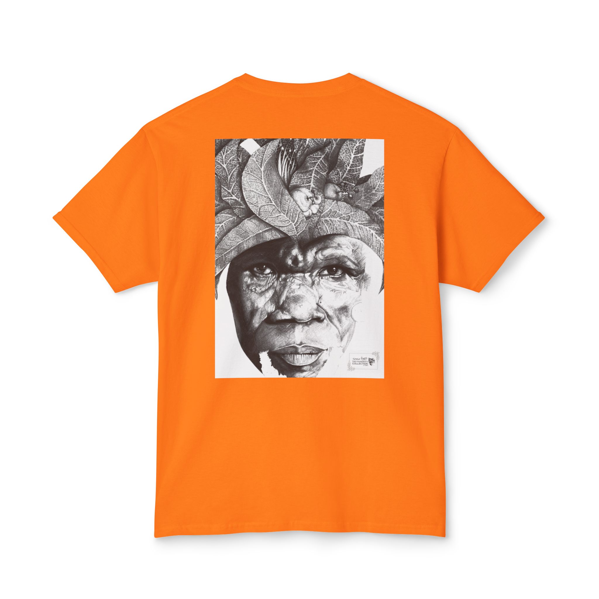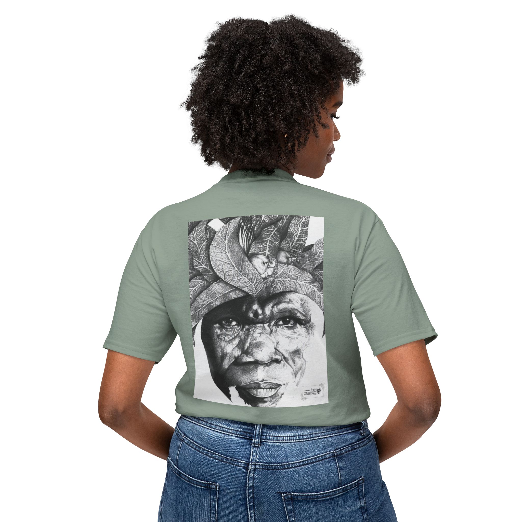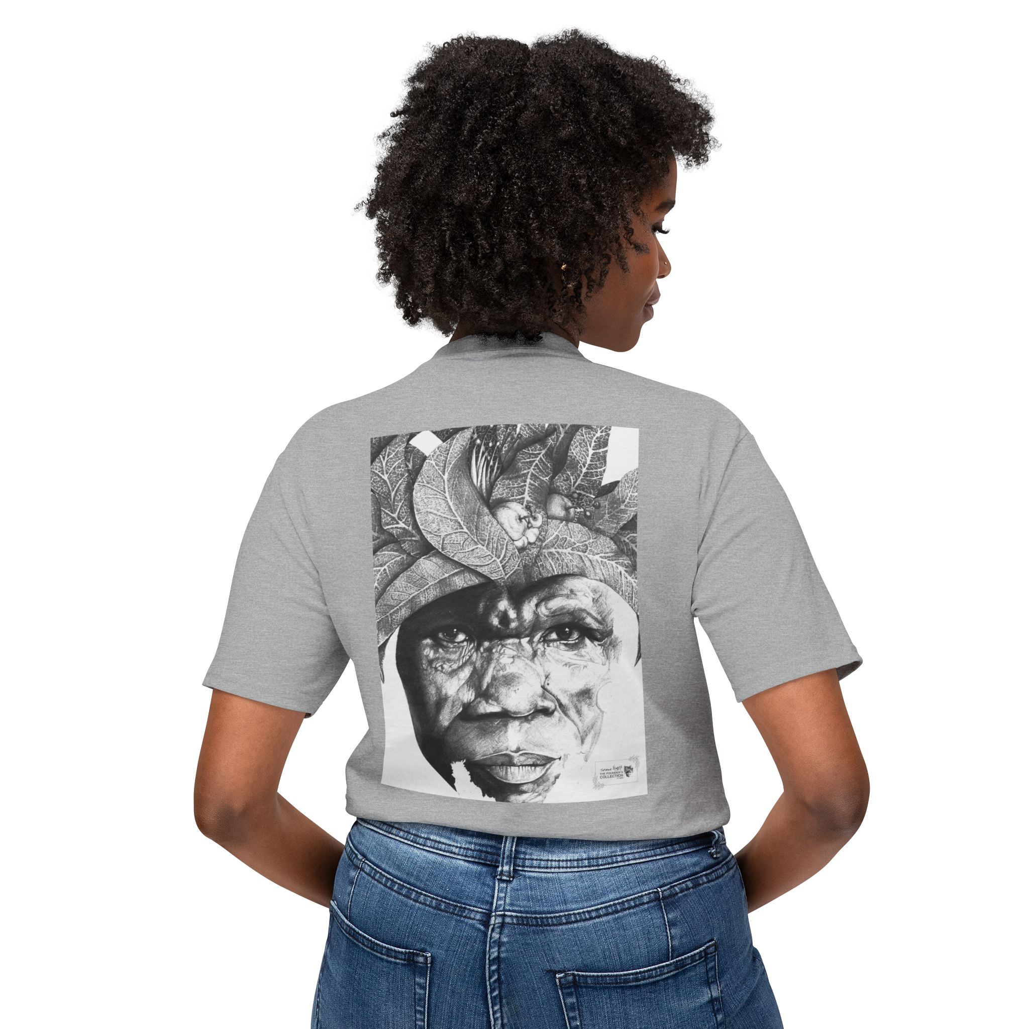 This cotton tee carries a quiet, soulful presence, featuring The Sunman – Guardian of the Orchard Mind as a finely detailed monochrome portrait centered on the chest. Layered with botanical textures and inked shadows, the image reads like a conversation between age and nature — steady eyes, weathered skin, and leaf-like forms that feel simultaneously rooted and free. The artwork invites close attention, revealing depth and intention through its subtle detailing and calm authority.