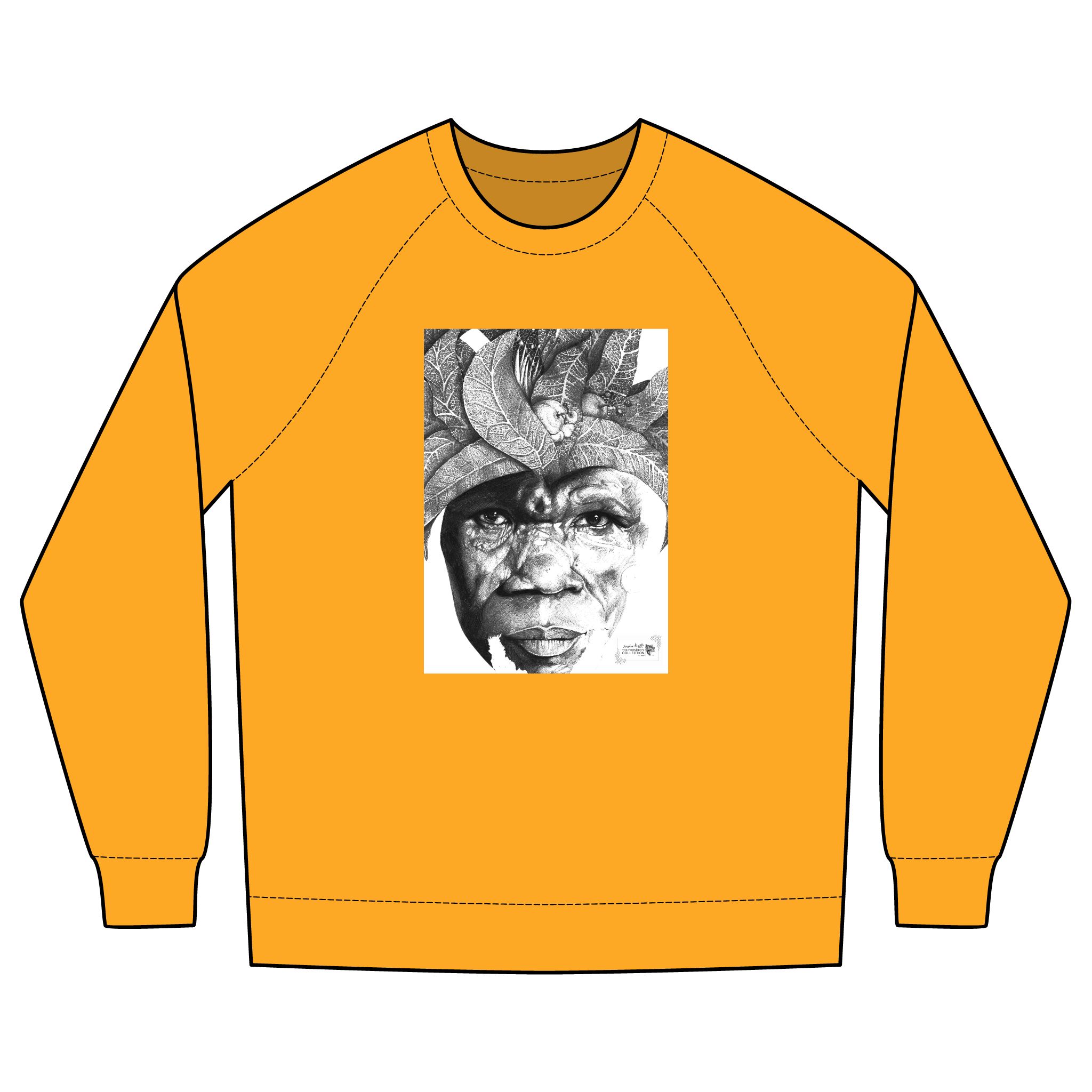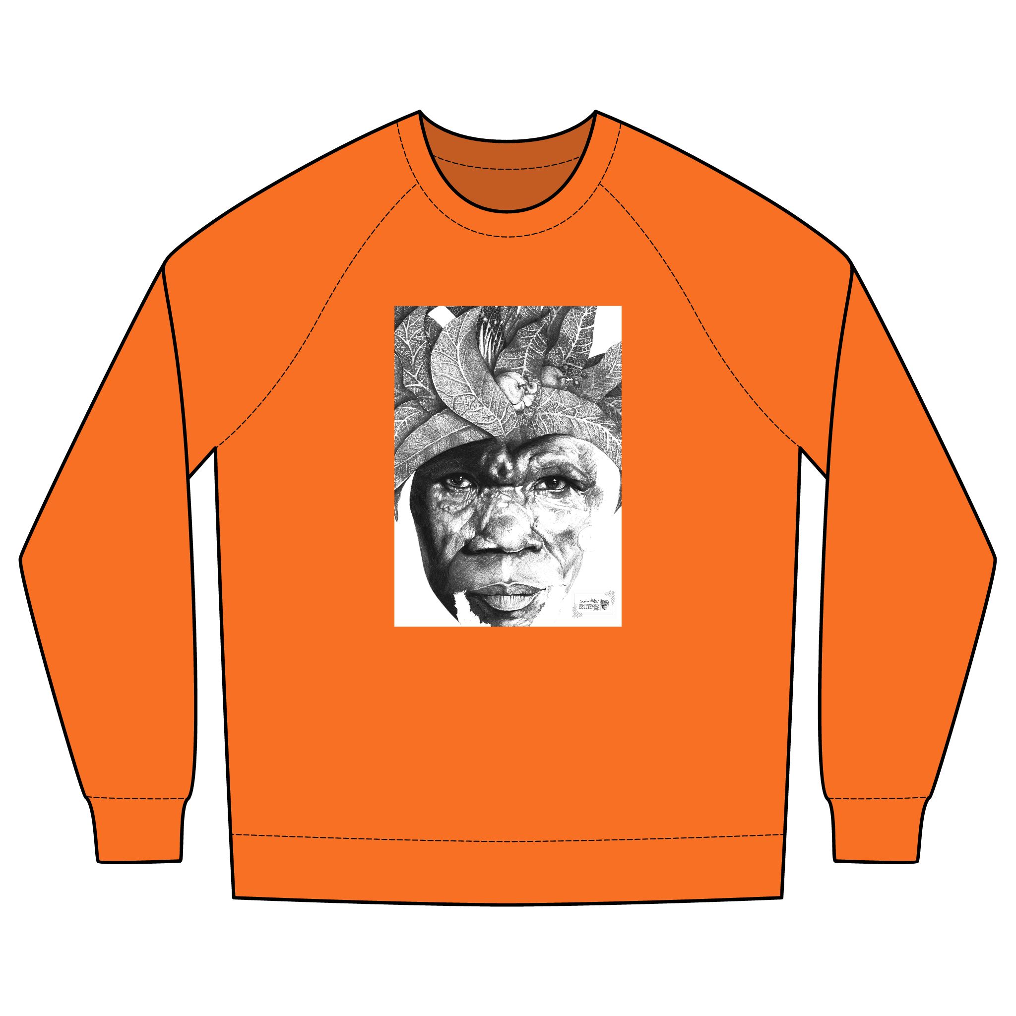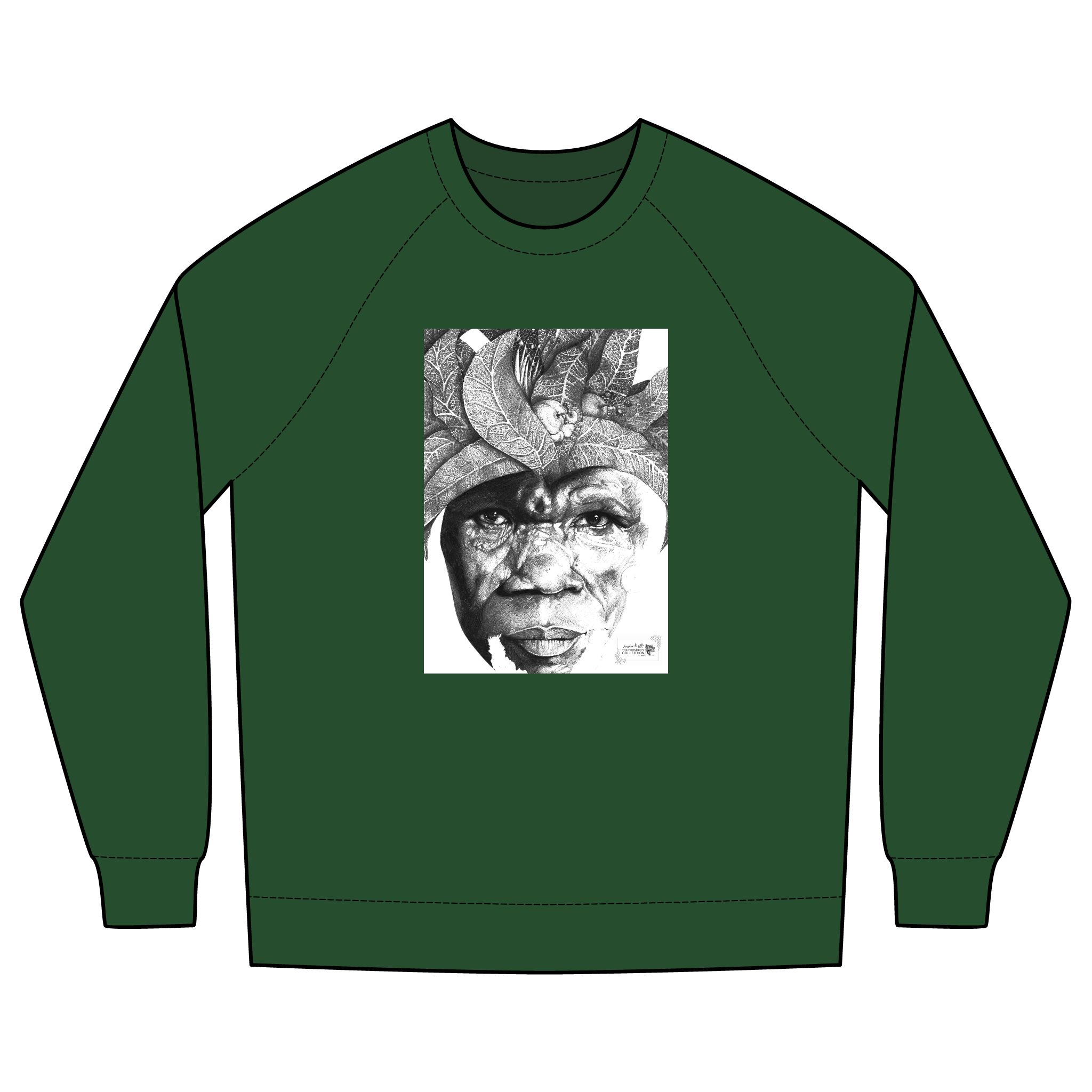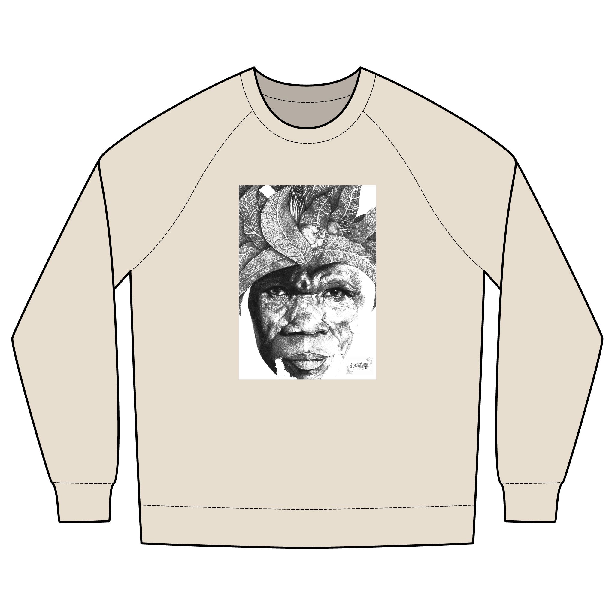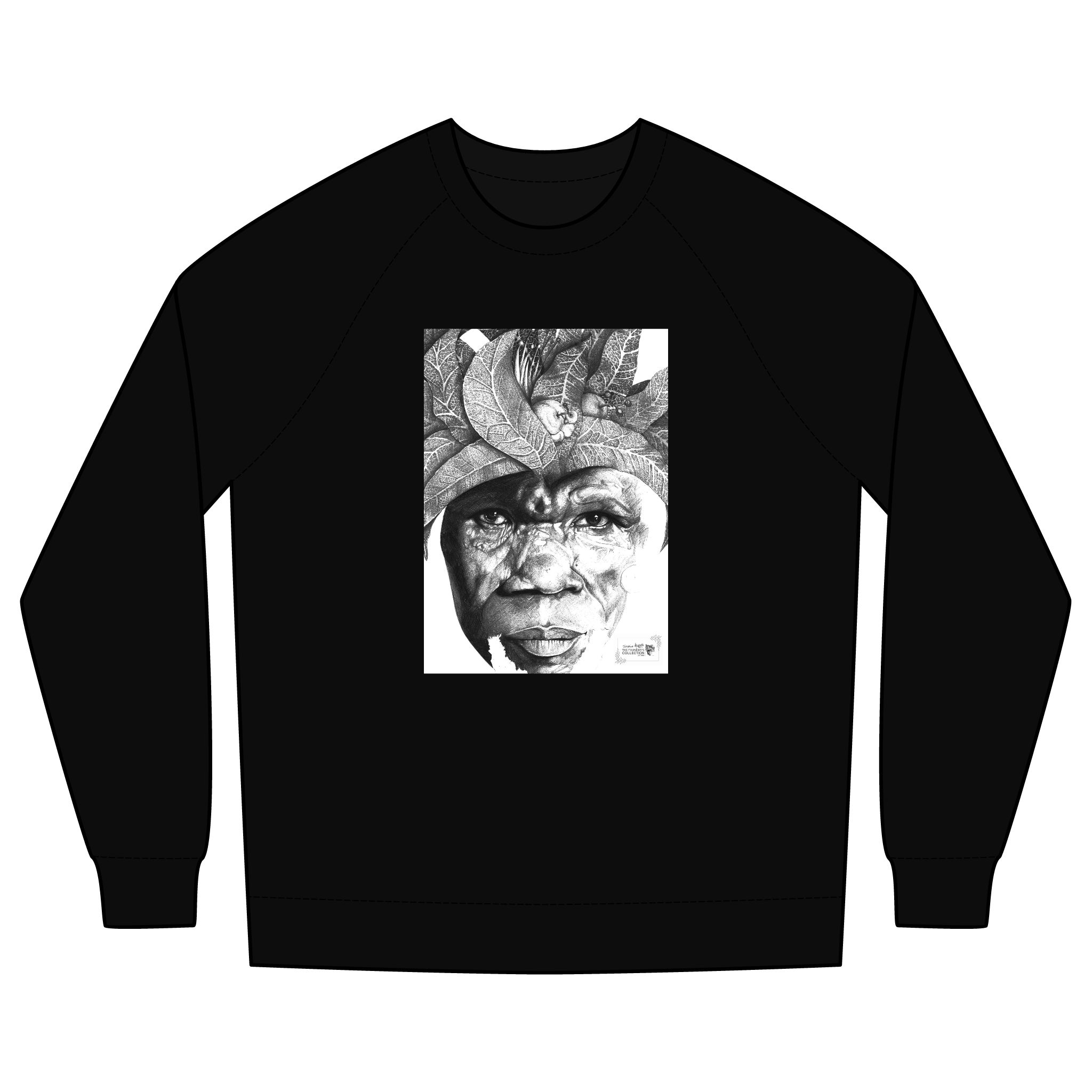 This crew sweatshirt carries the quiet, powerful presence of “The Original Sunman: Vision of the Founder’s Family” by Siphiwe Ngwenya. It’s a testament to the Maboneng philosophy that “Artwork needs to Work”—to drive economic and spiritual emancipation and inclusion in every thread. The detailed, monochrome portrait at the chest is a piece of subtle storytelling, reflecting the rich heritage and profound wisdom of communities as they journey from overlooked townships to self-sustaining towns.