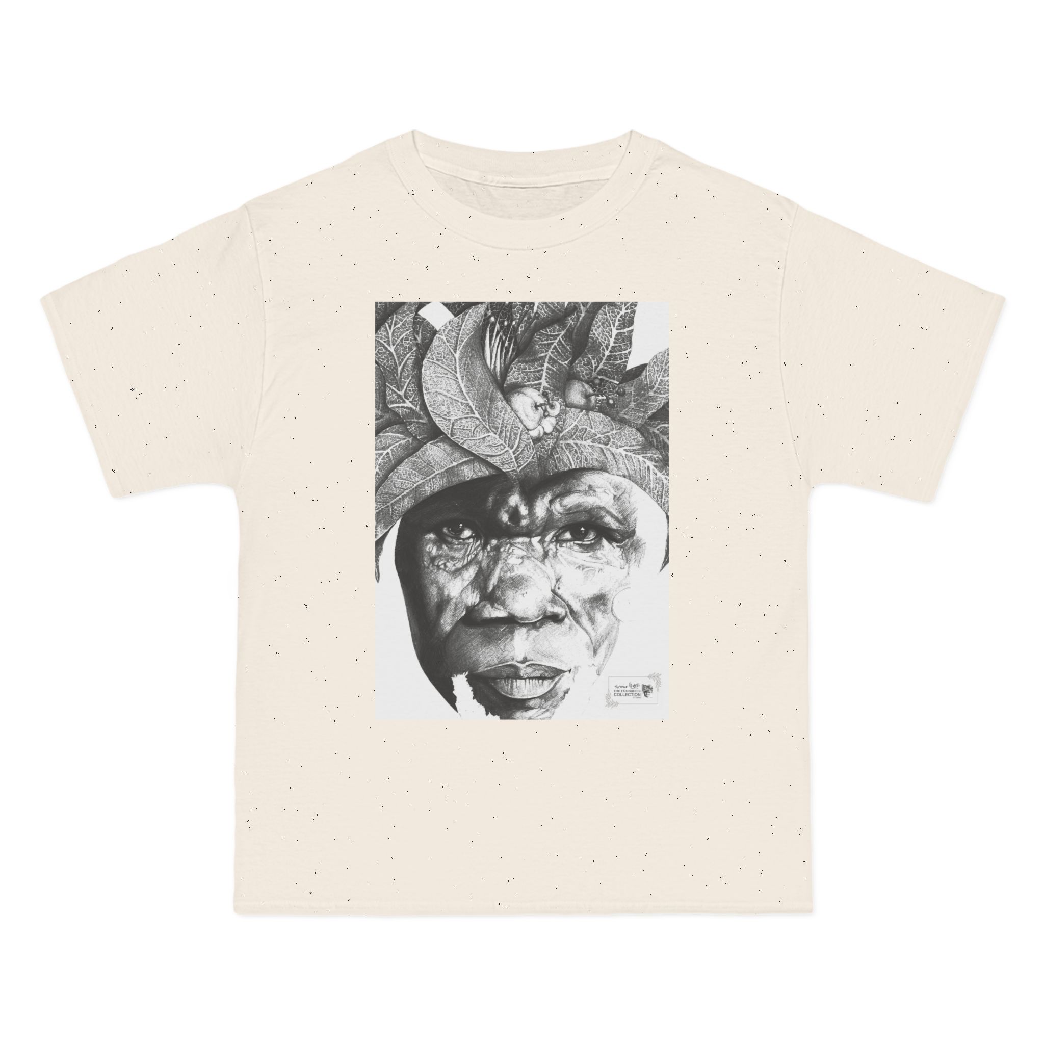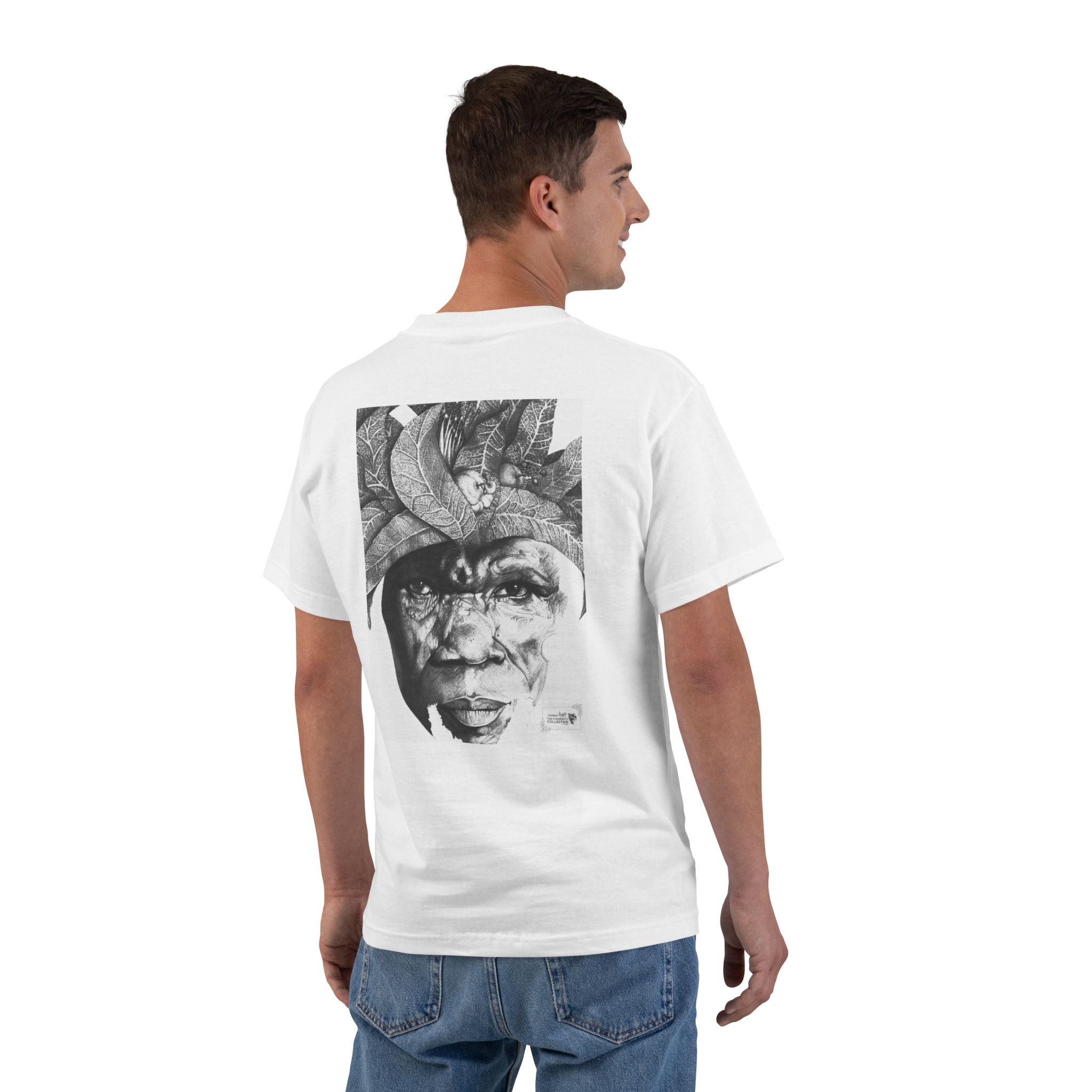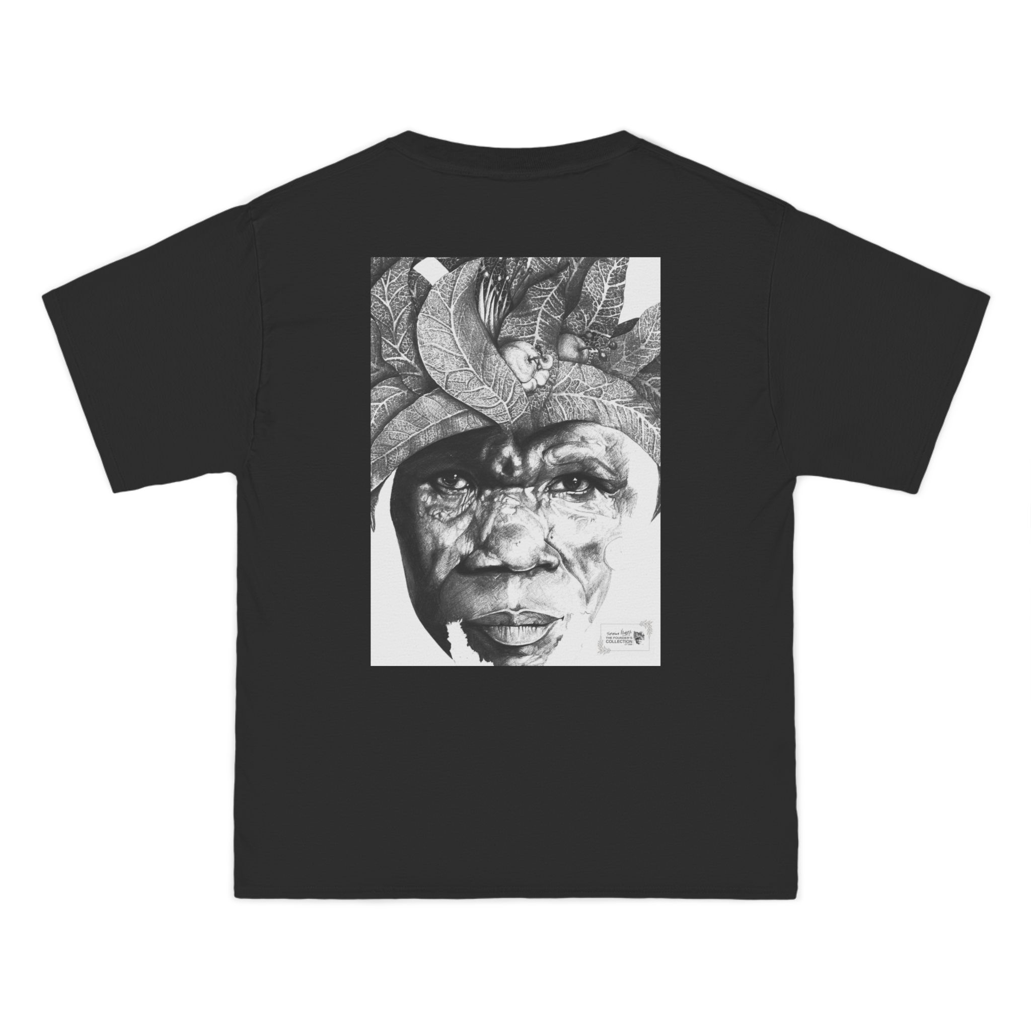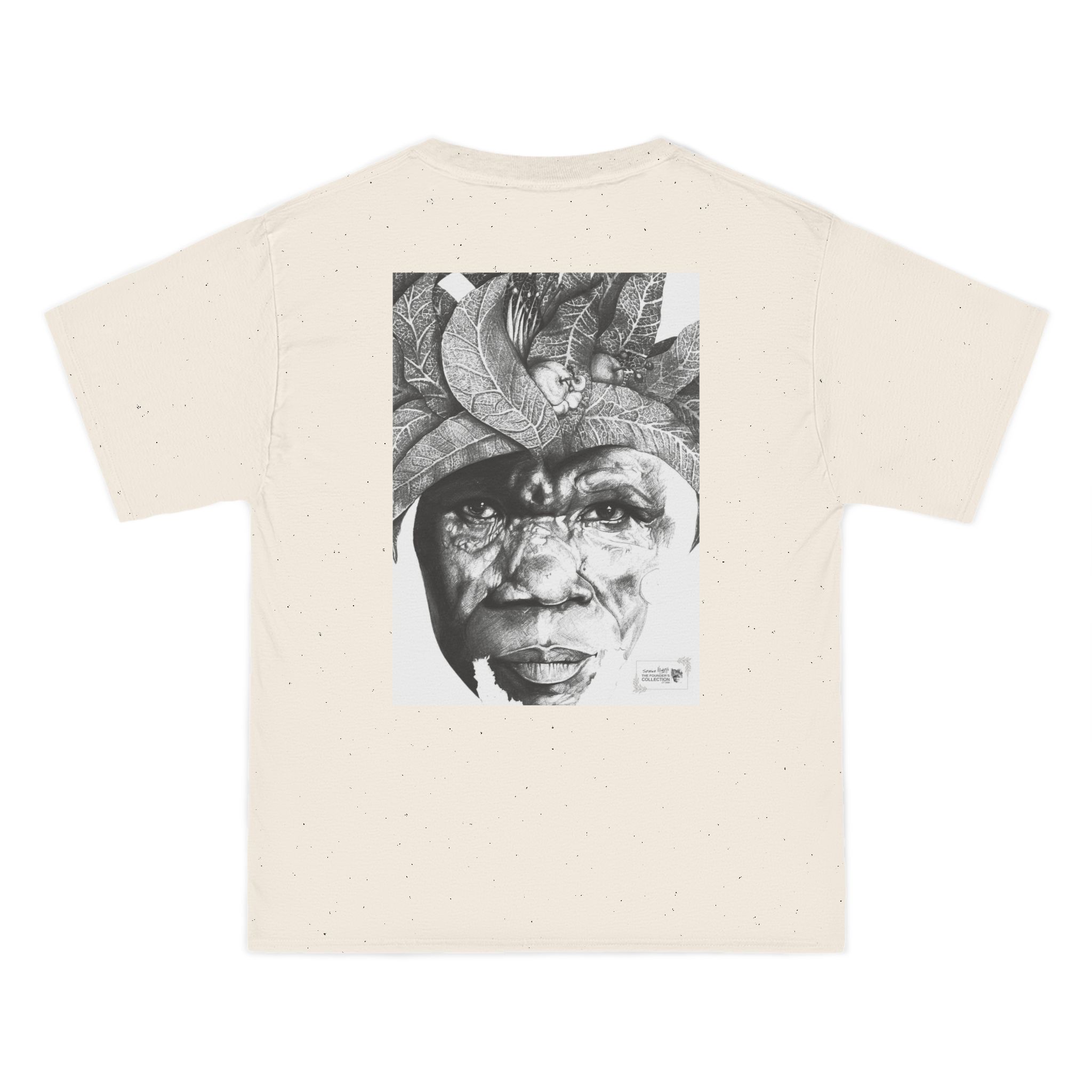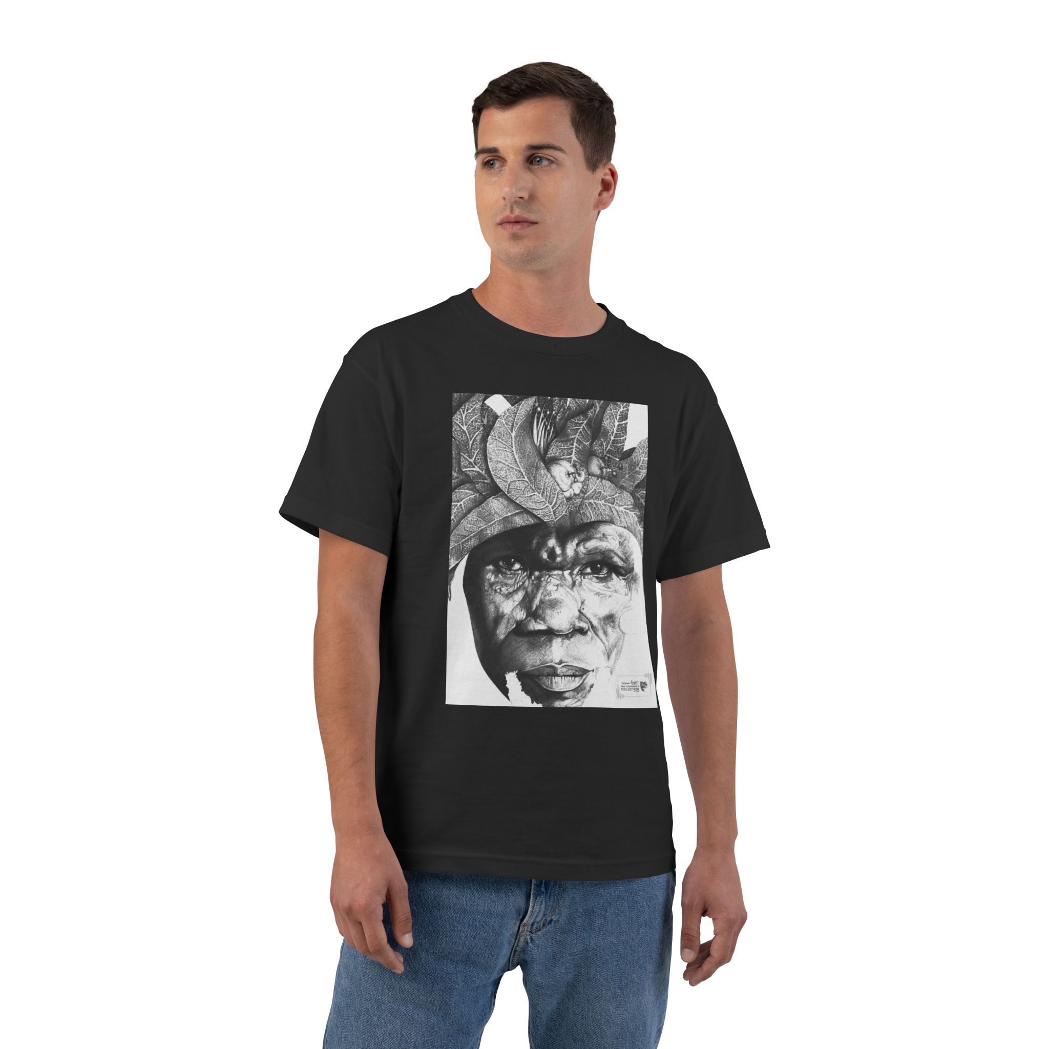 This relaxed-fit tee presents The Sunman – Guardian of the Orchard Mind as a bold black-and-white portrait printed across the chest and back. Textured and sculptural, the image reads like a narrative in motion — a face shaped by history, resilience, and memory. The artwork carries an urban-gallery presence, offering a quiet yet unmistakable statement through detail and restraint.