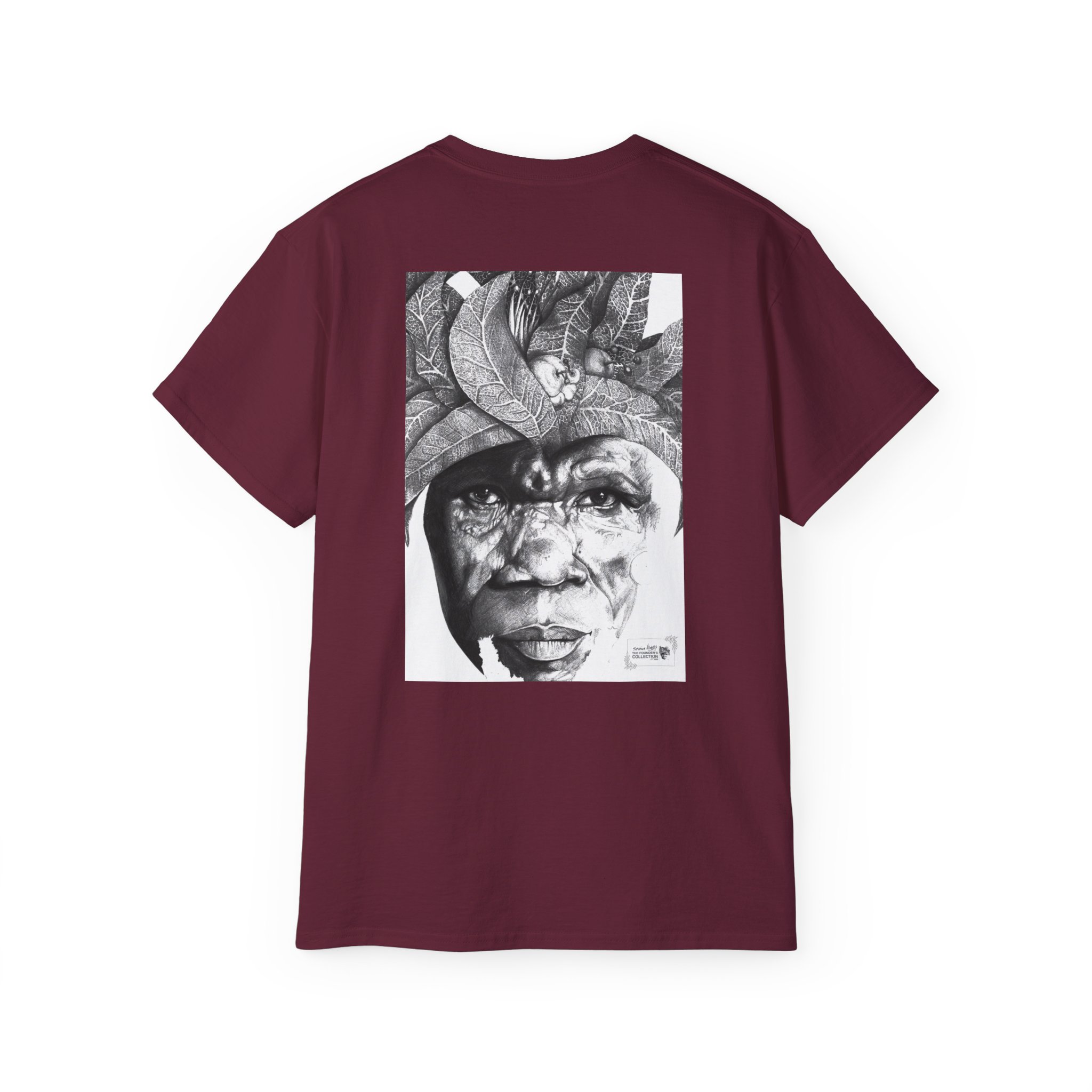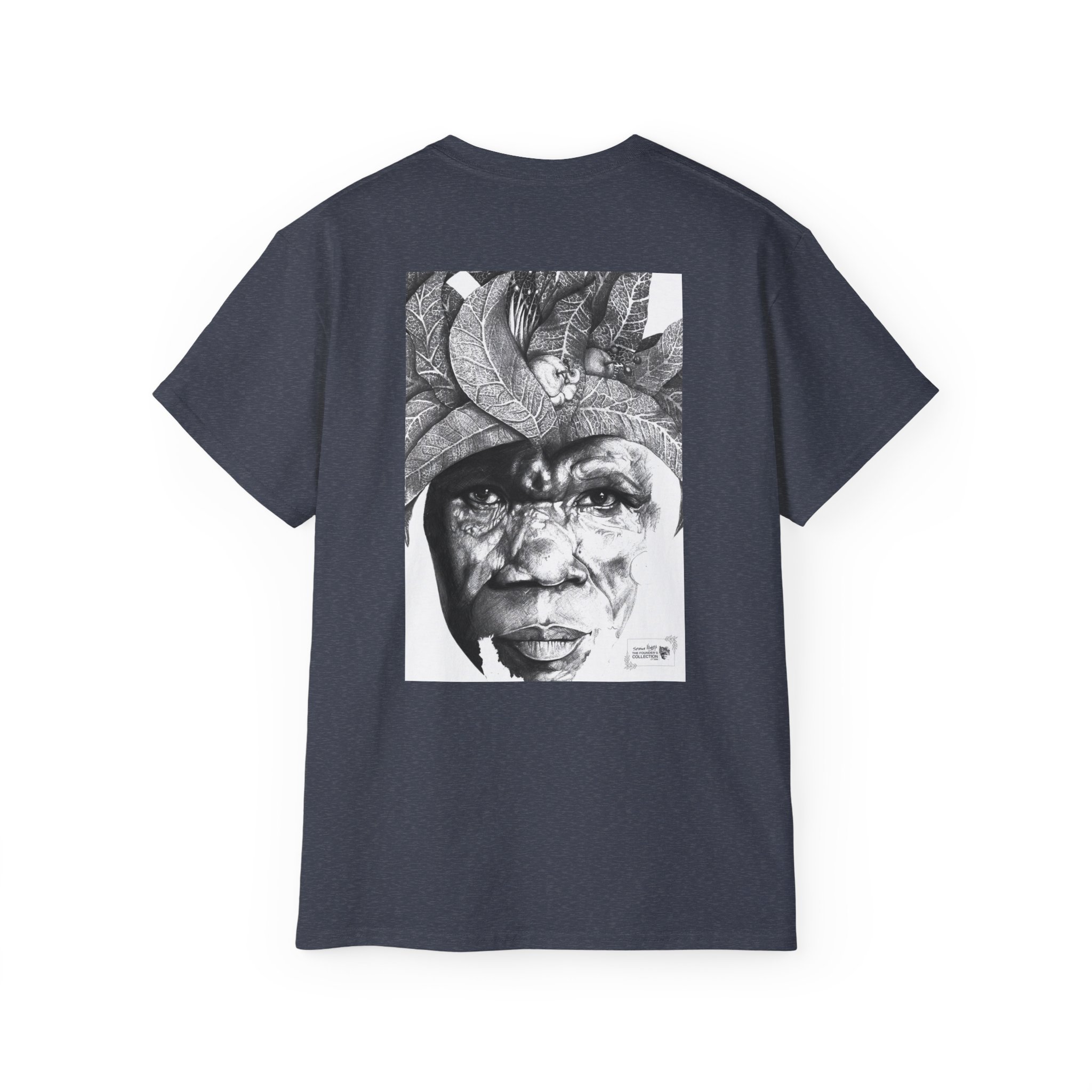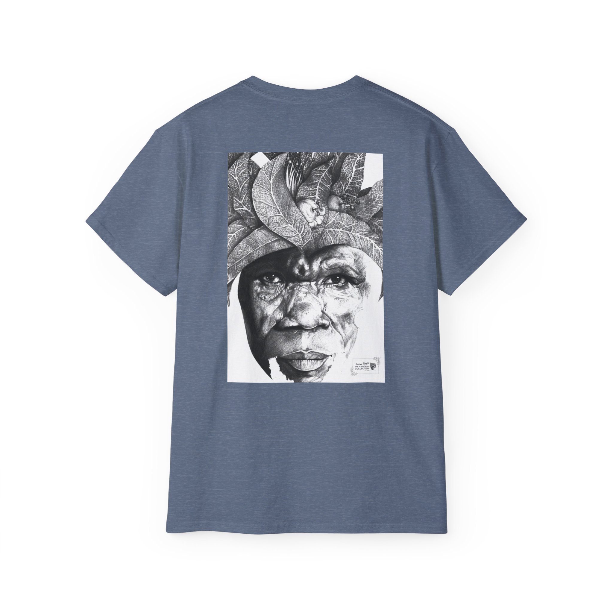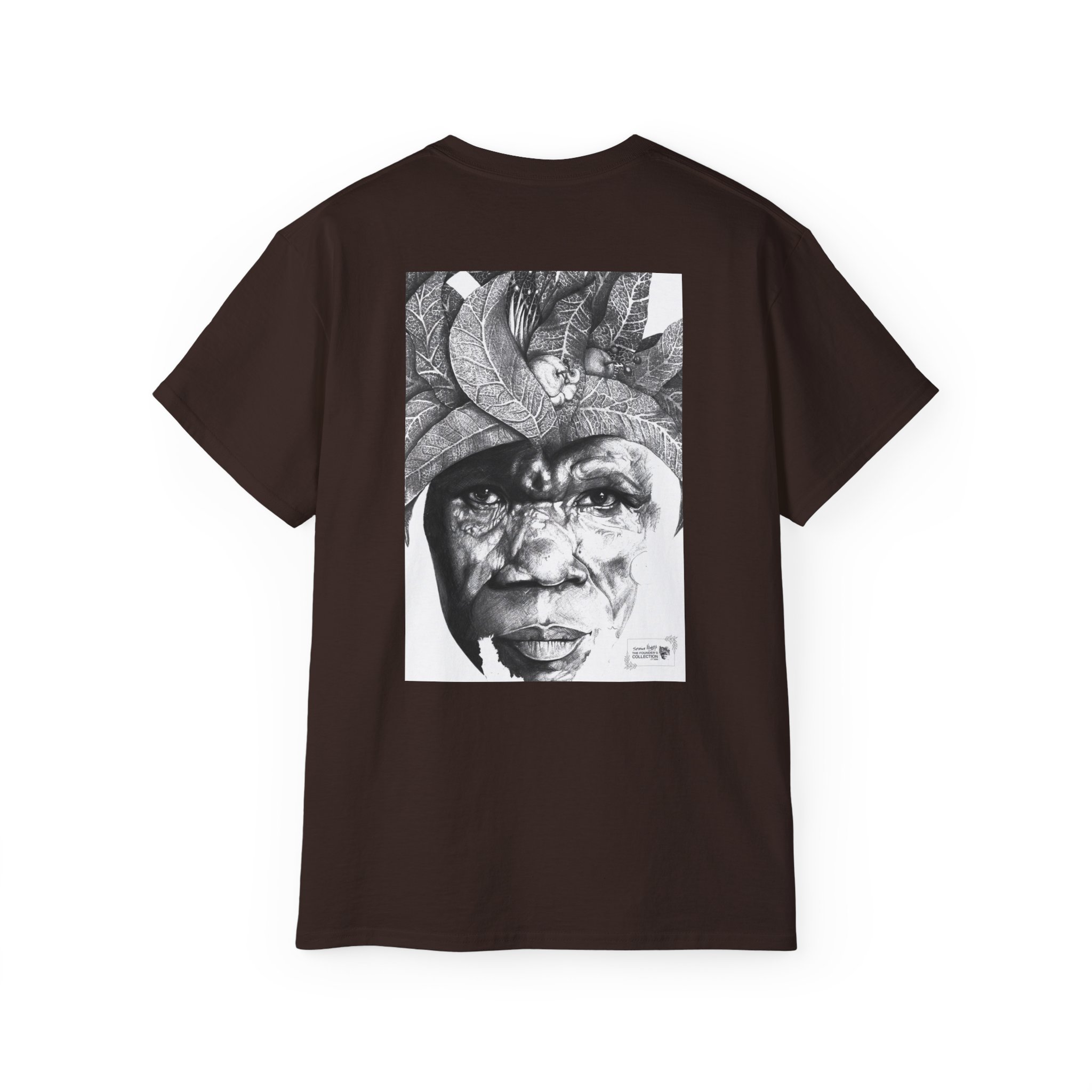 Rooted in Siphiwe Ngwenya’s Artworks that Work philosophy, this piece transforms everyday clothing into a carrier of meaning. The portrait reflects subtle storytelling — about wisdom, endurance, and cultivated inner worlds — making the tee ideal for those who prefer expression that unfolds slowly rather than announces itself.