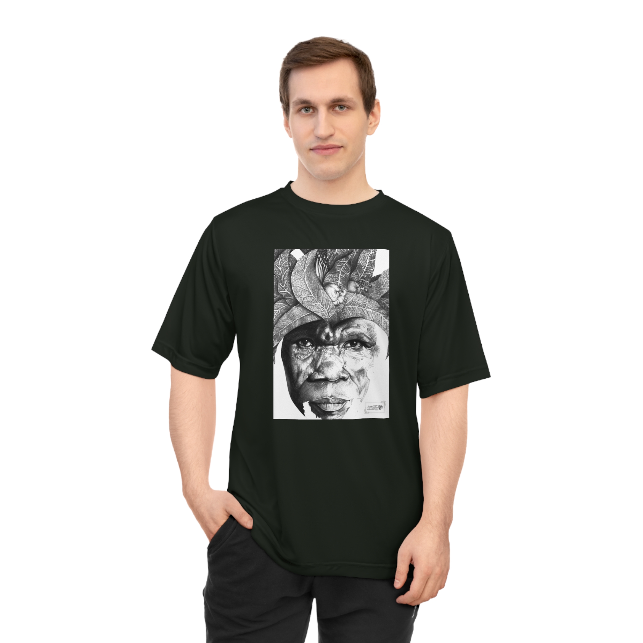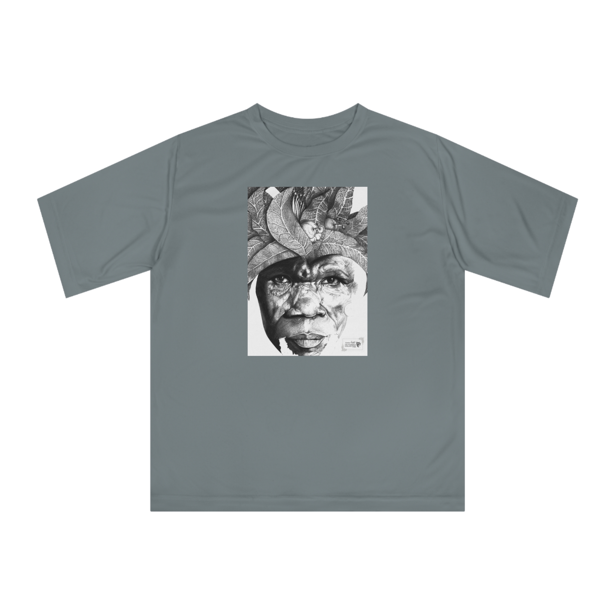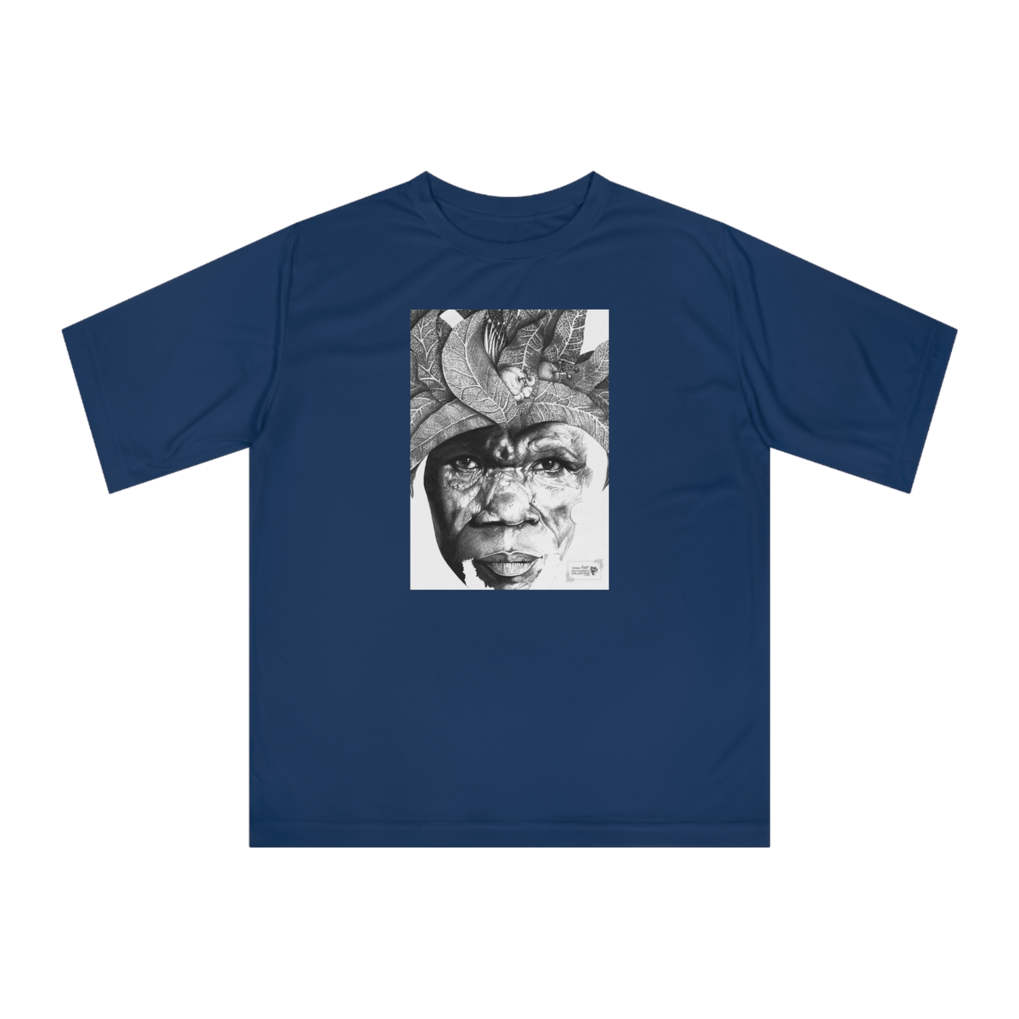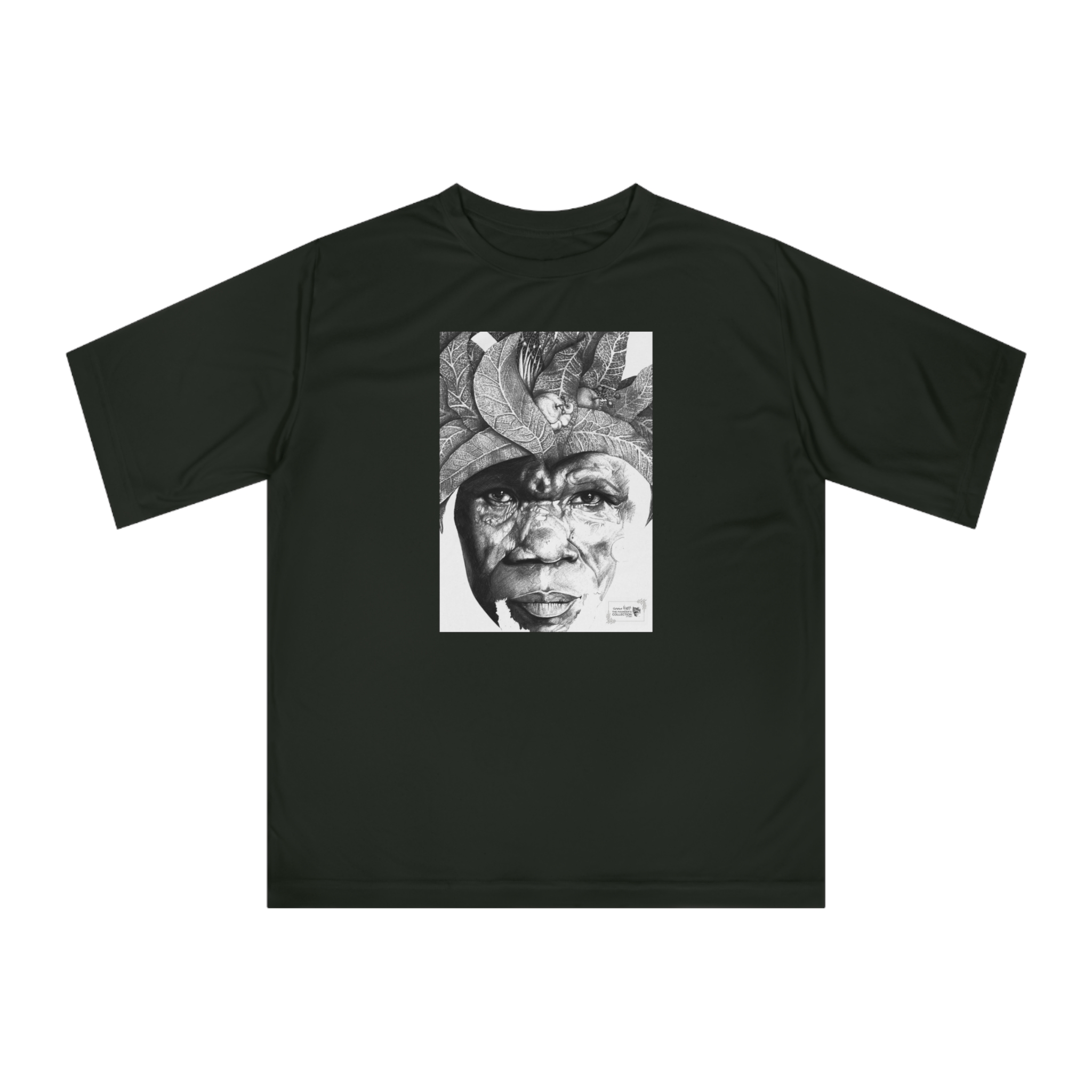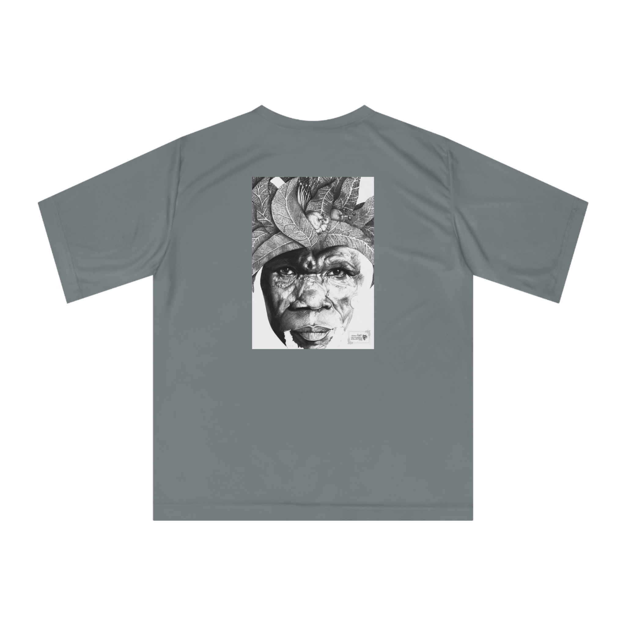 This lightweight performance tee features The Sunman – Guardian of the Orchard Mind as a striking monochrome portrait across the chest — a layered, textured face framed by an abstract crown that bridges modern expression with ancestral memory. The artwork reads as thoughtful rather than loud, offering presence without excess while remaining visually arresting in motion.