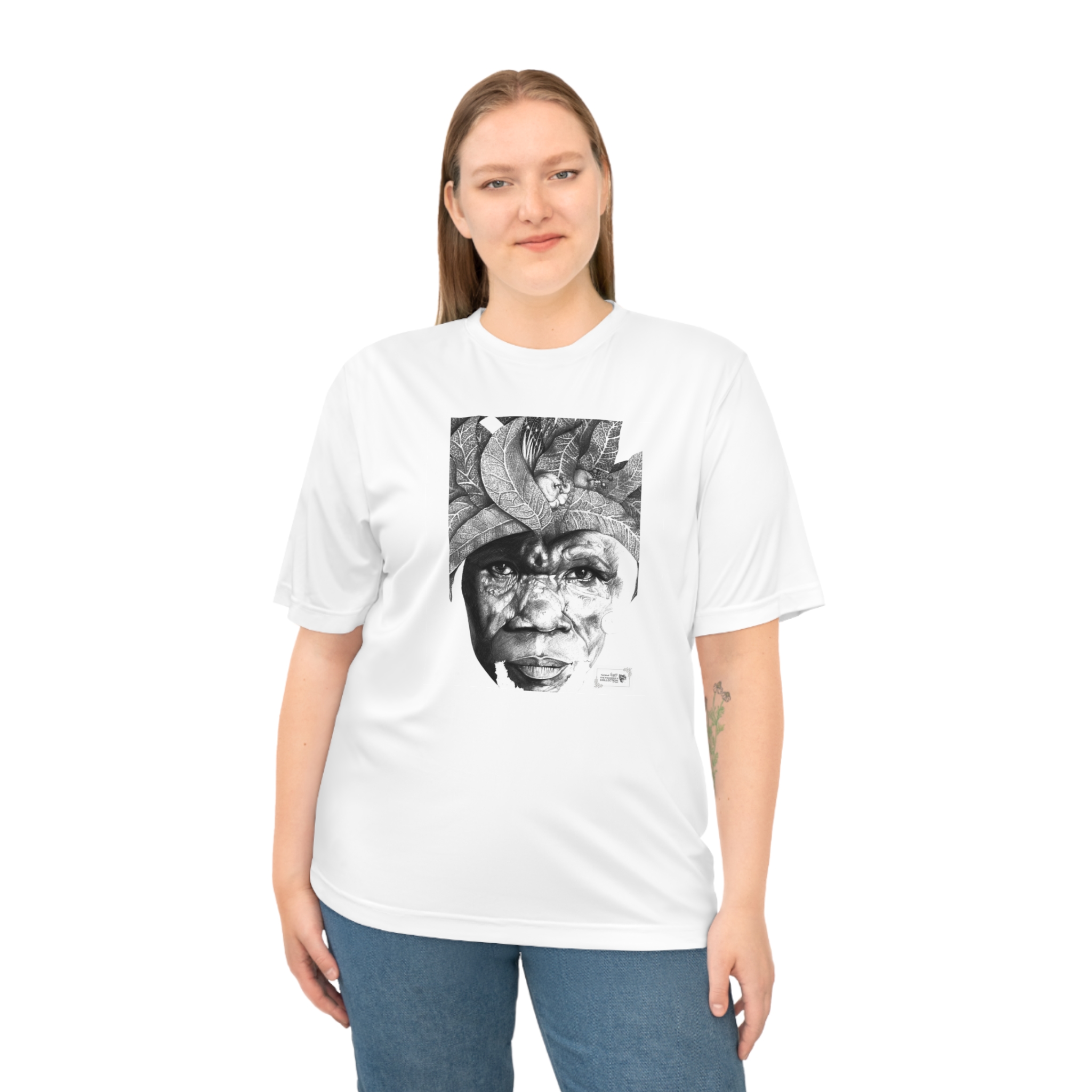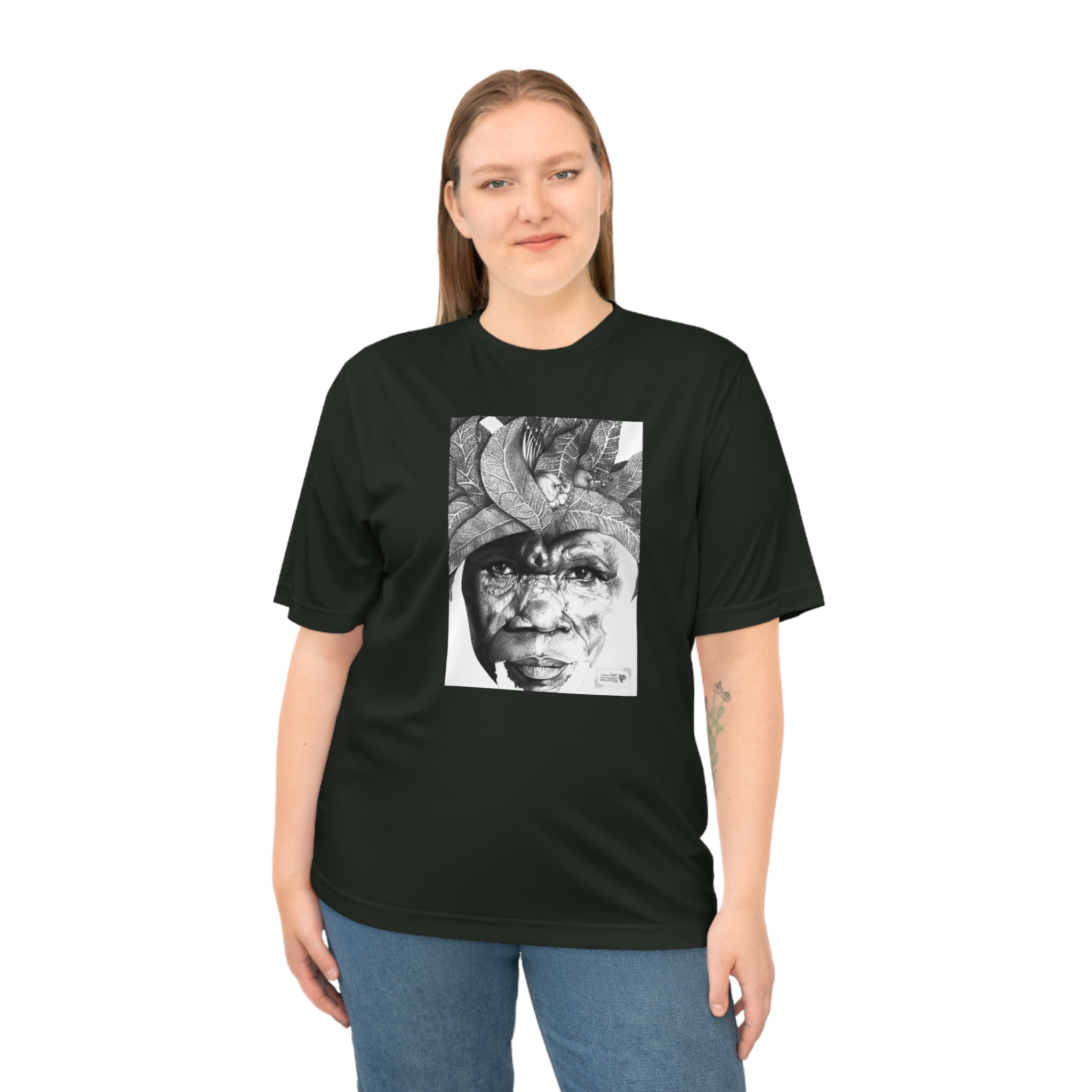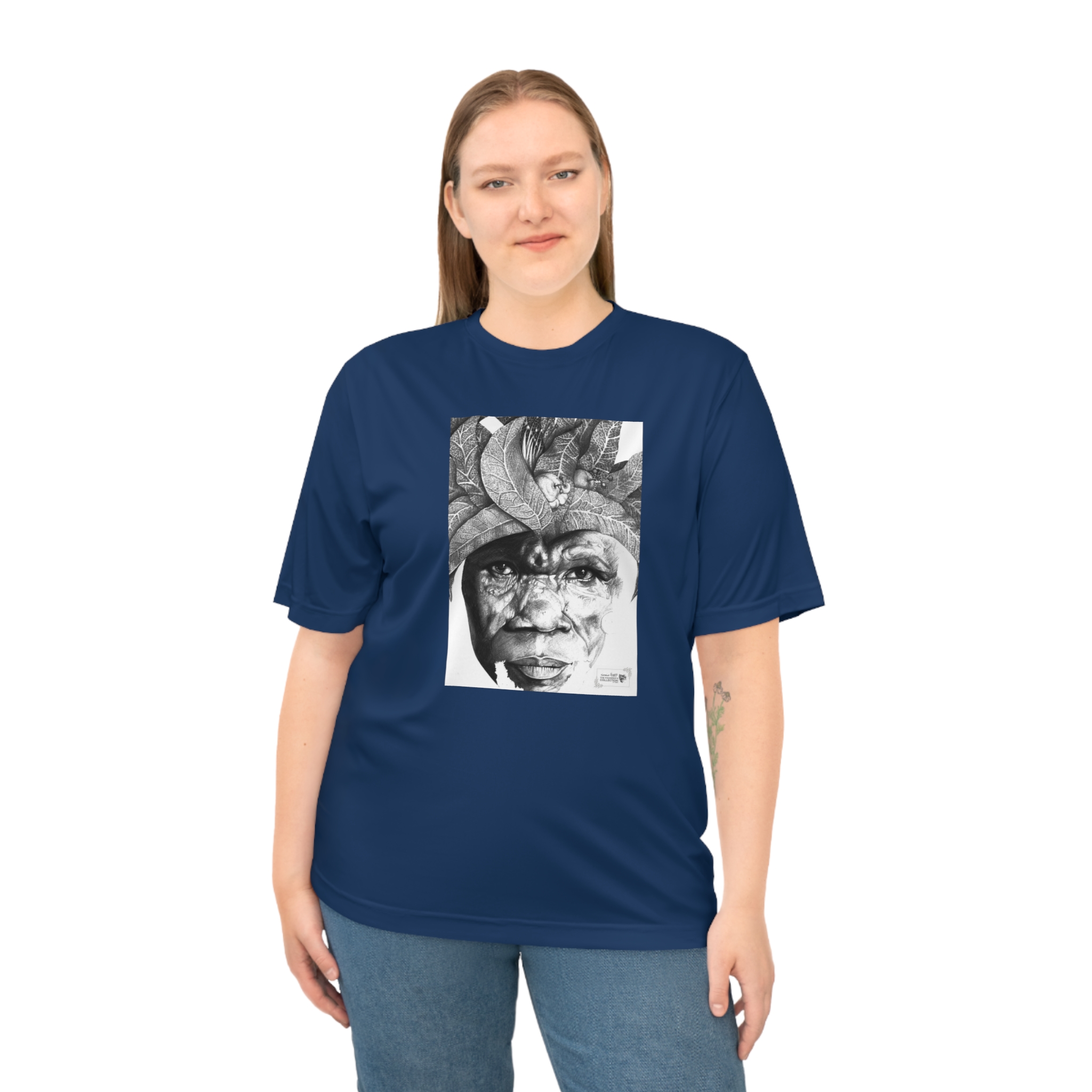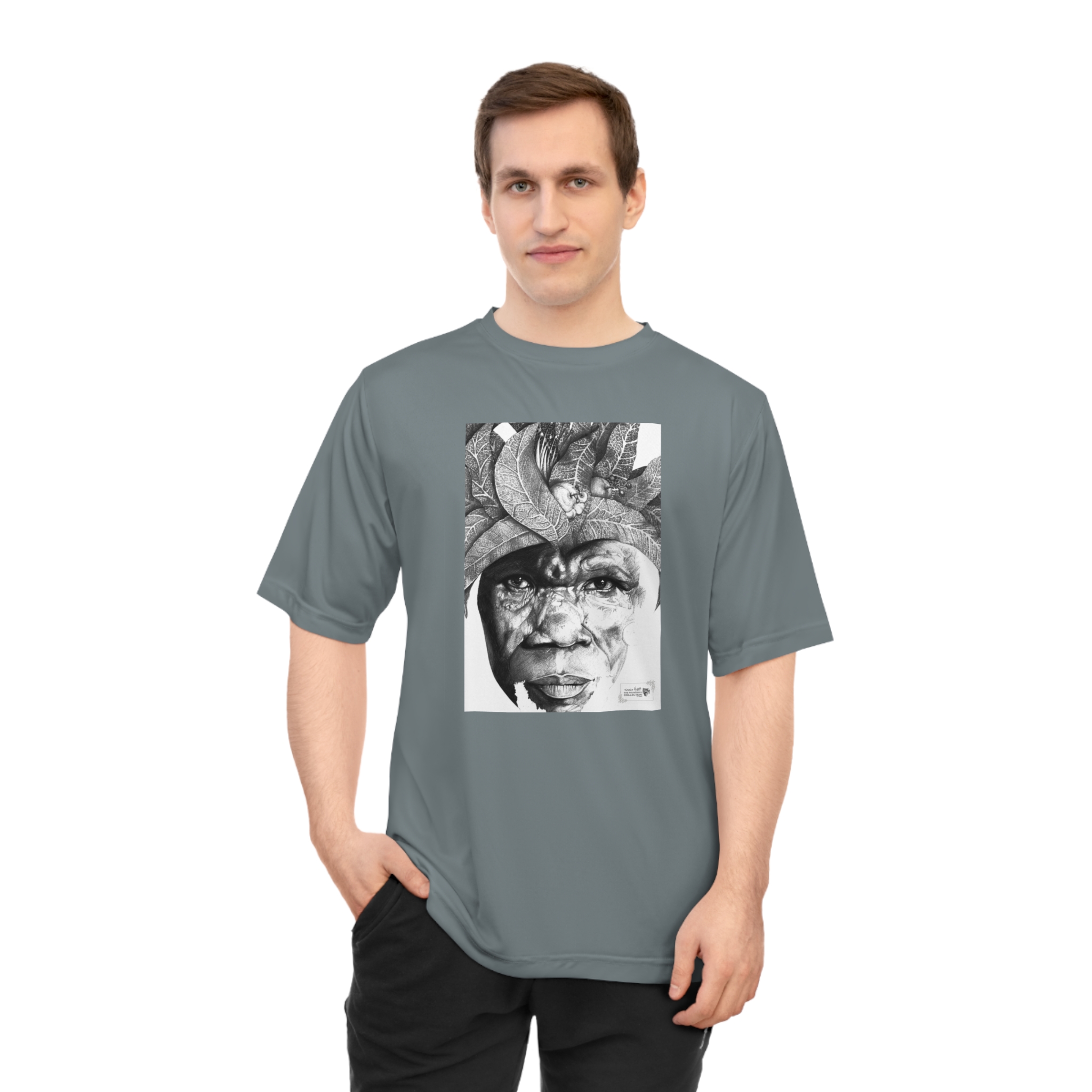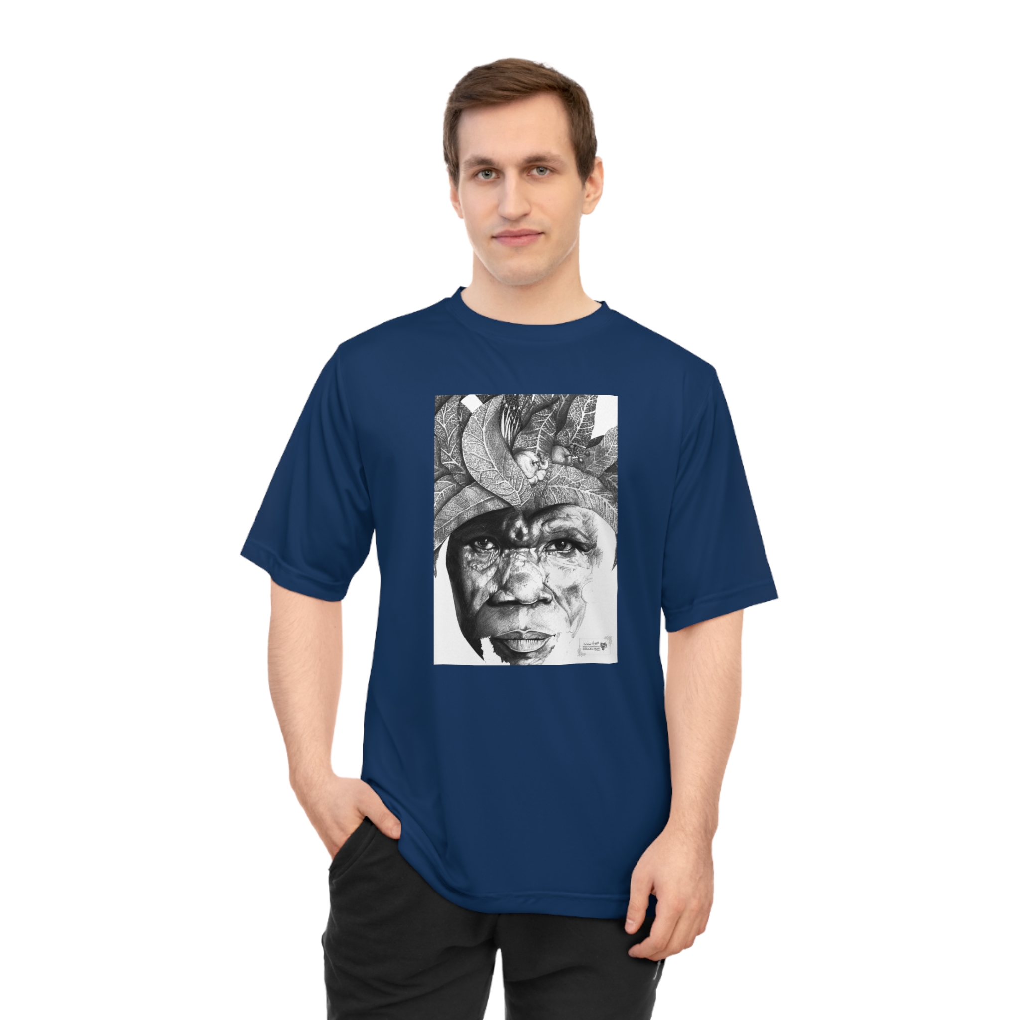 This lightweight performance tee features The Sunman – Guardian of the Orchard Mind as a striking monochrome portrait across the chest — a layered, textured face framed by an abstract crown that bridges modern expression with ancestral memory. The artwork reads as thoughtful rather than loud, offering presence without excess while remaining visually arresting in motion.
