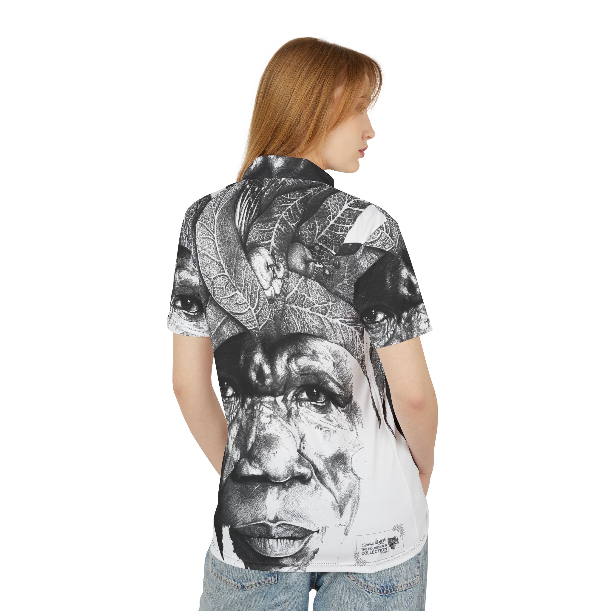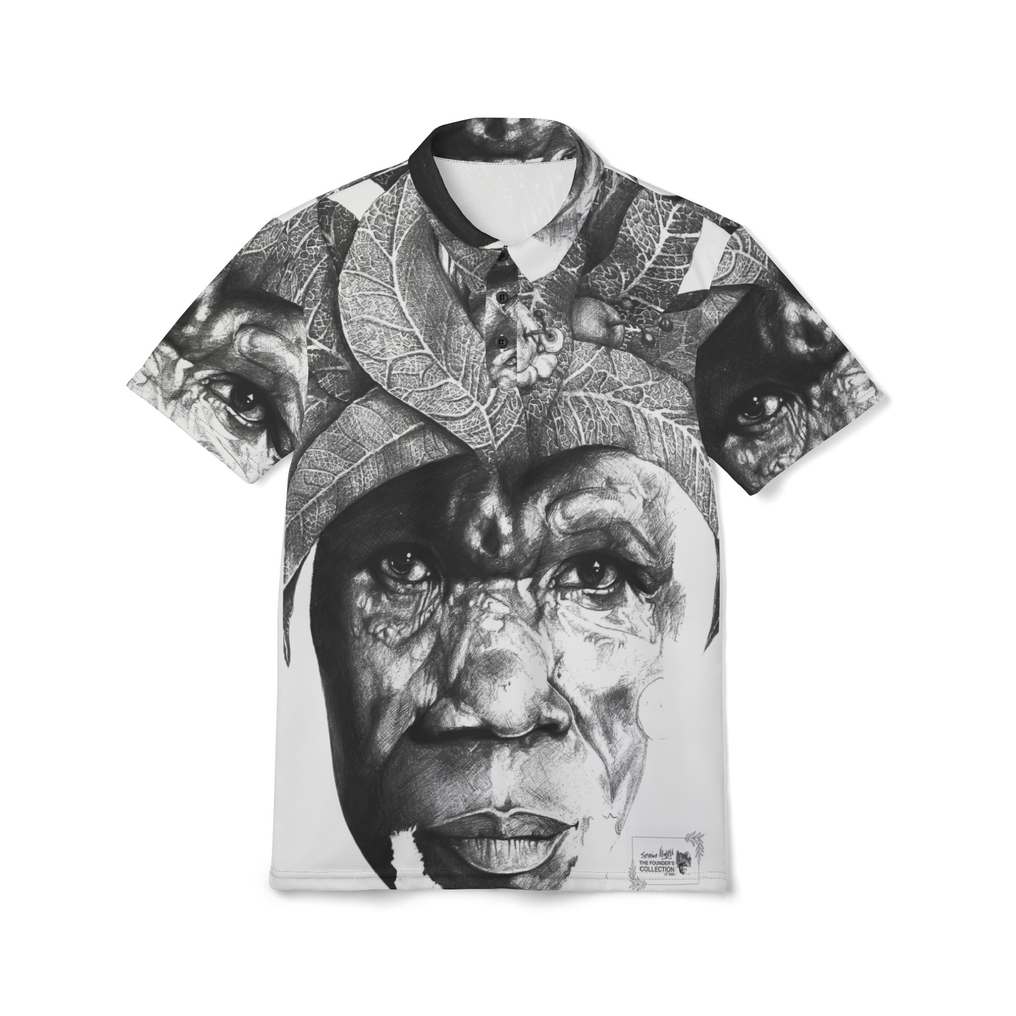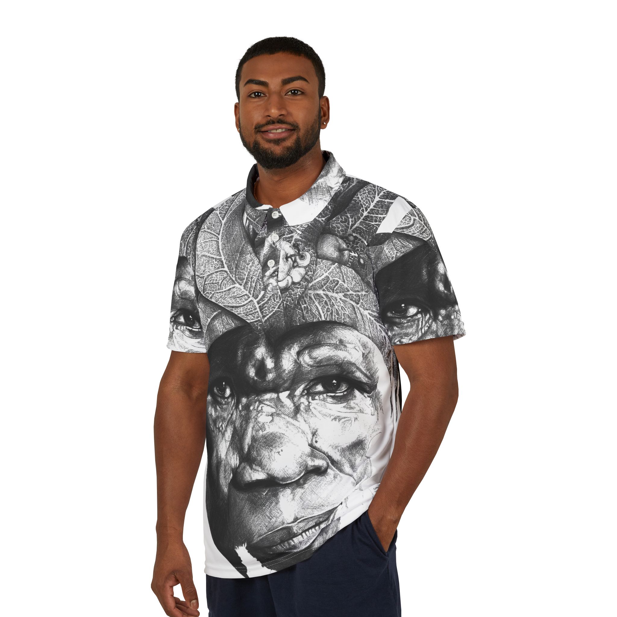 This lightweight polo brings bold, portrait-driven art into everyday wear, featuring The Sunman – Guardian of the Orchard Mind rendered in striking black and white across the fabric. The all-over composition gives the shirt a gallery-like presence while remaining balanced and wearable, allowing expressive imagery to coexist with a clean, classic silhouette.