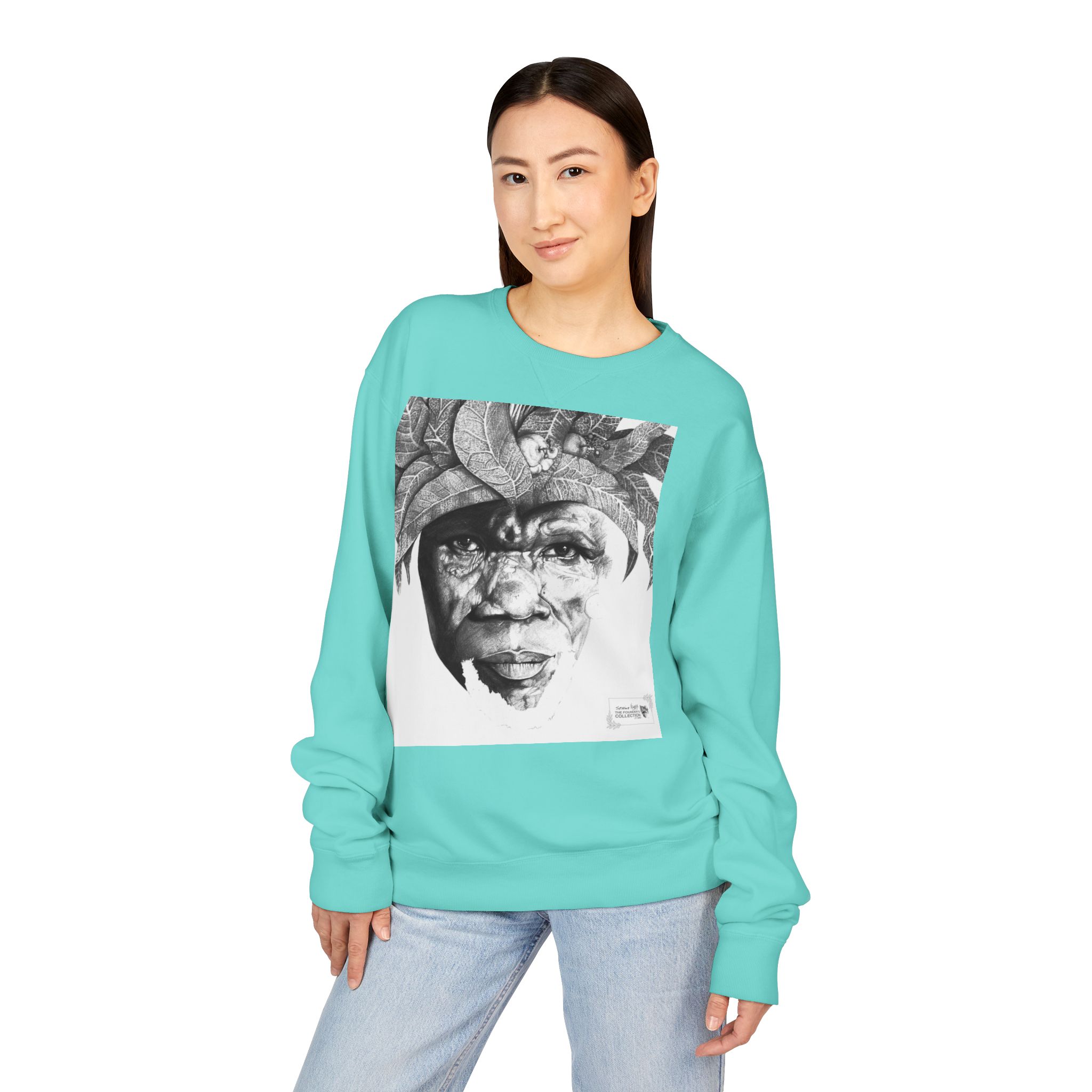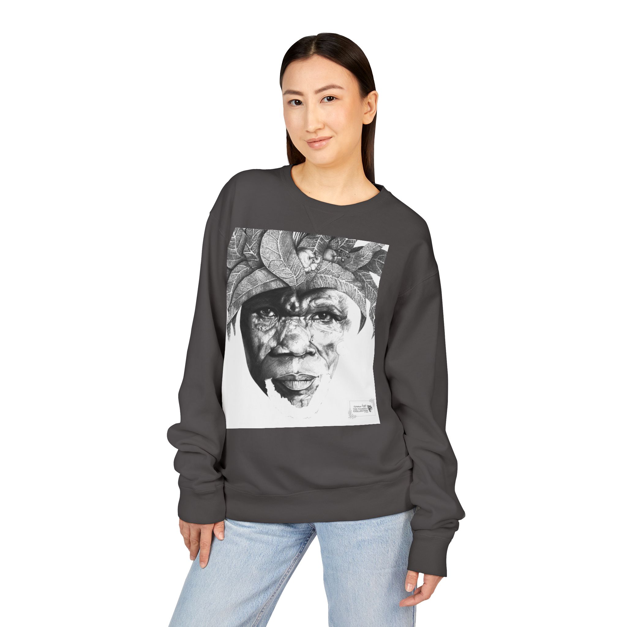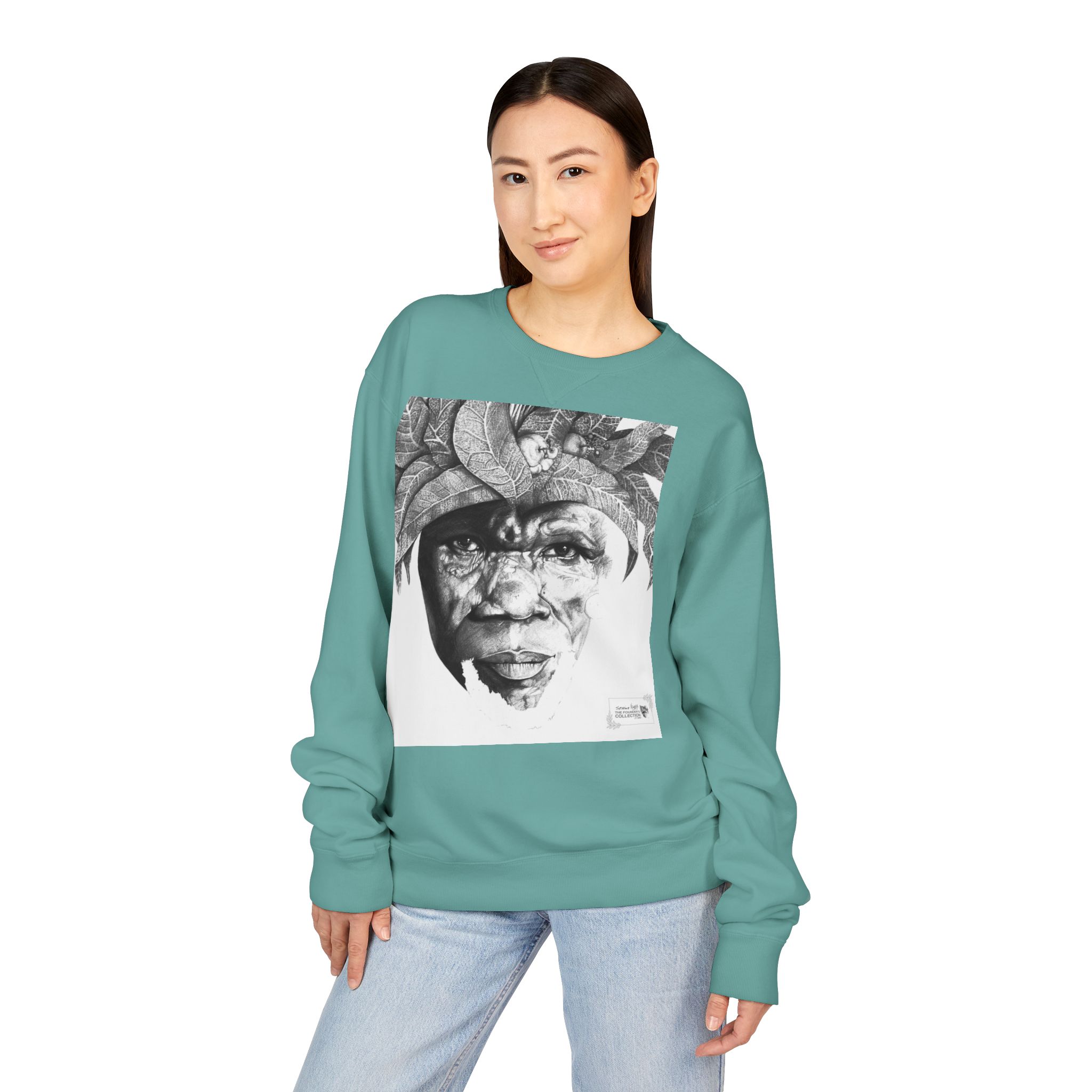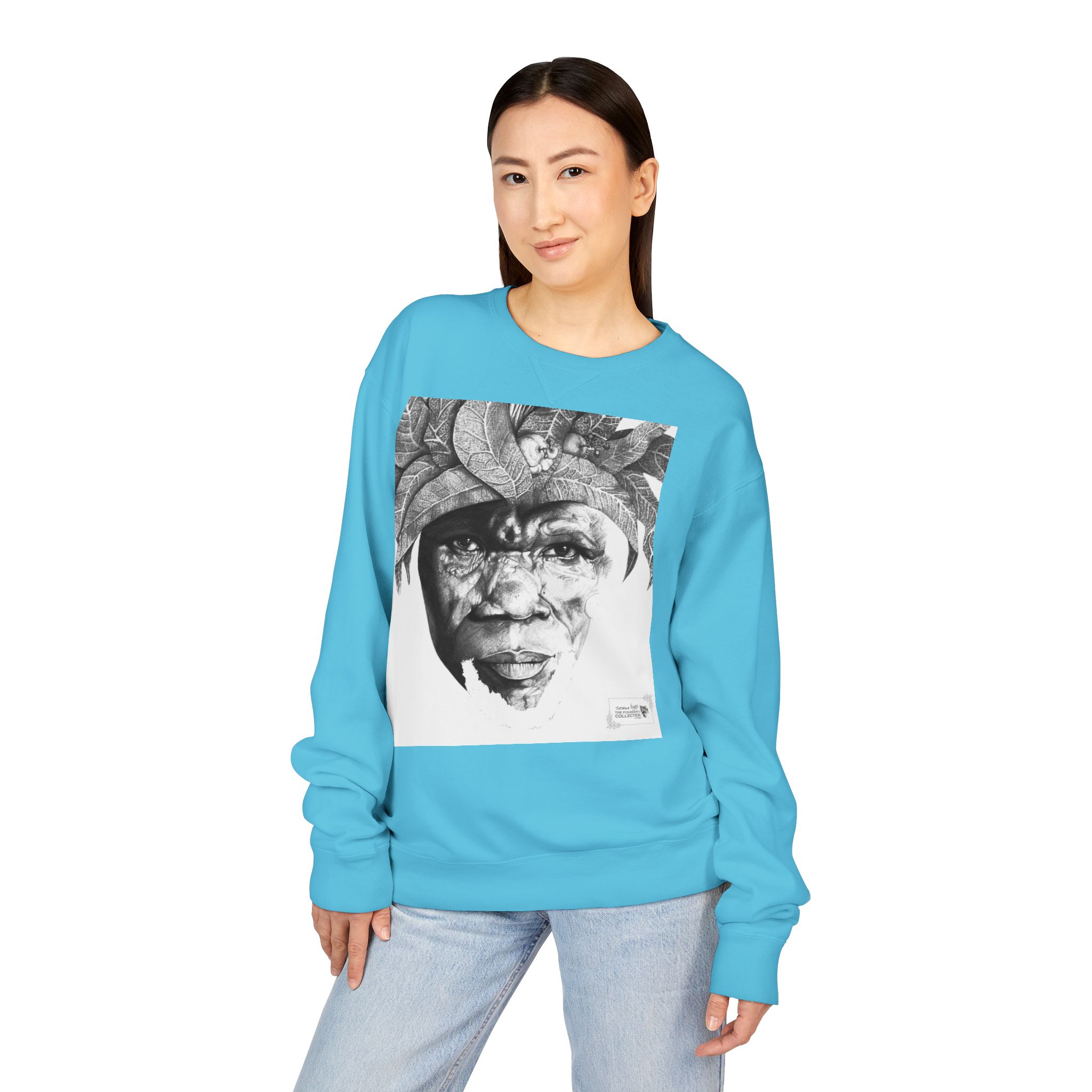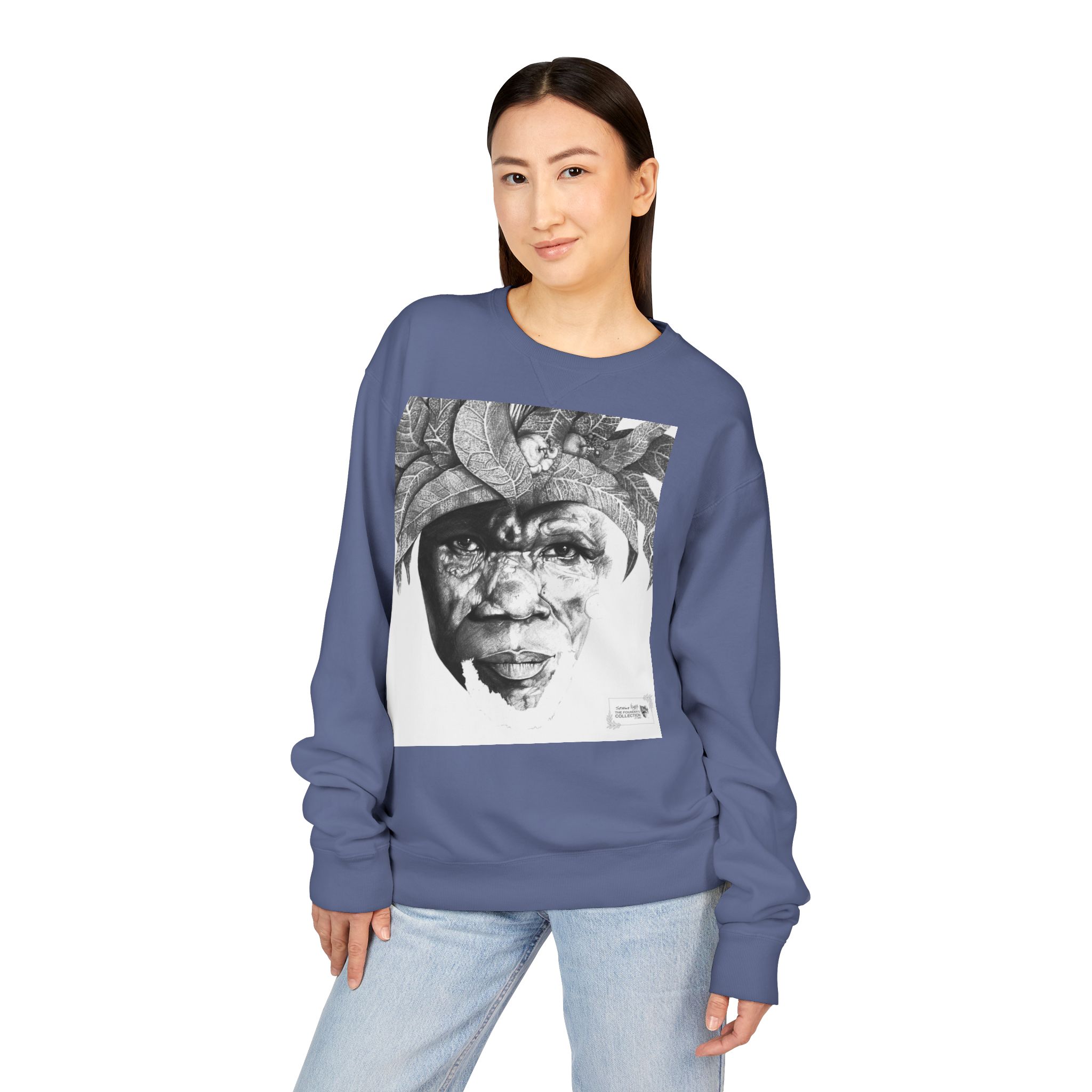 This Unisex ComfortWash® Garment Dyed Crewneck Sweatshirt showcases “The Original Sunman: Vision of the Founder’s Family” by Siphiwe Ngwenya. Its vintage-washed finish complements the enduring power of the “Artworks that Work” philosophy—art dedicated to driving economic and spiritual emancipation. The monochrome portrait, rich in heritage and wisdom, resonates with a lived history, symbolizing the journey of communities transforming townships into vibrant centers of creative and economic freedom.