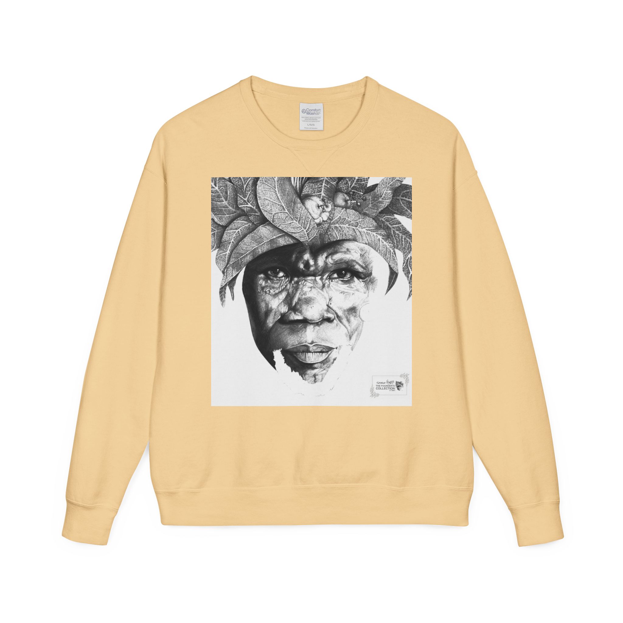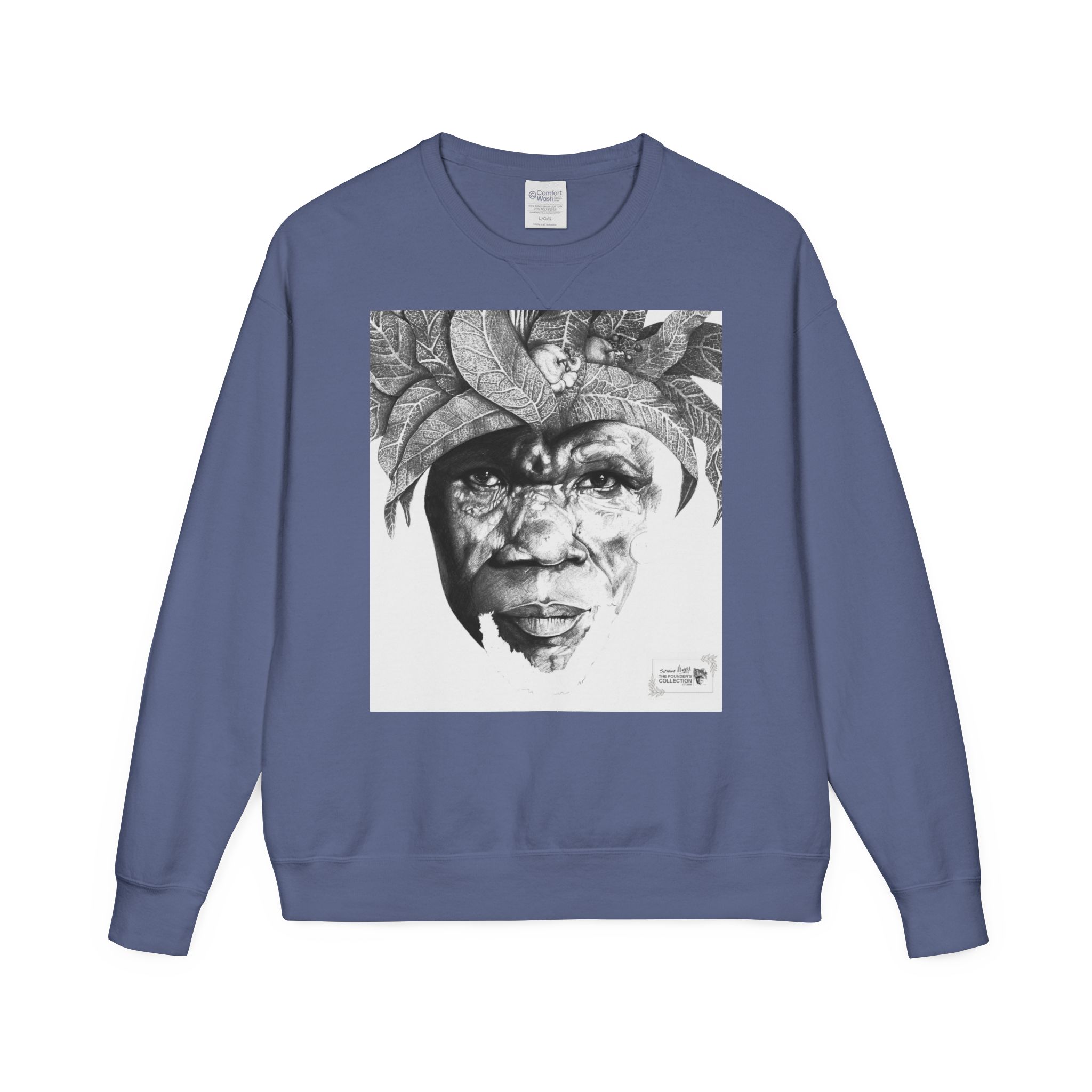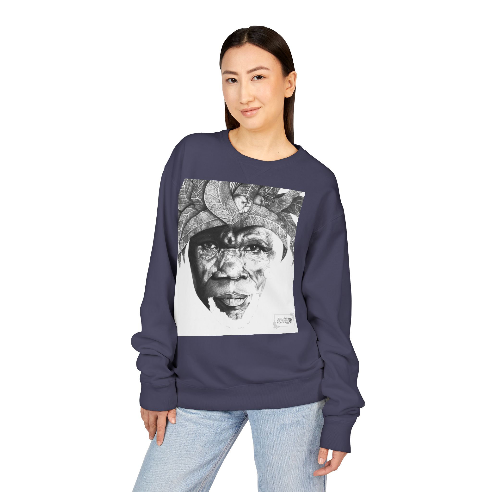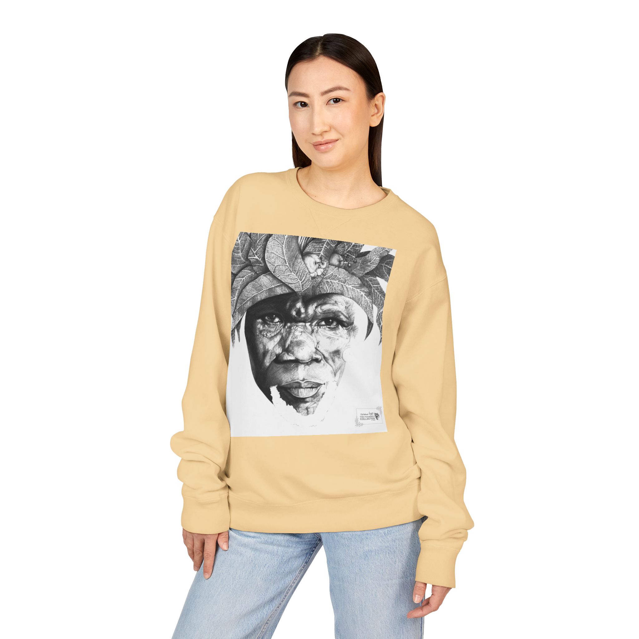 This Unisex ComfortWash® Garment Dyed Crewneck Sweatshirt showcases “The Original Sunman: Vision of the Founder’s Family” by Siphiwe Ngwenya. Its vintage-washed finish complements the enduring power of the “Artworks that Work” philosophy—art dedicated to driving economic and spiritual emancipation. The monochrome portrait, rich in heritage and wisdom, resonates with a lived history, symbolizing the journey of communities transforming townships into vibrant centers of creative and economic freedom.